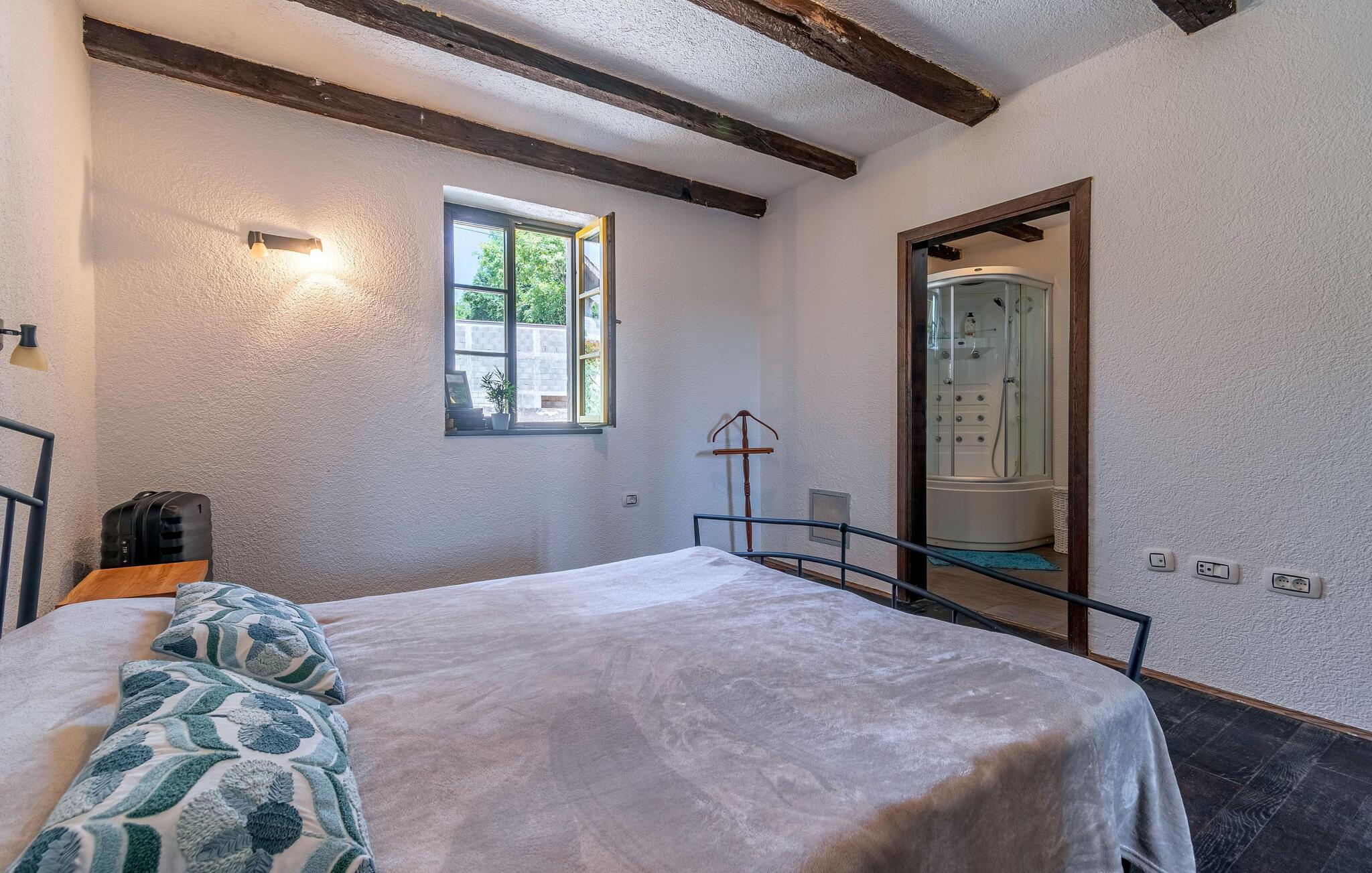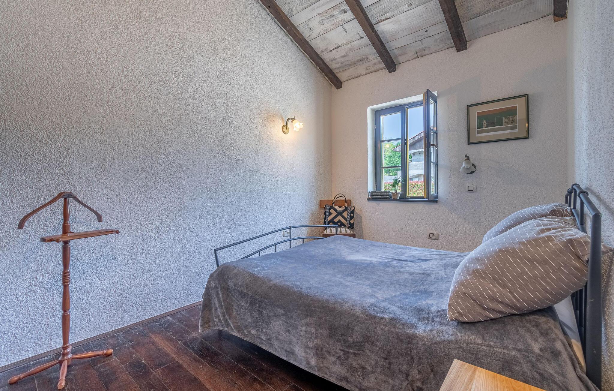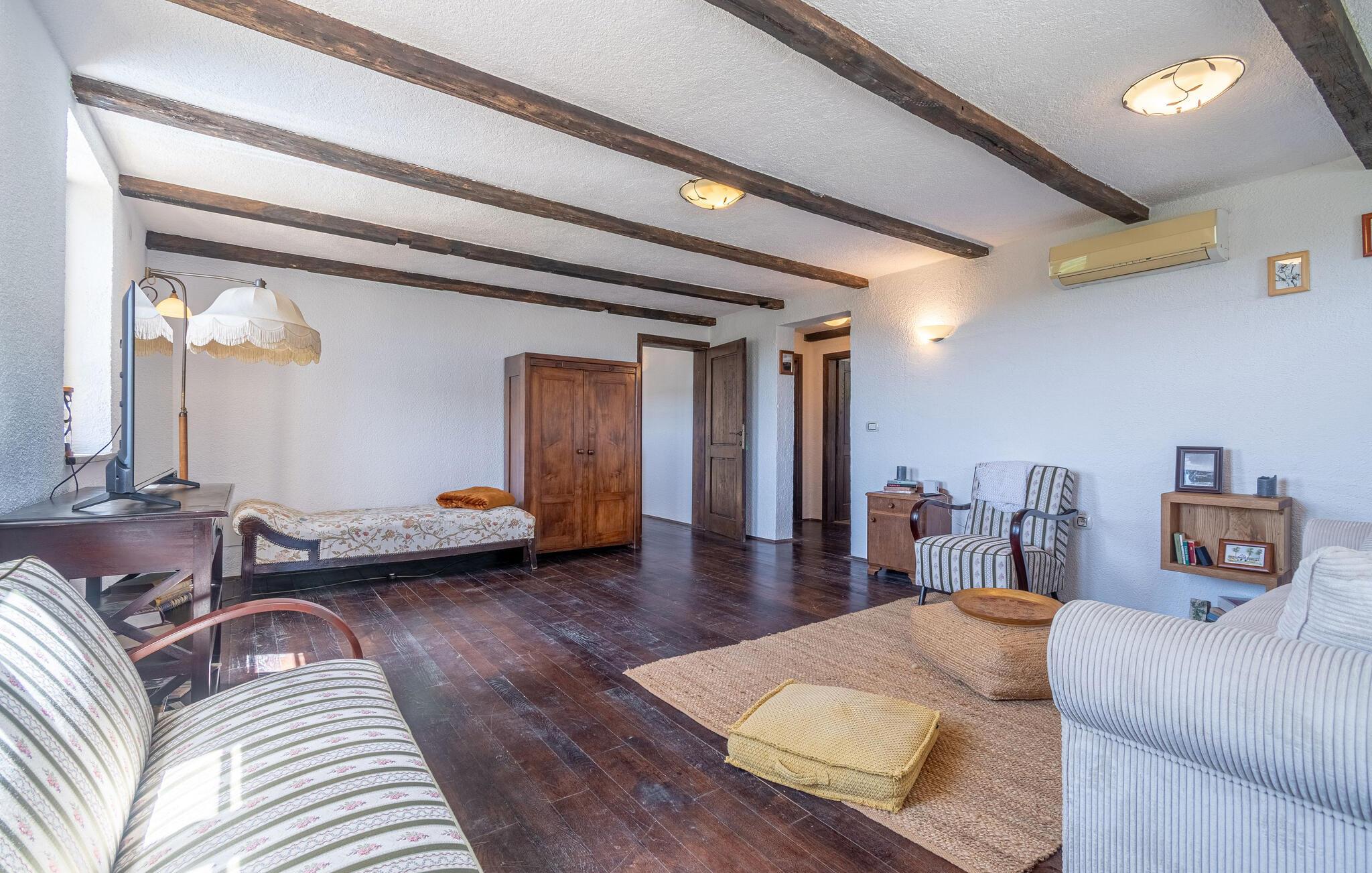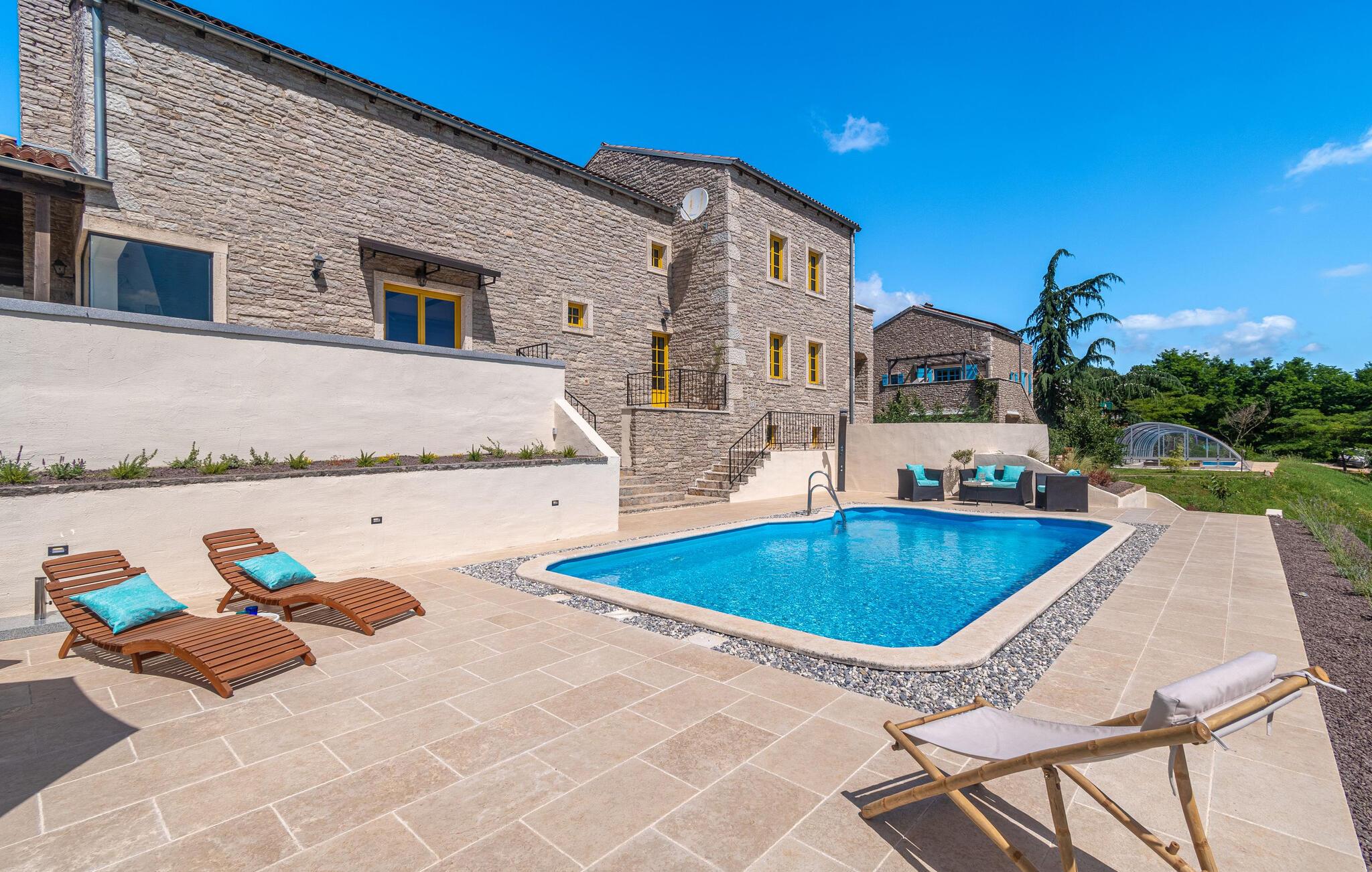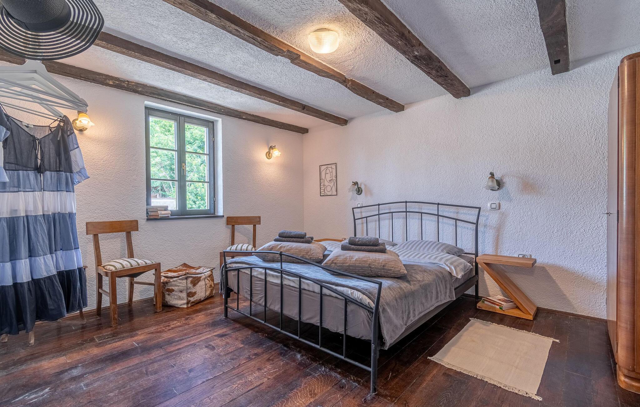 Jeres moderne feriehus i Brajkovici nær Pazin byder på rustik elegance og maksimal komfort. Slå jer ned på den solrige terrasse, udstyret med komfortable udendørsmøbler, og nyd den fredelige atmosfære. For en forfriskende dukkert kan I hoppe i poolen, mens saunaen giver afslapning for både krop og sind. Start dagen med en afslappet morgenmad på den store overdækkede terrasse, og afslut aftenen med en hyggelig grillaften. Det rummelige opholdsrum i huset indbyder til afslapning, hvor den rustikke charme i indretningen skaber den perfekte stemning for velvære.