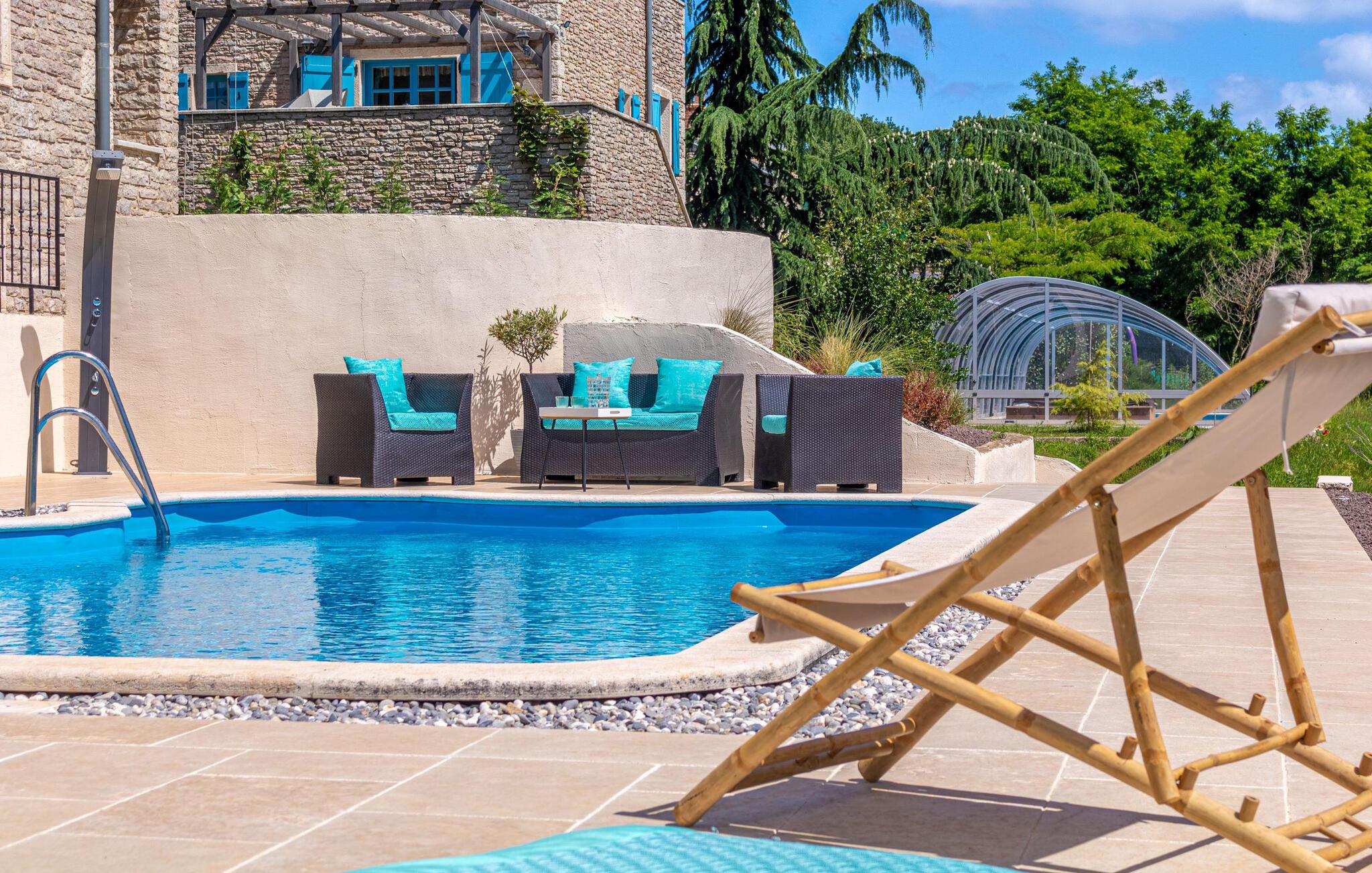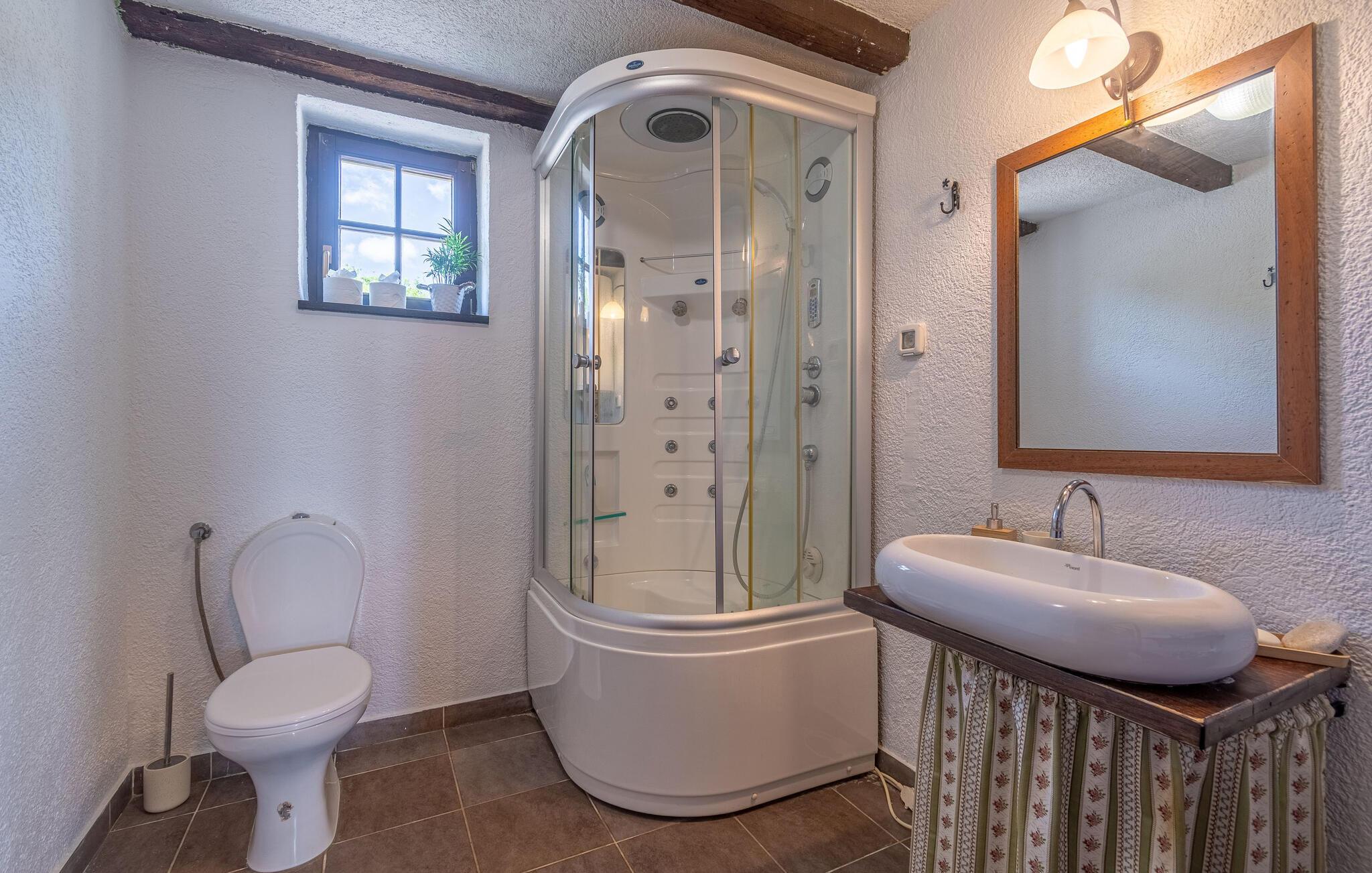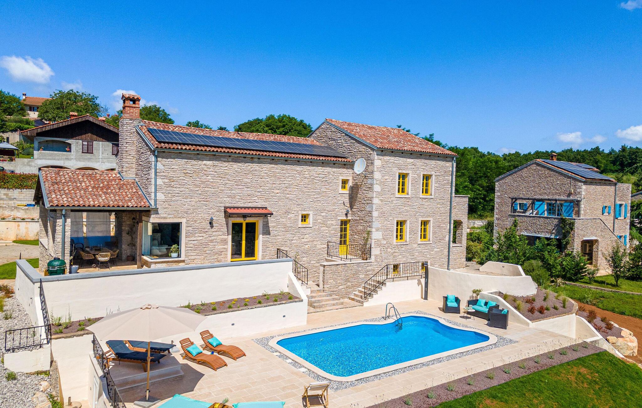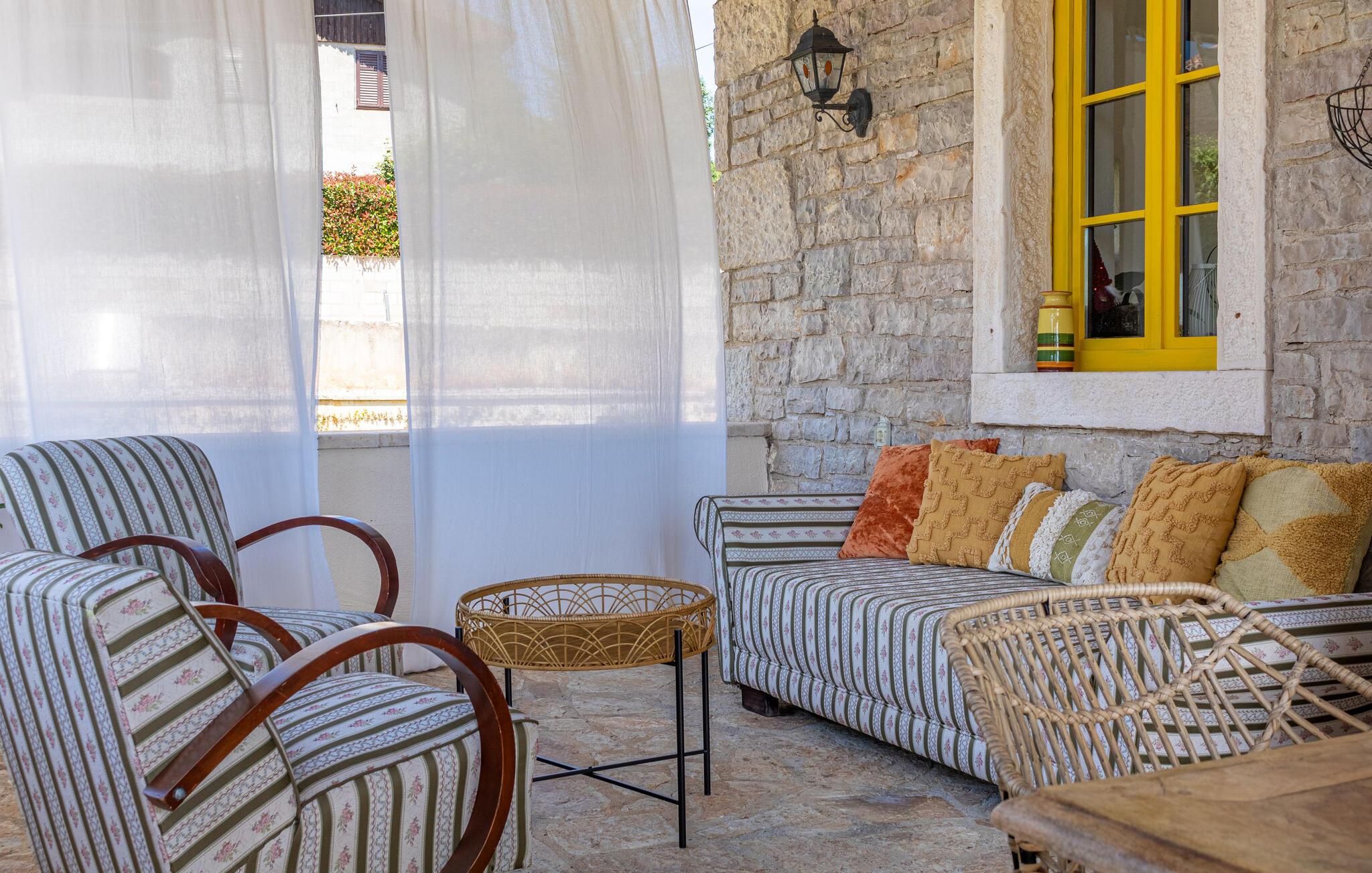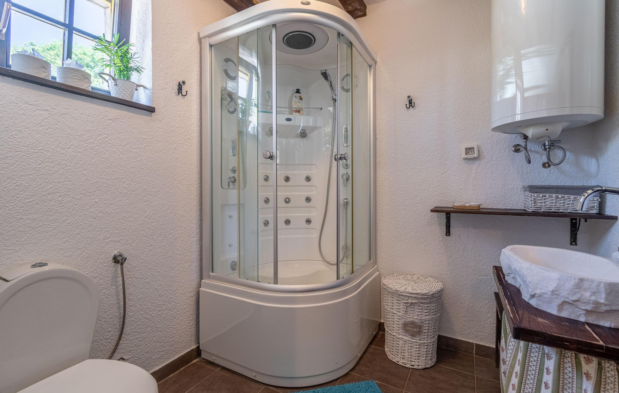Jeres moderne feriehus i Brajkovici nær Pazin byder på rustik elegance og maksimal komfort. Slå jer ned på den solrige terrasse, udstyret med komfortable udendørsmøbler, og nyd den fredelige atmosfære. For en forfriskende dukkert kan I hoppe i poolen, mens saunaen giver afslapning for både krop og sind. Start dagen med en afslappet morgenmad på den store overdækkede terrasse, og afslut aftenen med en hyggelig grillaften. Det rummelige opholdsrum i huset indbyder til afslapning, hvor den rustikke charme i indretningen skaber den perfekte stemning for velvære.