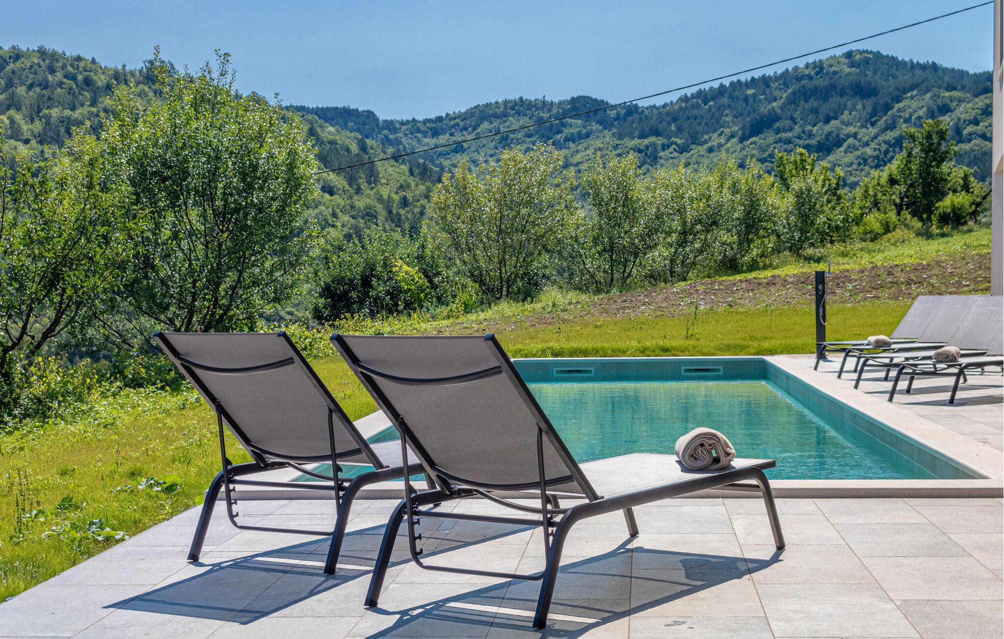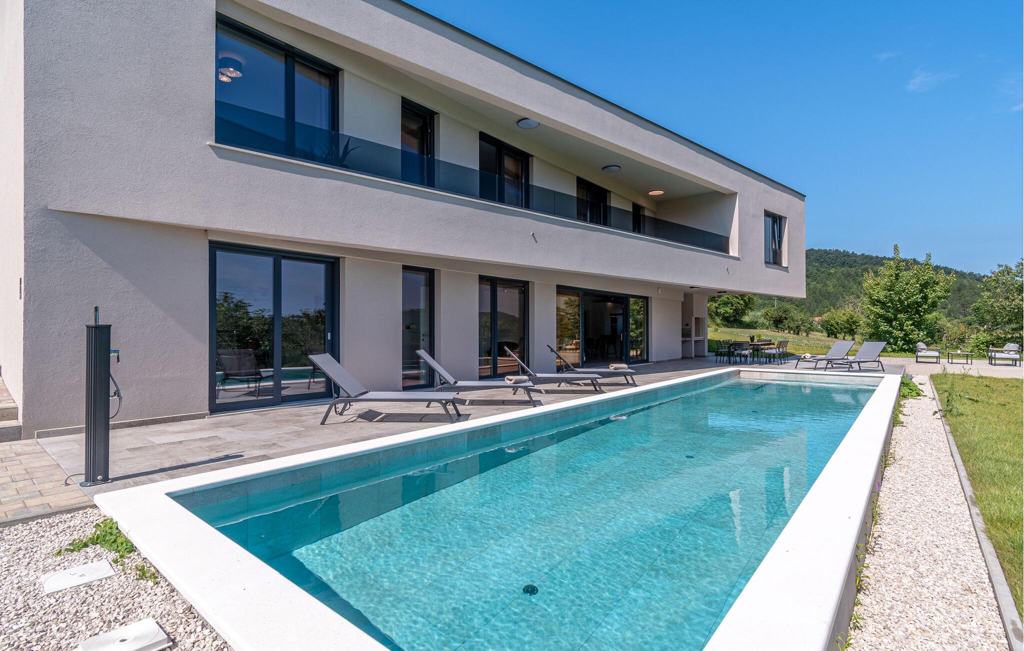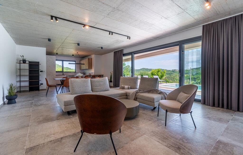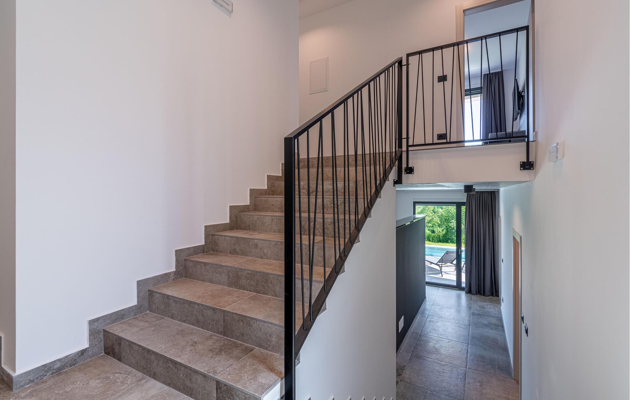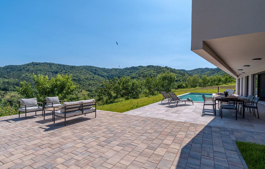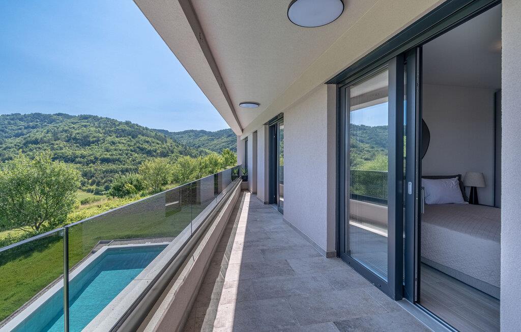 Dette stilfulde feriehus nær Pazin lægger op til at nyde livet og have det rart med sit moderne design og komfortable møbler. Nyd afslappende timer på den solrige terrasse, som er udstyret med komfortable udendørsmøbler eller snup en frisk dukkert i poolen, som byder på en fantastisk udsigt over de omkringliggende grønne bakker. Begynd dagene med en afslappet morgenmad på den rummelige terrasse eller afslut aftenen med en grillmiddag. Husets åbne opholdsstue byder på masser af plads til at slappe af og et veludstyret køkken, hvor I kan lave mad sammen. Fitness kommer I heller ikke til at mangle. Brug fitnessrummet til at holde jer i form, mens I er på ferie.