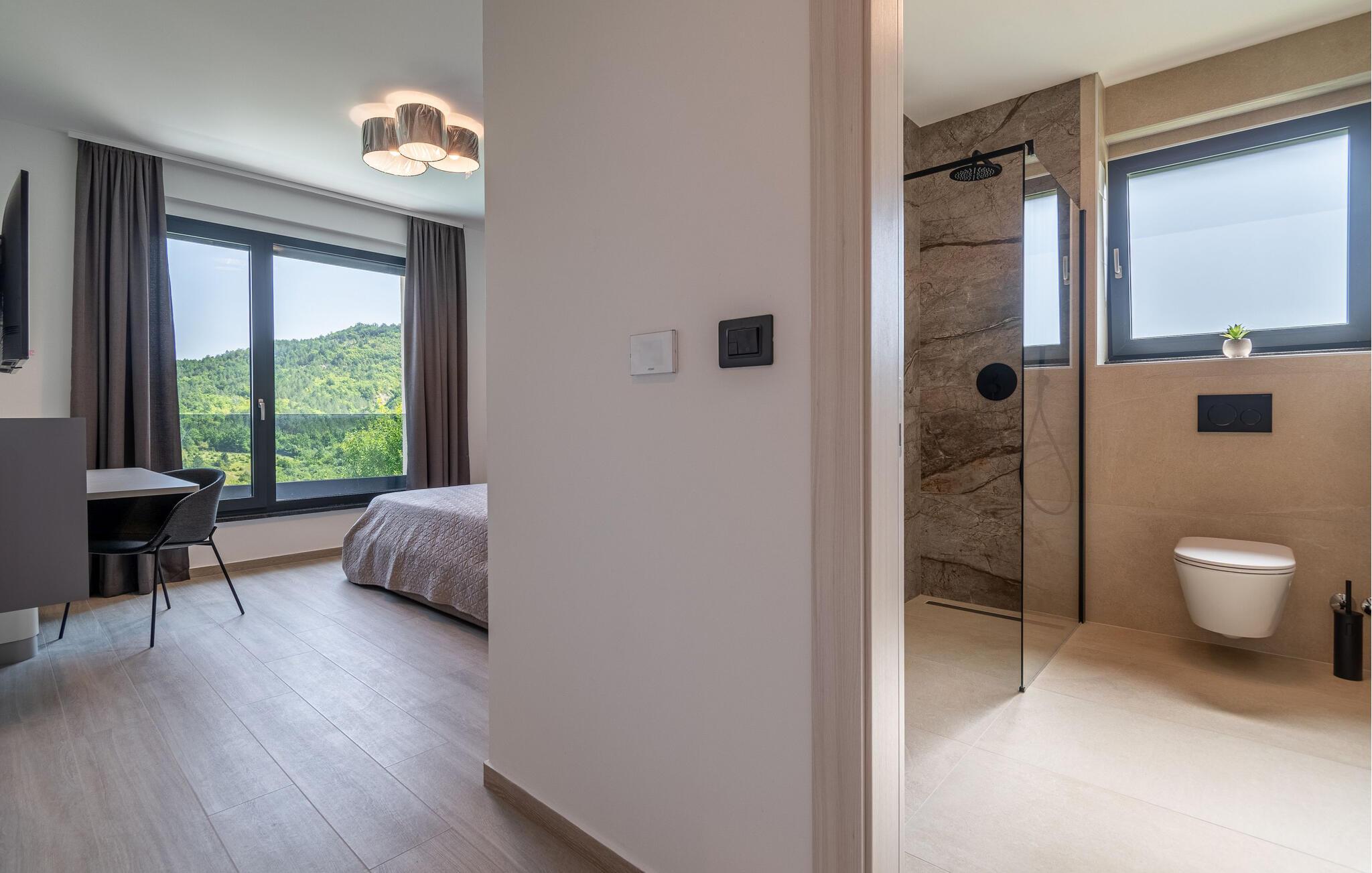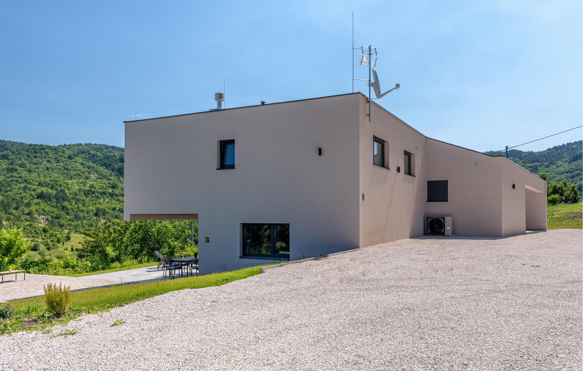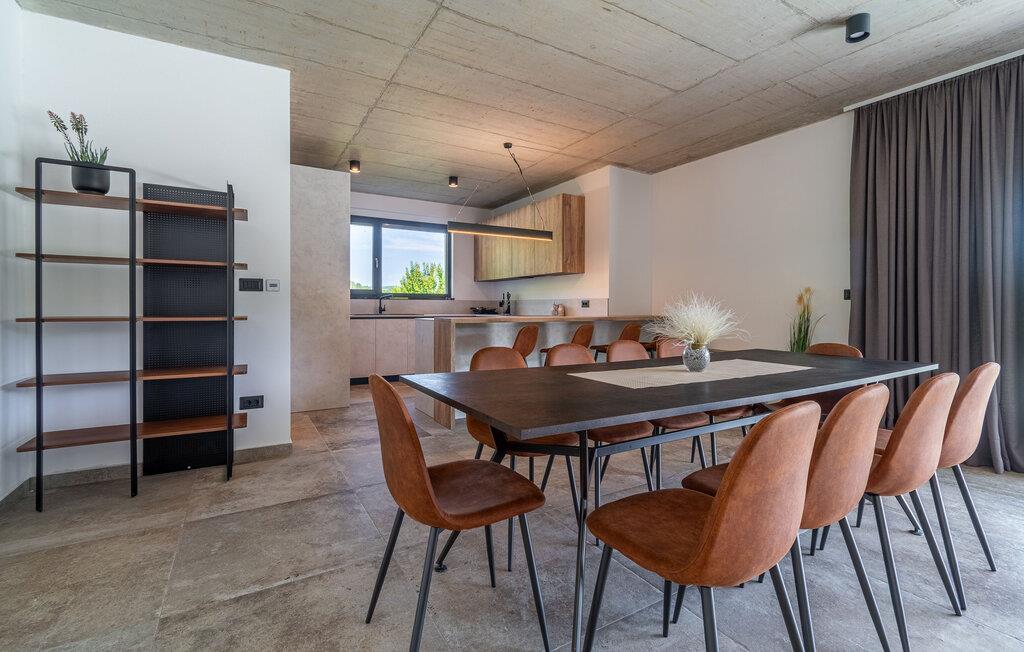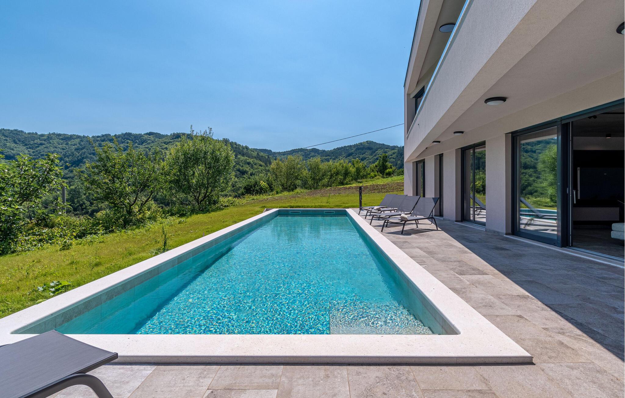 Dette stilfulde feriehus nær Pazin lægger op til at nyde livet og have det rart med sit moderne design og komfortable møbler. Nyd afslappende timer på den solrige terrasse, som er udstyret med komfortable udendørsmøbler eller snup en frisk dukkert i poolen, som byder på en fantastisk udsigt over de omkringliggende grønne bakker. Begynd dagene med en afslappet morgenmad på den rummelige terrasse eller afslut aftenen med en grillmiddag. Husets åbne opholdsstue byder på masser af plads til at slappe af og et veludstyret køkken, hvor I kan lave mad sammen. Fitness kommer I heller ikke til at mangle. Brug fitnessrummet til at holde jer i form, mens I er på ferie.