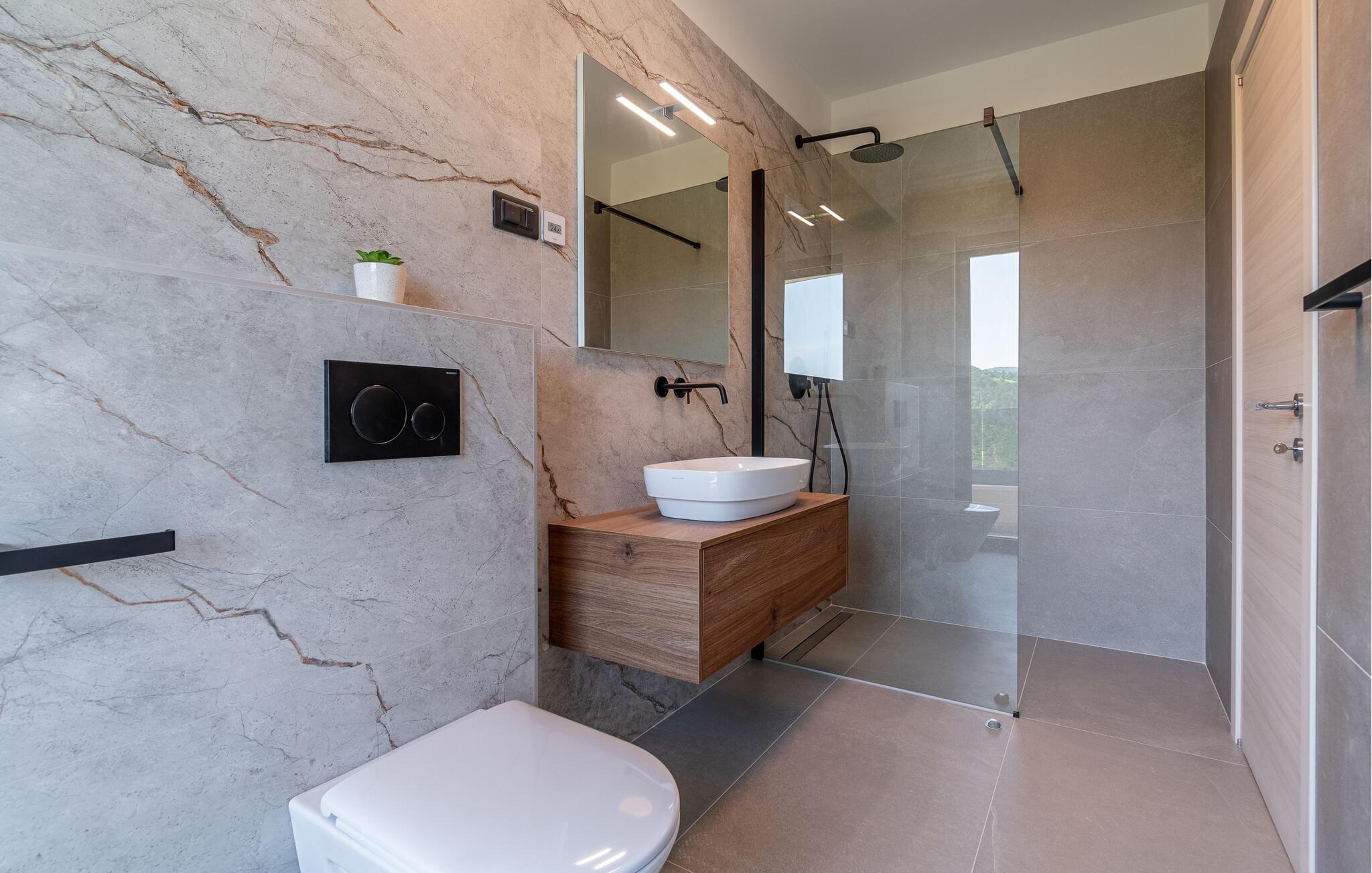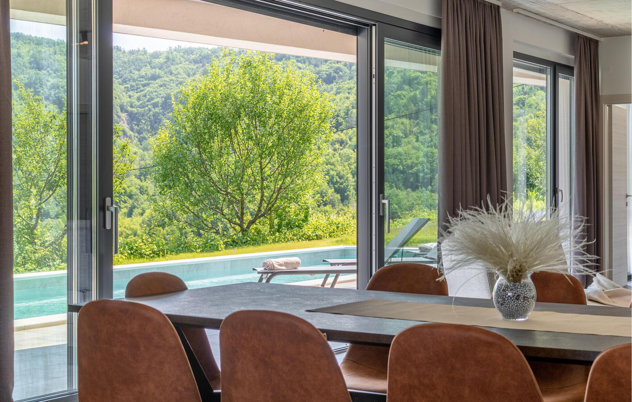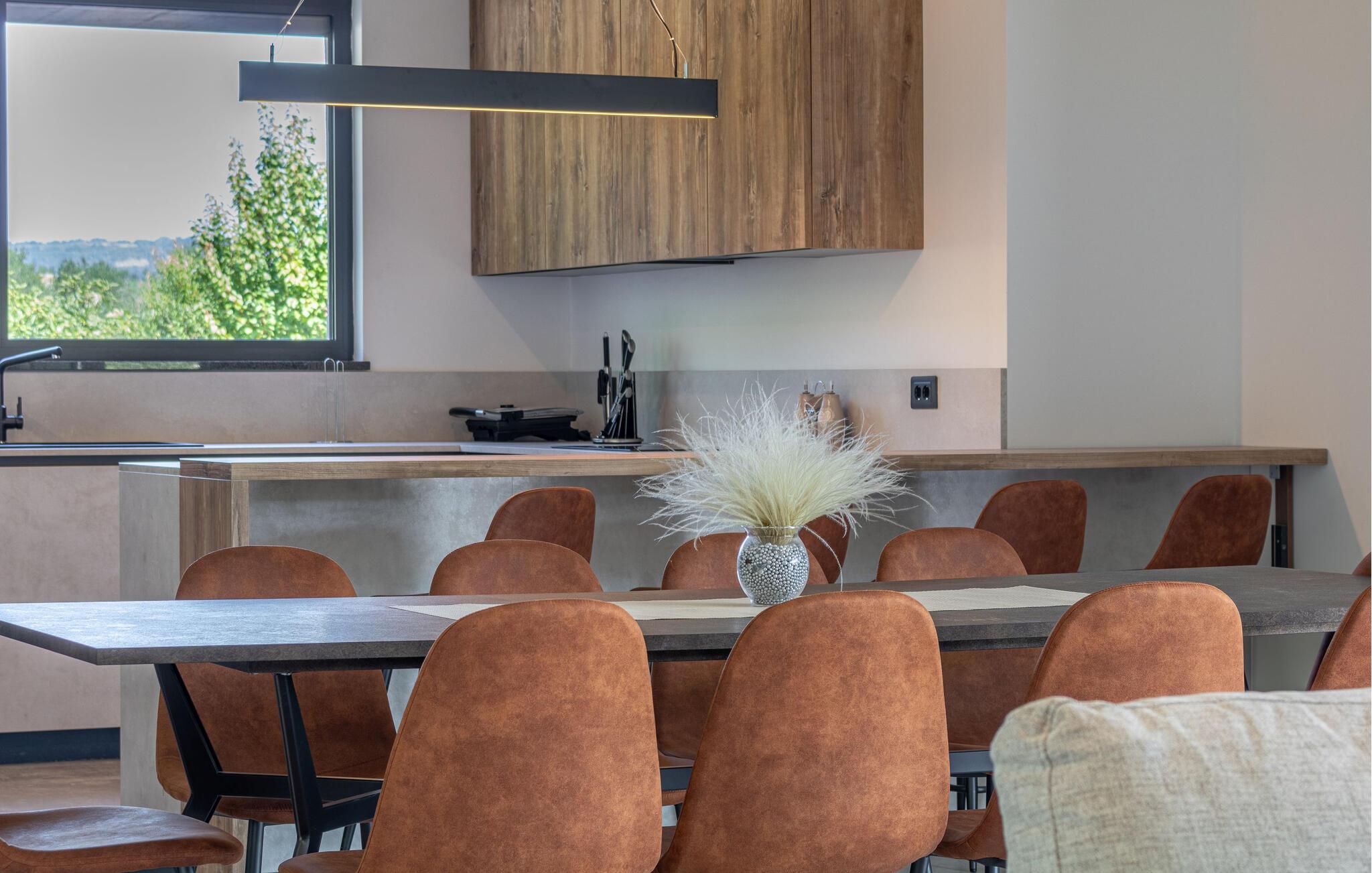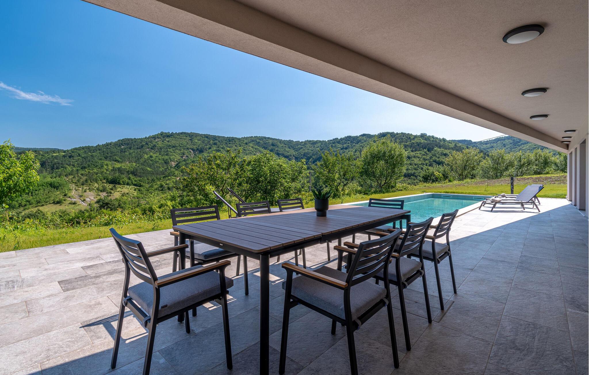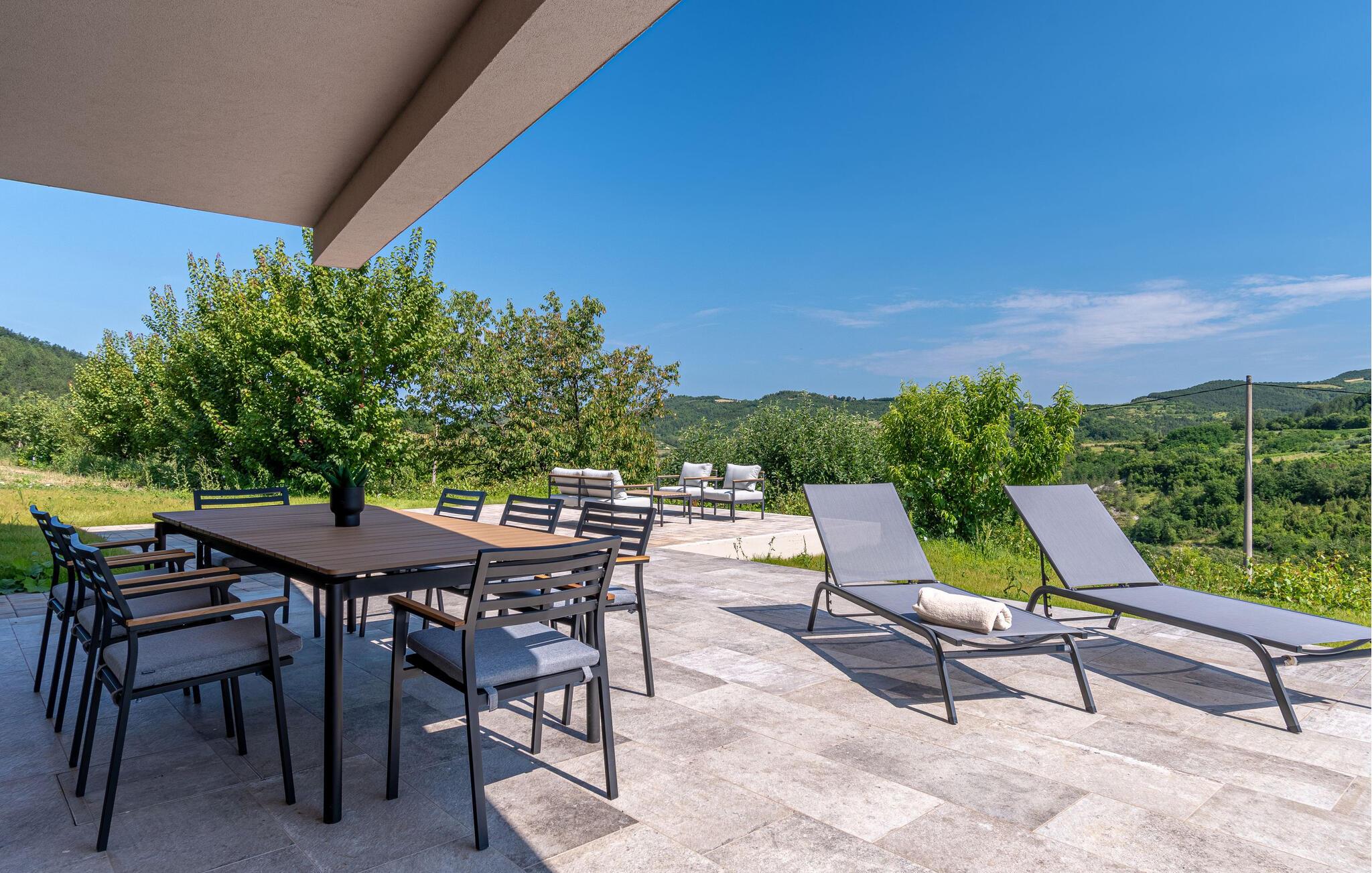 Dette stilfulde feriehus nær Pazin lægger op til at nyde livet og have det rart med sit moderne design og komfortable møbler. Nyd afslappende timer på den solrige terrasse, som er udstyret med komfortable udendørsmøbler eller snup en frisk dukkert i poolen, som byder på en fantastisk udsigt over de omkringliggende grønne bakker. Begynd dagene med en afslappet morgenmad på den rummelige terrasse eller afslut aftenen med en grillmiddag. Husets åbne opholdsstue byder på masser af plads til at slappe af og et veludstyret køkken, hvor I kan lave mad sammen. Fitness kommer I heller ikke til at mangle. Brug fitnessrummet til at holde jer i form, mens I er på ferie.