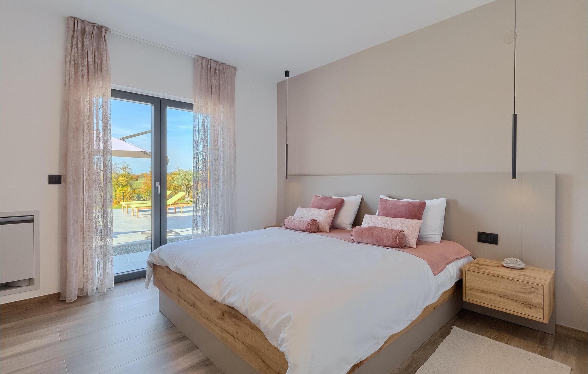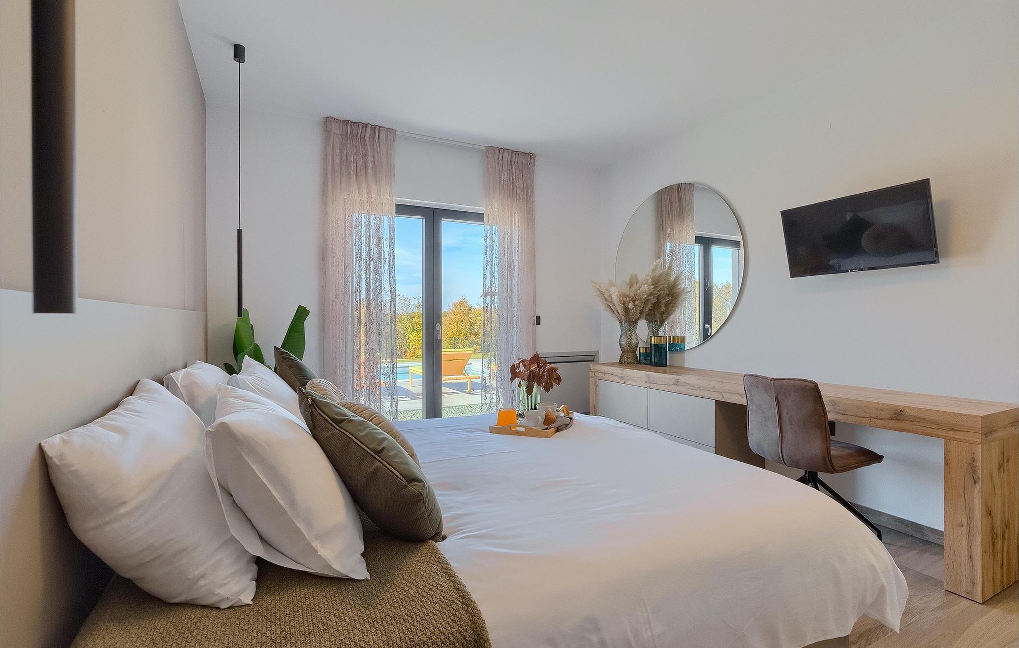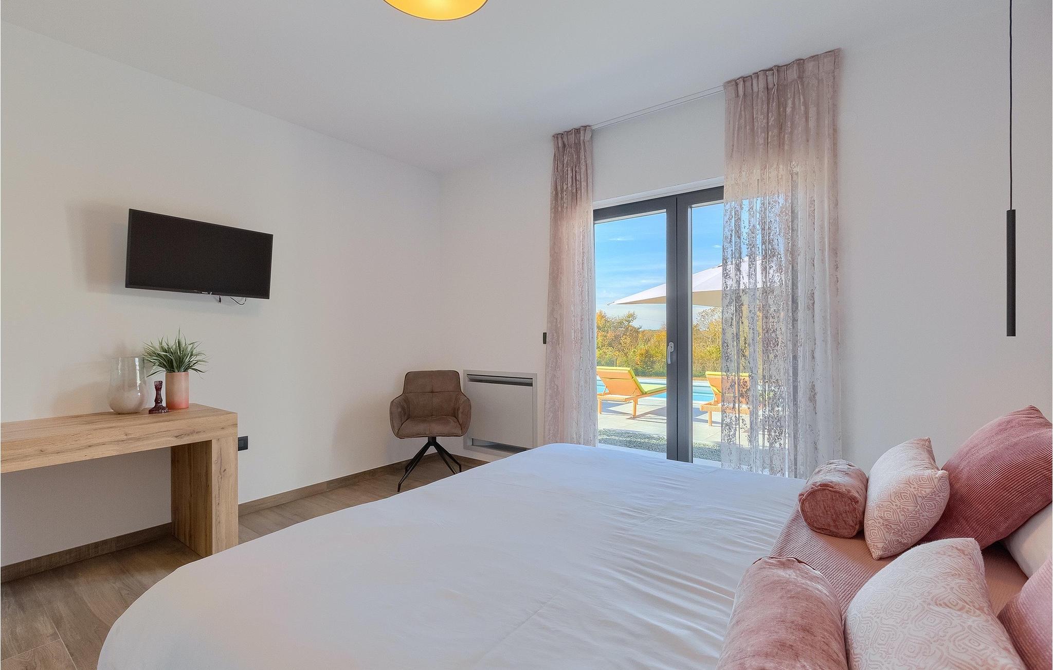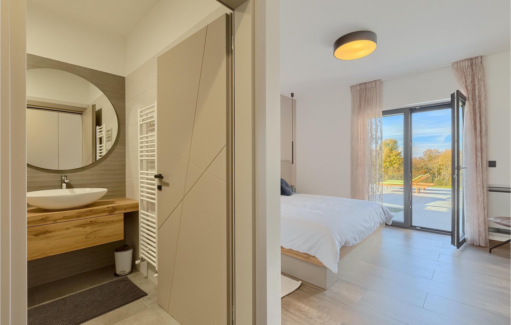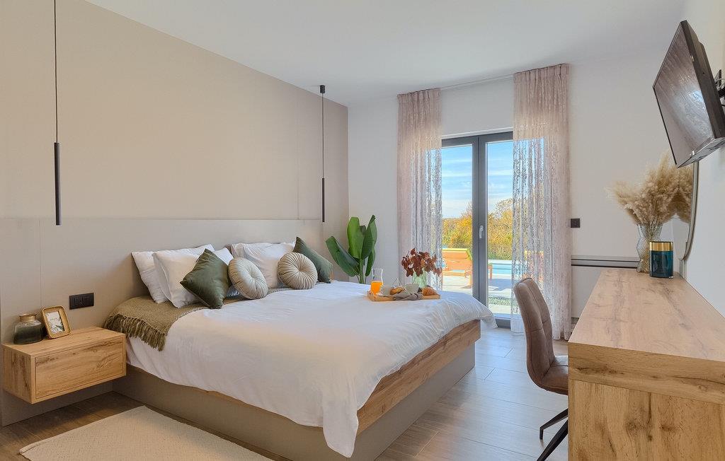 Den nybyggede Villa Lara Baksi, omgivet af natur, ligger i en stille landsby nær den maleriske by Gracisce. Den kan rumme op til 8 personer og er derfor perfekt til familier eller par. I det indre af den helt klimatiserede villa vil du bemærke, at der er brugt enkle farver, som virker beroligende. Den åbne opholds- og spiseafdeling er stilfuldt indrettet, hvor du vil opleve en harmonisk atmosfære. Det fuldt udstyrede køkken med en ø byder på masser af plads til at lave lækre måltider. Villaen har 4 komfortable soveværelser. Tre af dem har en dobbeltseng, tv og moderne ensuite badeværelse og en har en køjeseng. Udendørsområdet omfatter en helt indhegnet grøn have, hvor den private pool med liggestole og parasoller er placeret. Den overdækkede terrasse med siddepladser er perfekt til at nyde din morgenkaffe og den maleriske naturudsigt. Der er også en grill, som indbyder til dejlige grillaftener med dine kære. Børn kan more sig på den private legeplads. En volleyballbane er placeret på ejendommen - måske du får lyst til en volleyballkamp? 3 private parkeringspladser og internetadgang er også tilgængelige. Book Villa Lara Baksi og tilbring en uforglemmelig ferie, hvor ingen ønsker forbliver uopfyldt.Villa Lara Baksi ligger i den rolige landsby Mandalencici. I nærheden på en bakke ligger den maleriske by Gracisce, centrum af den enslydende kommune. Du vil opleve middelalderlig stil, mens du går gennem gyderne i den lille by. På vejen møder du gamle bygninger, paladser og pladser, der helt sikkert vil fortrylle dig. Istriens grønne uendelige bakkede landskaber inviterer dig til at tage på vandre- og cykelture. En kort køretur væk ligger byen Pazin. Det administrative centrum i regionen Istrien blev kaldt "Istriens hjerte" i det 19. århundrede på grund af dets centrale beliggenhed. Det tilbyder en række seværdigheder, som du skal besøge. På cirka 40 minutters kørsel kan du nå de berømte kystbyer Rovinj, Porec og Rabac, hvor du kan finde en bred vifte af caféer, restauranter, seværdigheder, sportsfaciliteter og smukke strande og bugter.