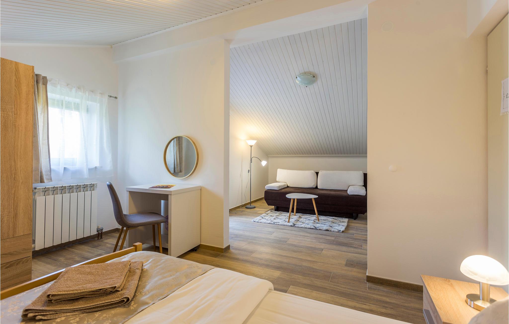 Dette flotte og moderne toetagers feriehus ligger i rolige omgivelser. Det er omgivet af facinerede kroatisk natur. Nyd stilheden langt fra storbyens travlhed og sæt jer til rette med en bog i skyggen ved poolen. Den dejlige swimmingpool gør de varme dage behagelige. Ved siden af huset ligger der en typisk regional restaurant - en konoba - hvor I kan prøve de lækre egnsretter. Her kan I slappe af, tage på vandreture, cykle eller besøge stranden. Udforsk området og tag på udflugter til de små landsbyer i landets indre. Gå ikke glip af den kønne middelalderby Motovun med dens gamle bymure. Motovun byder også på den årlige filmfestival i juli. Er I filmentusiaster så få fat på progammet, her er garanteret en eller flere film i gerne vil se. Laveste taghøjde i tagetagen er 1 m. Området er egner sig rigtig godt til at tage på lange cykelture, eller lange gåture på nogle af de mange stier. der findes man små landsbyer i området som bestemt er et besøg værd.