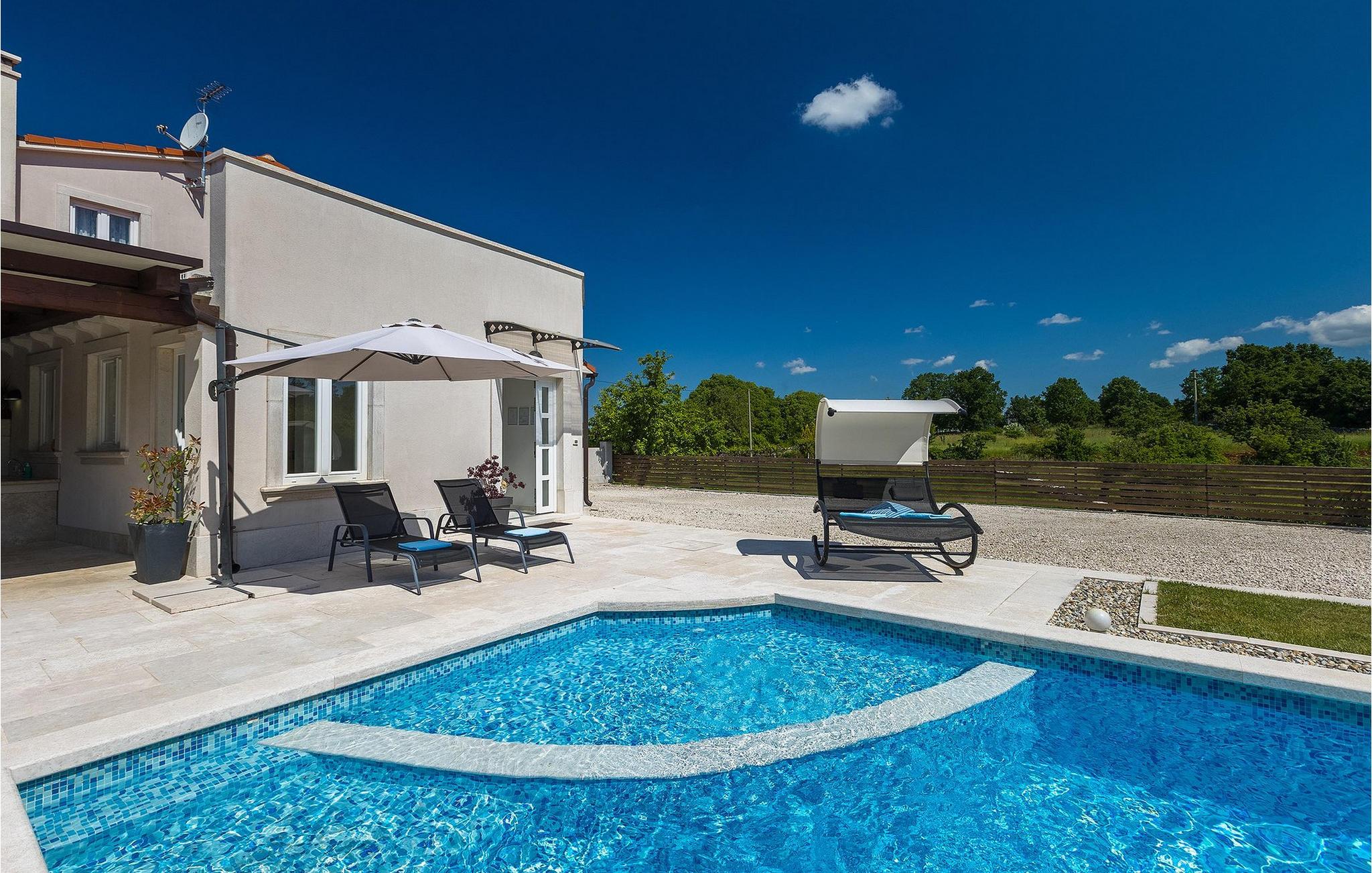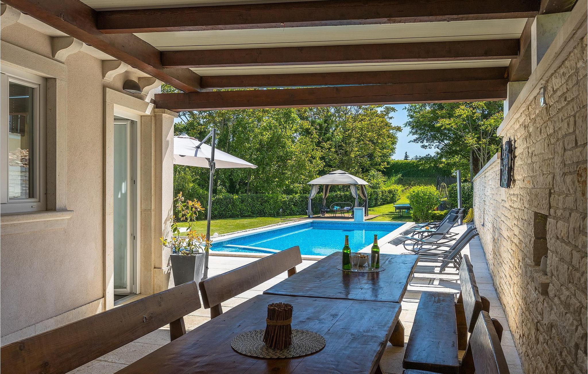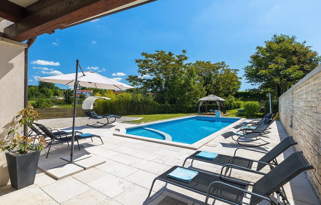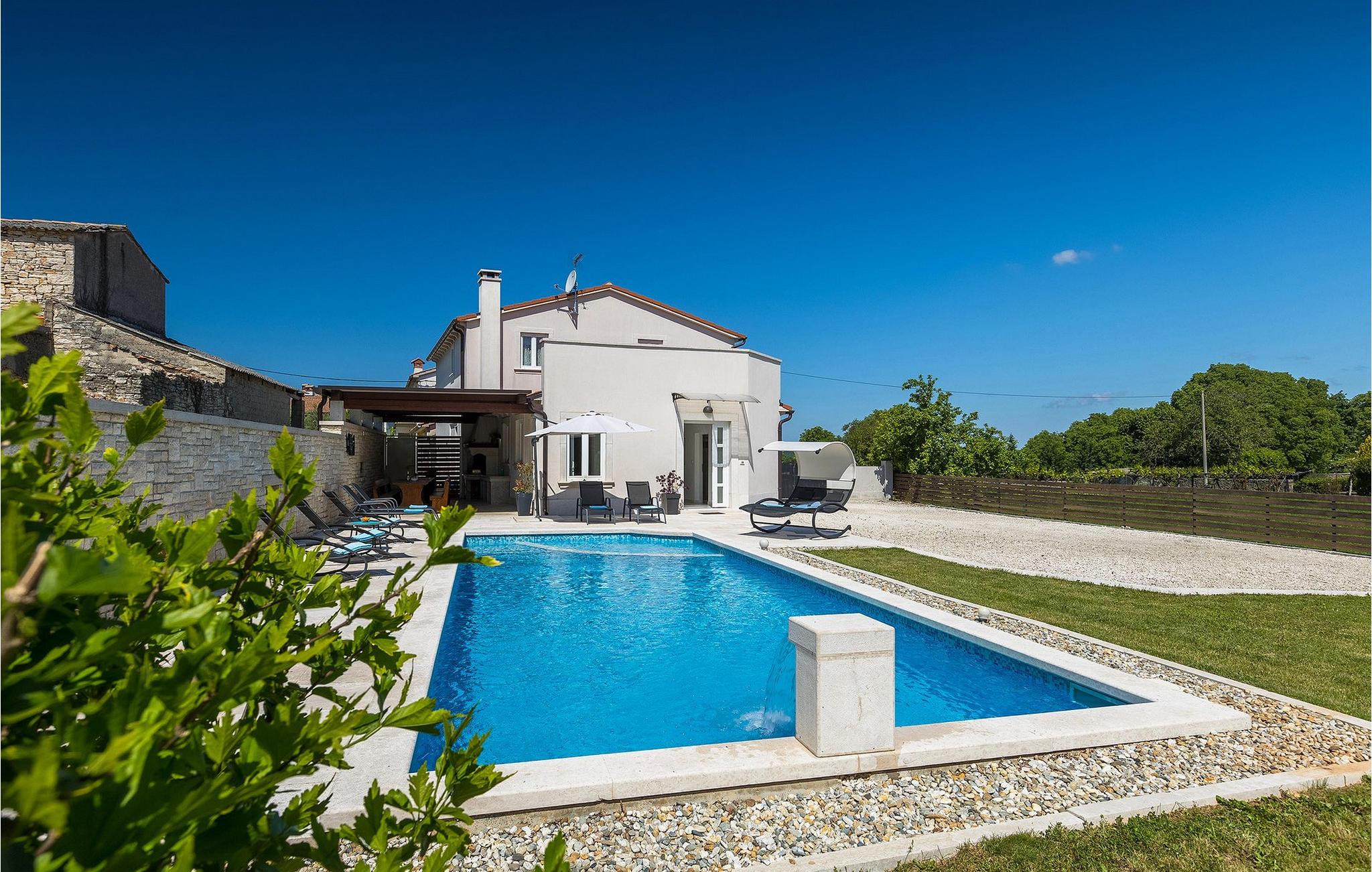Den smukke Villa Ema Istra ligger i Sveti Petar u Sumi i det centrale Istrien. Villaen byder på 6 soveværelser, 5 badeværelser og et rummeligt udendørsområde med privat pool, bordtennis og legeplads. Lad os tage en tur.