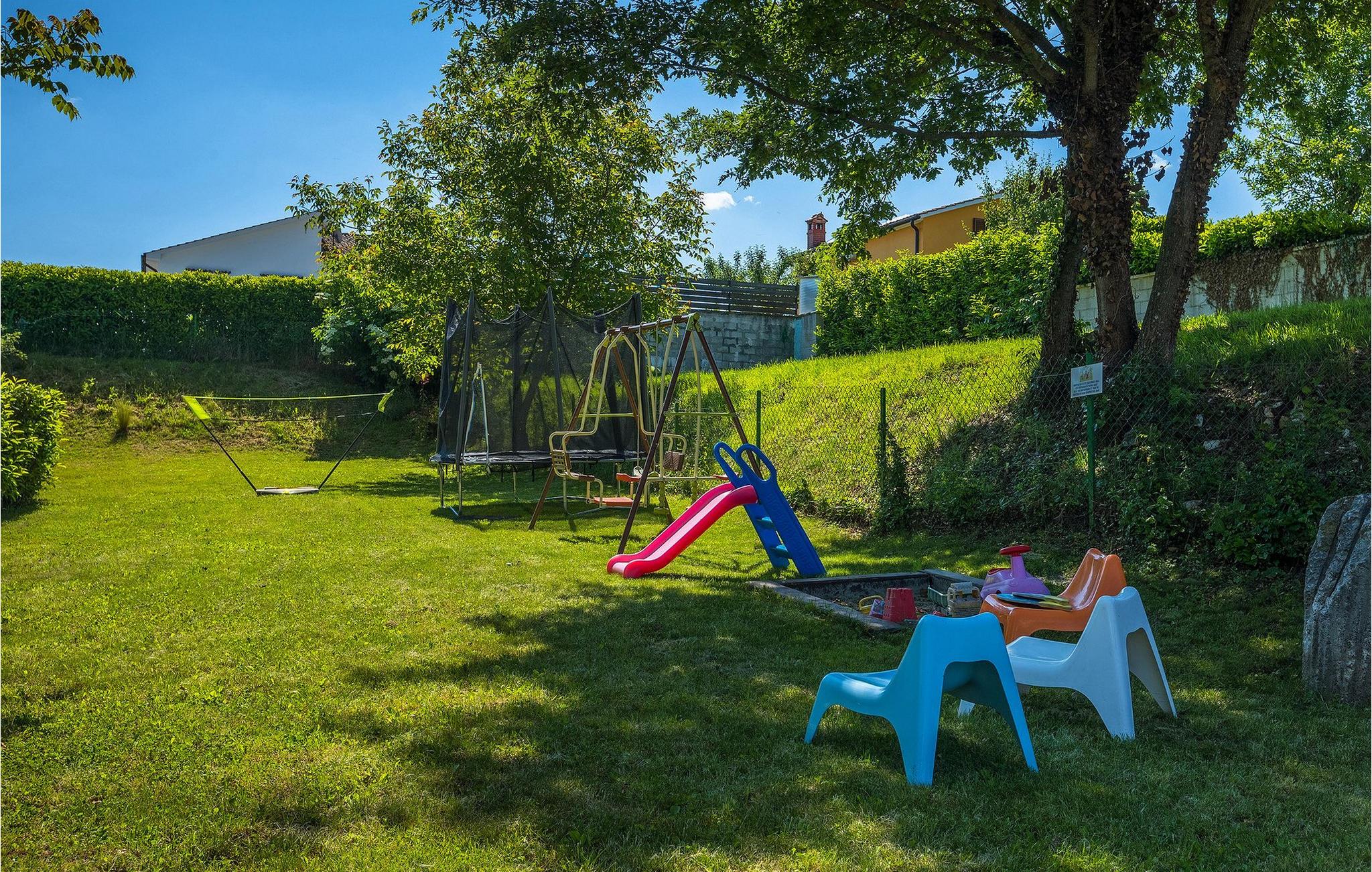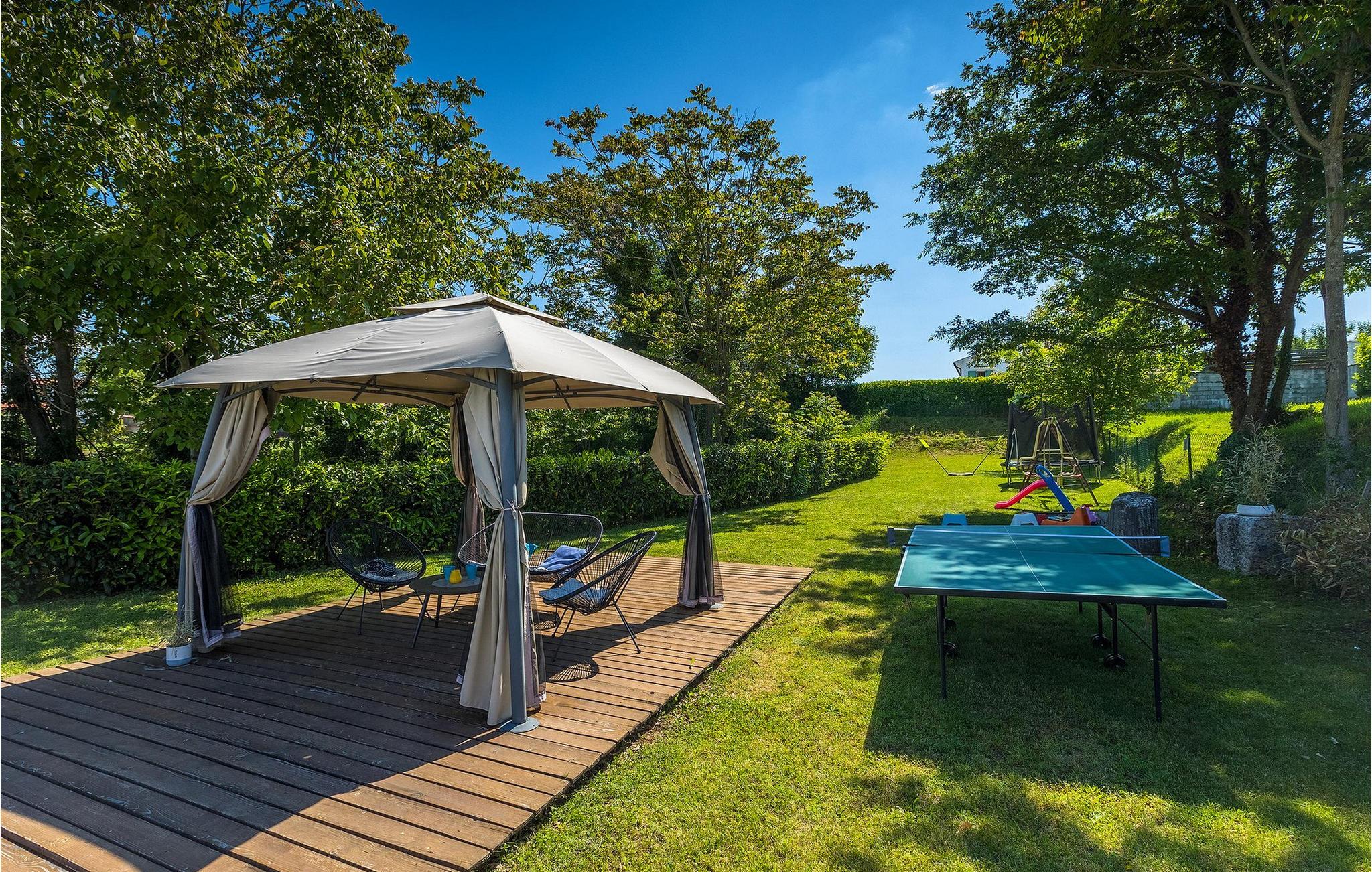 I det udendørs område af villaen finder du en privat pool med liggestole og et overdækket udendørs spisebord med grill. Omgivet af grønne områder i villaens have finder du bordtennisbord, en trampolin, legeplads, badmintonnet og havemøbler, hvor du kan nyde en kold drink med venner og familie.