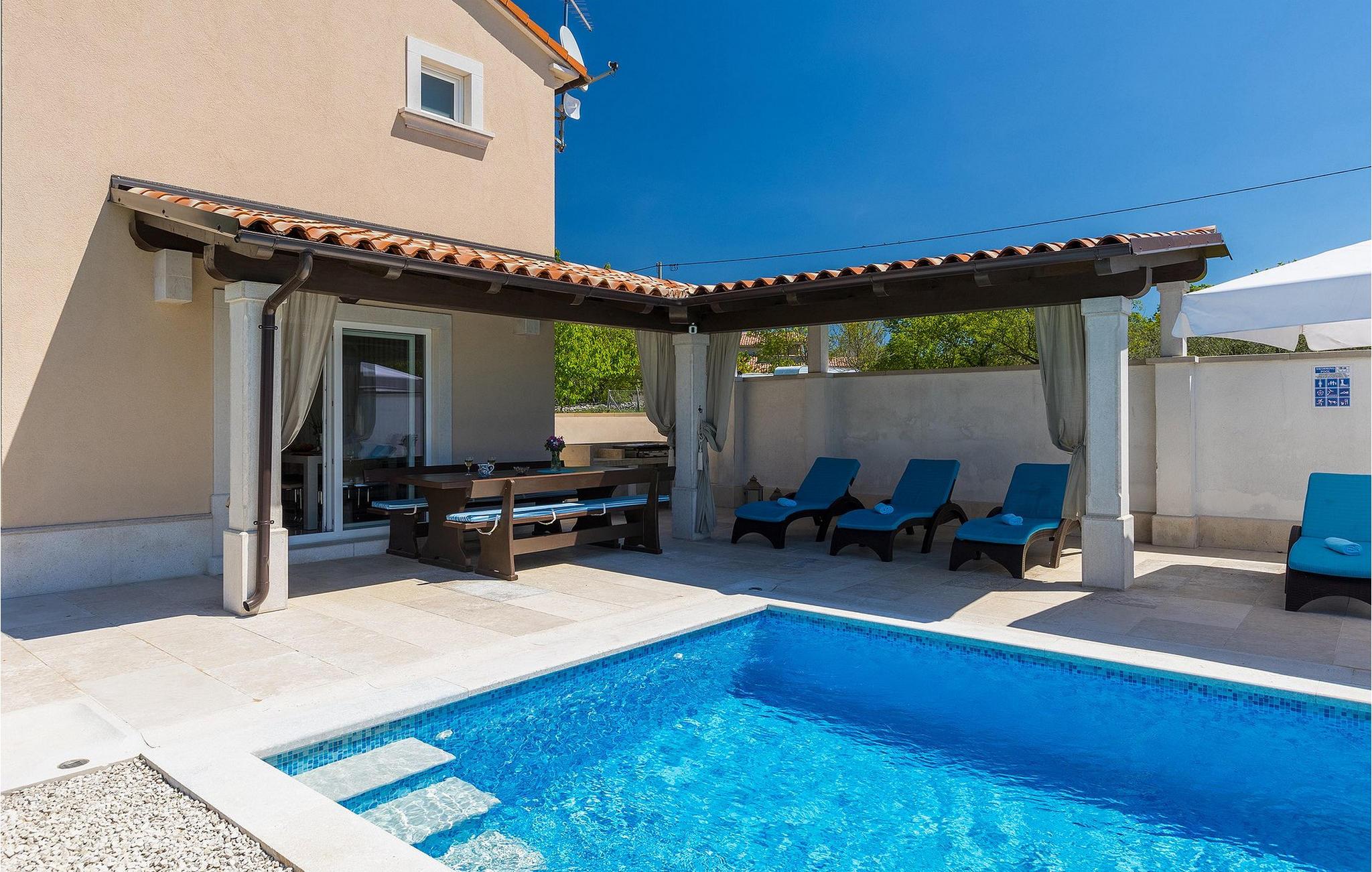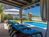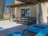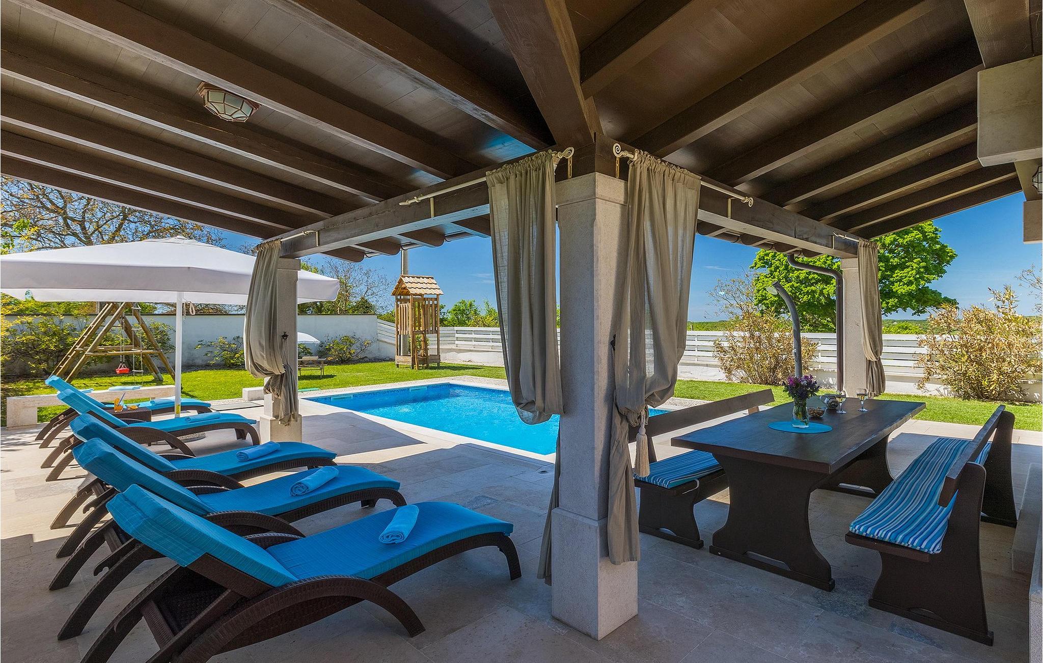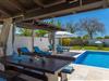 Neben dem Pool befindet sich eine überdachte Terrasse mit Esstisch und Grill, wo Sie köstliche Mahlzeiten zubereiten können.