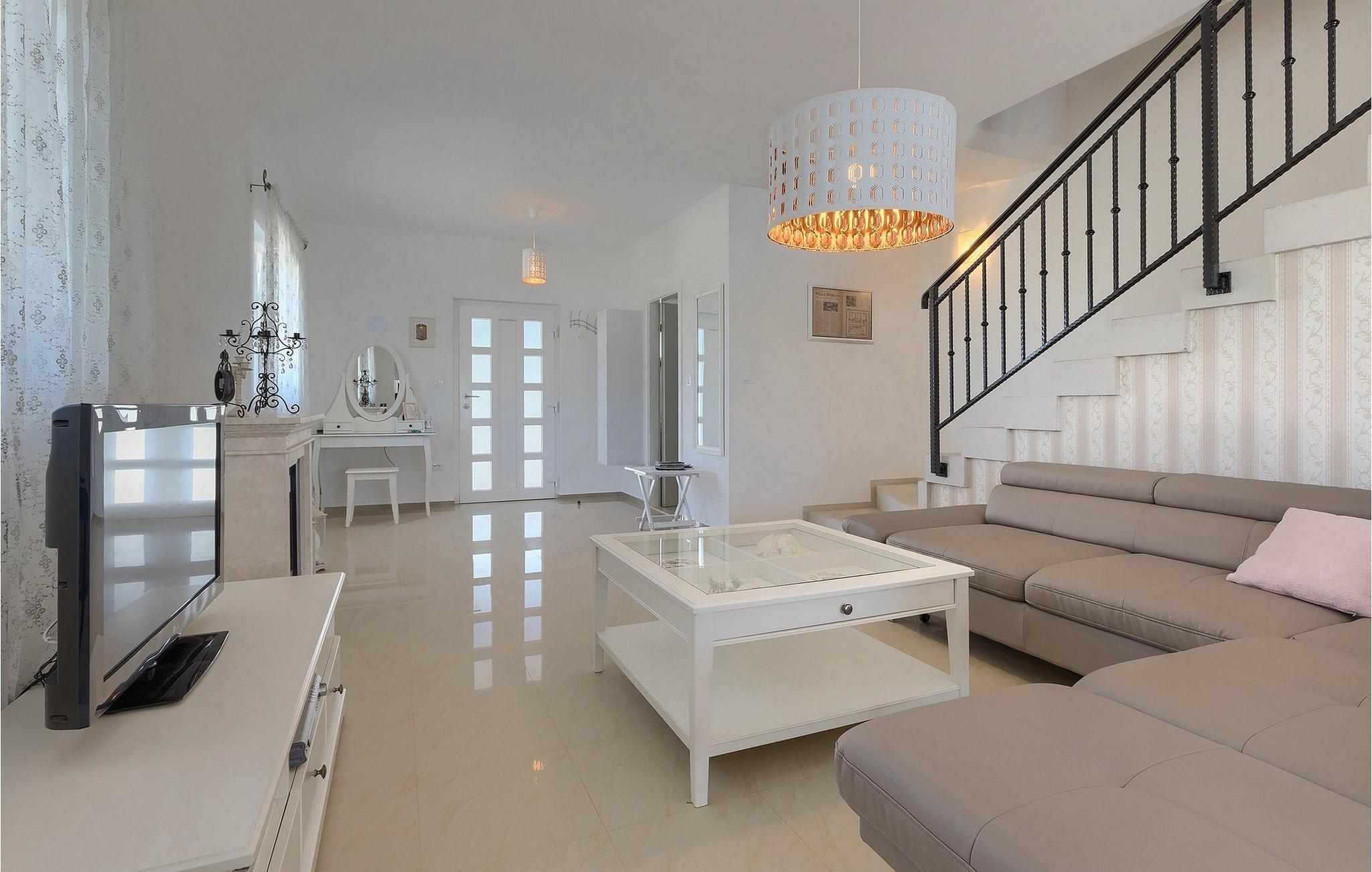 Das offen konzipierte und lichtdurchflutete Erdgeschoss verfügt über ein Wohnzimmer, eine Küche, ein Esszimmer und ein Badezimmer. Vom Wohnzimmer/Küche aus haben Sie direkten Zugang zum schönen privaten Pool mit Sonnenliegen.