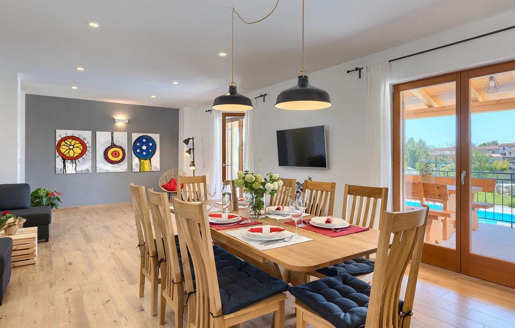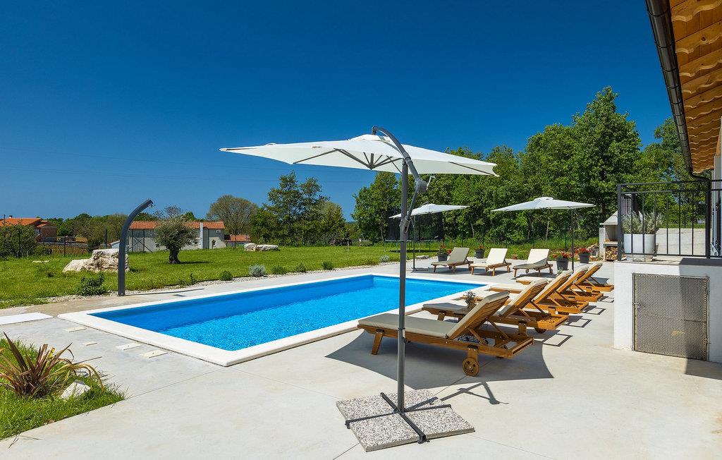 Villa Roza-Dolinci ligger i hjertet af Istrien, i den rolige landsby Dolinci, Sveti Petar u Sumi. Det er bygget i traditionel istrisk stil og inviterer dig til fuldstændig fred og afslapning. Stueetagen af villaen består af en hyggelig stue, en spisestue, et fuldt udstyret køkken med en kogeø, hvor alle kan nyde charmen ved at lave mad, og et pænt indrettet soveværelse, et badeværelse og et separat toilet. Ovenpå er de andre 3 soveværelser, hvoraf to har to enkeltsenge, der kan kombineres, og et værelse med dobbeltseng. Alle værelser har eget badeværelse, Smart TV og aircondition. Stuen og soveværelserne er dekoreret med abstrakte malerier af lokale kunstnere. Huset er stilfuldt designet i istrisk ånd, lavet af naturmaterialer, med mange trædele såsom en overdækket terrasse, hvor der er en udendørs spiseplads og en kulgrill. Foran villaen er der en 32m2 pool, som er et ideelt sted for forfriskning på de varme sommerdage. Stueetagen (stue, soveværelse og badeværelse), området omkring huset, terrassen og solterrassen ved siden af poolen er velegnet til gæster med begrænset mobilitet og kørestolsbrugere. Poolen og terrassen vender mod syd, så du kan nyde solen hele dagen lang. Ved siden af poolen ligger et poolhus med et opholdsområde, hvor du kan slappe af og nyde pooludsigten. Villaen har trampolin og dart til sjove stunder for hele familien. Hvis du vil udforske omgivelserne, betyder villaens beliggenhed i det centrale Istrien, at du meget hurtigt kan nå de mangfoldige og talrige manifestationer og begivenheder i alle dele af Istrien. Nyd en ferie sammen i villaen og skab uforglemmelige minder, som du vil huske i lang tid!Sveti Petar u Sumi blev opkaldt efter et benediktinerkloster fra begyndelsen af det 12. århundrede, men i århundreder tilhørte det de paulinske fædre - de hvide munke. Det er et usædvanligt sted i Istrien. I modsætning til andre byer og byer i Istrien, hvor landsbyerne ligger på et bjerg, er Sv. Petar u Sumi ligger på et kuperet plateau omgivet af gamle skove. I det omkringliggende område er der en 18 km lang cykelsti, der fører besøgende gennem uberørt natur. Også attraktiv er den 4,2 km lange vandresti Križni put med 14 stationer med stenskulpturer af sakrale motiver. Talrige begivenheder finder sted i Sveti Petar u Sumi, som tiltrækker mange besøgende hvert år. Det mest kendte er pølsemarkedet, hvor mesterskabet i traditionel pølsefyld finder sted. Ikke langt fra villaen er der talrige taverner, hvor du kan smage de fineste istriske delikatesser. Vi anbefaler at besøge andre turistdestinationer, såsom byerne Pula og Rovinj ved kysten og middelalderbyerne Motovun og Buzet i det centrale Istrien.