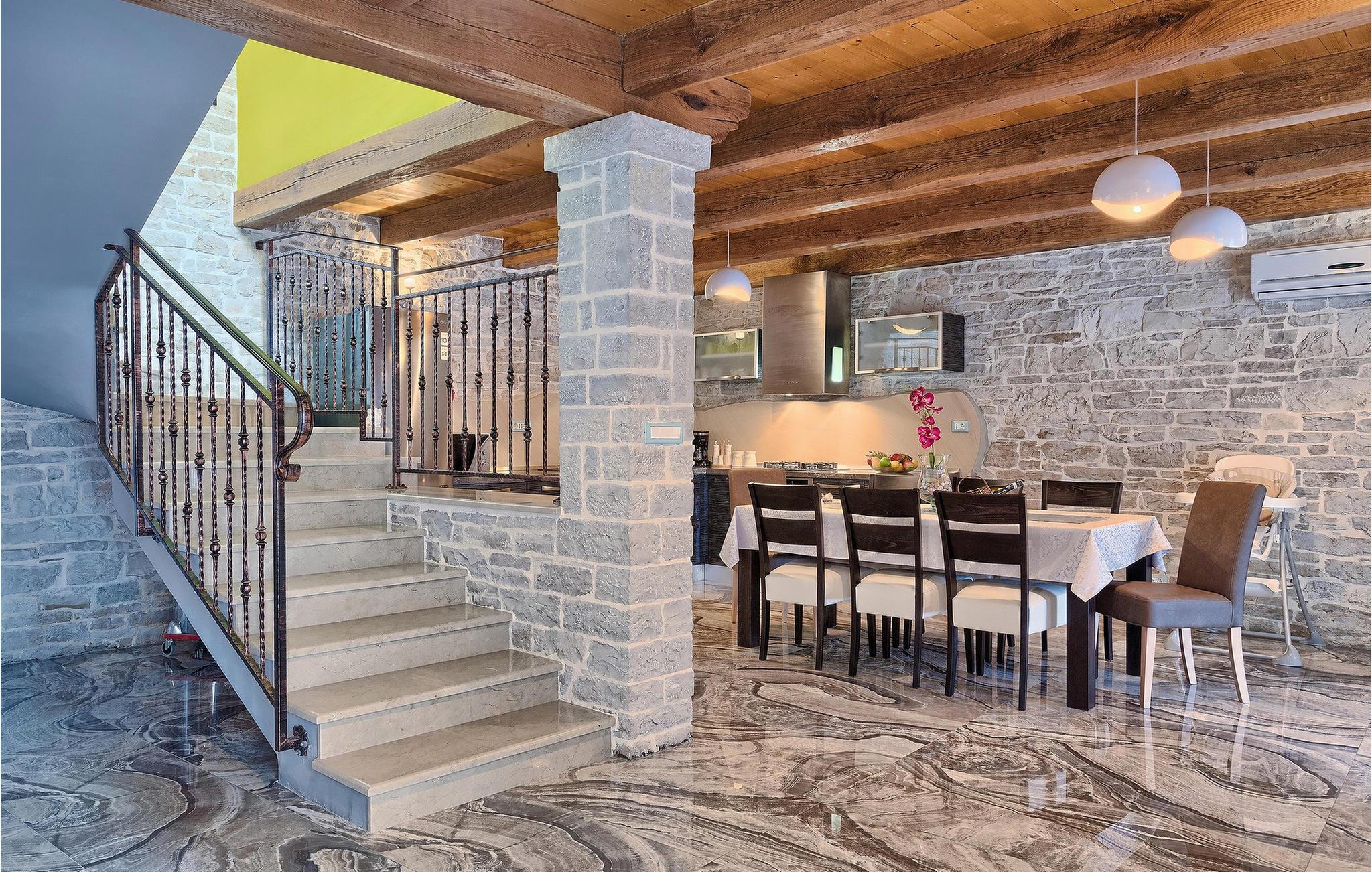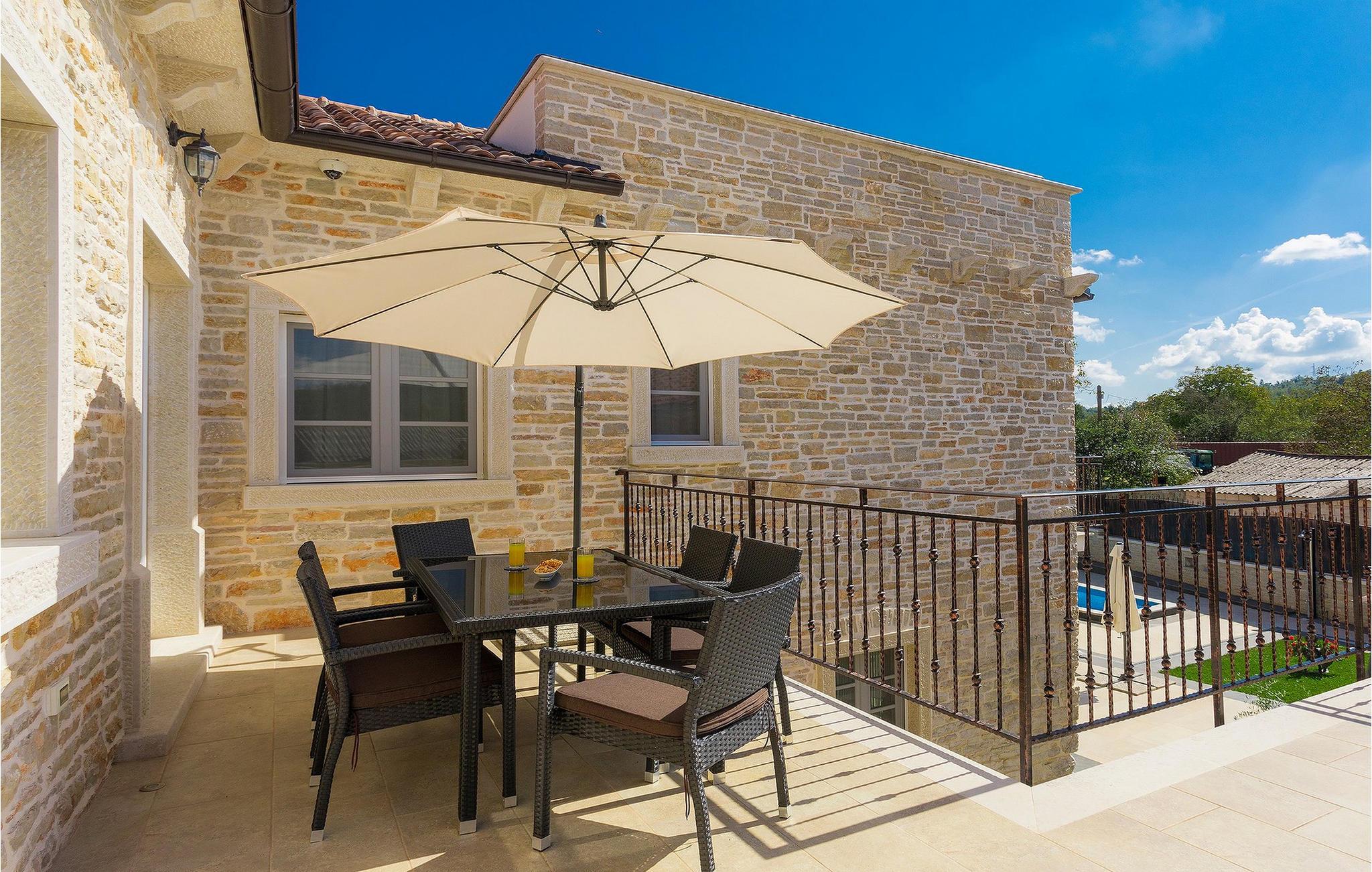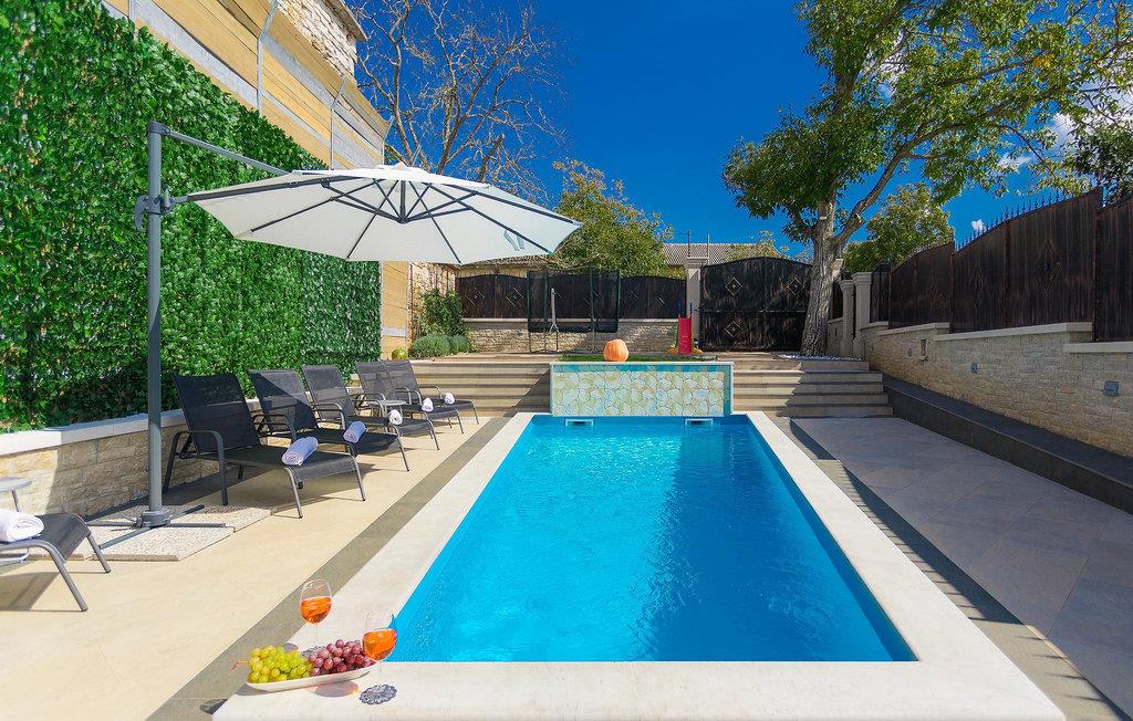 Beliggende i byen Pazin tilbyder den charmerende nybyggede Villa Patrick et roligt, fredeligt miljø i hjertet af Istrien. Villaen er fuldstændig indhegnet og tilbyder fuldstændig privatliv. Du kan prøve zip-linjen, Pazincica åen, hvor du også kan svømme på varme sommerdage, prøve mange kirker, naturparker osv. Villaen har plads til 8 personer og har 4 en-suite soveværelser og et ekstra badeværelse i stueetagen. Hele villaen har gulvvarme, og hvert værelse har aircondition for at gøre dit ophold så behageligt som muligt uanset årstiden. Køkkenet er fuldt udstyret med alle nødvendige hvidevarer og er forbundet med stuen, hvor du kan slappe af ved pejsen og have udsigt til terrassen med privat pool. Uden for villaen er der også en legeplads med trampolin og rutsjebane til børnene, mens de voksne kan nyde deres tid med at tilberede måltider ved pejsen ved poolen. Alle villagæster modtager en velkomstpakke ved ankomsten for at gøre deres ophold i denne villa endnu mere behageligt. Der kan højst bo 8 personer + 2 personer mere i villaen, men mod et ekstra gebyr på 50 € per person hele året rundt.