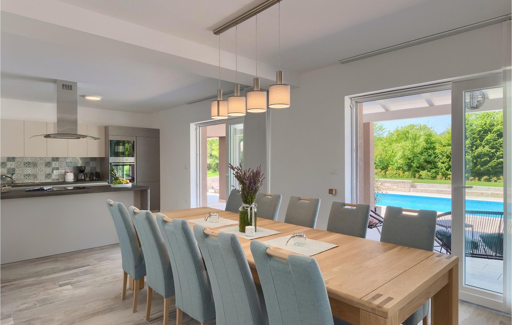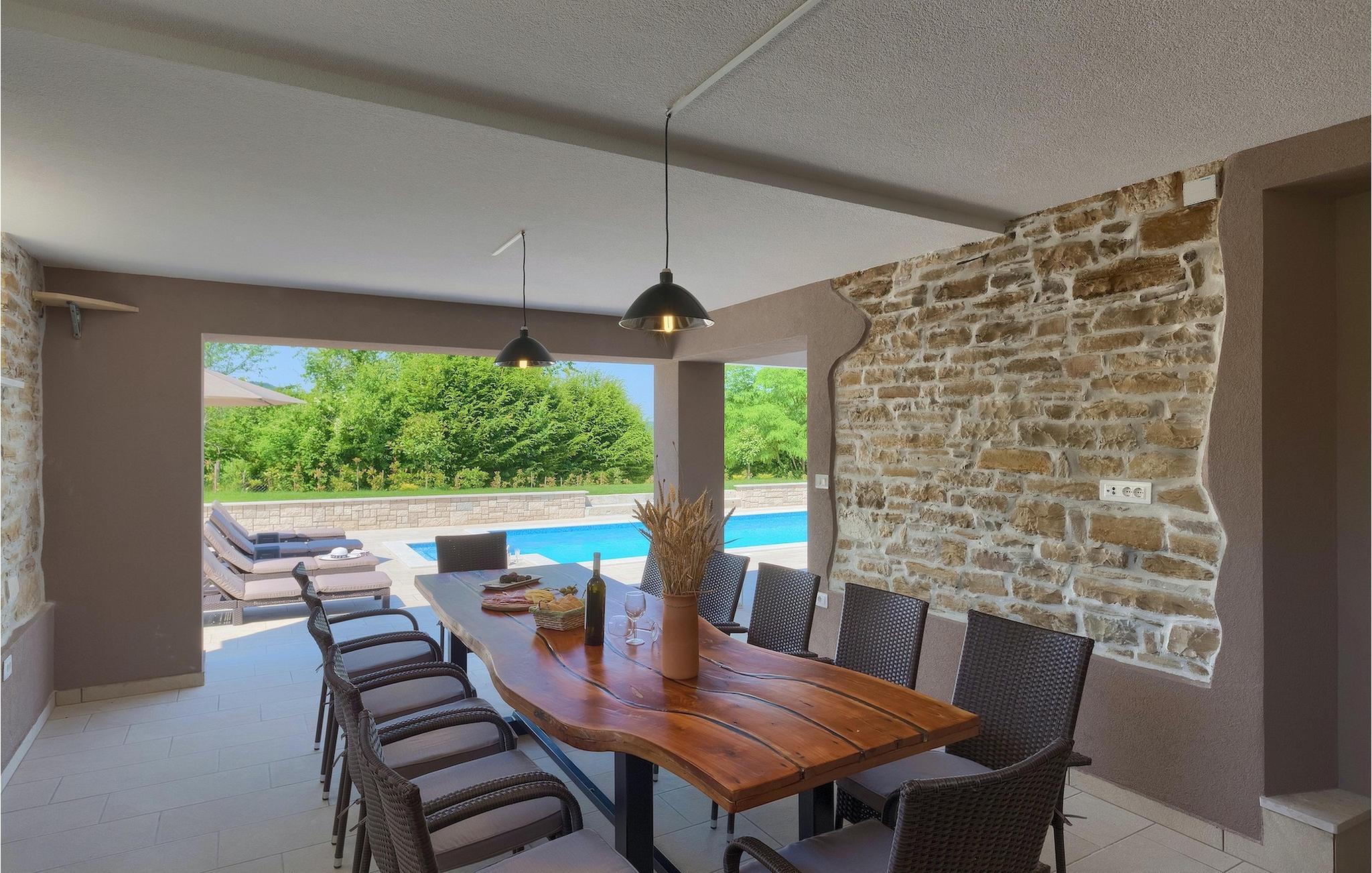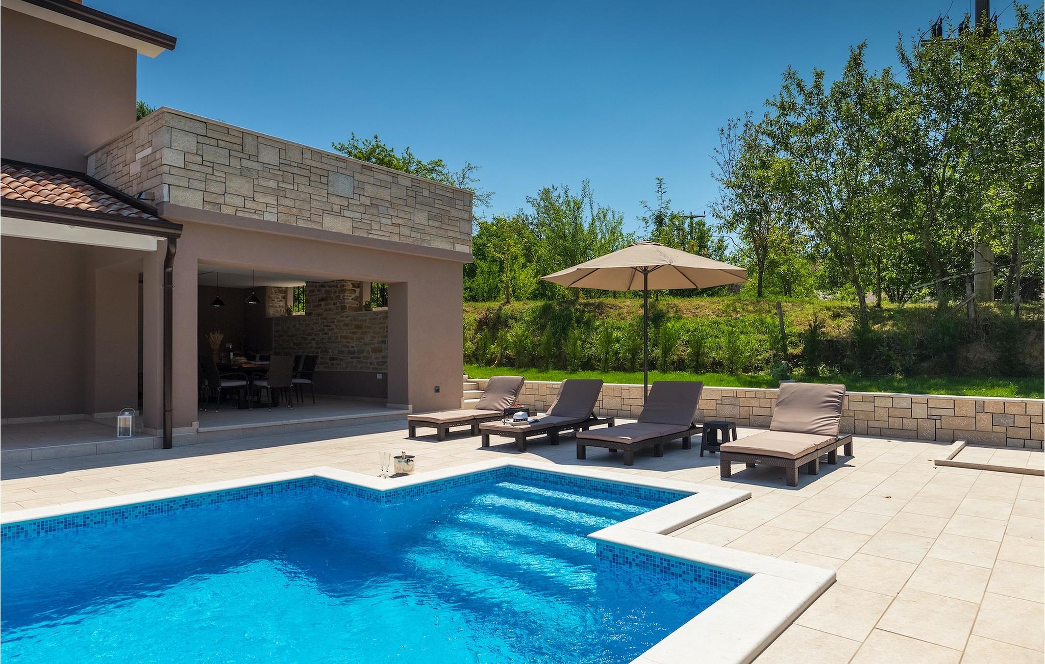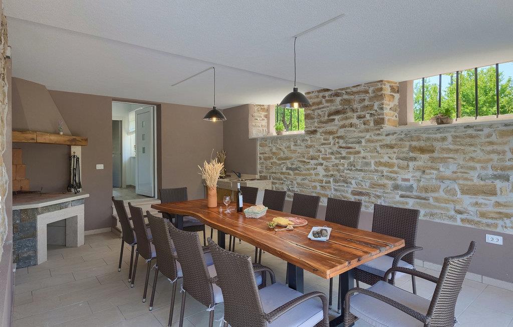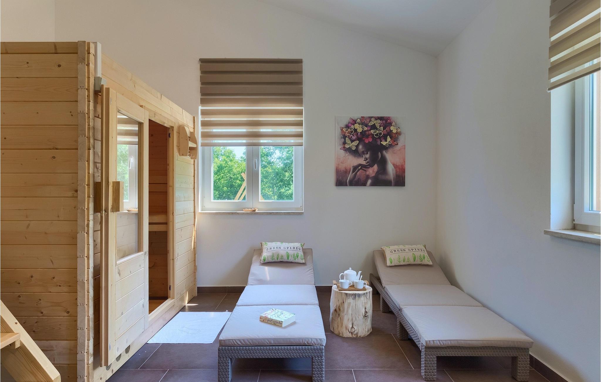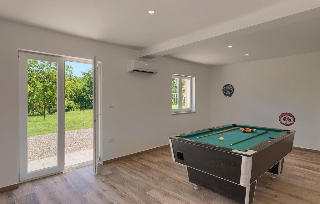 Hvis du leder efter en rummelig, moderne villa i et fredeligt område omgivet af natur, med en privat pool og masser af aktiviteter for sjov (perfekt til en familieferie), er Villa Zamari ideel til din ferie! Denne smukke villa kan rumme op til 12 gæster i 5 elegante soveværelser indrettet med stor omhu. Når du kommer ind i stueetagen, får du direkte adgang til den stilfulde stue forbundet med spisestuen og det fuldt udstyrede køkken. Her finder du også et separat soveværelse med eget badeværelse. Alle disse værelser har en flot udsigt over den store pool og det omkringliggende område med moderigtige havemøbler og talrige liggestole. De komfortable soveværelser fordeler sig over første sal, hver med sit pæne badeværelse. To af værelserne har adgang til 2 ret store altaner med et sted at slappe af og nyde udsigten over det grønne, bakkede landskab i denne del af Istrien. Hvor du helt vil forkæle dig selv, er helt sikkert det afslappende wellness-område med sauna. Stueetagen byder også på masser af plads i spillerummet med dart og et poolbord, perfekt til en sjov sammenkomst! Du vil helt sikkert tilbringe meget tid omkring den private pool eller i alfresco-spisestuen med dets lille køkken og pejs. Her er masser af plads til hele familien på verandaen, mens ungerne hopper i haven på trampolinen. Villa Zamari venter på dig til en sjov og afslappende ferie i Istriens bagland!Smukke Villa Zamari er beliggende i en fredelig landsby omgivet af natur få minutter fra Pazin, i hjertet af Istriens bagland. Pazin er en lille, historisk rig by med meget at byde på, beliggende kun 30 km fra andre turistbyer. I hundreder af århundreder var Pazin den stærkeste Habsburg-fæstning i dette område og hovedkvarteret for den tidligere Pazin-hersker. Dette middelalderfort ("Kastel") er velbevaret, så du kan besøge det i dag. Det bliver brugt som et etnografisk museum i Istrien og museet for byen Pazin. Du bør også besøge nogle kirker i dette område, fordi 6 af dem er beskyttet som en del af Kroatiens kulturarv. En af dem, den hellige Maria kirke i Beram (beliggende mellem Pazin og Porec), er verdensberømt for sin istriske fresko af Dødedansen, der dateres tilbage til 1474. Istriens bagland byder også på mere end blot kultur. Hvis du er en naturelsker, vil du nyde det. Prøv zip-linjen, gå på vandretur eller for en gastro-cykeltur for at prøve nogle istriske specialiteter. Du bør ikke gå glip af at se de små søer, vandfald og endda huler. I denne rene natur kan du også bade om sommeren. Hvis du vil lære Istrien at kende, så udforsk byer som Porec, Rovinj eller Pula.
