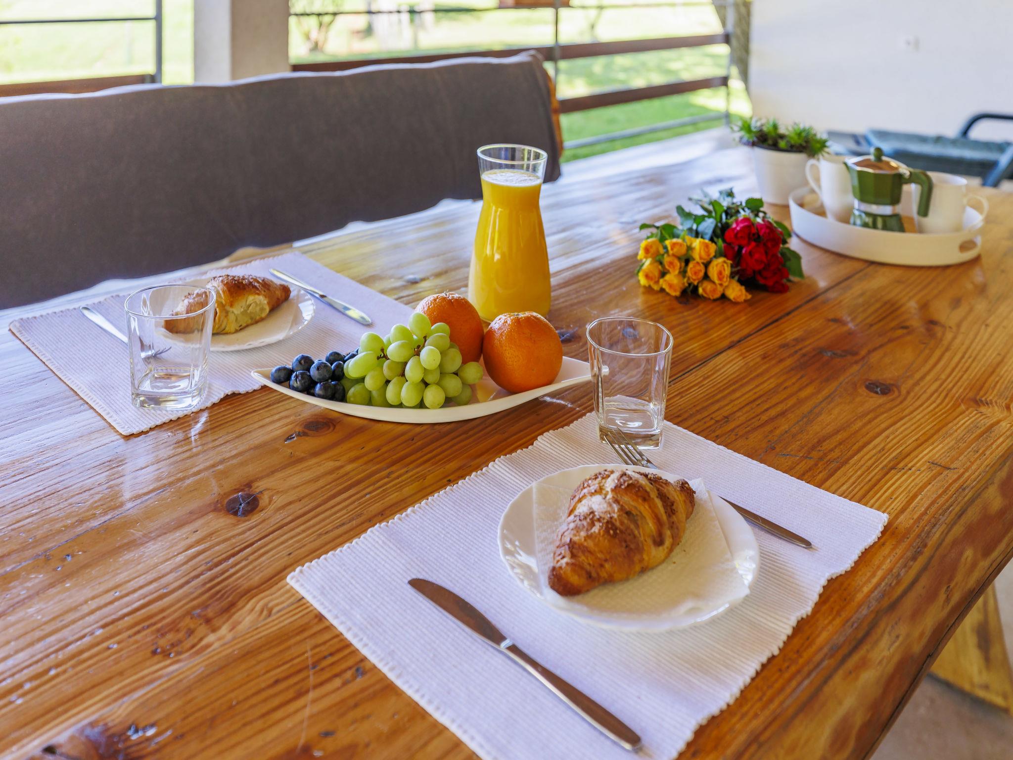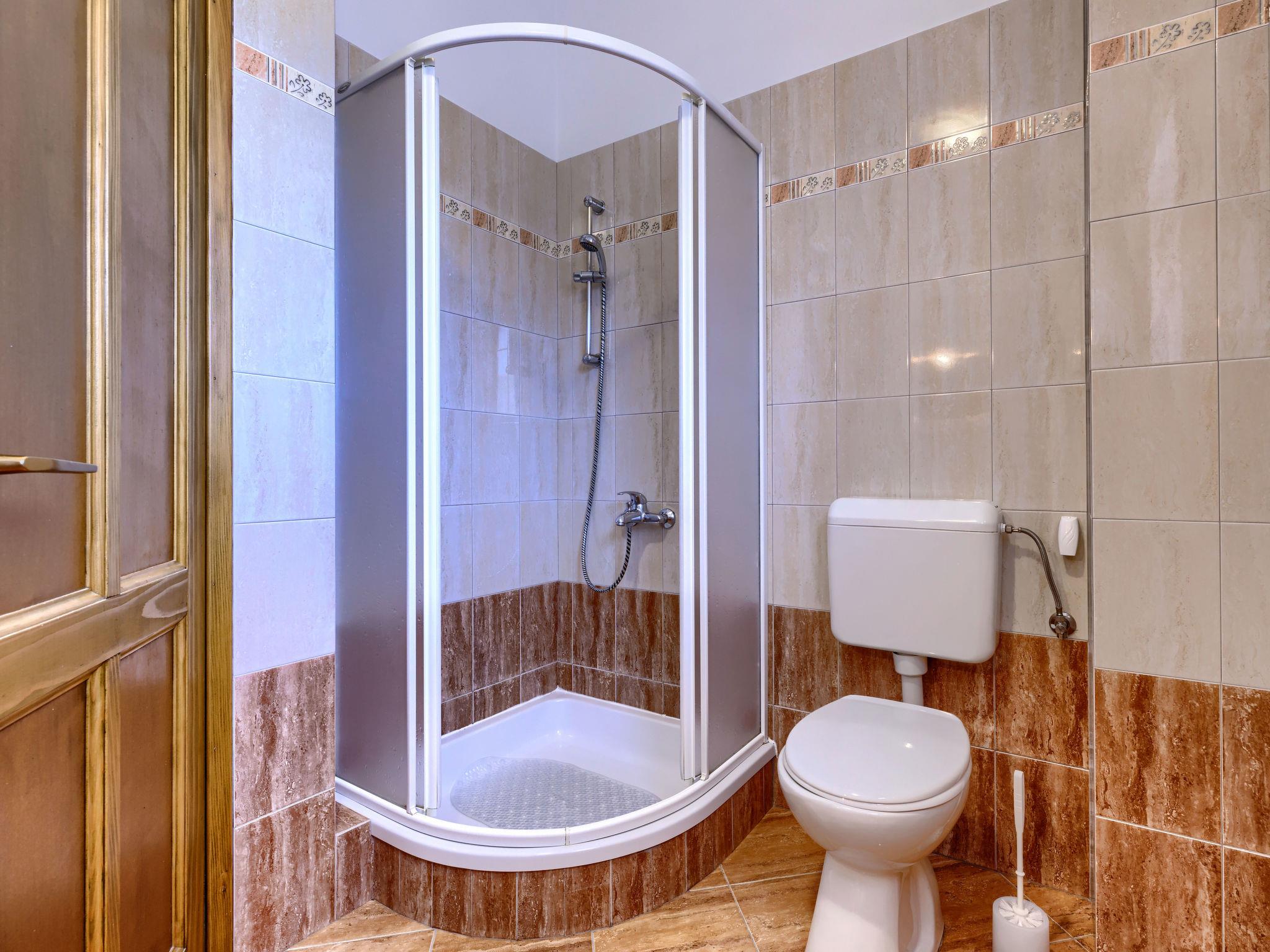 3-room house 90 m2 on 2 levels. Living room with satellite TV. Kitchen (1 hot plate, 3 gas rings, toaster, kettle, microwave, freezer, electric coffee machine) with open-hearth fireplace (only for decoration), dining table. Sep. WC. Upper floor: 1 room with 1 french bed (180 cm, length 200 cm), 1 folding bed (75 cm, length 185 cm), shower/WC. 1 room with 2 beds (90 cm, length 200 cm), 1 folding bed (80 cm, length 200 cm), shower/WC. No heating option. Terrace 40 m2, roofed. Terrace furniture, barbecue, deck chairs. Facilities: Internet (WiFi, free). Please note: non-smoking house. Private entrance.