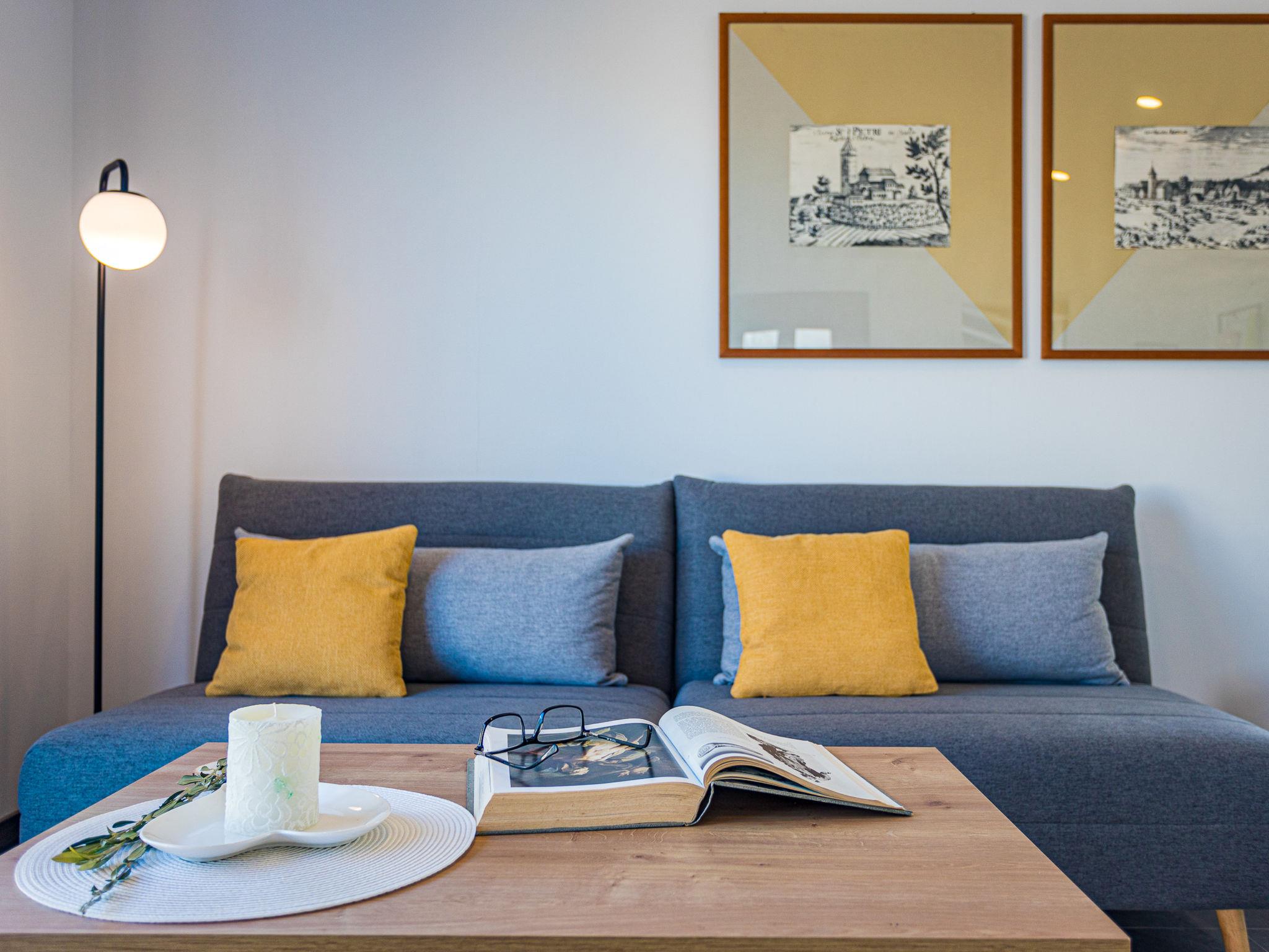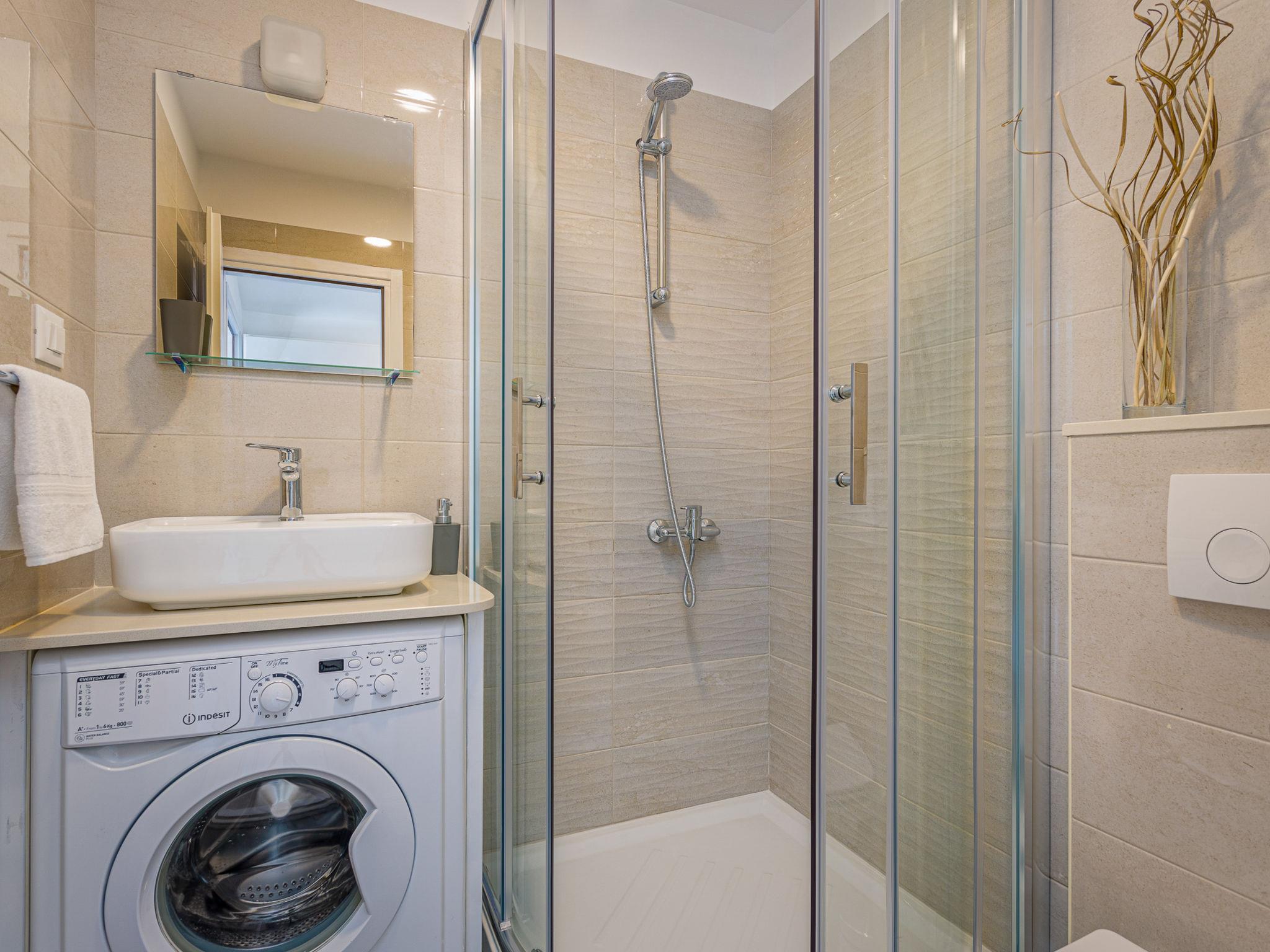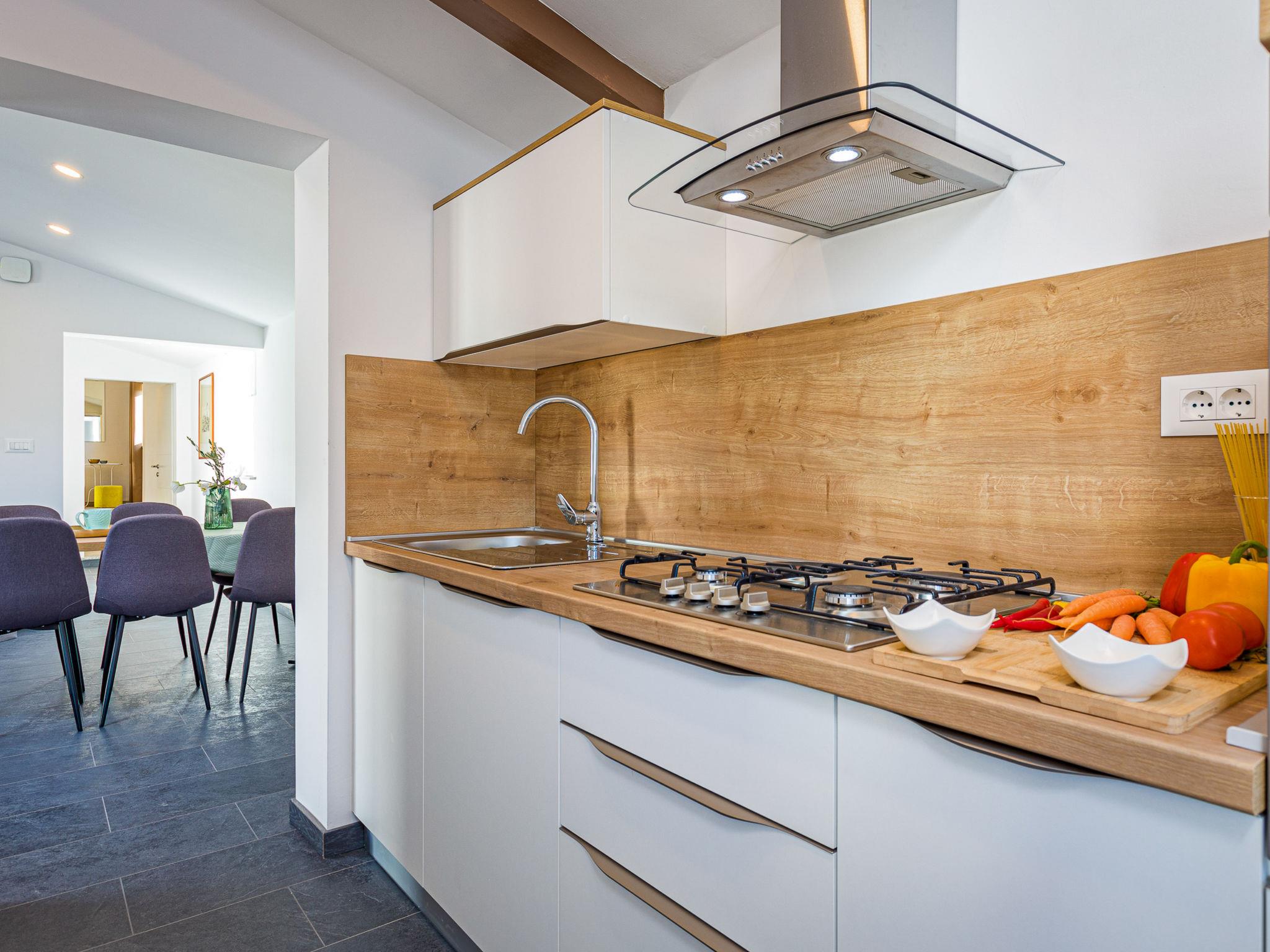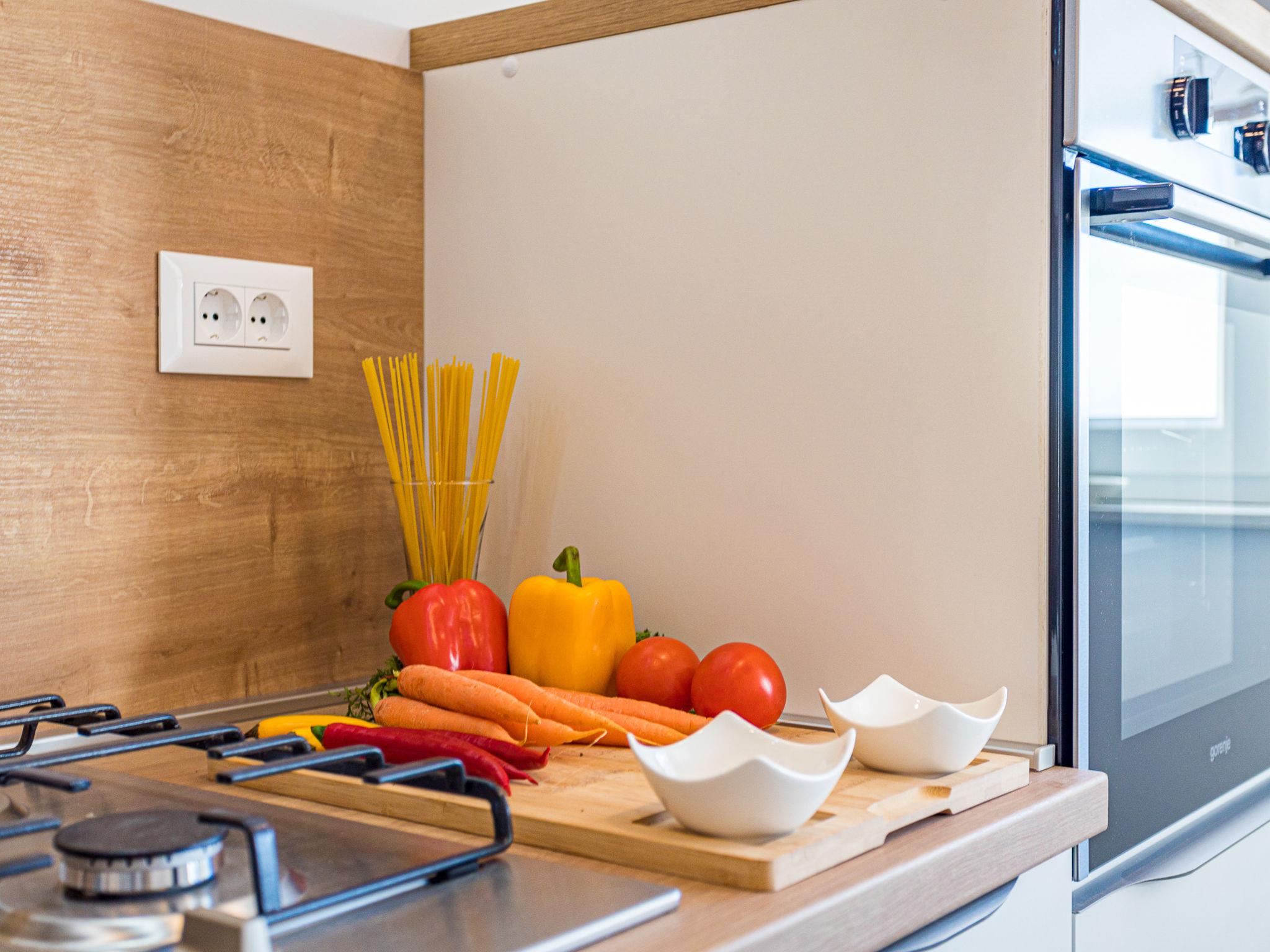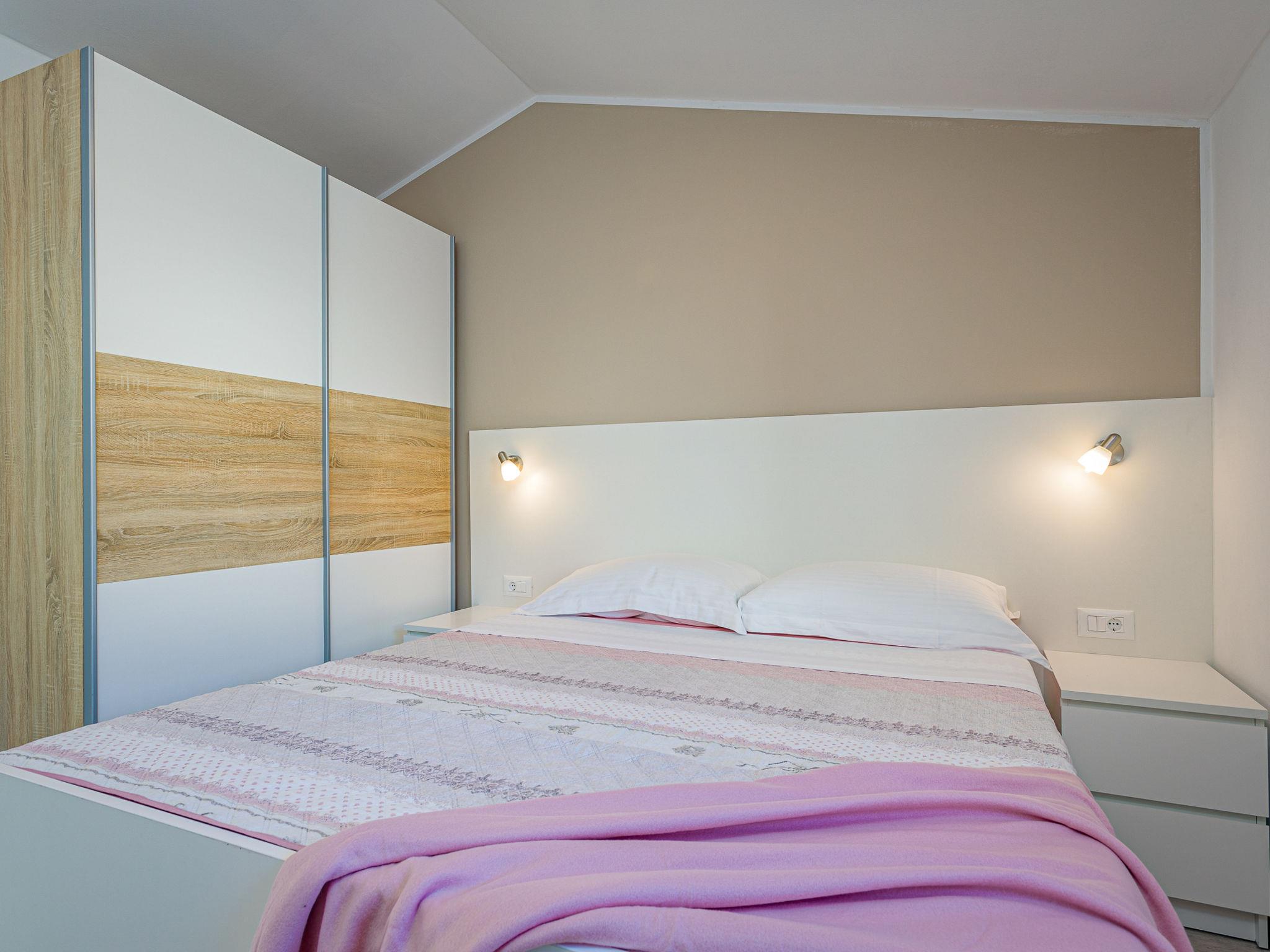 3-room semi-detached house 90 m2. Living/dining room with 1 double sofabed (160 cm, length 200 cm), satellite TV (flat screen), air conditioning. 2 rooms, each room with 1 french bed (160 cm, length 200 cm). Open kitchen (4 hot plates, oven, dishwasher, toaster, kettle, microwave, electric coffee machine). 2 showers/WC. Terrace partly roofed terrace roofed. Terrace furniture, deck chairs. Facilities: iron, baby cot. Internet (WiFi, free). Please note: non-smoking house. KLASA UP/I-335-03/17-01/4 URBROJ:2163-03-10-02/1/1