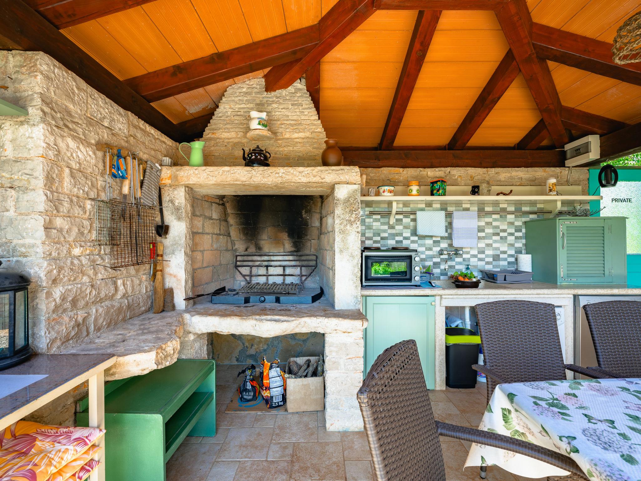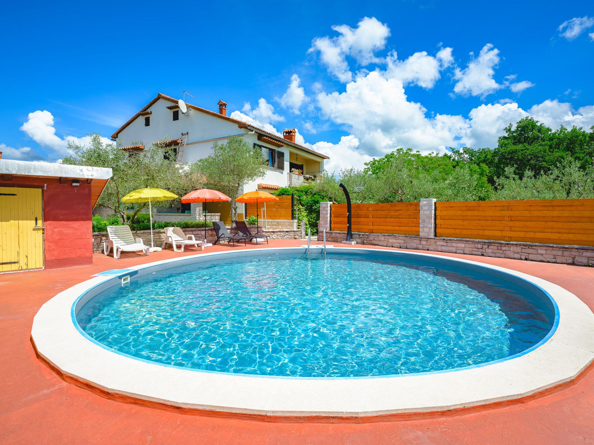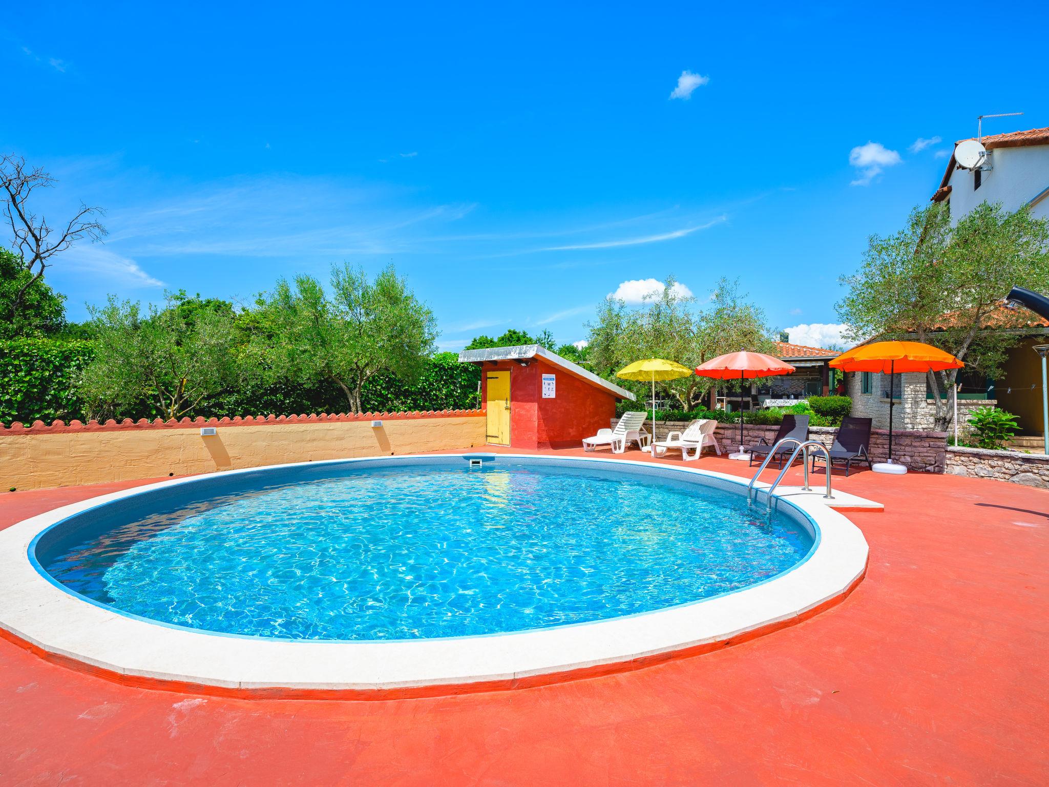 Semi-detached house "Pina". In the hamlet Muntrilj 15 km from the centre of Pazin, 4 km from the centre of Tinjan, 18 km from the centre of Porec, 18 km from the sea. For shared use: property 3'000 m2 with lawn and trees. Private: property 500 m2 (fenced) with lawn and wildlife garden, swimming pool round (38 m2, depth 120 cm, seasonal availability: 01.May. - 01.Oct.). Outdoor shower, boules, terrace, barbecue (swing), pool maintenance by the owner/gardener. In the house: internet access. Parking on the premises. Shop 4 km, supermarket 15 km, restaurant 4 km, bus stop 3.3 km, rocky beach 18 km. Marina 18 km. Please note: the owner lives in the same residence. Private: outdoor kitchen (2 hot plates).