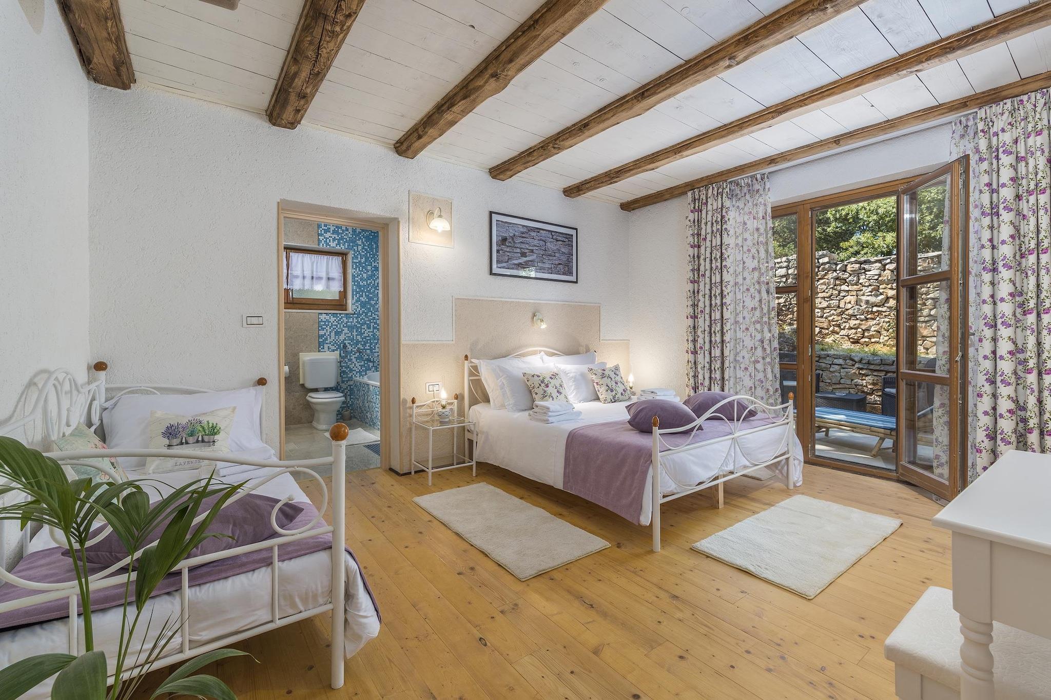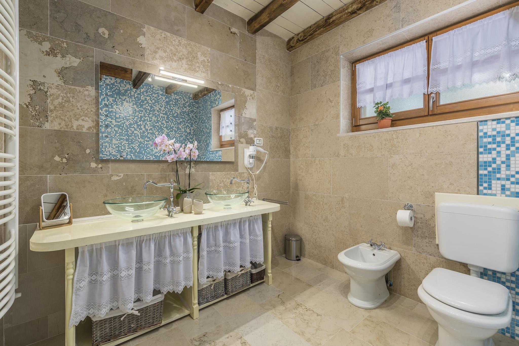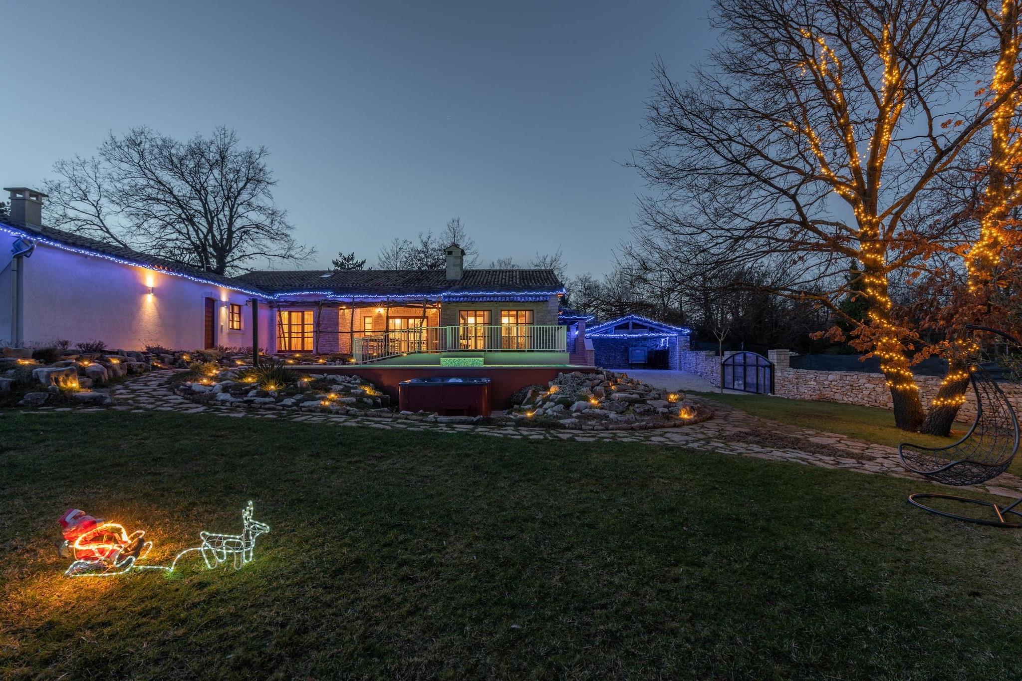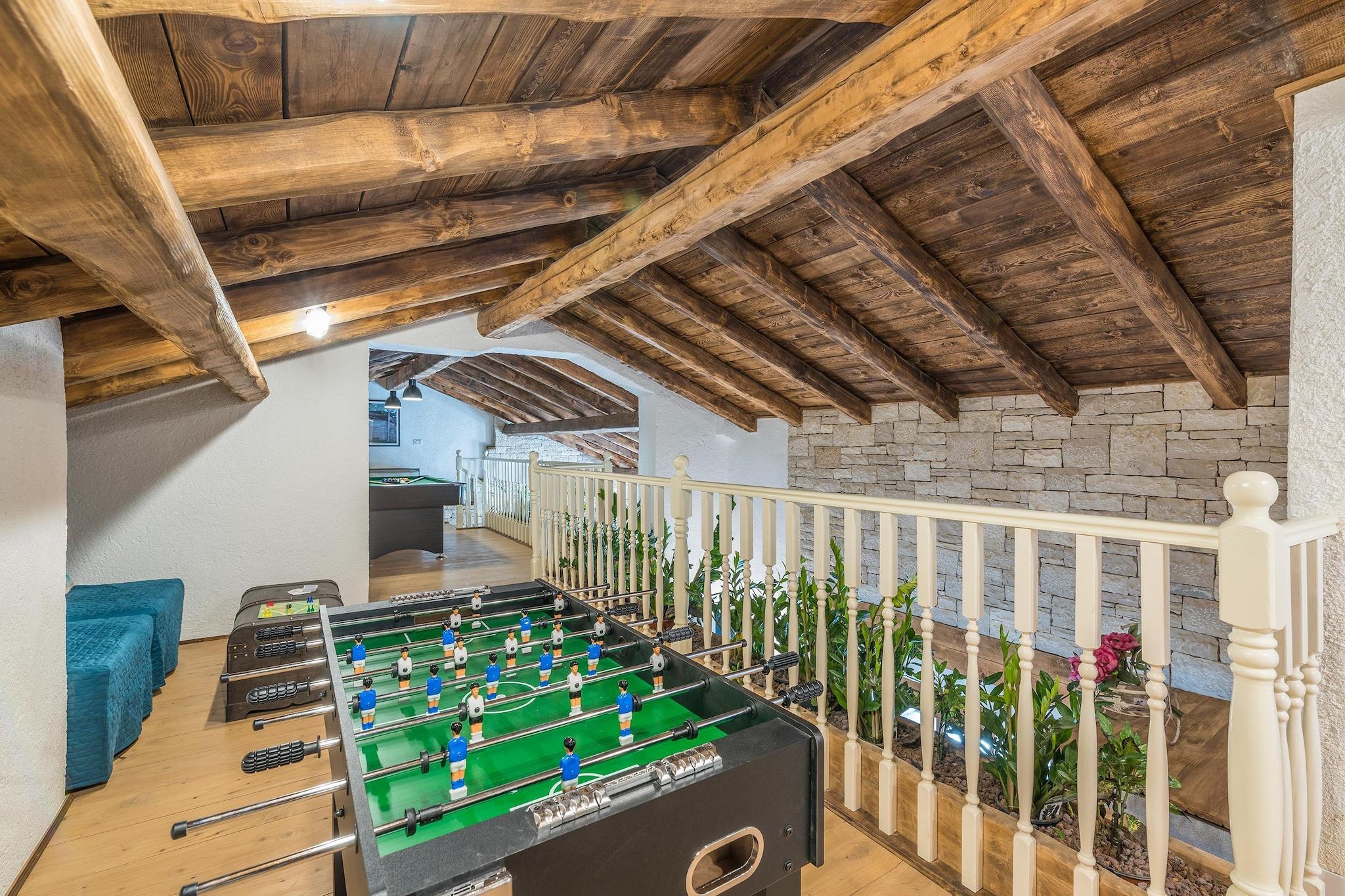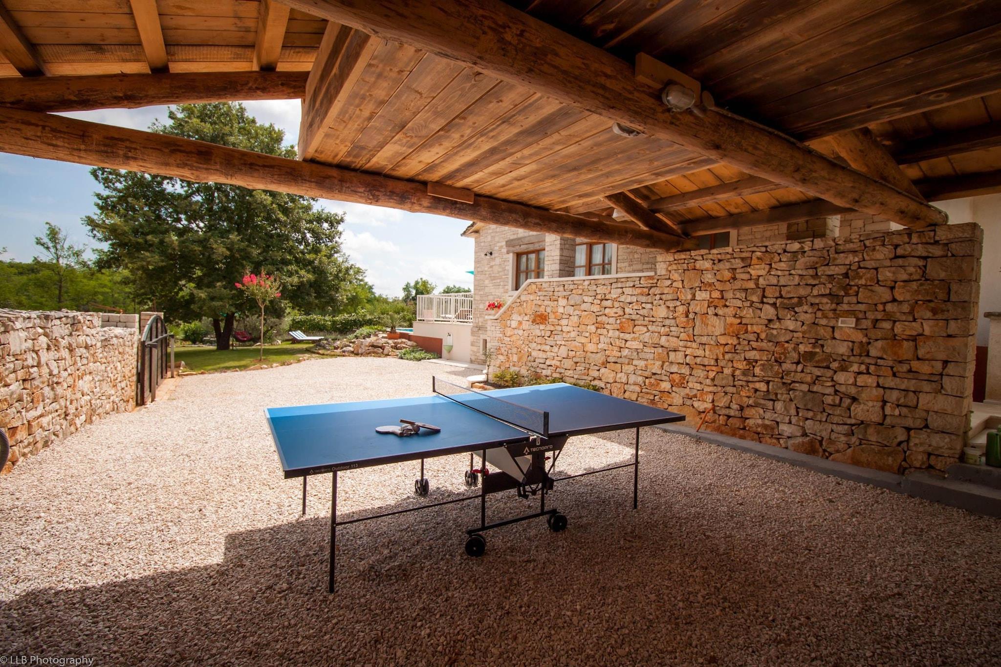 Denne charmerende villa er ideelt beliggende i hjertet af byen Pazin. Denne smukt restaurerede traditionelle villa tilbyder et fredeligt landligt tilflugtssted designet til store familier og grupper, der søger privatliv, plads og fuldstændig afslapning. Ejendommen har plads til op til 14 gæster og kombinerer autentisk lokal arkitektur med moderne komfort, hvilket skaber en ideel base for at udforske middelalderbyer, vinmarker, cykelruter, vandrestier, eventyrparker og regionens rige kulinariske scene. Hovedvillaen er spredt over flere etager og omhyggeligt indrettet til gruppeliv. I stueetagen kan gæsterne nyde en rummelig rustik stue, et fuldt udstyret køkken og en fleksibel spiseplads. Denne etage har også tre soveværelser, hver med eget badeværelse: et soveværelse med en dobbeltseng, et med en dobbeltseng og en enkeltseng og et med to enkeltsenge, der kan laves om til en dobbeltseng. Loftet indeholder to soveværelser møbleret med tre enkeltsenge plus et spilleområde med billard, bordfodbold, skak og børnespil; de deler et badeværelse og separat toilet. Barnesenge og ekstra senge er tilgængelige og gratis i ejendommen. Kælderen er dedikeret til fritid og wellness med pejs, fitnesscenter, sauna, massagebord og et komplet vaskerum med vaskemaskine og tørretumbler. Separat fra hovedhuset er der en selvstændig lejlighed med to enkeltsenge, en lille opholdsstue med to ekstra senge, spiseplads, køkken og privat badeværelse. Parkering inde i ejendommen er tilgængelig og gratis. Udenfor byder middelhavshaven på en stor privat swimmingpool, en udendørs jacuzzi til seks personer, liggestole, bordtennis og et grillområde, hvilket skaber en komplet privat resortoplevelse for uforglemmelige ophold i Istrien.