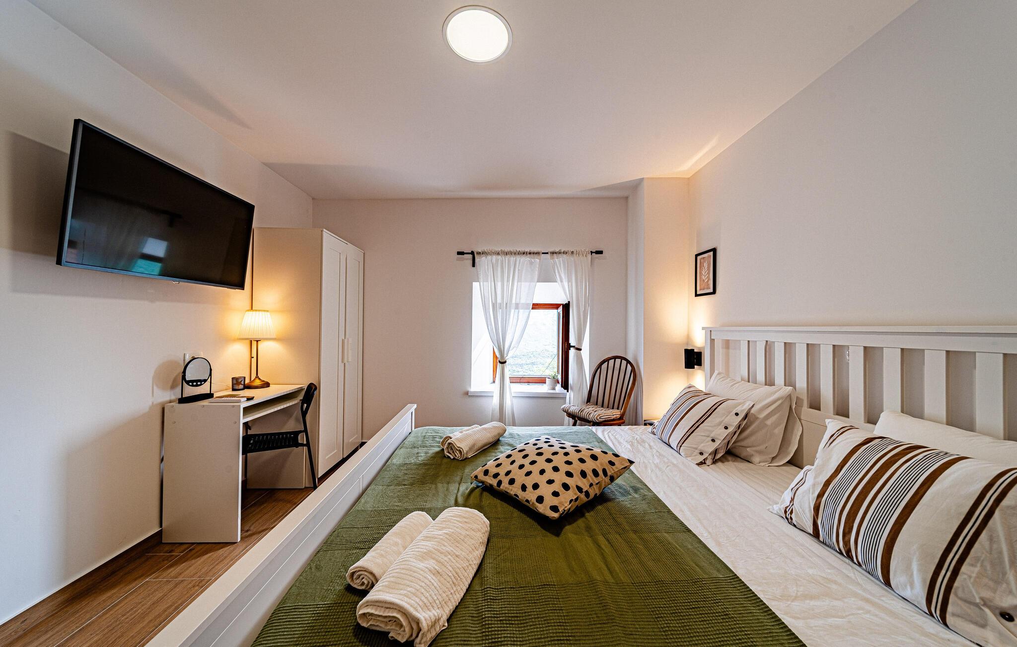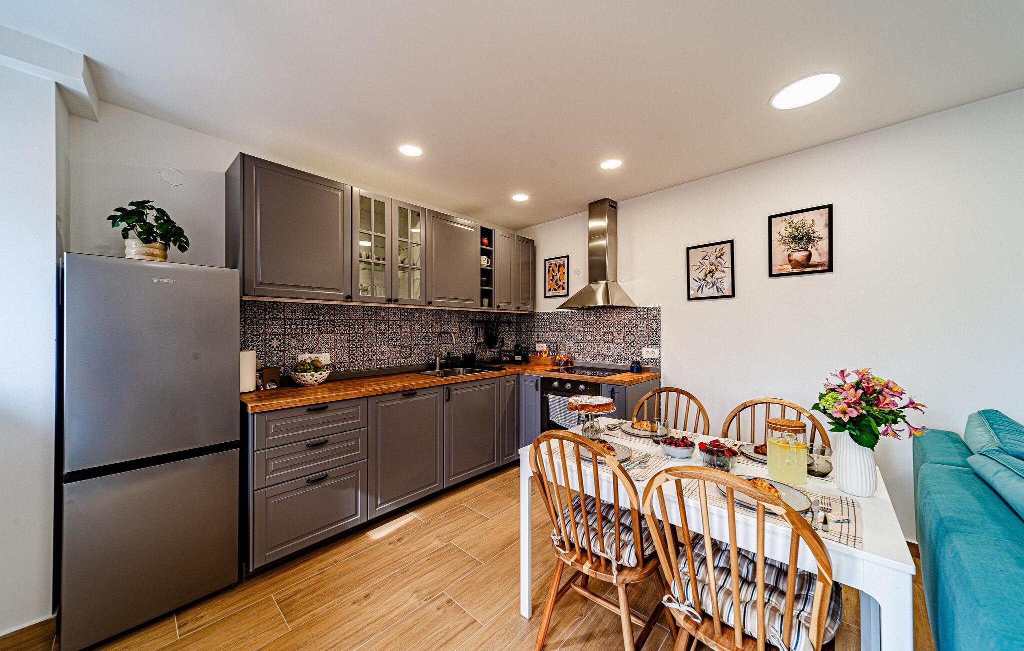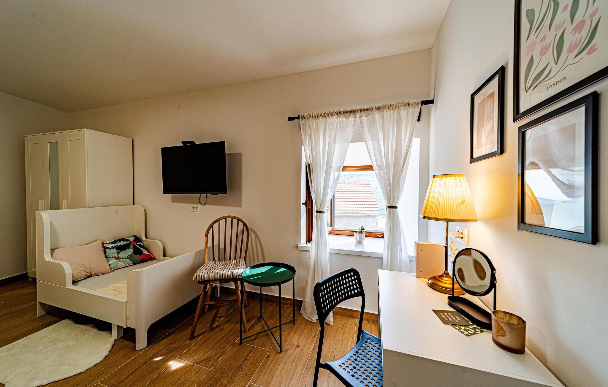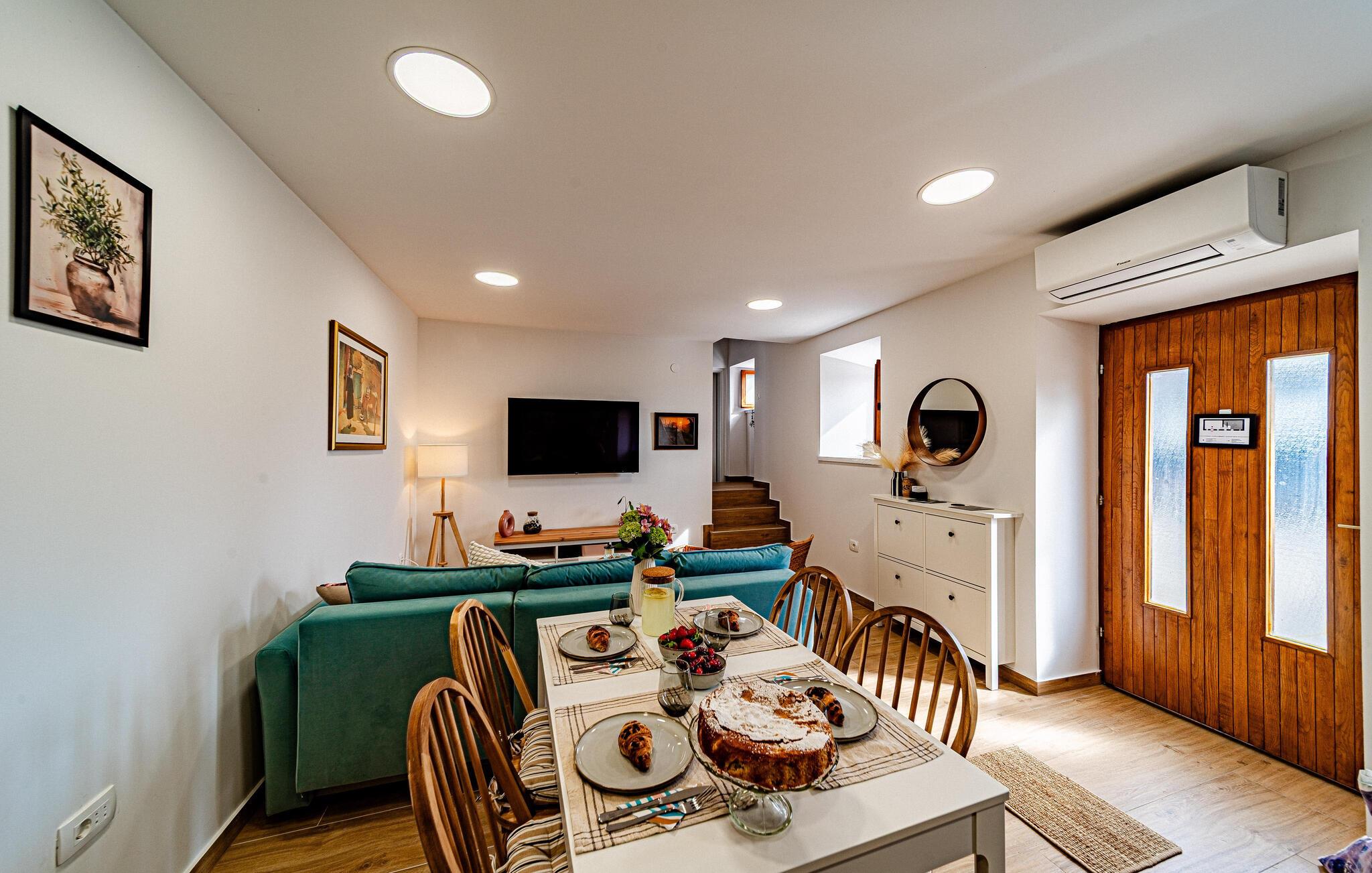 Dette smagfulde feriehus venter på jer på Pelješac-halvøen, hvor middelhavslivsstil og naturskøn afslapning går hånd i hånd. Nyd roen i jeres lille feriested med dens traditionelle karakter, og genoplad batterierne midt i de dalmatiske bakker. Gå ind i den smukke opholdsstue med et komfortabelt sofahjørne, stilfulde møbler og et stort tv-område. Brug den åbne indgang til det moderne køkken, som kan prale af fine detaljer, gennemtænkte apparater og et tilstødende spisebord, til fælles måltider.