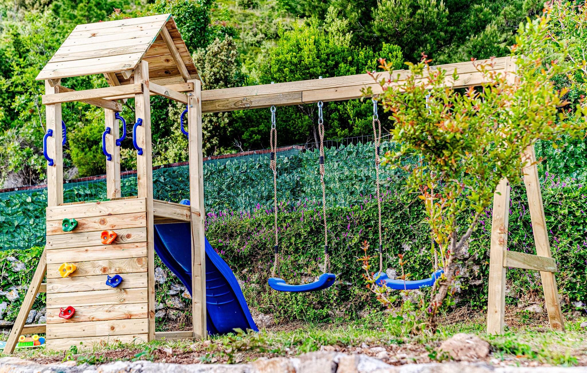 Oplev de mange siddepladser rundt om i huset. Slap af i skyggen på terrassen, grill i den overdækkede gårdhave eller nyd udsigten over området fra poolterrassen. Køl af i den private pool eller slap af på en af ??liggestolene. For børnene er der et dedikeret legeområde med rutsjebane og gynger samt et lille picnicområde. Pluk frisk frugt direkte fra haven.