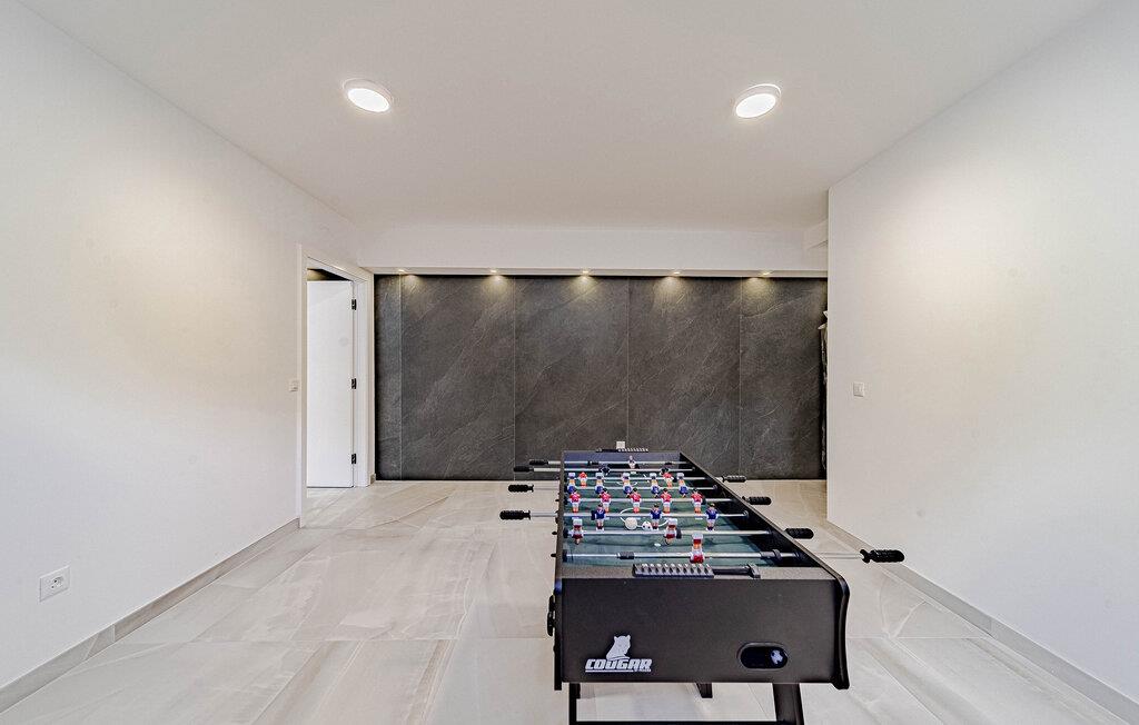 Velkommen til dette moderne feriehus, der kombinerer elegant indretning med masser af sjove aktiviteter for børnene. Tilbered måltider sammen i det veludstyrede køkken, og nyd dem ved det stilfulde marmorbord. Om aftenen kan I slappe af på den hyggelige sofa, se en film eller nyde kvalitetstid med gode samtaler.