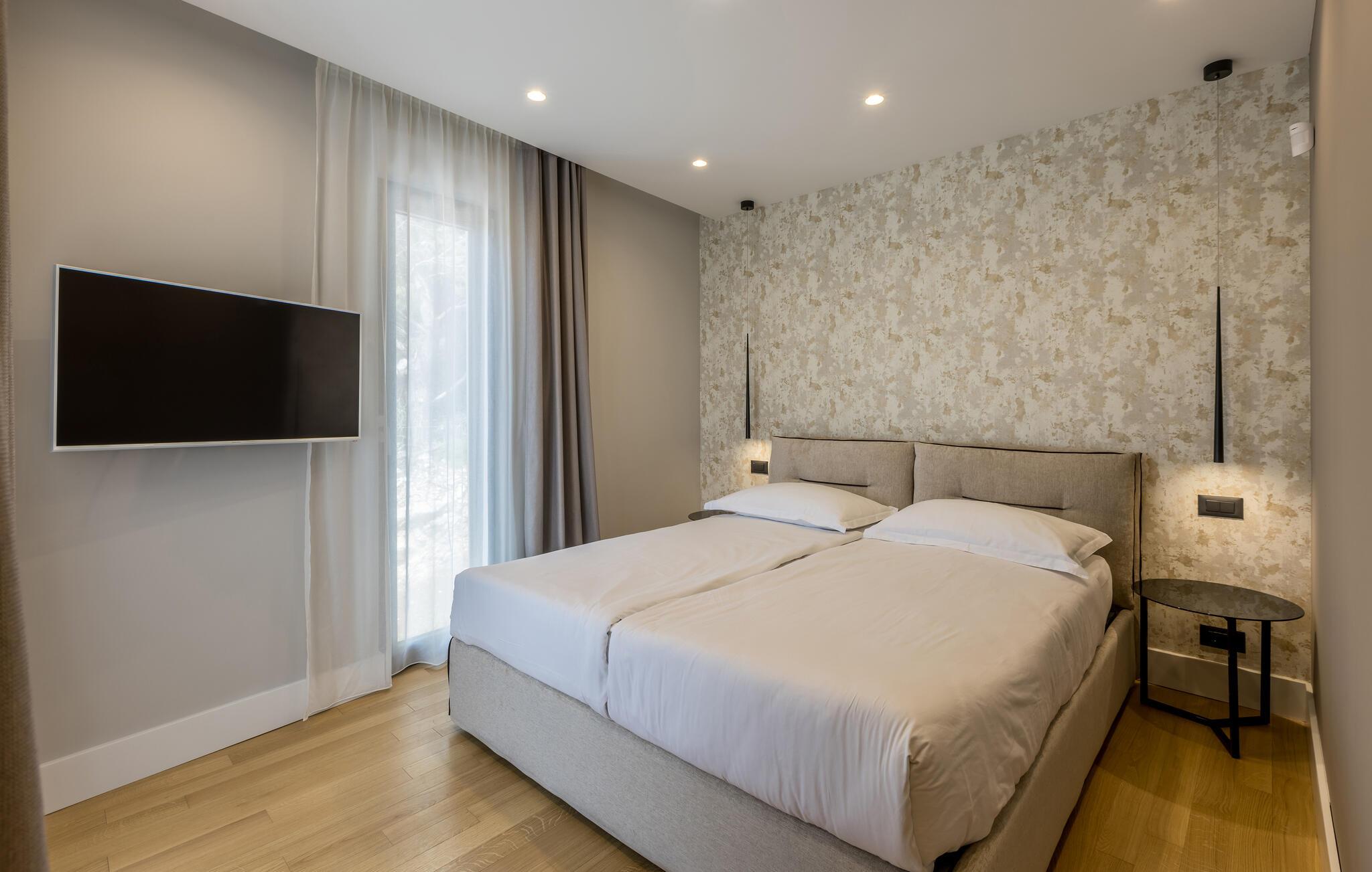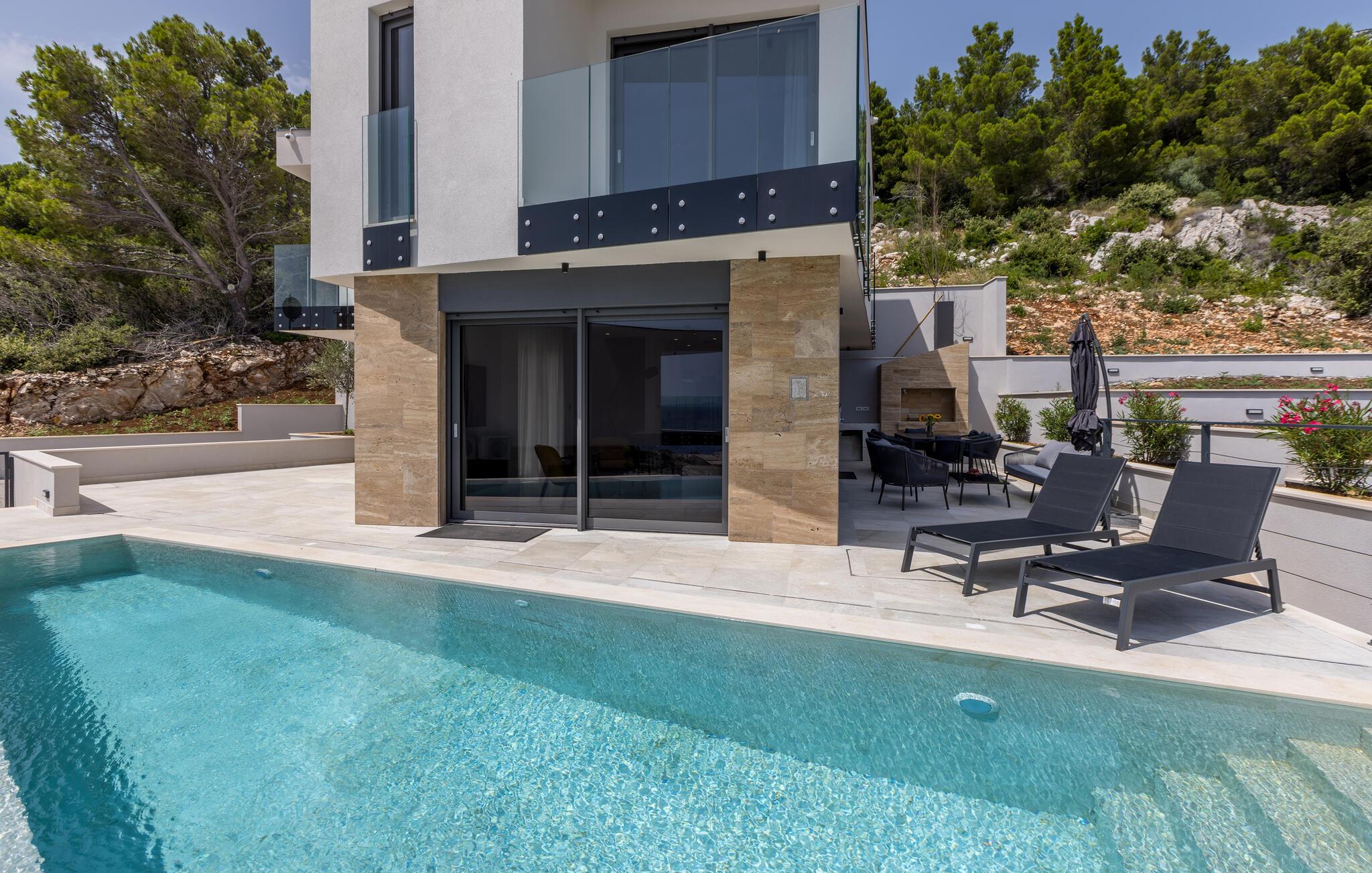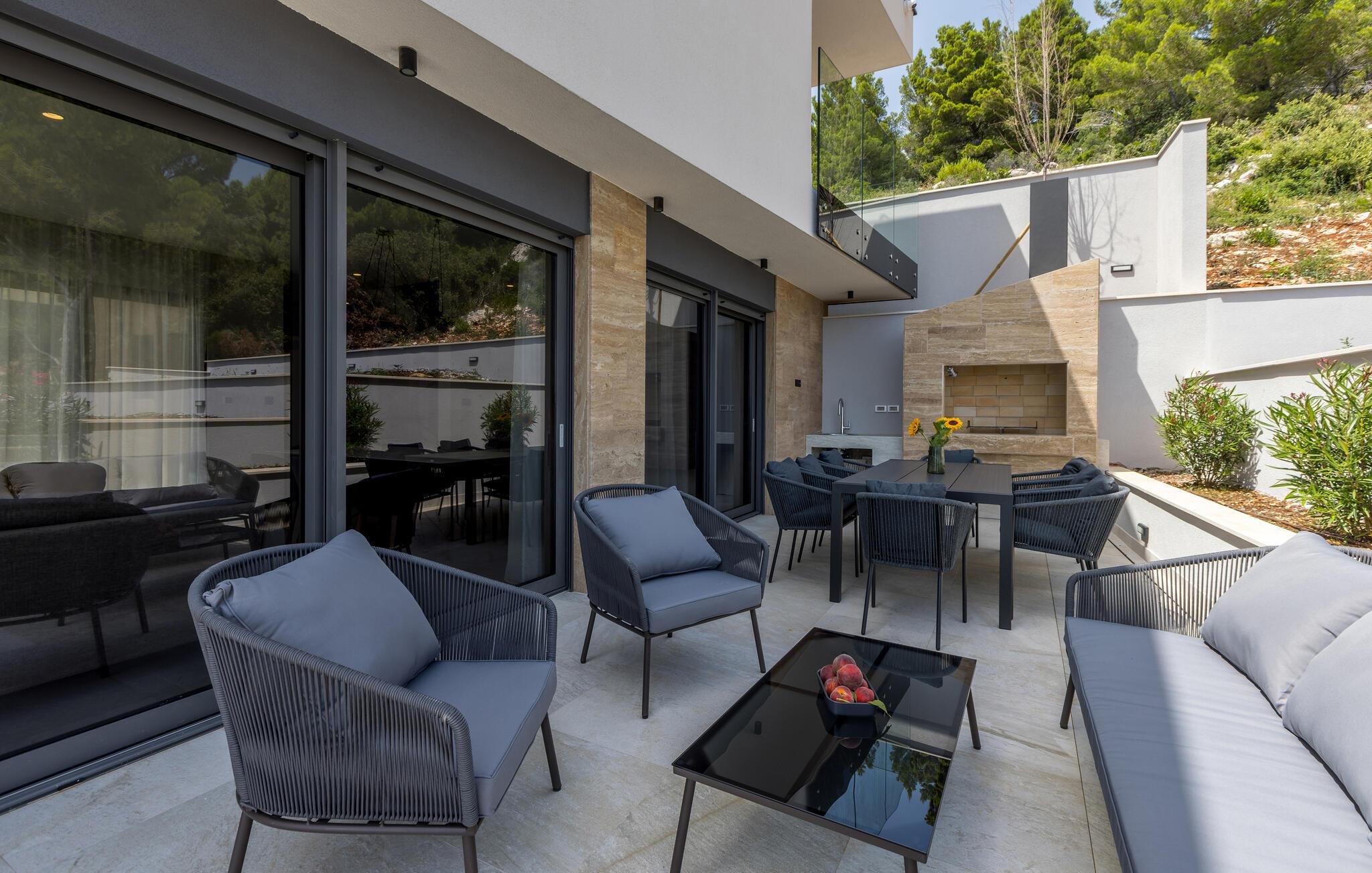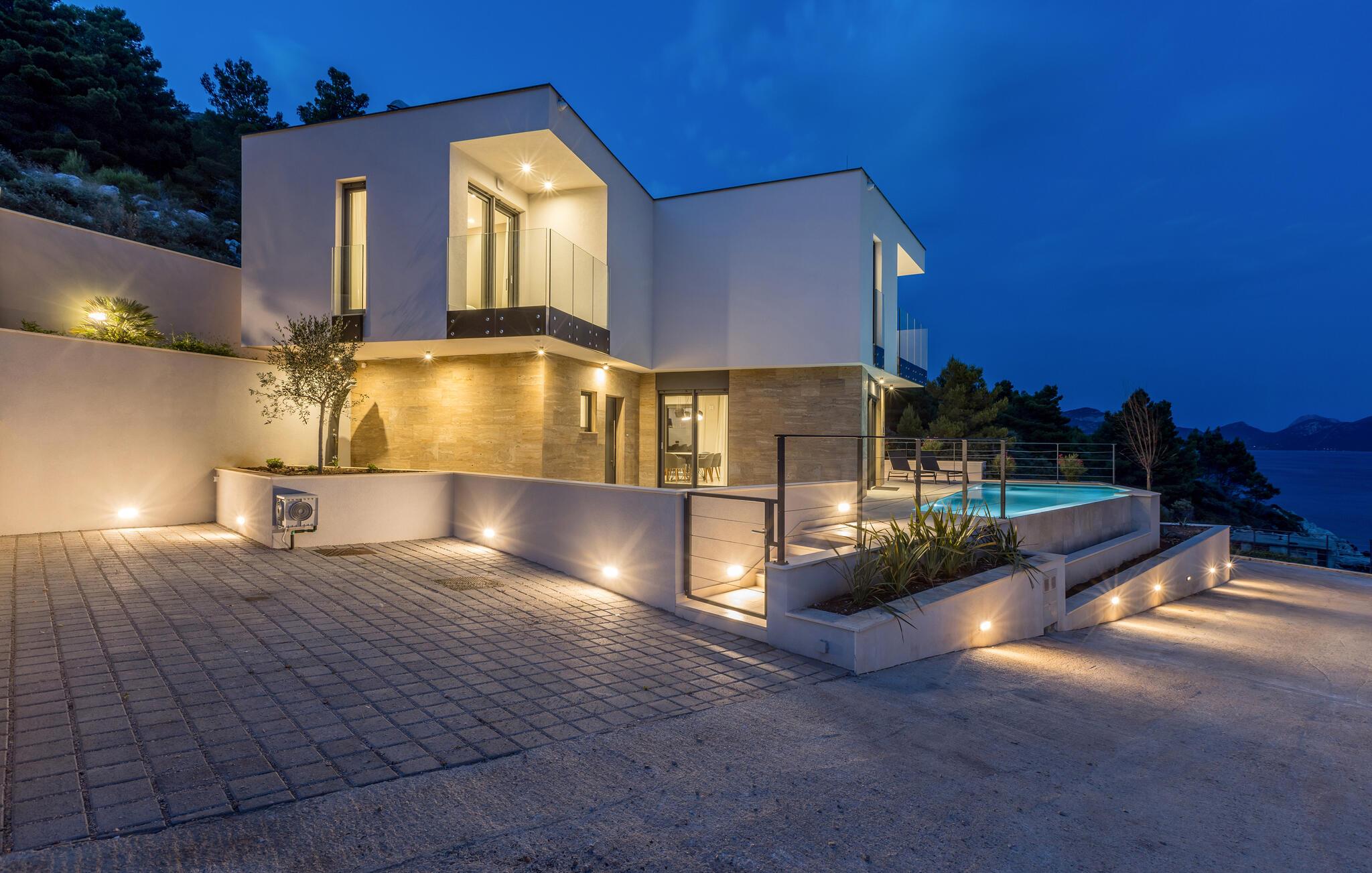 Denne sensationelle villa har en privilegeret beliggenhed lige ved strandpromenaden og lægger op til at tilbringe afslappende dage i sit elegante og komfortable interiør. Bliv inspireret af kulinariske lækkerier og nyd jeres måltider i det lyse, åbne opholdsområde med udsigt over det azurblå Adriaterhav. Om aftenen kan I slappe af på den komfortable sofa, streame en god serie eller slappe af i saunaen.