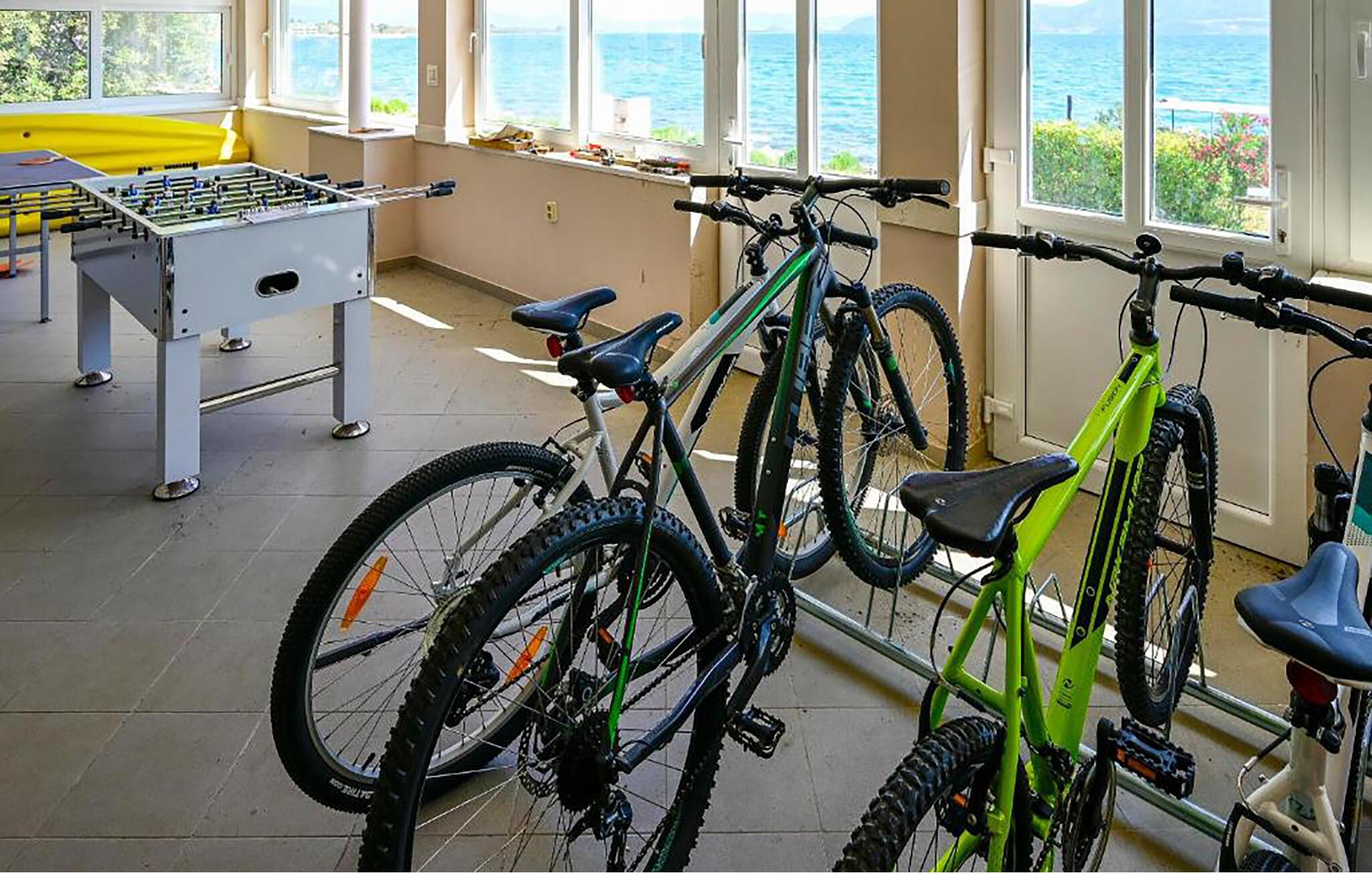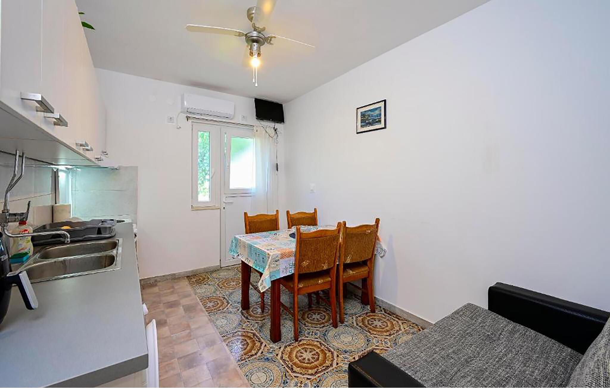 Denne praktisk indrettede lejlighed i stueetagen venter jer direkte ved strandpromenaden, hvilket giver mulighed for spontane dukkerter i Adriaterhavet. Tilbered lækre måltider her, planlæg dagens aktiviteter, og efter mange solskinstimer kan I nyde et brætspil eller streame en spændende film. I kan også nyde en direkte udsigt over det blå hav fra det fælles aktivitetsrum med poolbord, dartskive og bordtennisbord.