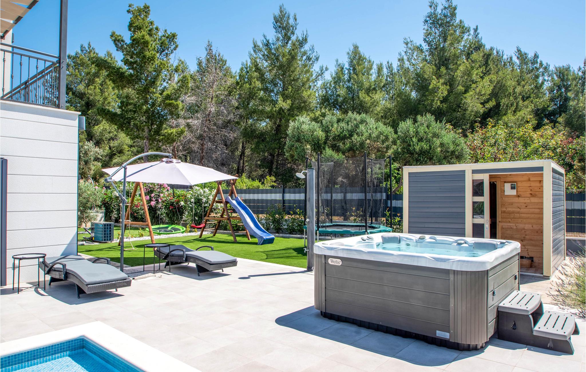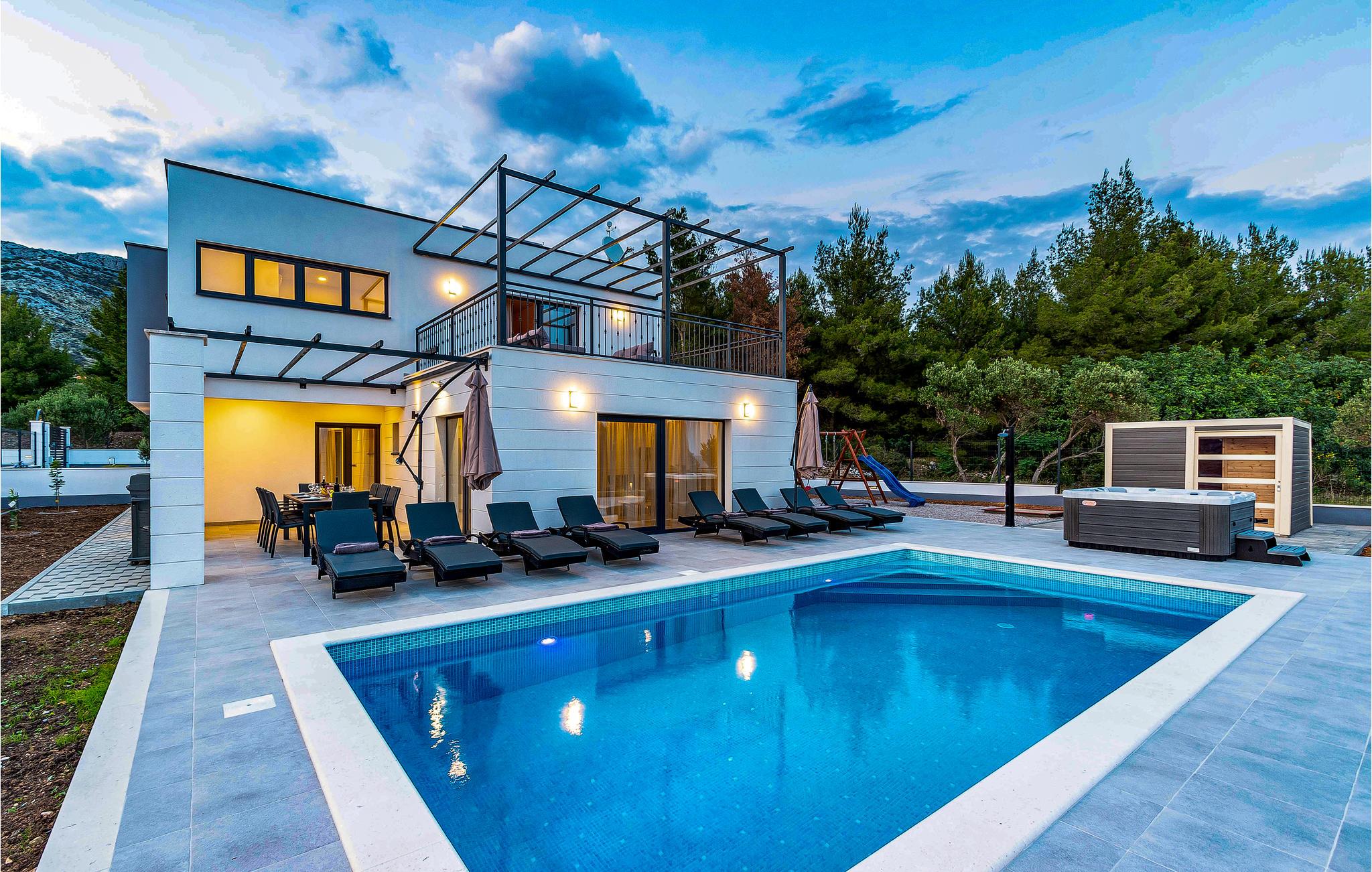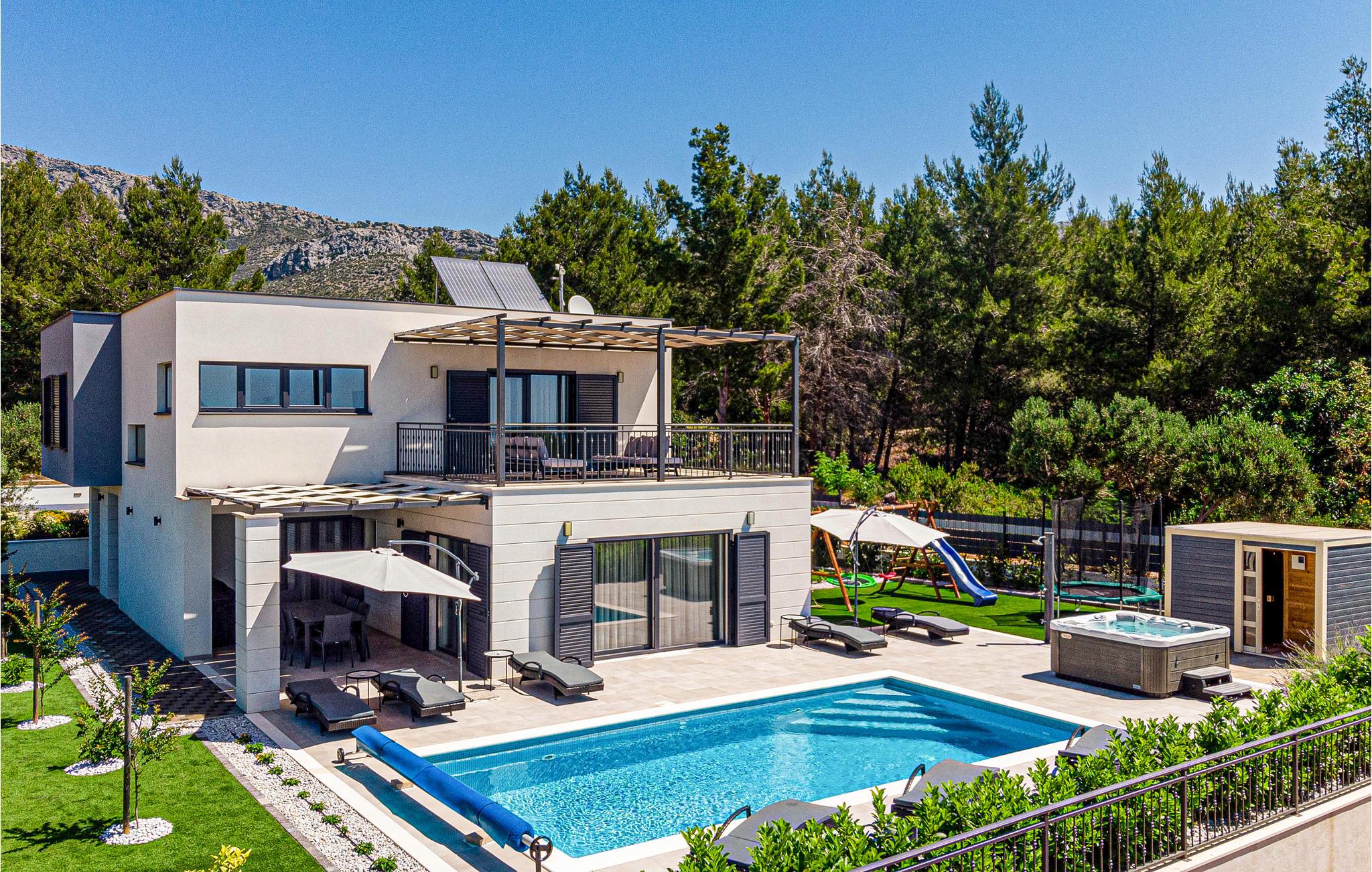 Dette stilfulde feriehus har egen pool og en fremragende beliggenhed. Det er tæt på den vidunderlige Trstenica-strand med fint sand og grus.