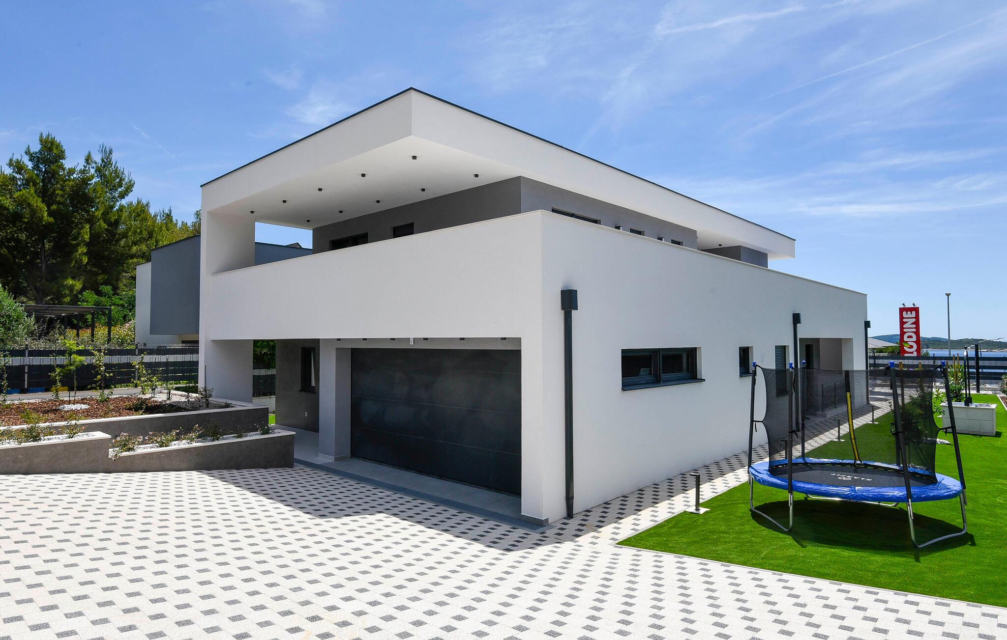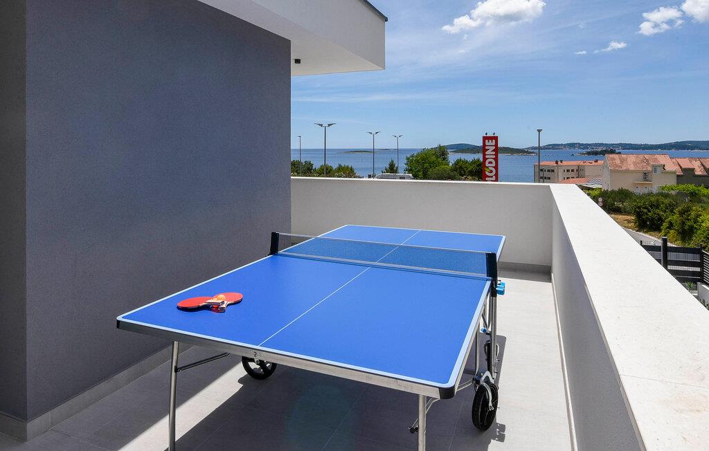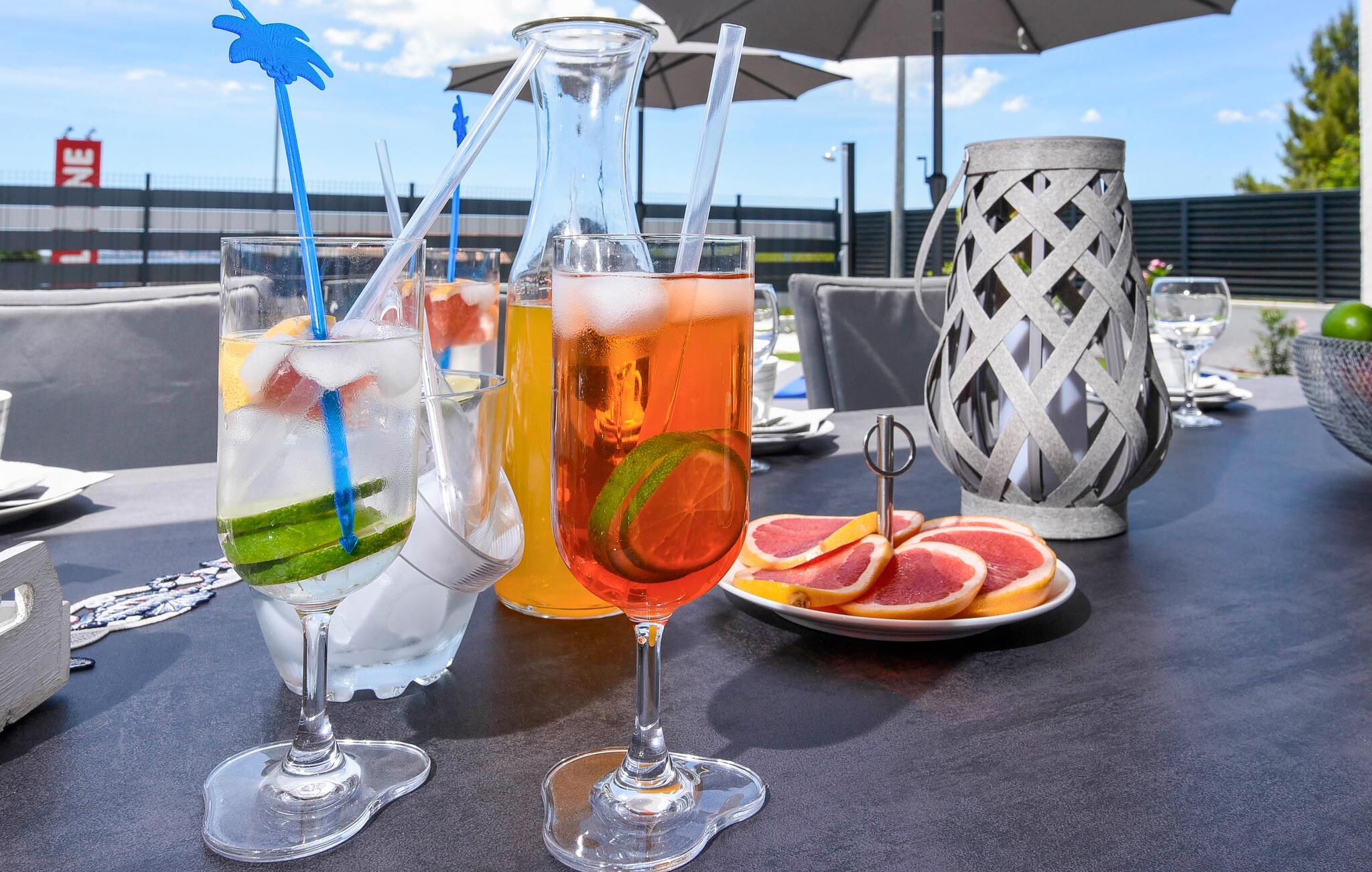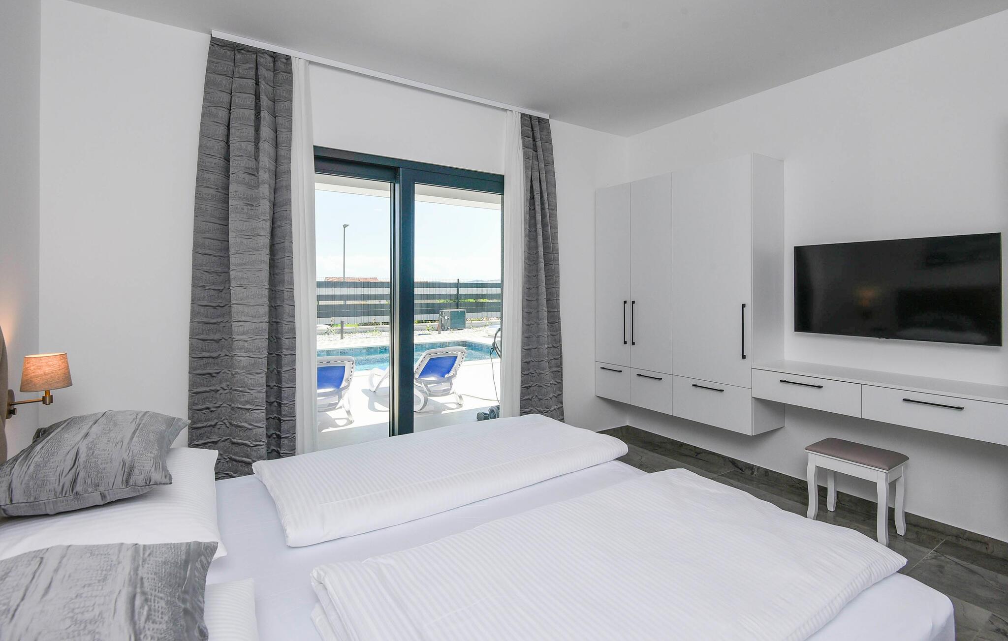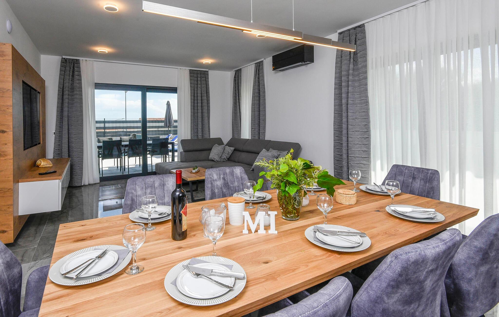Begynd dagene veludhvilet og lad jer inspirere af den moderne indretning i det veludstyrede køkken for at tilberede en solid morgenmad til hele familien. Om I nyder det indenfor ved det elegante spisebord eller udenfor på den overdækkede terrasse med grill er op til jer. Om eftermiddagen inviterer liggestolene jer til at nyde en frisk drink. Eller sidde på balkonen og nyde den betagende udsigt over det dybe blå hav i det fjerne. Her finder I også et beroligende spabad. Den private pool byder på forfriskning, hvor I kan bade til jeres hjertes lyst. Fitnessrummet sørger for, at I holder jer i form selv på ferien, og I kan slappe helt af i hotellets sauna.