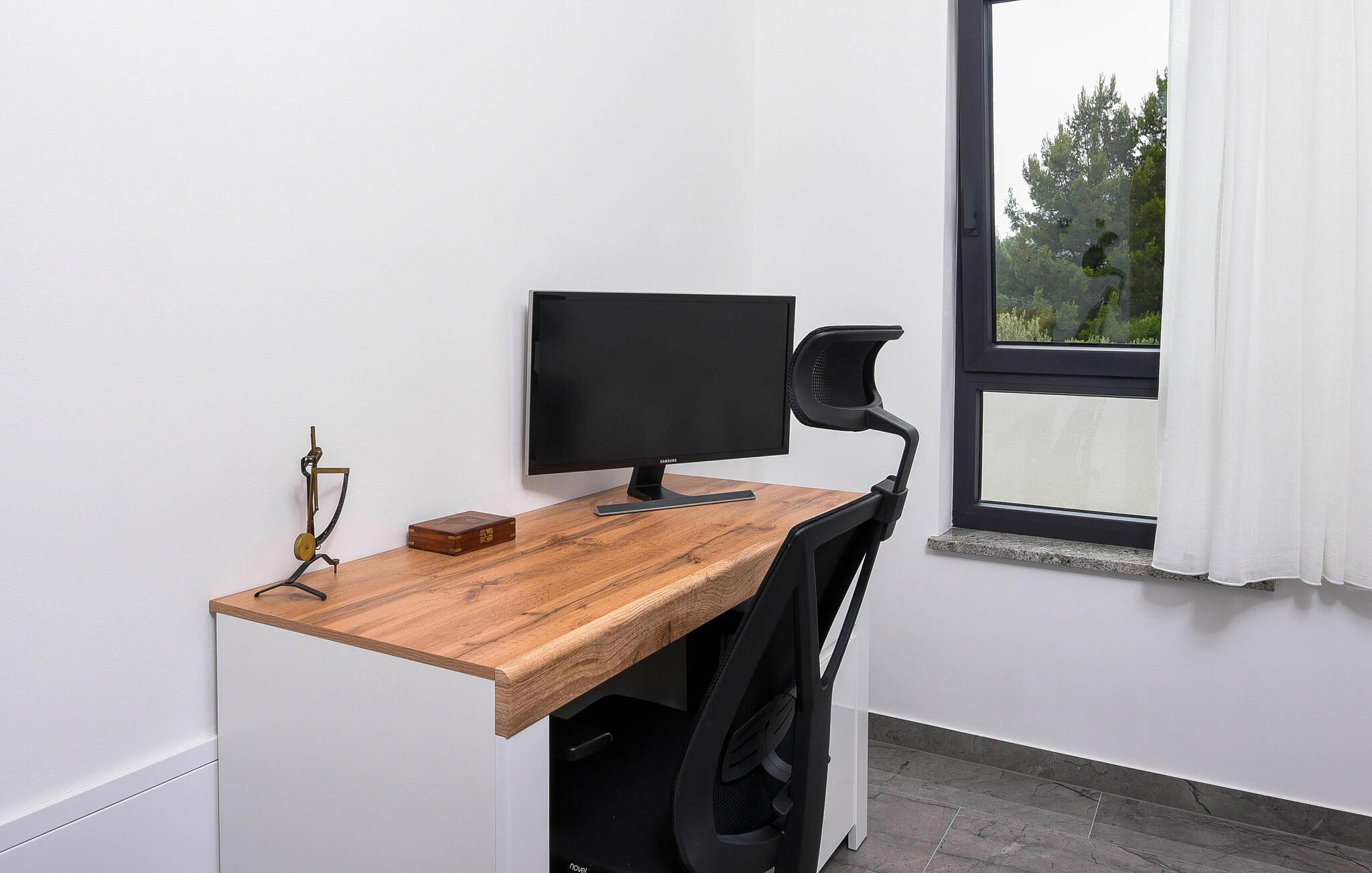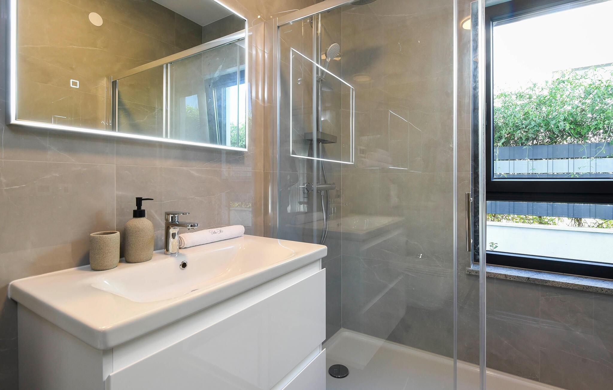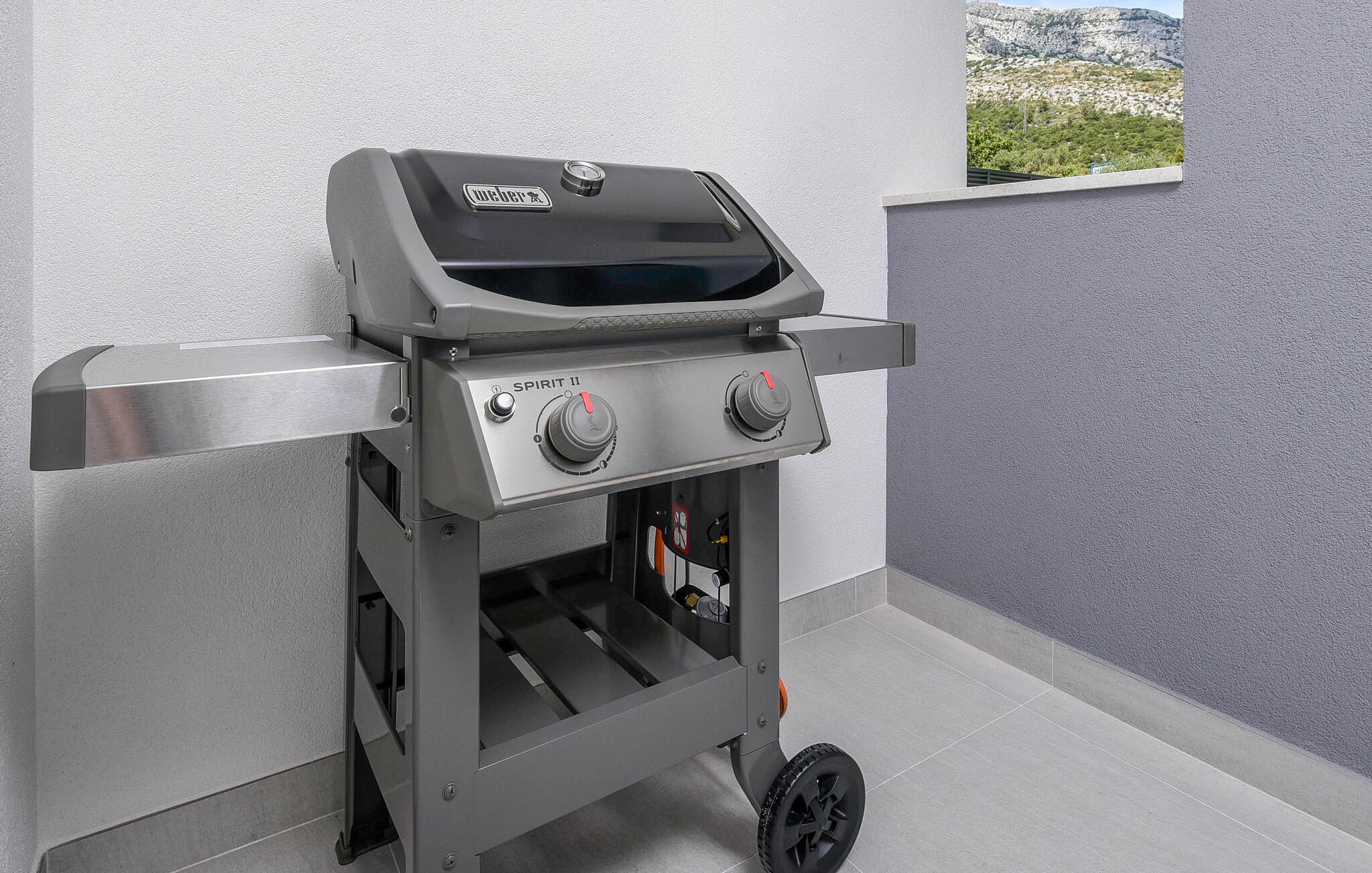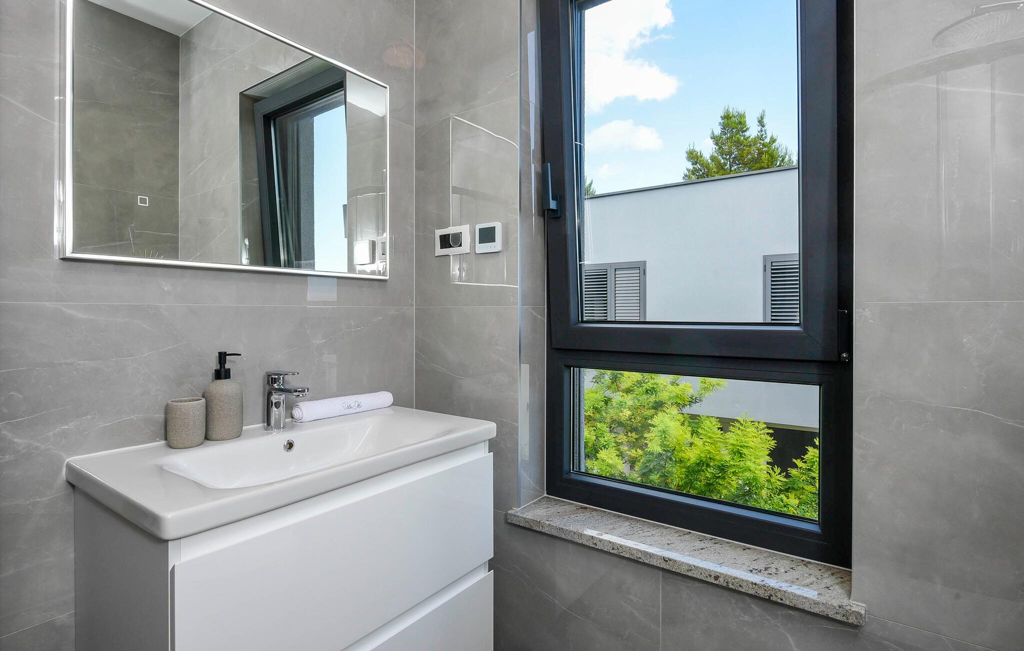 Begynd dagene veludhvilet og lad jer inspirere af den moderne indretning i det veludstyrede køkken for at tilberede en solid morgenmad til hele familien. Om I nyder det indenfor ved det elegante spisebord eller udenfor på den overdækkede terrasse med grill er op til jer. Om eftermiddagen inviterer liggestolene jer til at nyde en frisk drink. Eller sidde på balkonen og nyde den betagende udsigt over det dybe blå hav i det fjerne. Her finder I også et beroligende spabad. Den private pool byder på forfriskning, hvor I kan bade til jeres hjertes lyst. Fitnessrummet sørger for, at I holder jer i form selv på ferien, og I kan slappe helt af i hotellets sauna.