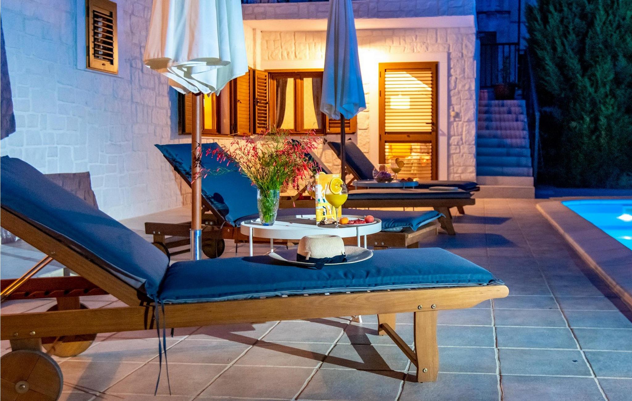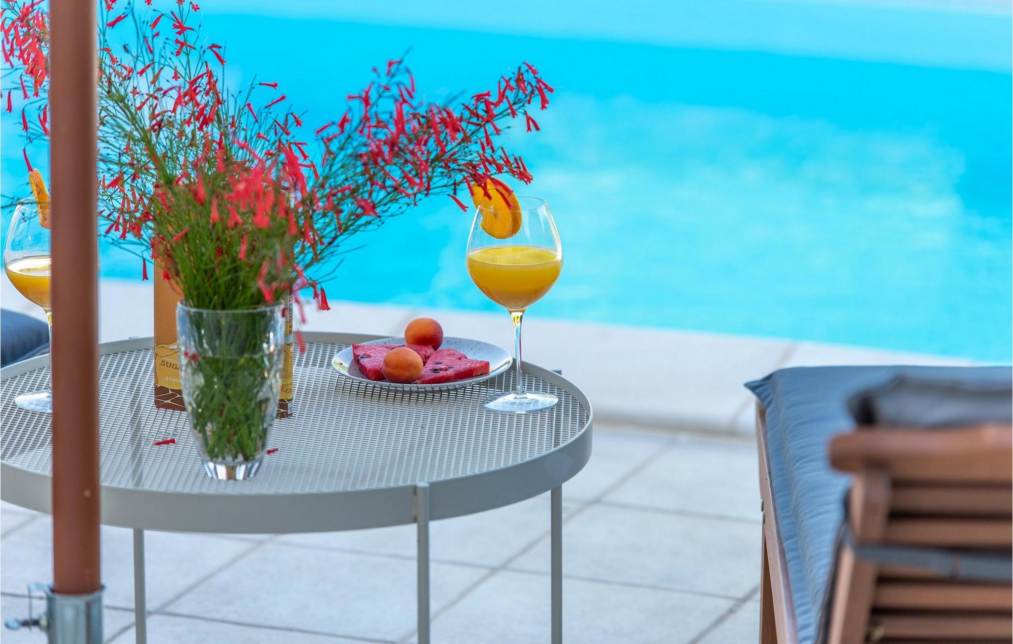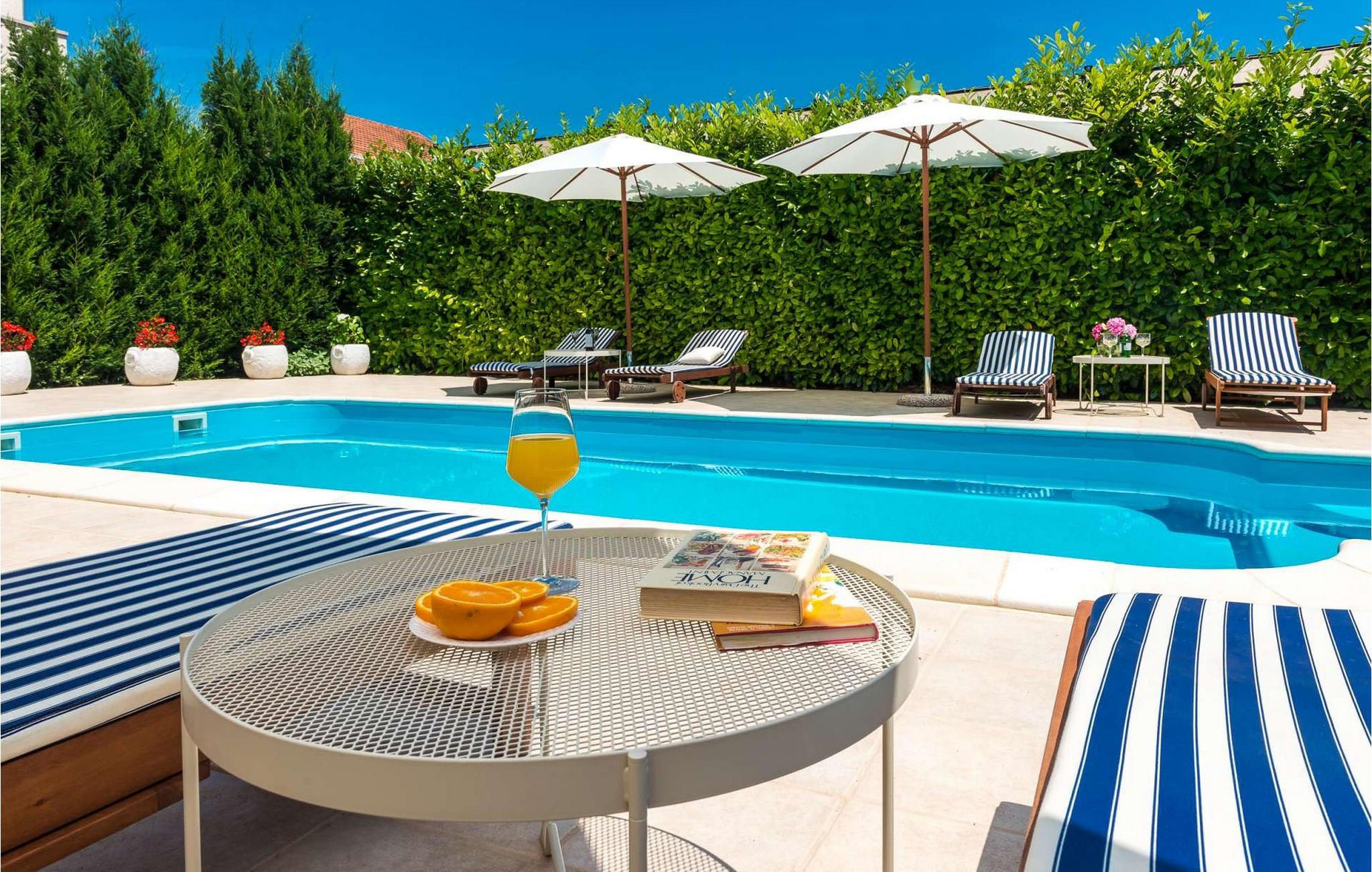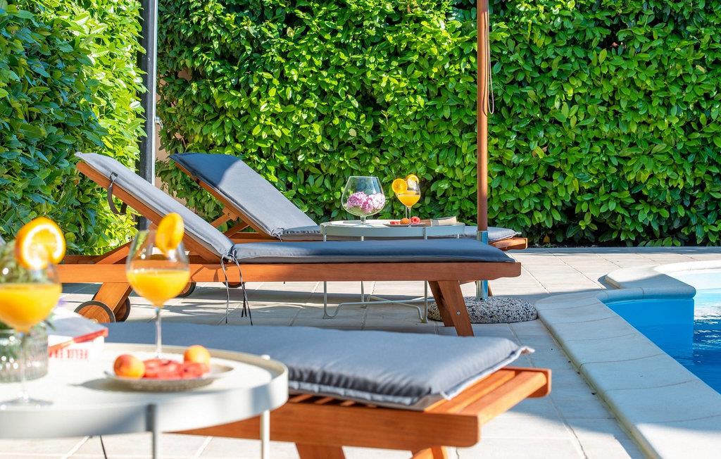 Villaens store have har en smuk pool, hvor I kan tilbringe afslappende timer under den blå himmel. Snak over et glas vin på de charmerende havemøbler og nyd hyggelige grillaftener i middelhavsmiljøer.