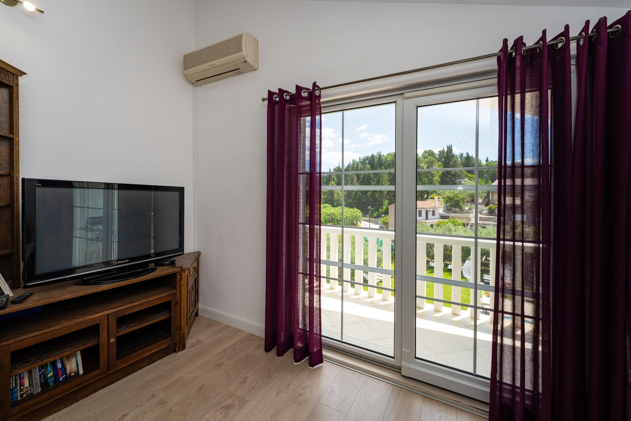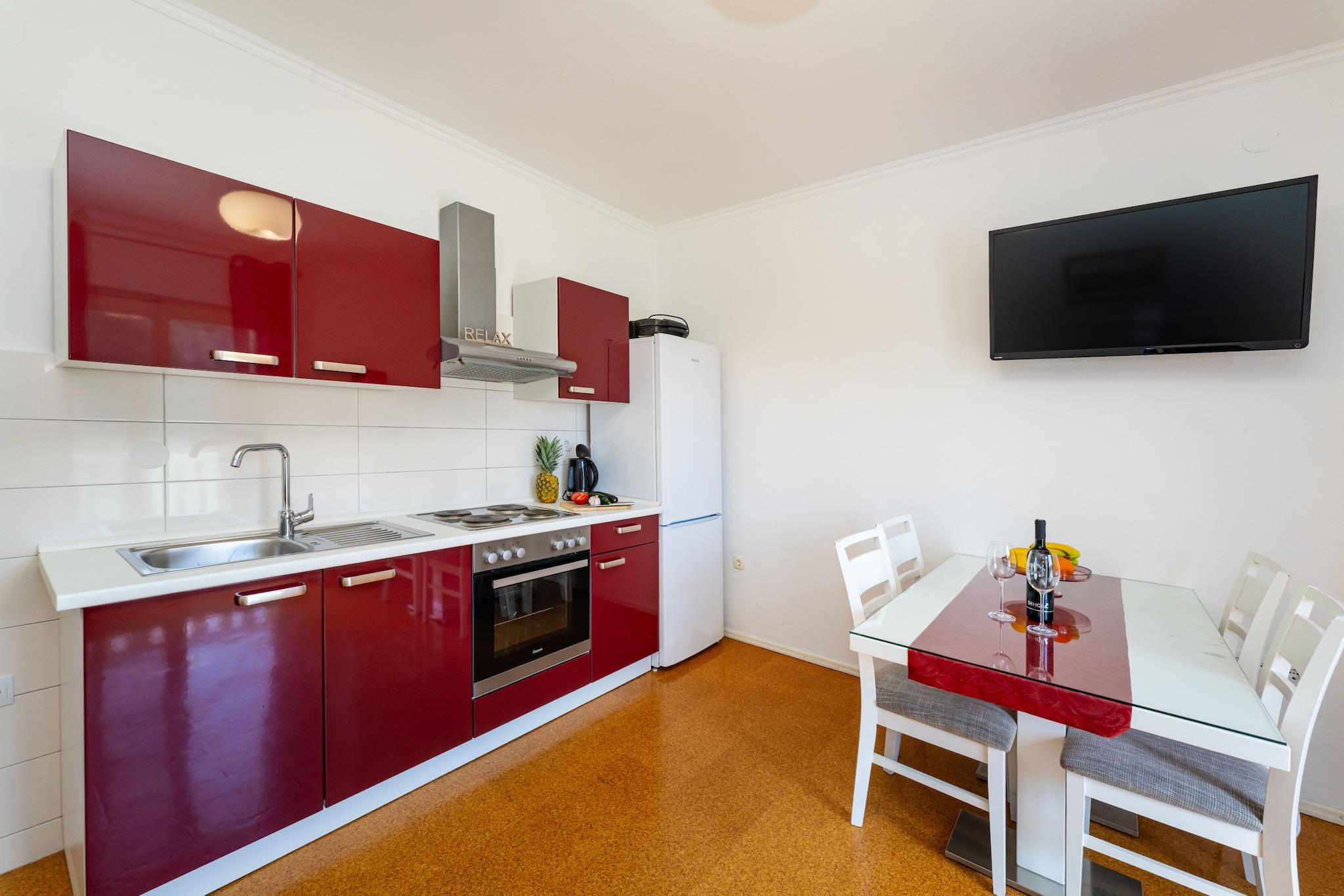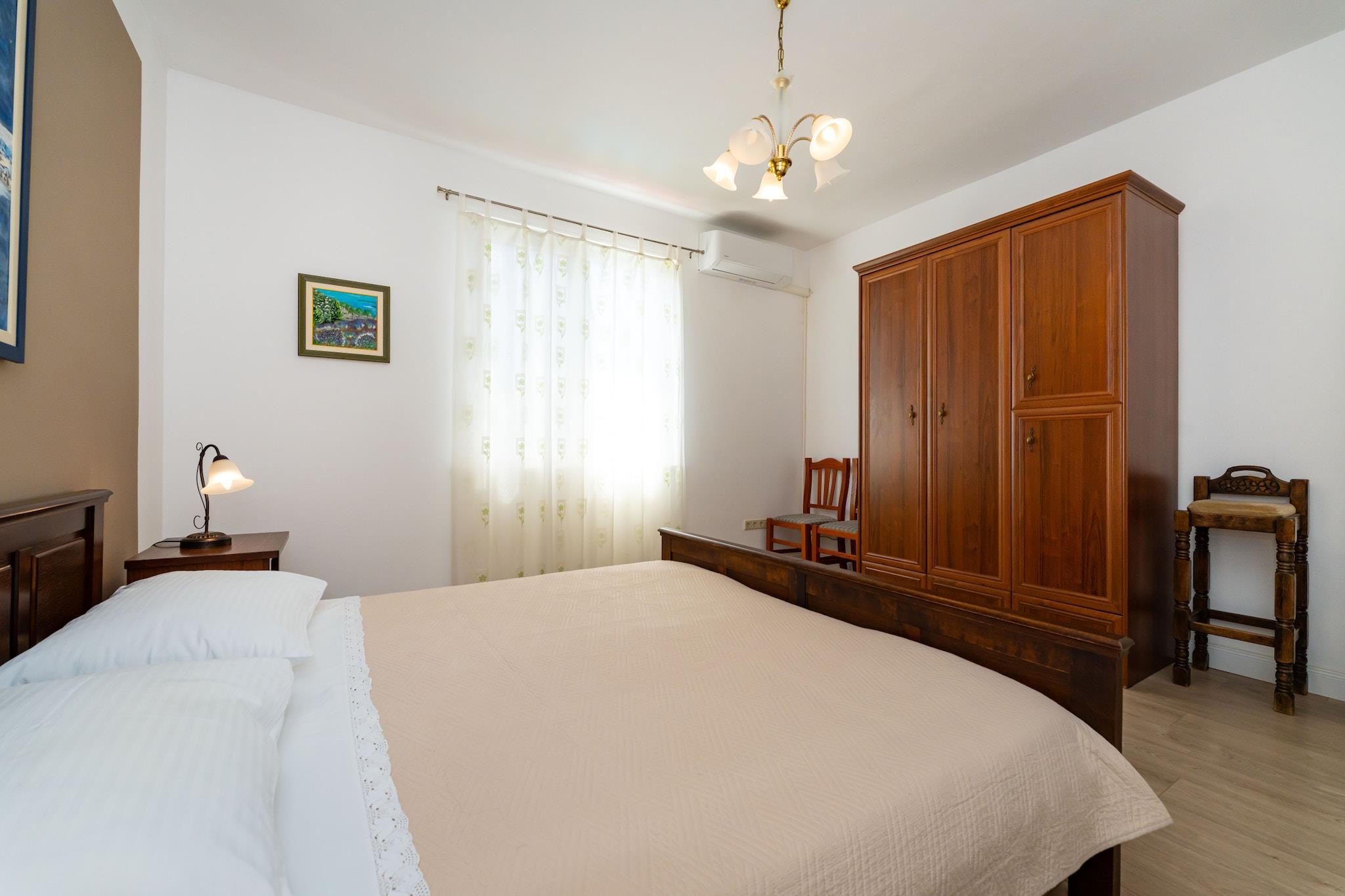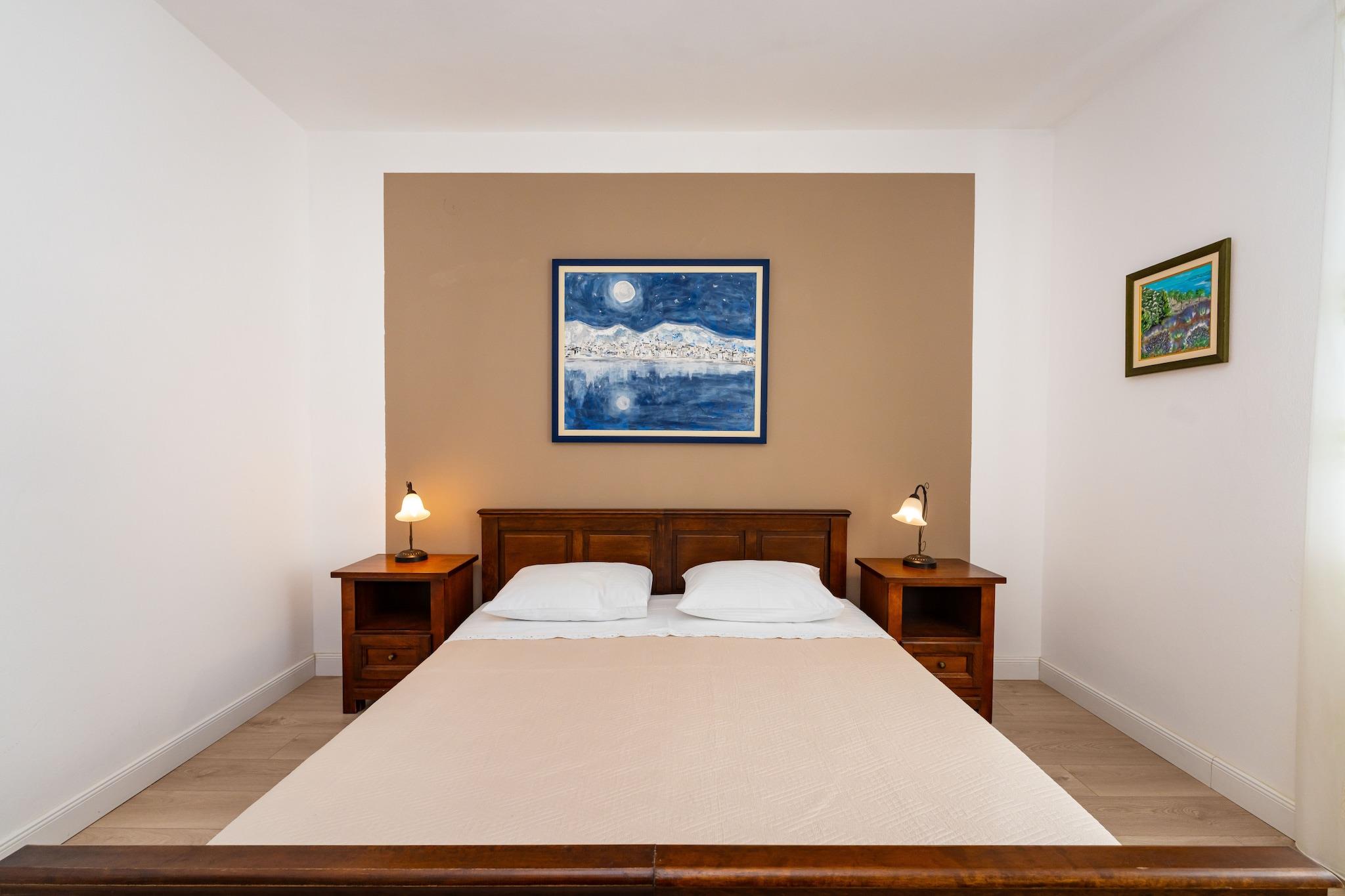 Nyd et fredeligt ophold kun 350 meter fra stranden i denne charmerende og moderne lejlighed til fire personer. Indkvarteringen tilbyder et lyst opholdsrum med en komfortabel sofa, spiseplads og fuldt udstyret åbent køkken med alt, hvad du behøver for et behageligt ophold med egen forplejning. Gå ud på den møblerede terrasse for at nyde afslappende øjeblikke i det fri i en rolig og venlig atmosfære. Lejligheden har to hyggelige soveværelser og et badeværelse, hvilket gør den ideel til familier eller venner. Moderne faciliteter såsom aircondition, Wi-Fi og satellit-tv sikrer et bekymringsfrit ophold. Gæsterne har også adgang til en fælles swimmingpool og privat parkering. Takket være den perfekte beliggenhed tæt på stranden, lokale butikker og restauranter kan du nyde både ro og komfort. Uanset om du ønsker at slappe af ved poolen, udforske de nærliggende attraktioner eller tage en aftenvandring langs kysten, tilbyder denne lejlighed alt, hvad du behøver for en afslappende og behagelig ferie ved havet.