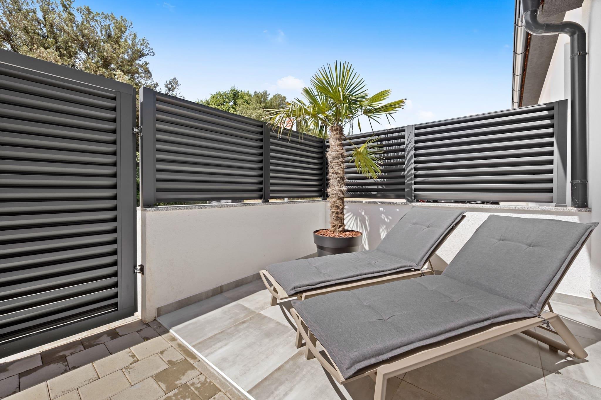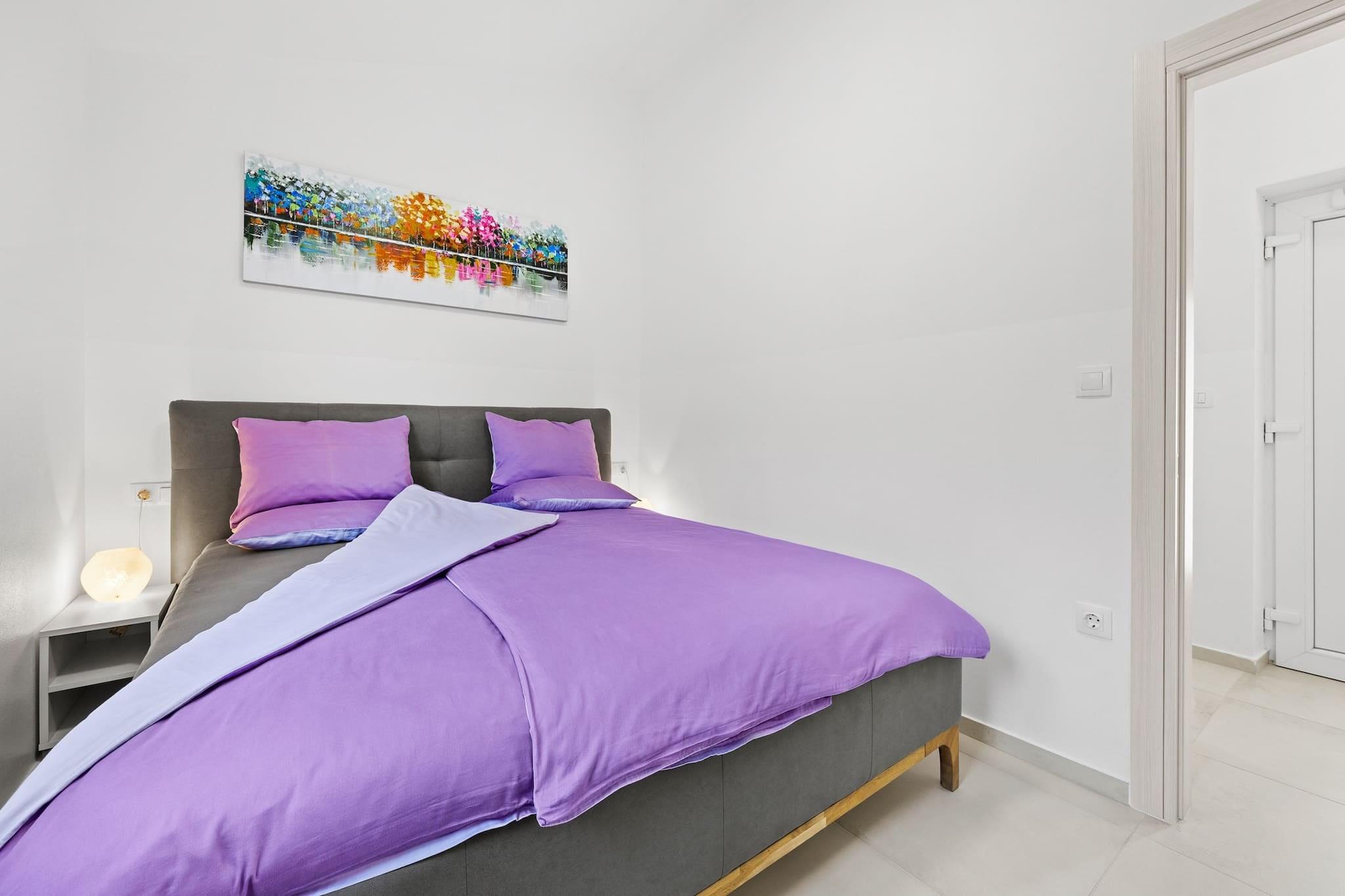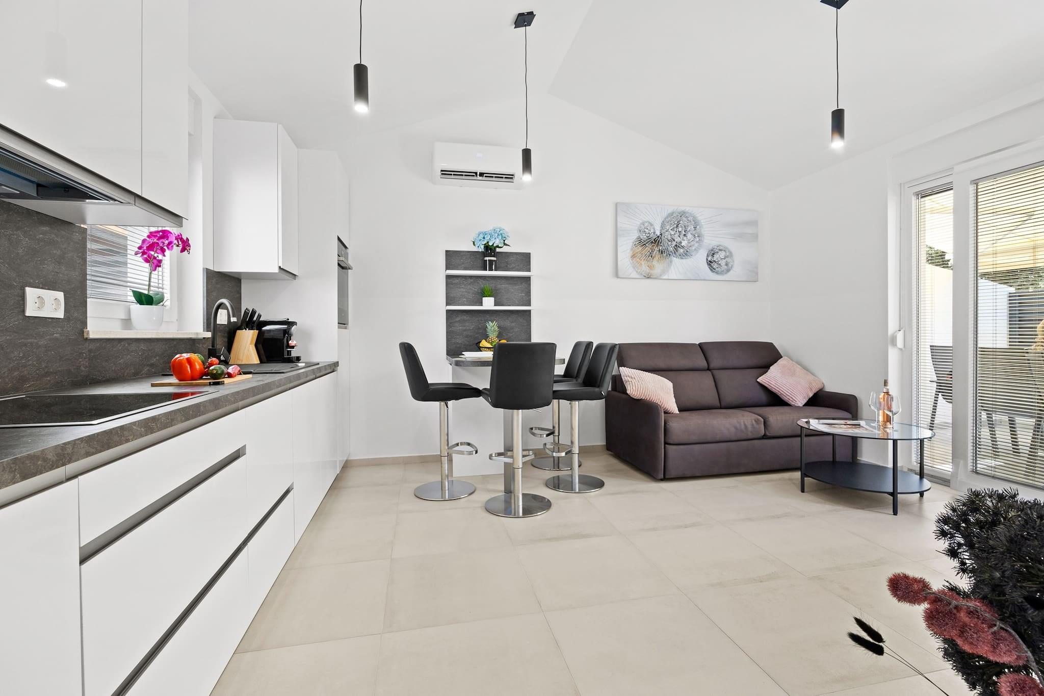 Denne moderne og nyindrettede lejlighed ligger kun 190 meter fra den nærmeste stenstrand, hvilket gør den til et ideelt tilflugtssted for en afslappende ferie. Lejligheden har en hyggelig terrasse med udsigt over fyrreskoven, der tilbyder privatliv og et perfekt sted at solbade på de to liggestole. Indenfor finder du en komfortabel stue, et fuldt udstyret køkken, et soveværelse med en king-size seng og et badeværelse med bruser. Lejligheden indeholder også en sovesofa, hvilket gør den velegnet til op til 2 voksne og 2 børn. Køkkenet er fuldt udstyret med moderne apparater, herunder induktionskogeplader, køleskab, mikroovn, ovn, fryser, opvaskemaskine og meget mere. Der er også en vaskemaskine, hvilket tilføjer bekvemmelighed til længere ophold. Gæsterne kan nyde gratis privat parkering til én bil, og lejligheden har aircondition, Wi-Fi, satellit-tv og havemøbler. Den nærliggende by Barbariga er hjemsted for smukke romerske ruiner og den velkendte Brijuni Nationalpark, som kan nås med båd fra Fažana. Den antikke by Pula, med dets berømte amfiteater og andre romerske monumenter, er også inden for rækkevidde. Den nærmeste restaurant ligger kun 300 meter væk, og der ligger en butik kun 30 meter fra lejligheden, hvilket gør det bekvemt for gæsterne at hente det væsentlige. Kæledyr er velkomne mod et ekstra gebyr på 20 EURO per nat.