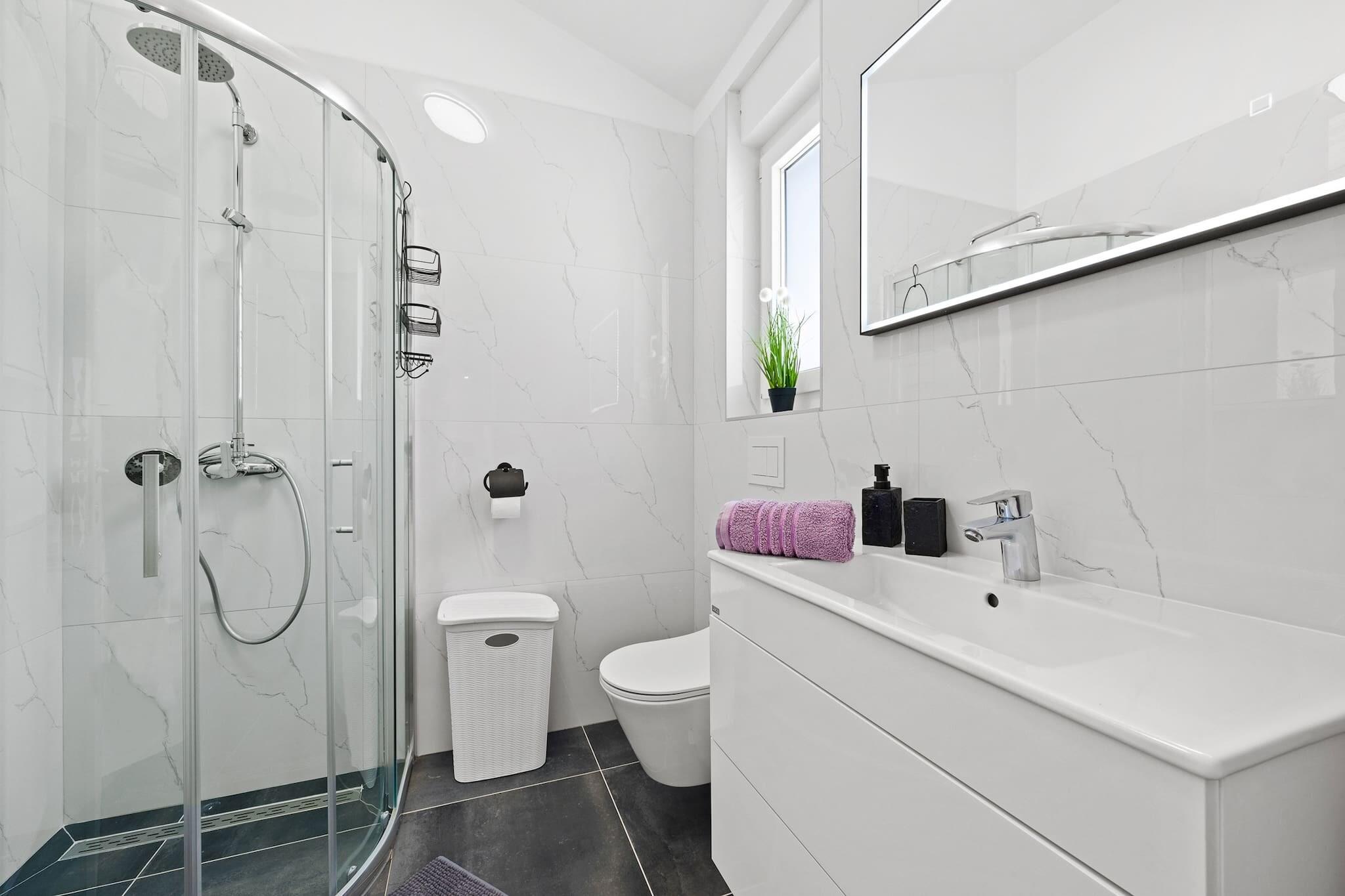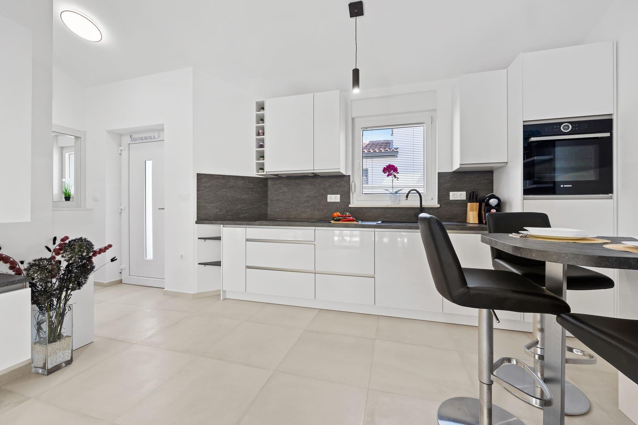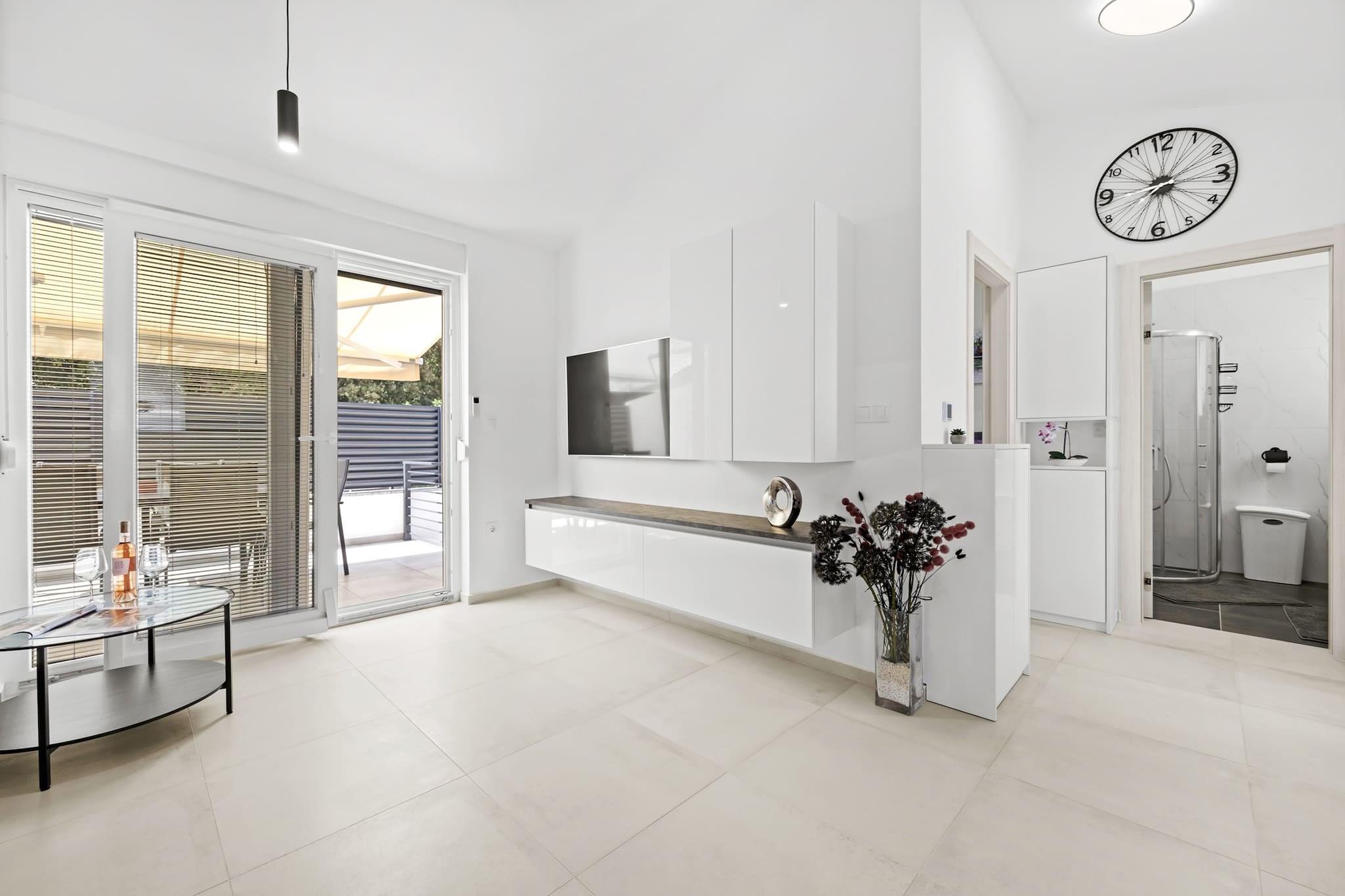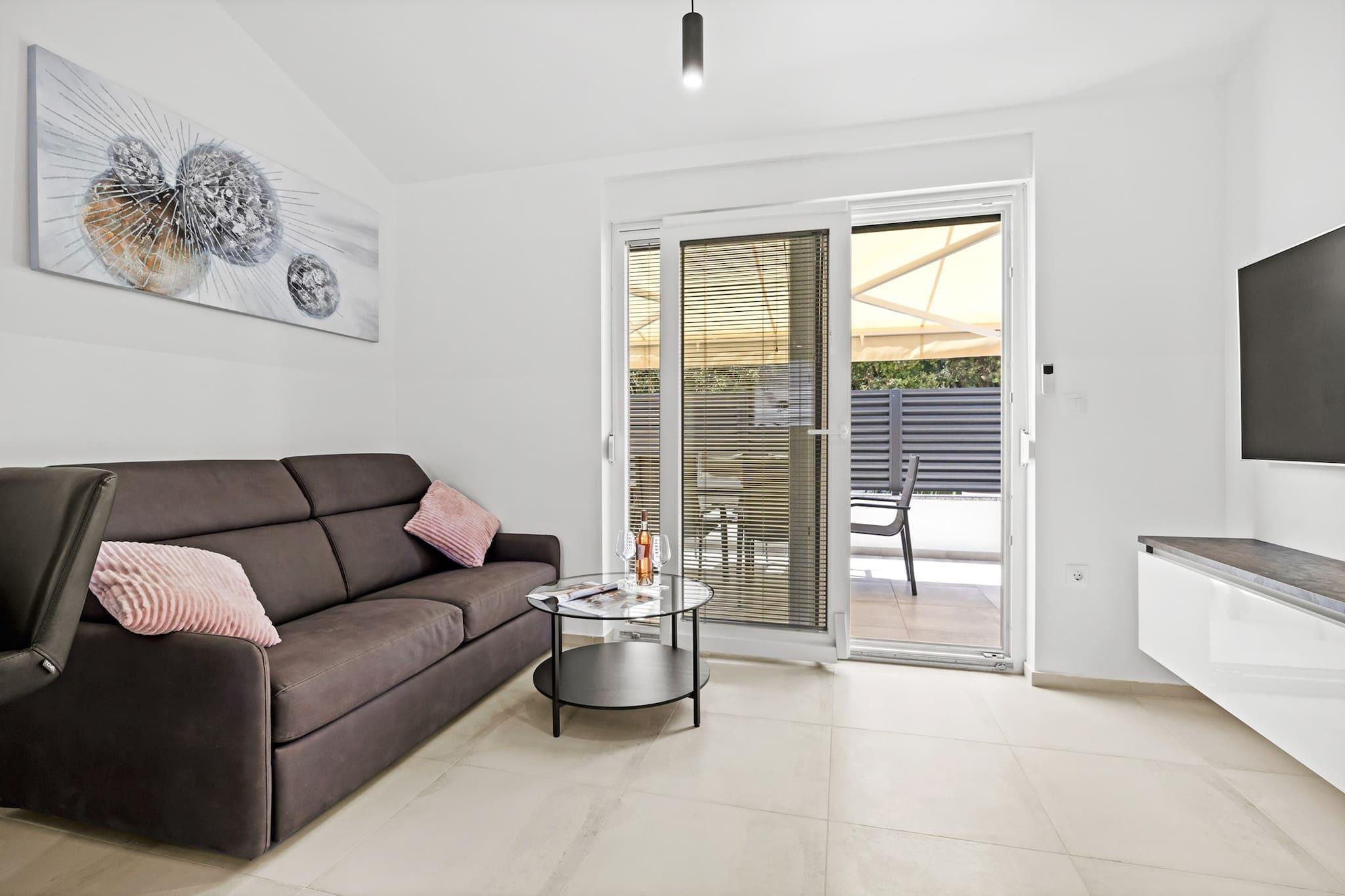 Denne moderne og nyindrettede lejlighed ligger kun 190 meter fra den nærmeste stenstrand, hvilket gør den til et ideelt tilflugtssted for en afslappende ferie. Lejligheden har en hyggelig terrasse med udsigt over fyrreskoven, der tilbyder privatliv og et perfekt sted at solbade på de to liggestole. Indenfor finder du en komfortabel stue, et fuldt udstyret køkken, et soveværelse med en king-size seng og et badeværelse med bruser. Lejligheden indeholder også en sovesofa, hvilket gør den velegnet til op til 2 voksne og 2 børn. Køkkenet er fuldt udstyret med moderne apparater, herunder induktionskogeplader, køleskab, mikroovn, ovn, fryser, opvaskemaskine og meget mere. Der er også en vaskemaskine, hvilket tilføjer bekvemmelighed til længere ophold. Gæsterne kan nyde gratis privat parkering til én bil, og lejligheden har aircondition, Wi-Fi, satellit-tv og havemøbler. Den nærliggende by Barbariga er hjemsted for smukke romerske ruiner og den velkendte Brijuni Nationalpark, som kan nås med båd fra Fažana. Den antikke by Pula, med dets berømte amfiteater og andre romerske monumenter, er også inden for rækkevidde. Den nærmeste restaurant ligger kun 300 meter væk, og der ligger en butik kun 30 meter fra lejligheden, hvilket gør det bekvemt for gæsterne at hente det væsentlige. Kæledyr er velkomne mod et ekstra gebyr på 20 EURO per nat.