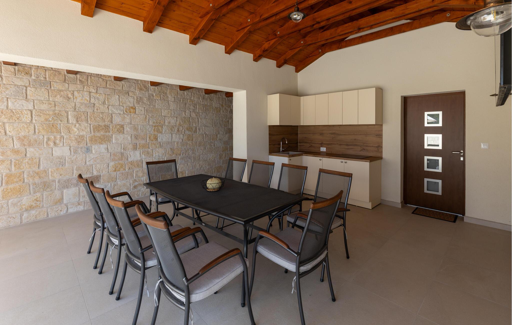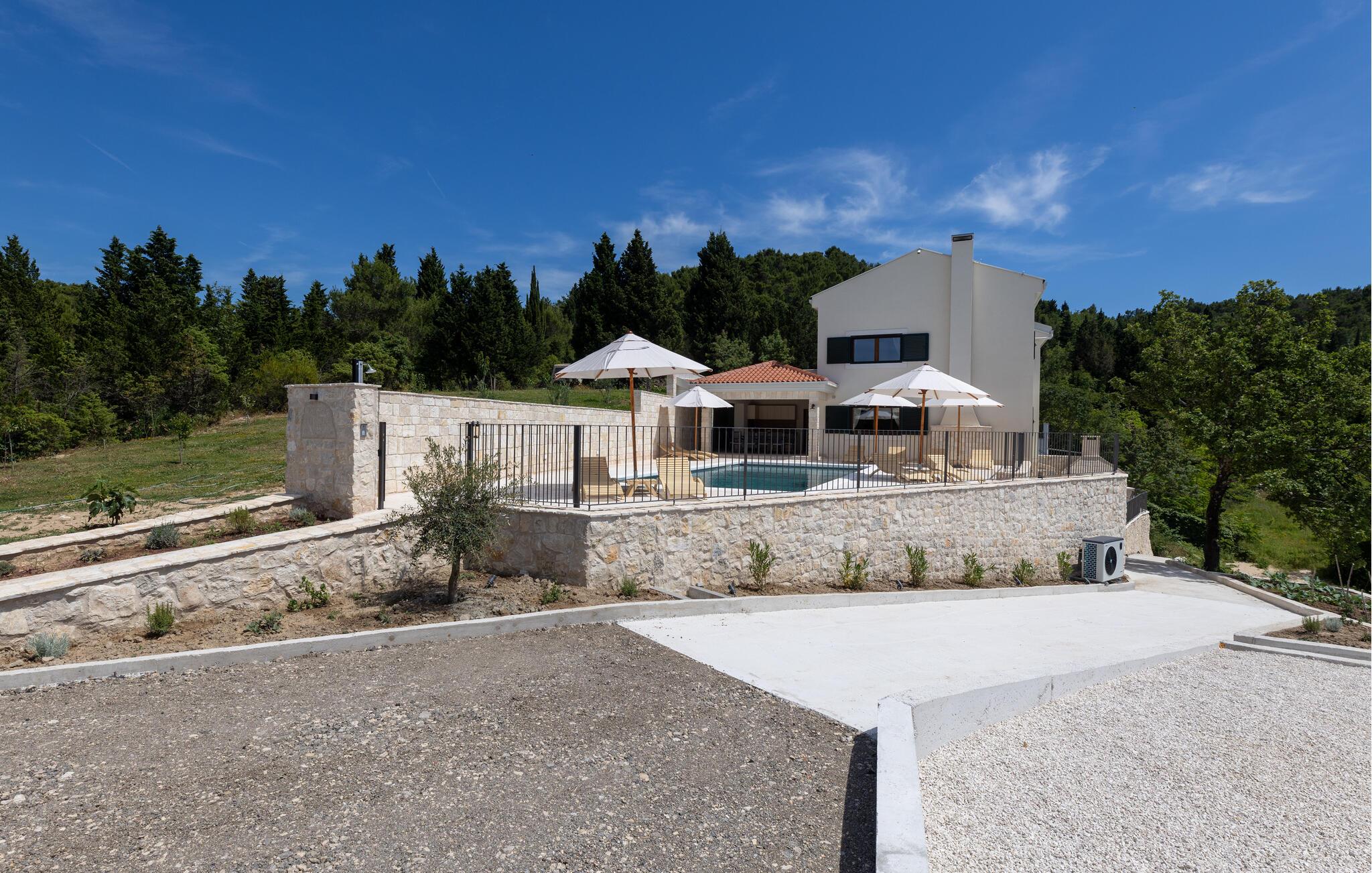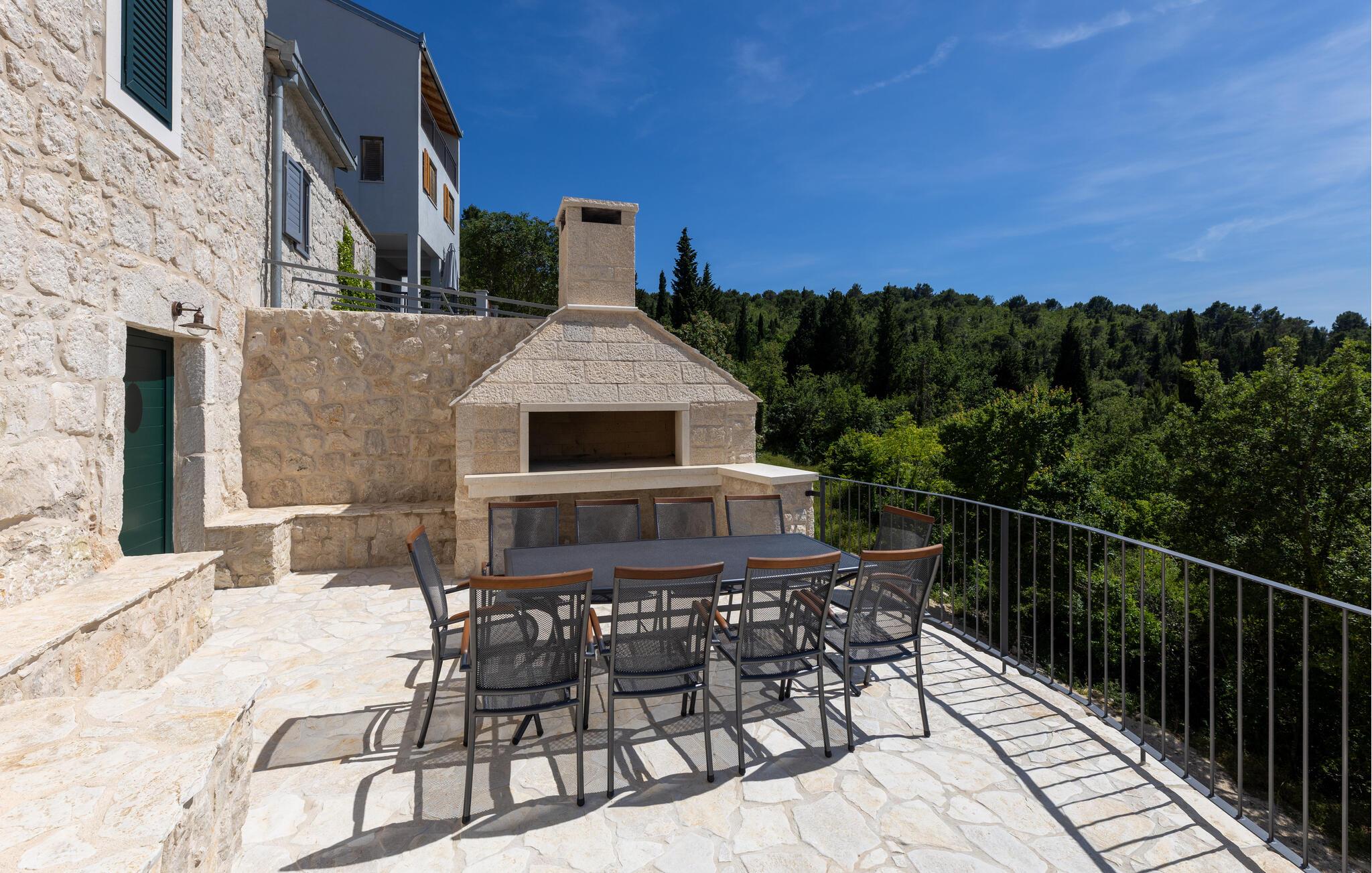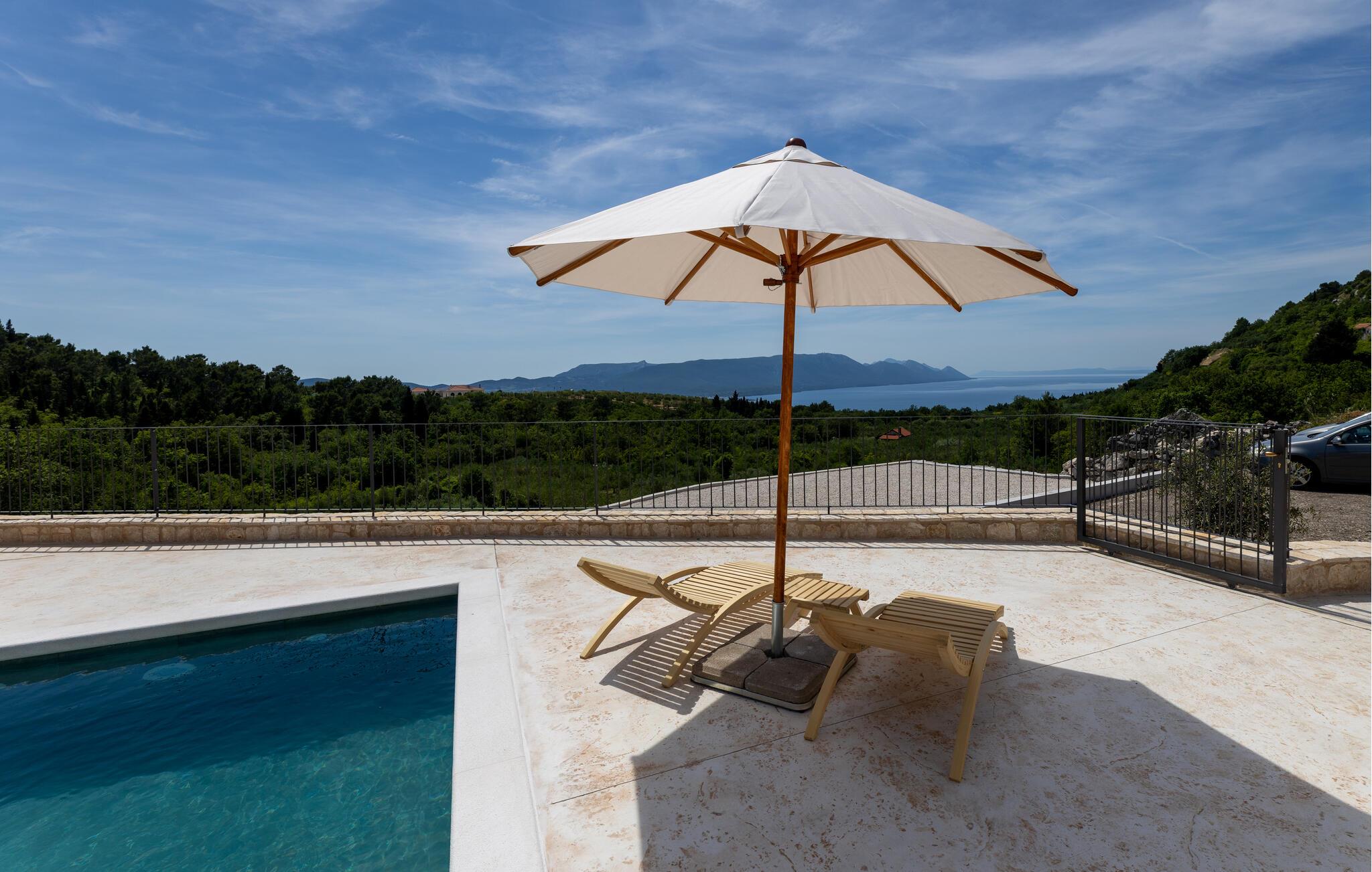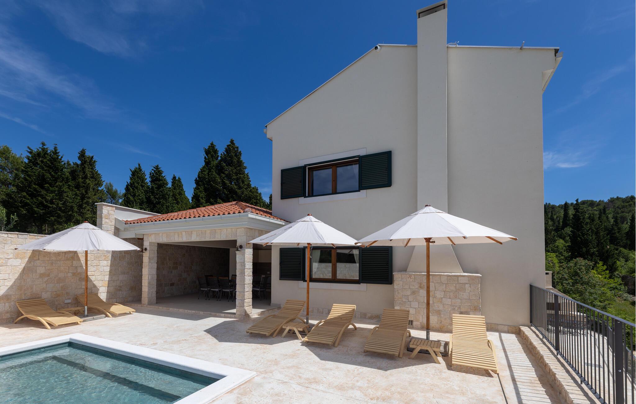 Det rummelige udendørsområde er perfekt til at nyde det vidunderlige klima fuldt ud. Snup en frisk dukkert i den store pool og nyd havet fra en liggestol. Server friske salater på den skyggefulde terrasse og nyd lune sommernætter med en grillmiddag med vin og stearinlys.