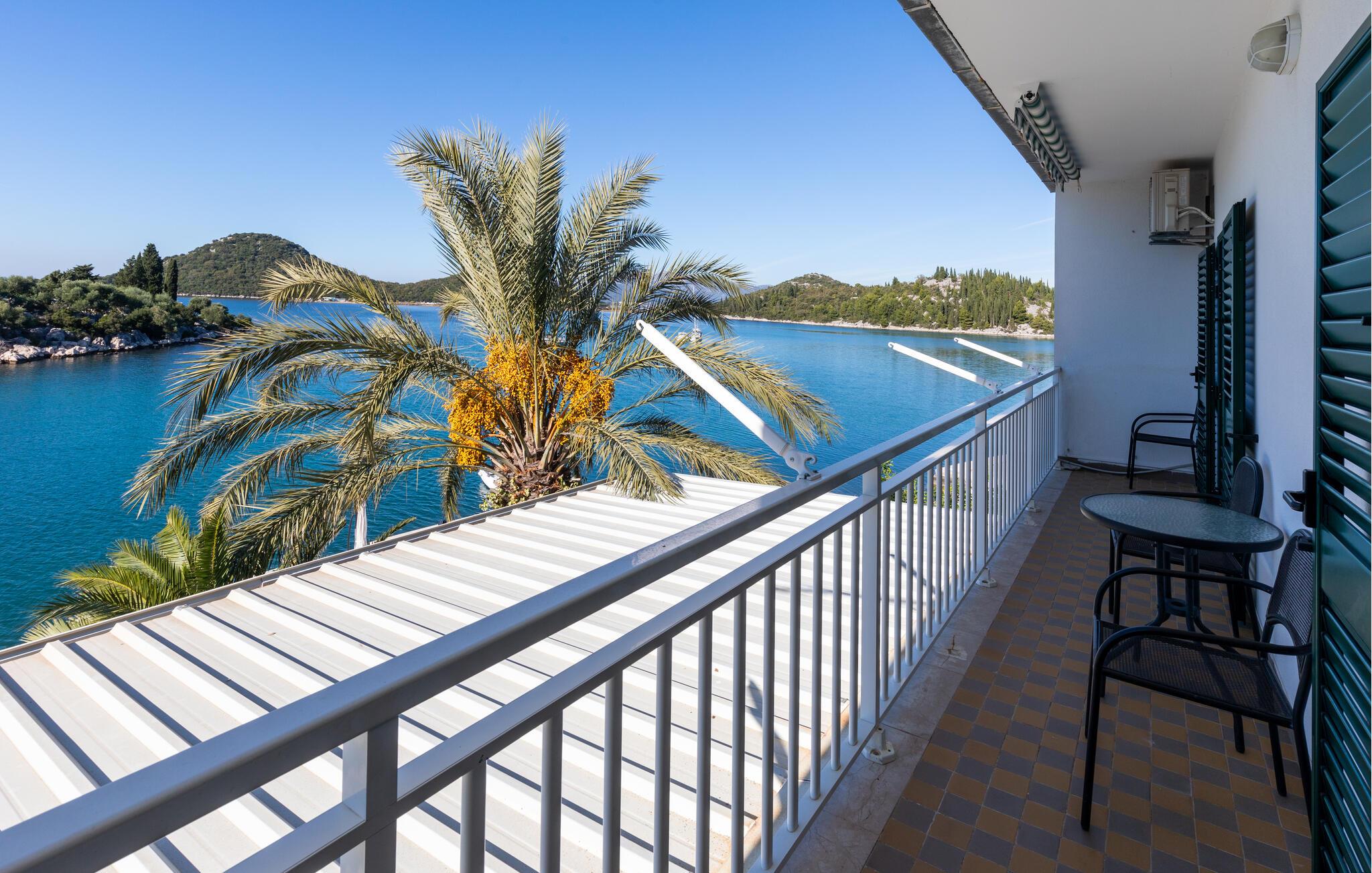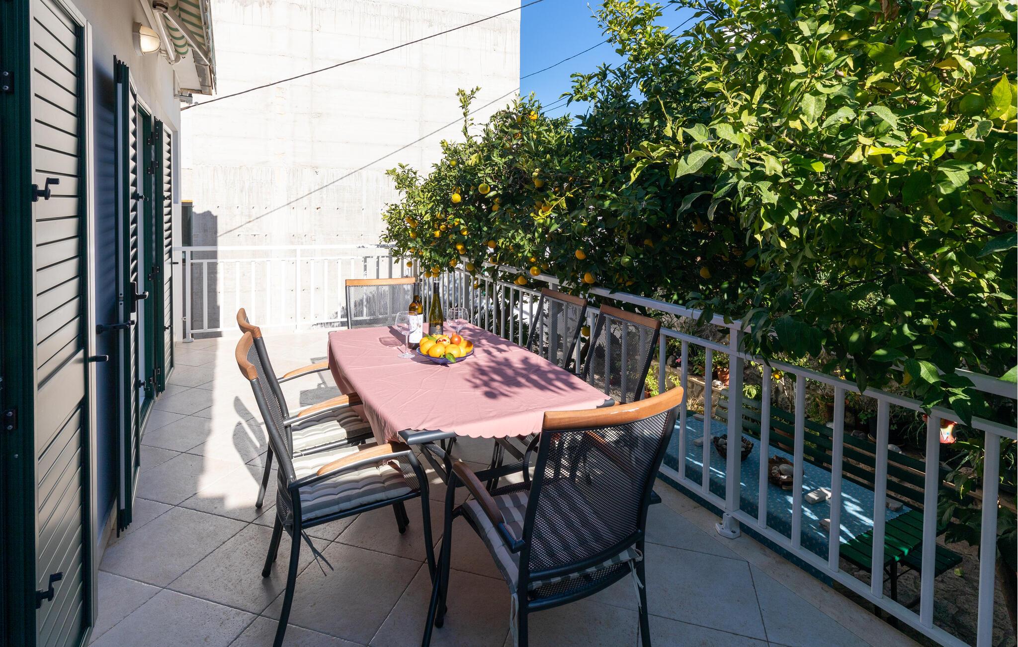 Træd ud på balkonen og glæd jer til en dejlig ferie med fortryllende udsigt over havet. gå ned til det smukke badeplateau og nyd den fredfyldte atmosfære på liggestolen. I baghaven kan I benytte den fælles grillterrasse og snakke over et glas vin i skyggen af citrustræerne.