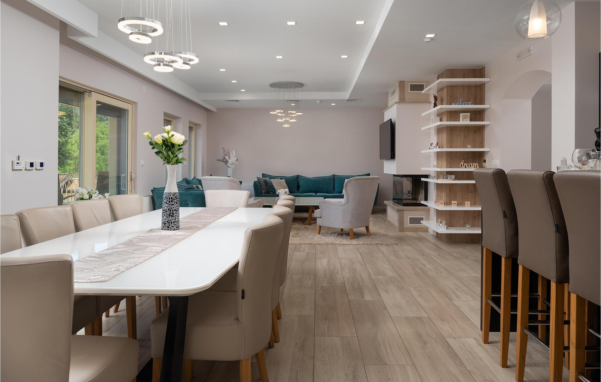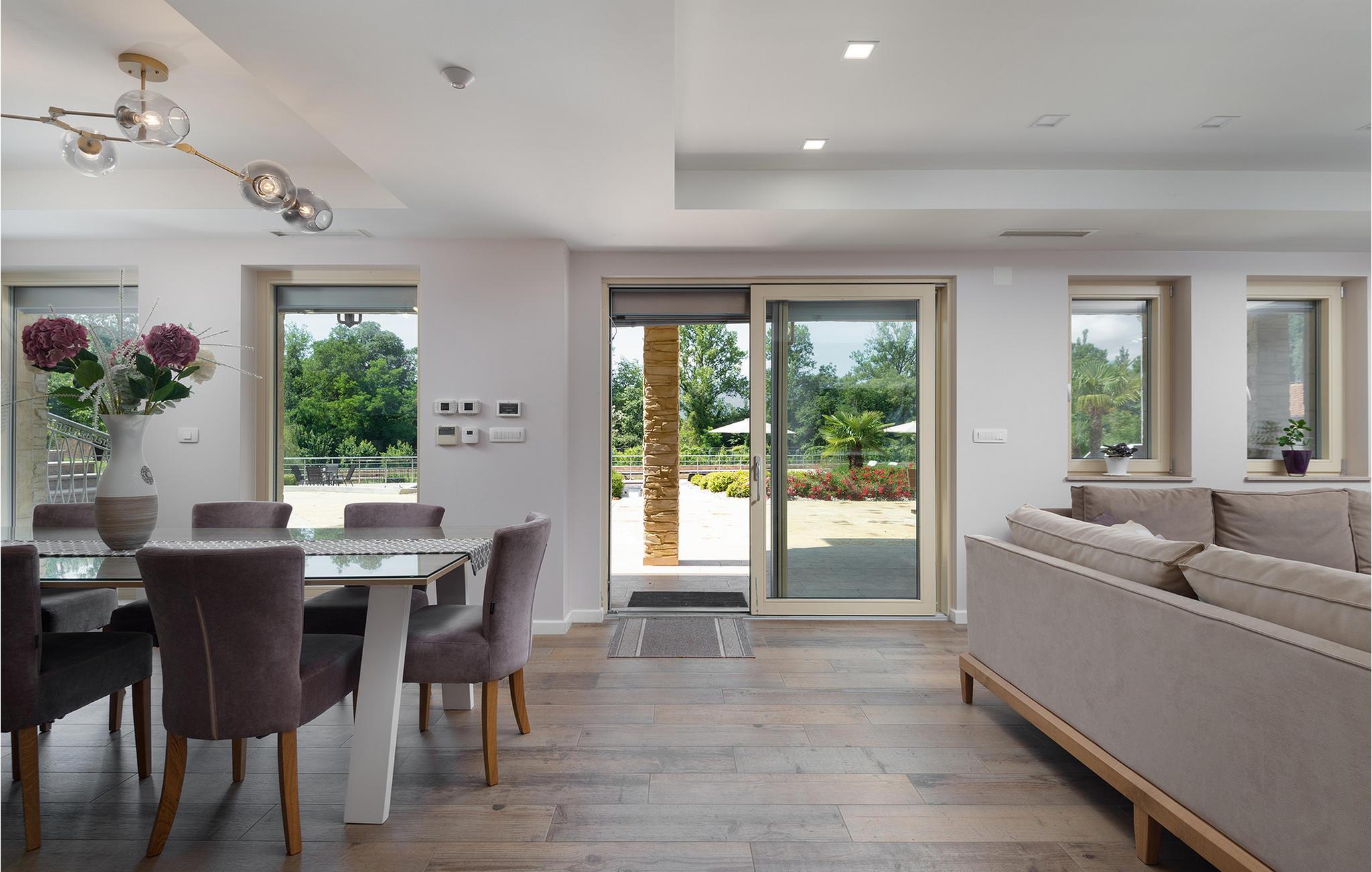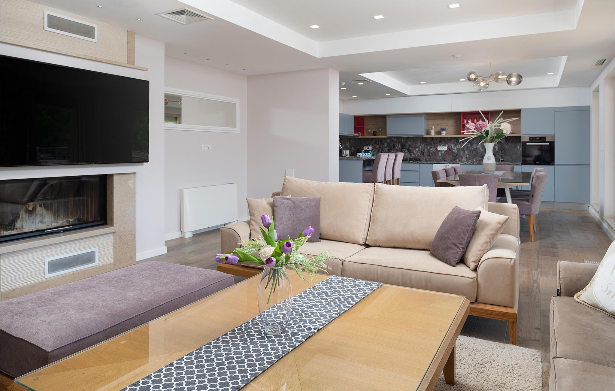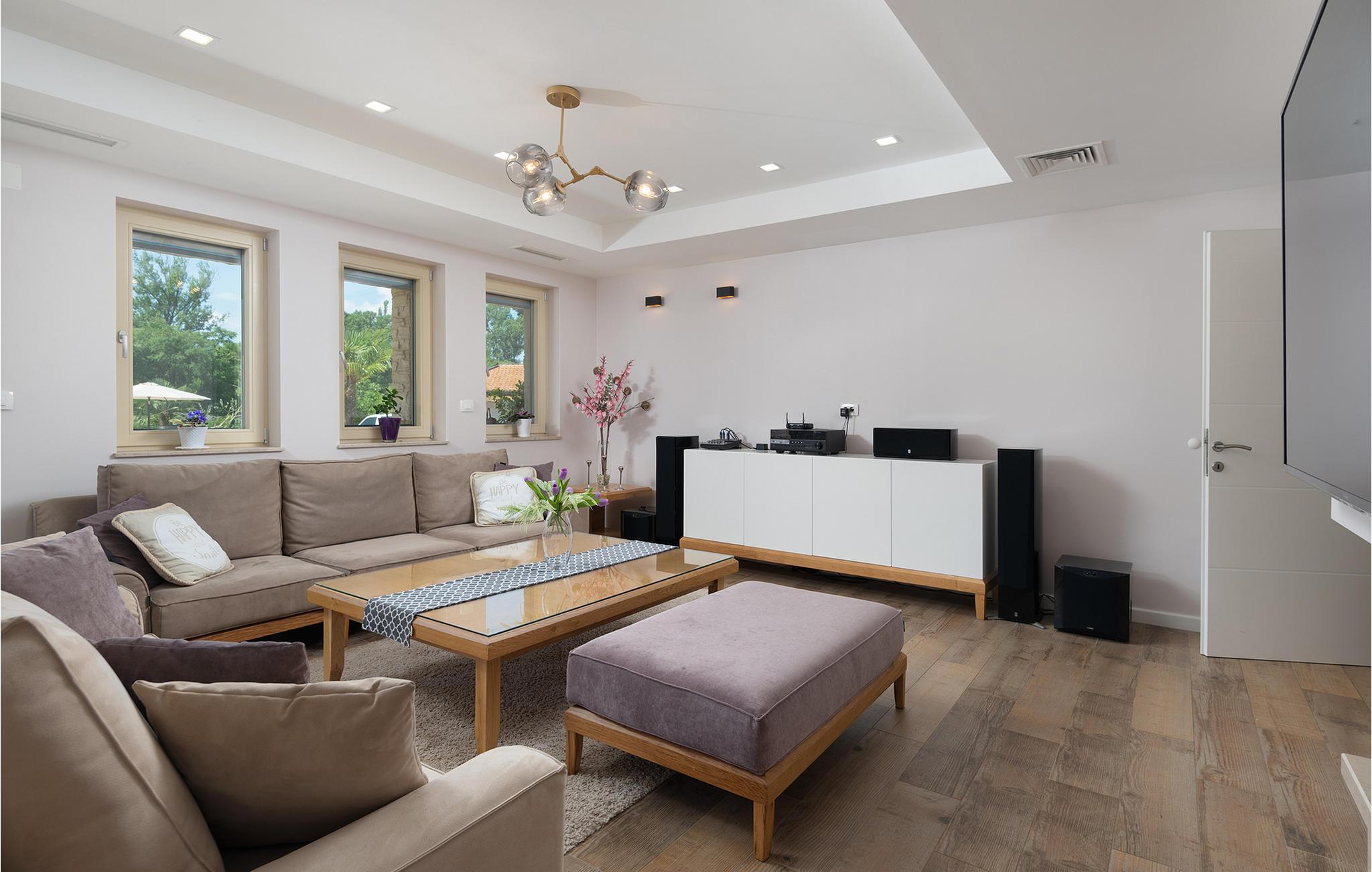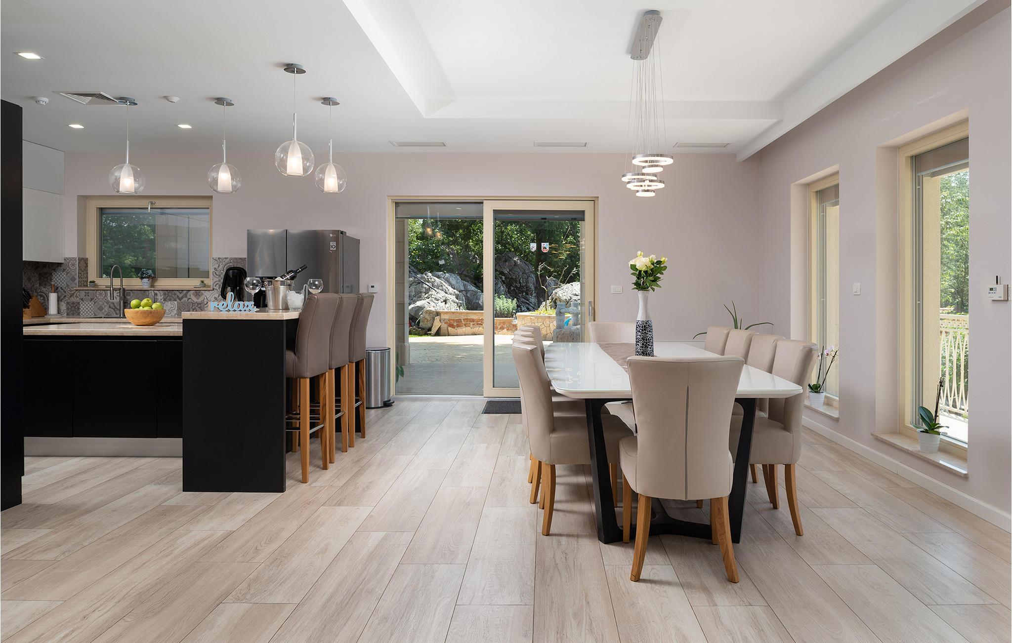 Dette rummelige og elegant designede hus er perfekt til en uforglemmelig ferie med familie og venner. Her finder I masser af plads til at slappe af, luksuriøs komfort og nok private rum til at nyde hvert øjeblik. De stilfulde møbler og den harmoniske atmosfære lægger op til at slappe af, lave mad sammen eller tilbringe hyggelige aftener i det lyse opholdsområde.