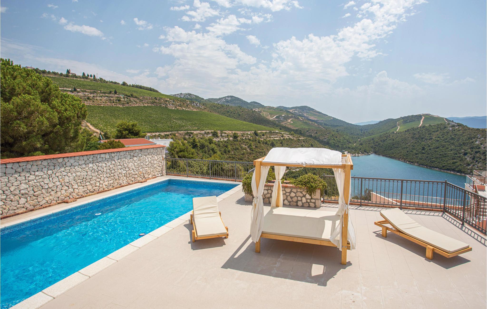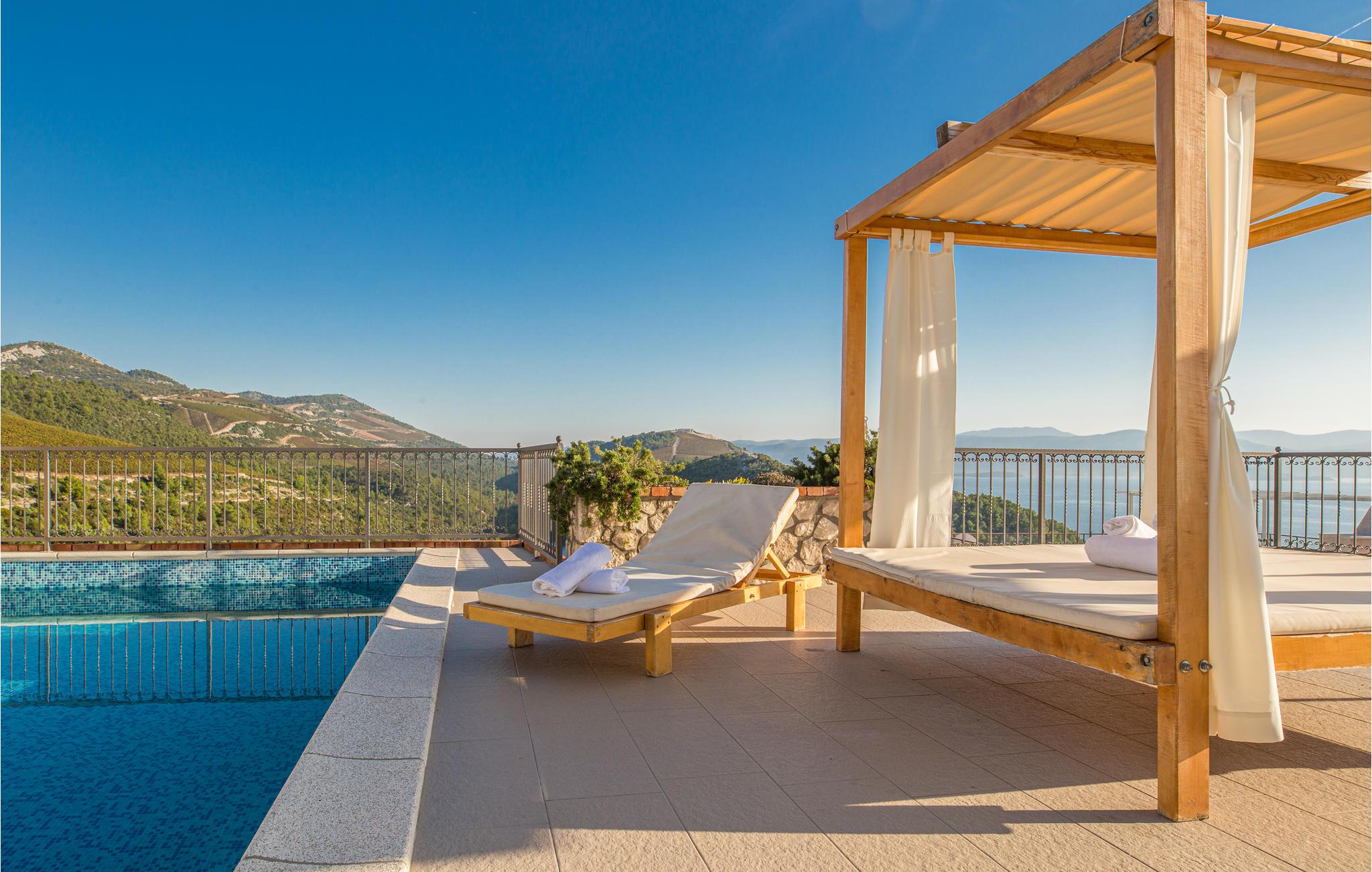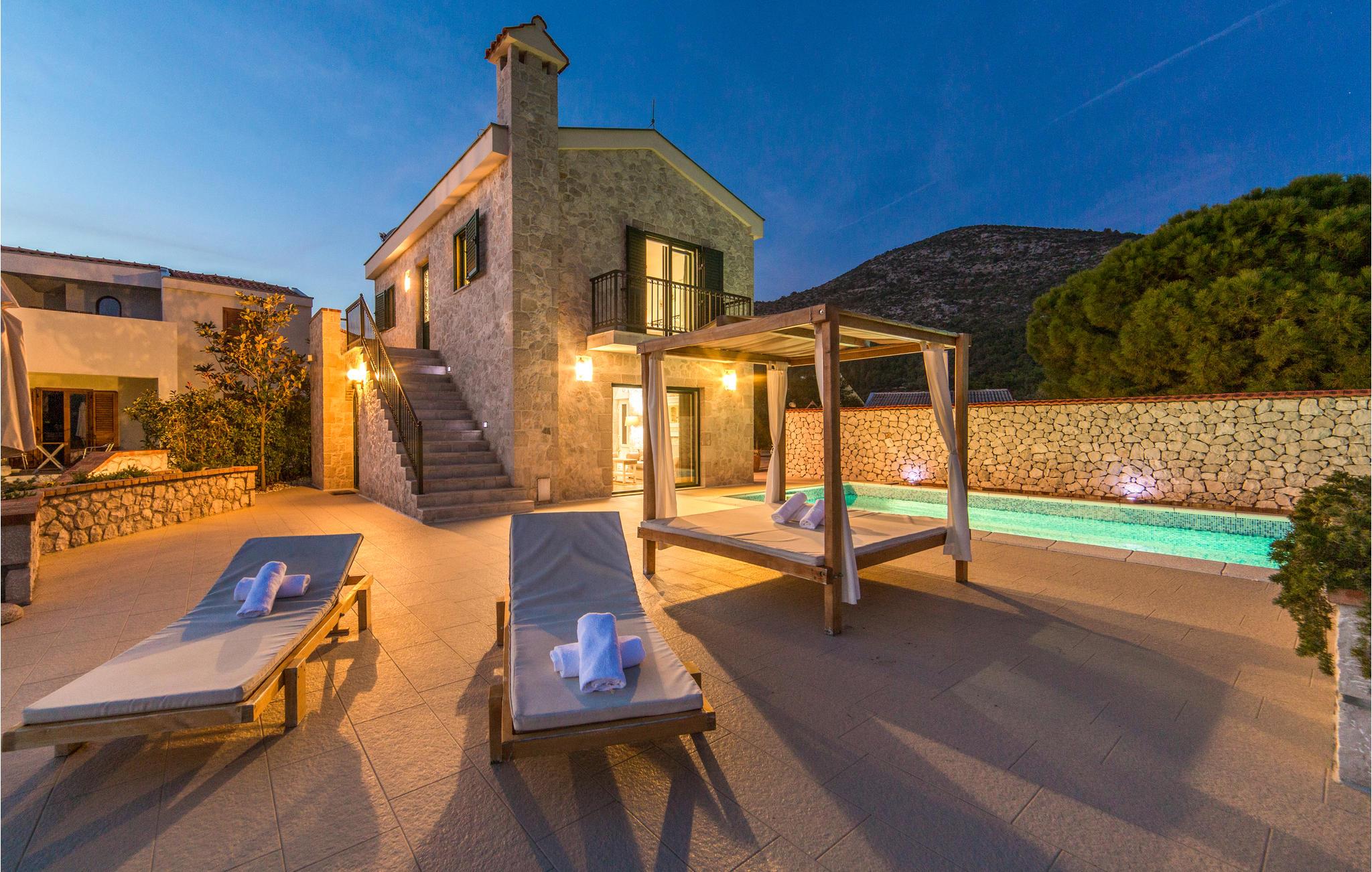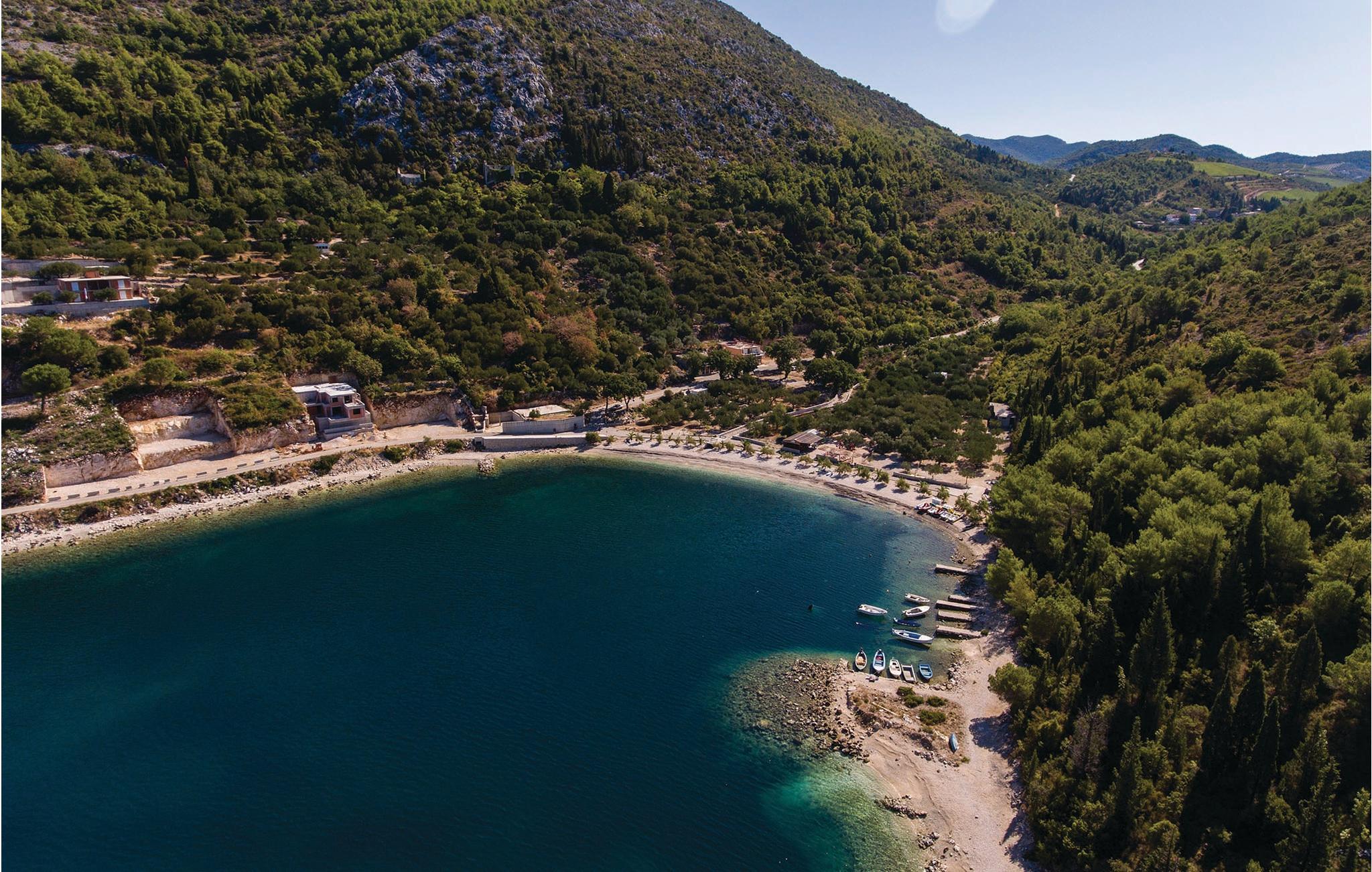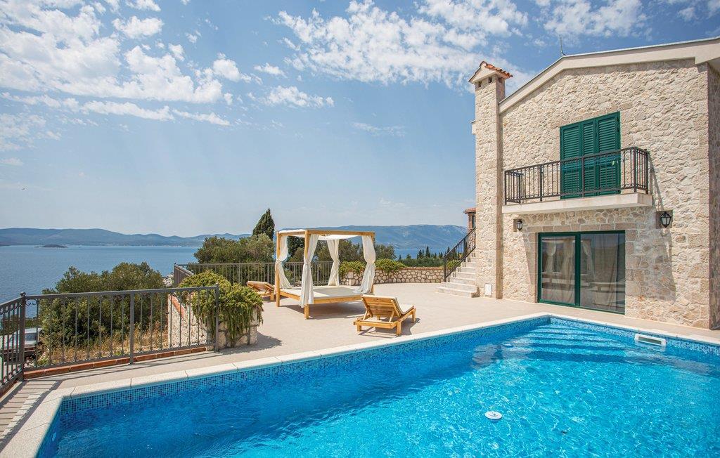 Denne moderne villa, der er bygget i den typisk dalmatiske stil, ligger i den lille by Kremena og er det rigtige valg for en afslappet ferie. Huset strækker sig over to etager, der er forbundet både med en indendørs vindeltrappe og en udendørs trappe. I stueetagen ligger opholdsområdet med køkken og spisestue samt et toilet og et badeværelse med douche. På den øverste etage ligger der tre soveværelser og et badeværelse. Den skønne, store terrasse med pool og den flotte panoramaudsigt over havet gør ferien perfekt. Ved siden af huset er der også en legeplads og en overdækket terrasse med grill. Kisel- og klippestranden når I på 5 minutter i bil. Det kan anbefales at tage dagsture til Dubrovnik og Korcula, der har et rigt kulturliv.