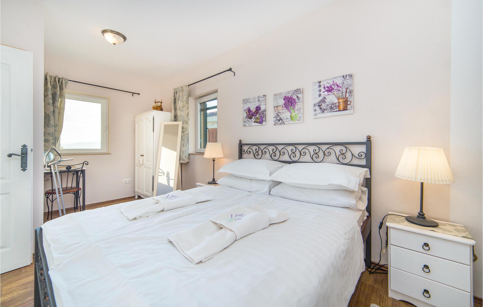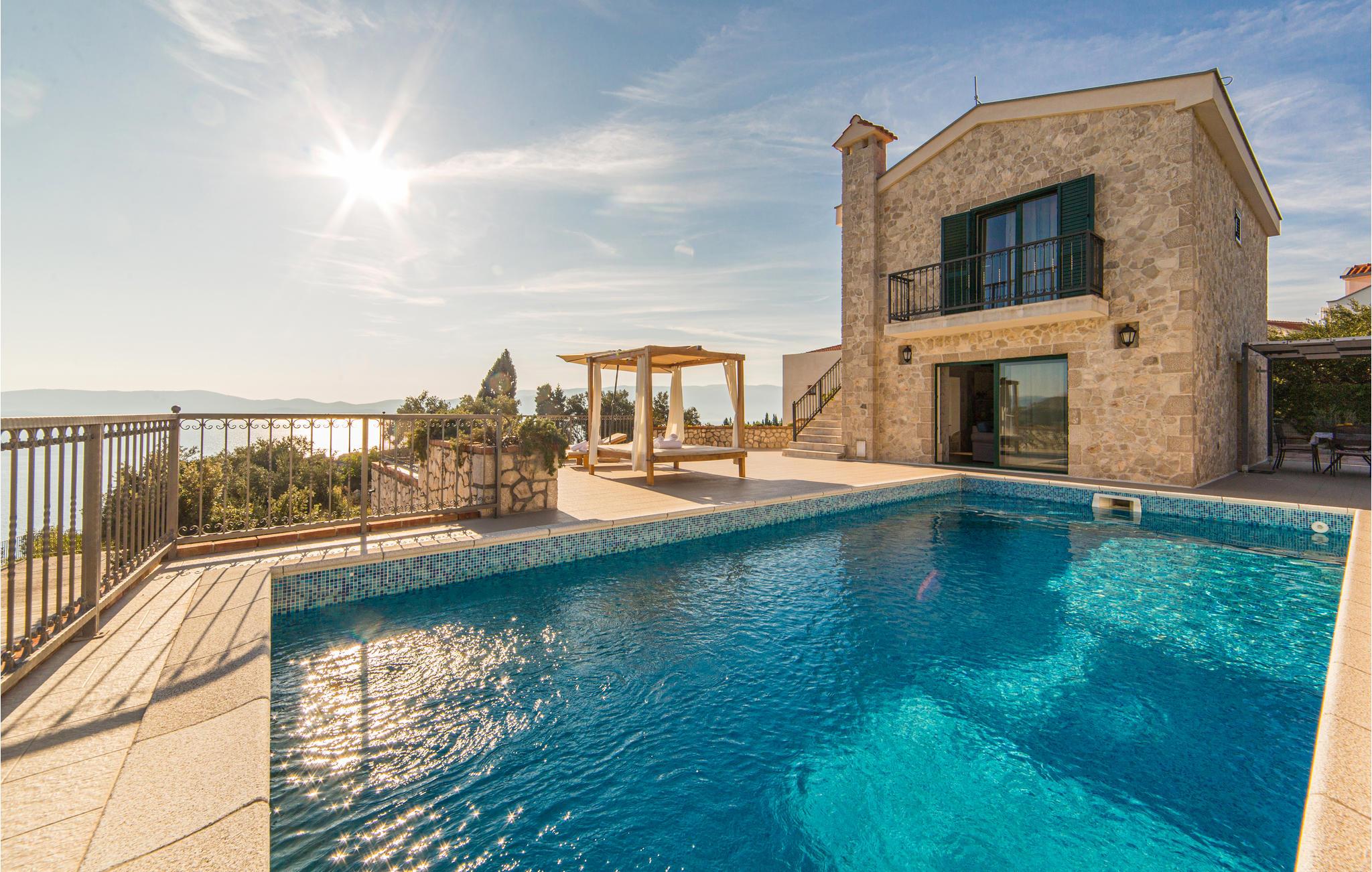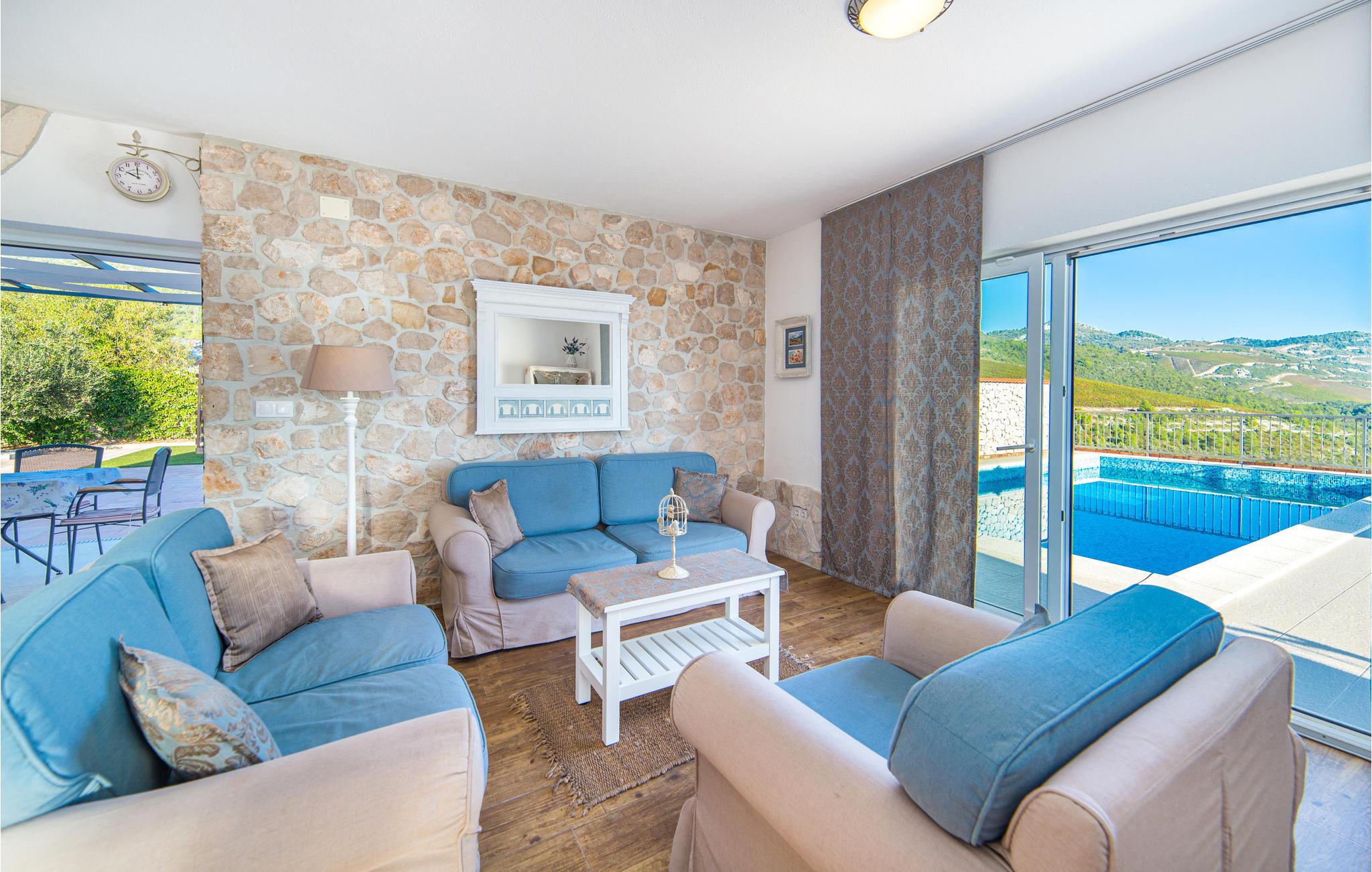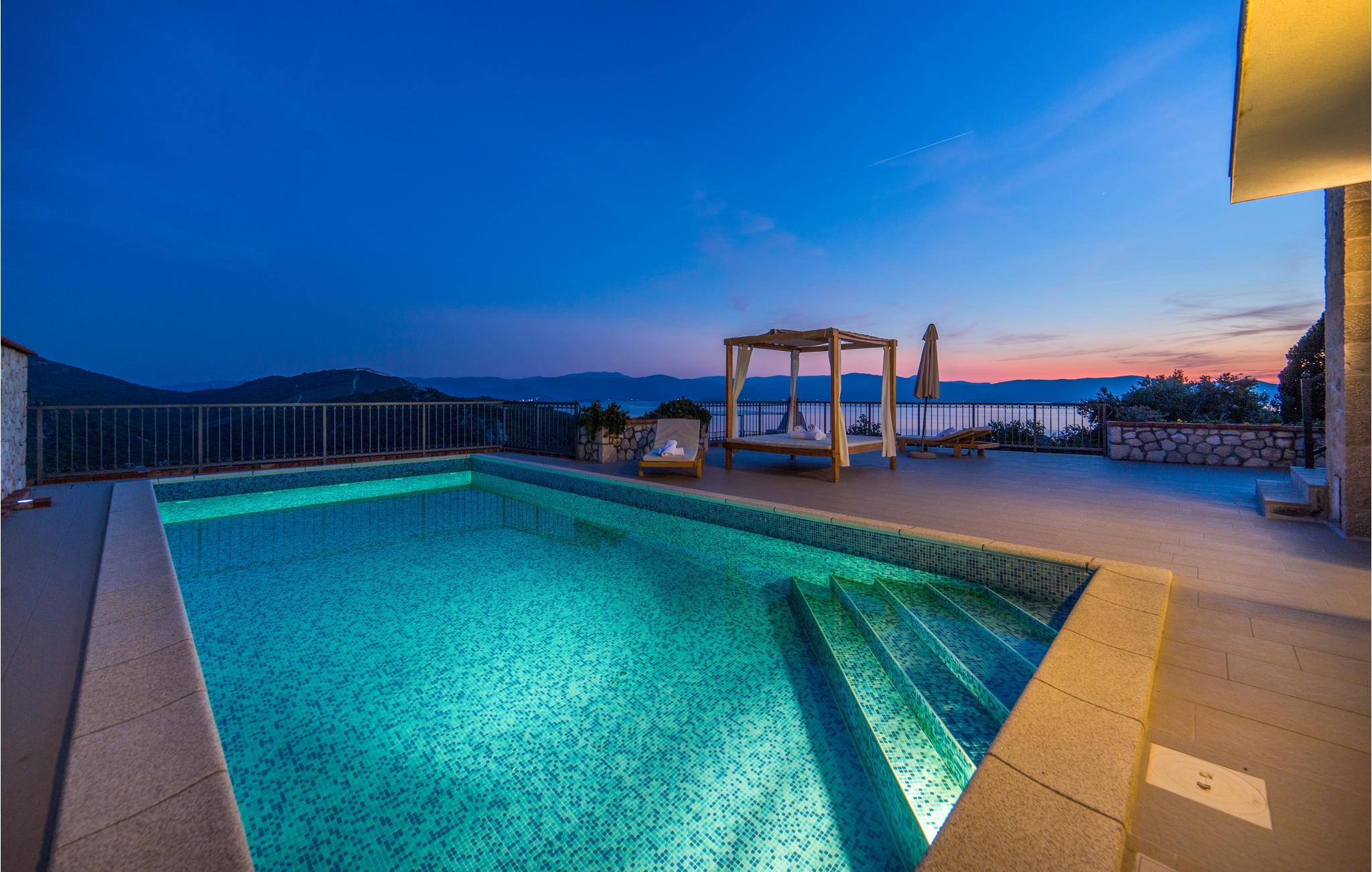 Denne moderne villa, der er bygget i den typisk dalmatiske stil, ligger i den lille by Kremena og er det rigtige valg for en afslappet ferie. Huset strækker sig over to etager, der er forbundet både med en indendørs vindeltrappe og en udendørs trappe. I stueetagen ligger opholdsområdet med køkken og spisestue samt et toilet og et badeværelse med douche. På den øverste etage ligger der tre soveværelser og et badeværelse. Den skønne, store terrasse med pool og den flotte panoramaudsigt over havet gør ferien perfekt. Ved siden af huset er der også en legeplads og en overdækket terrasse med grill. Kisel- og klippestranden når I på 5 minutter i bil. Det kan anbefales at tage dagsture til Dubrovnik og Korcula, der har et rigt kulturliv.