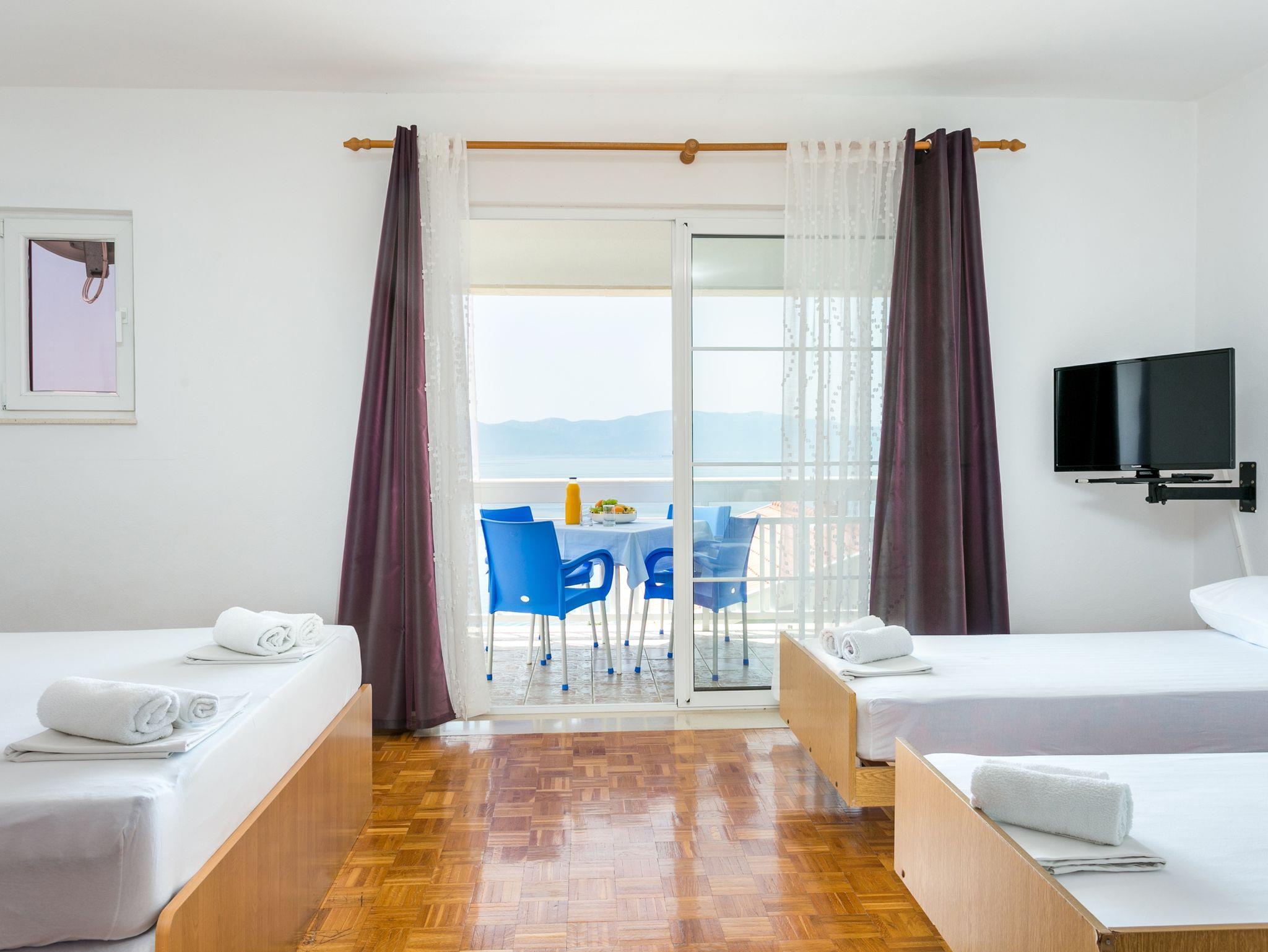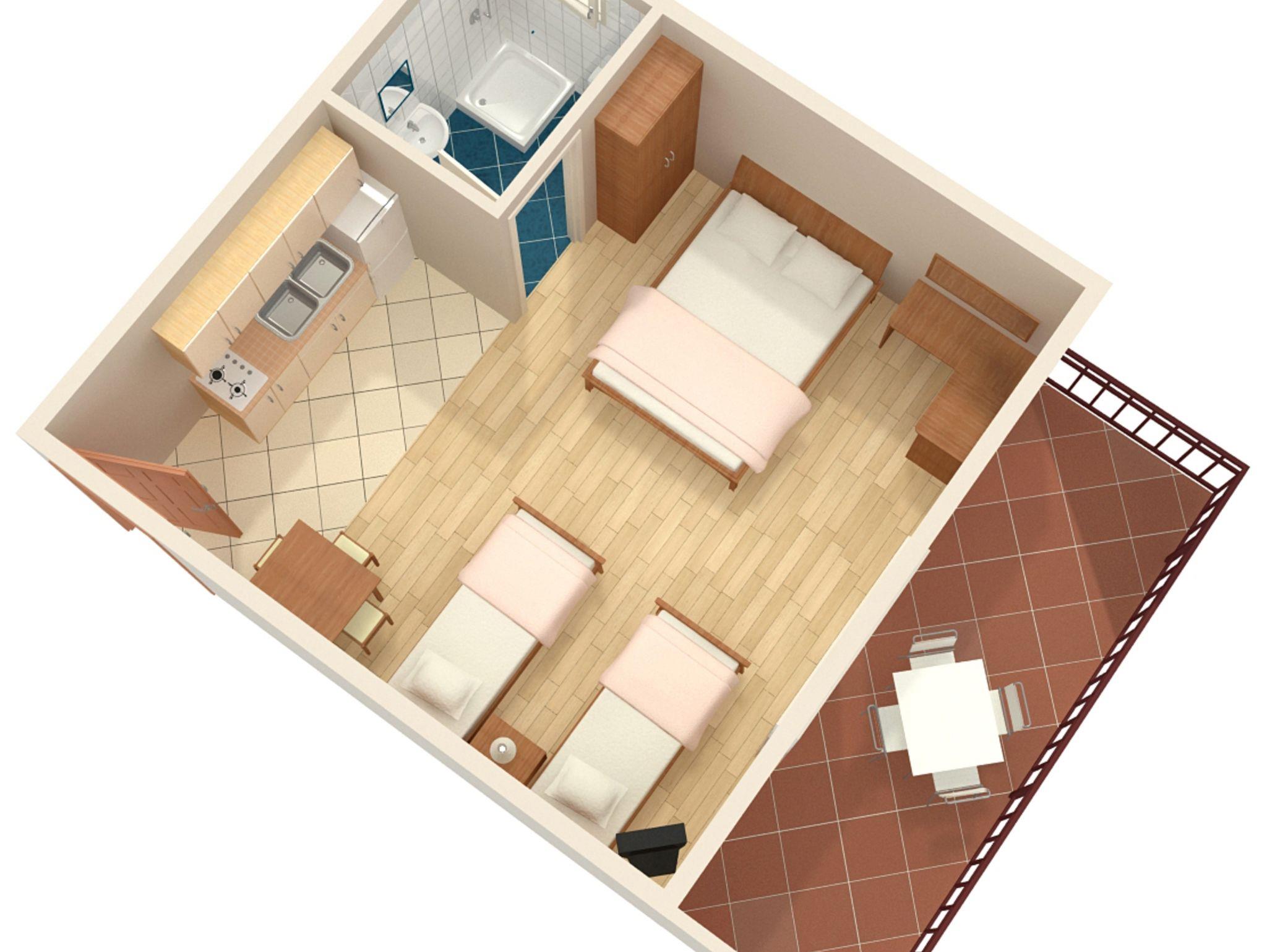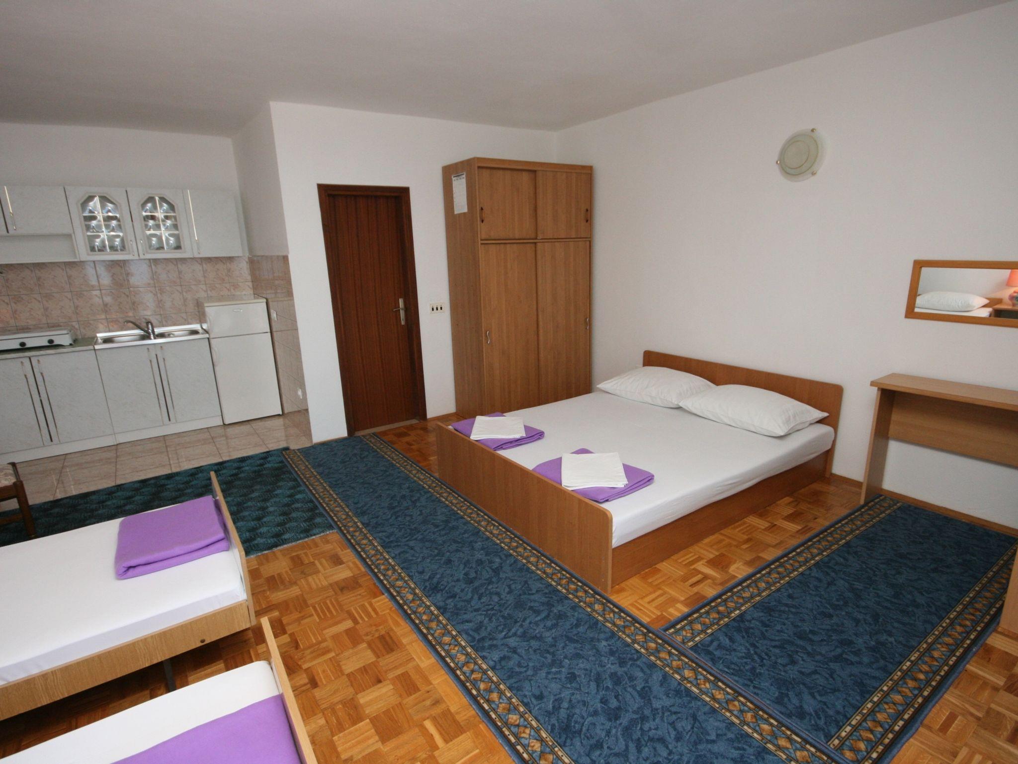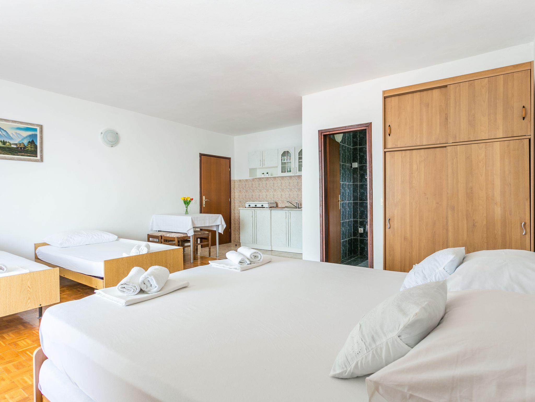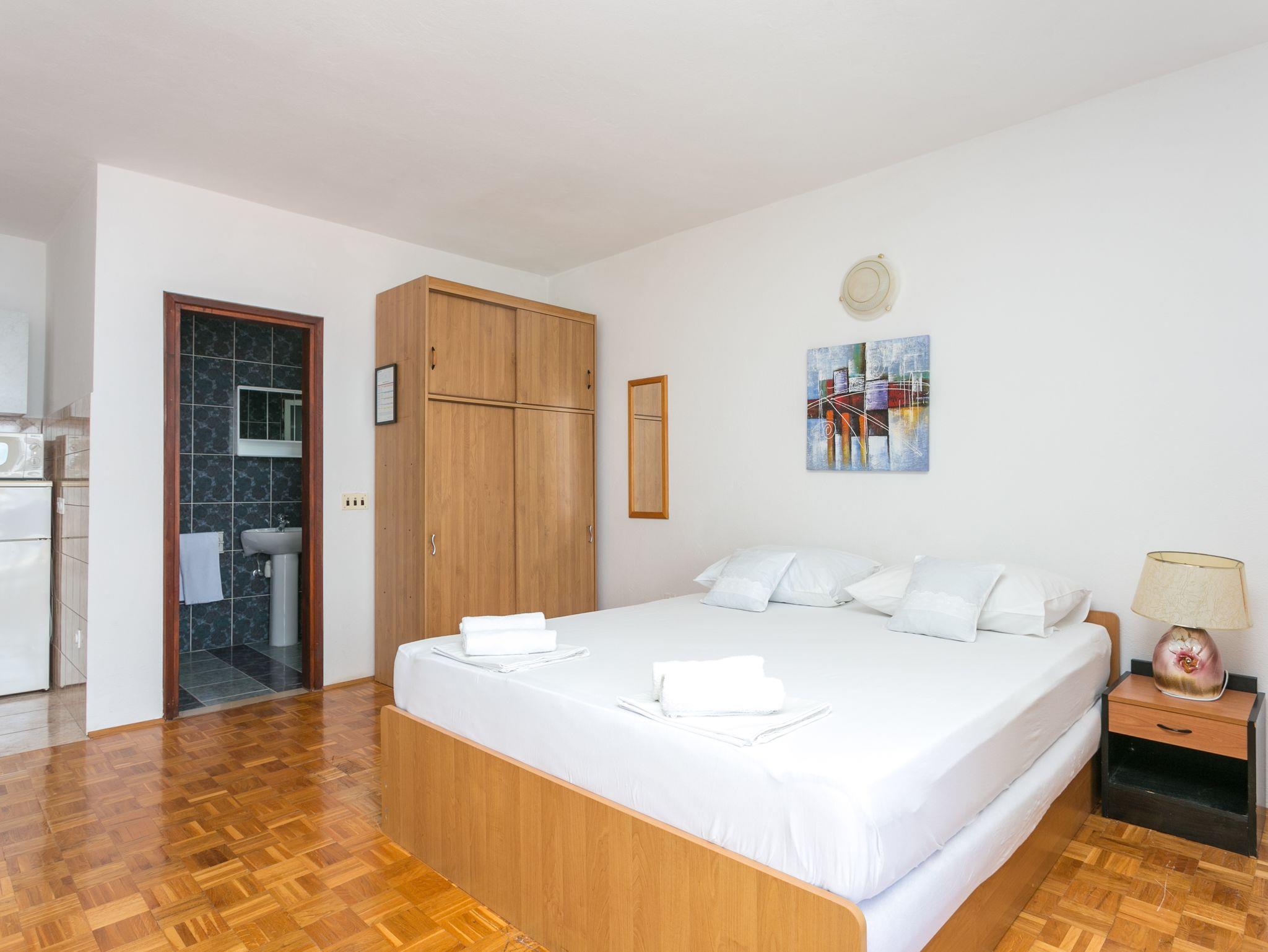 Studio bietet Platz für 4 Gäste. Die Betten sind in Schlafzimmern, die es 1 gibt, innerhalb einer Gesamtfläche von 33m2, angeordnet. Die Gäste haben eine eigene Terrasse zur Verfügung, auf der sie in warmen Sommernächten genießen können. Das Studio-Apartment bietet Meerblick. IM PREIS INBEGRIFFEN: Kurtaxe, Endreinigung, Parkplatz, Internet, Kinderbett, Bügeleisen, Bügelbrett, Föhn, Sonnenschirm, Liegestühle. VERBINDLICHE ZUSÄTZLICHE KOSTEN: Aufzahlung für Kurzaufenthalte (prozentualer Zuschlag pro Nächtigungsanzahl: 30% - 1, 20% - 2, 10% - 3). UNVERBINDLICHE ZUSÄTZLICHE KOSTEN: Klimatisierung (8,00 € pro Nacht). Die Verfügbarkeit zusätzlicher Dienstleistungen in Ihrem reservierten Termin und die Preise derselben (falls nicht aufgeführt) müssen im Voraus überprüft werden. Zusätzliche Dienstleistungen die in der Zahlungsaufforderung nicht aufgeführt sind werden direkt beim Vermieter bezahlt, angenommen der Gast nutzt auch diese. Ermäßigung auf den Grundpreis: Gratistag 14=13 (bei einem Aufenthalt von 14 Tagen oder mehr erhalten Sie einen Gratistag für den Aufenthalt bis 31.12.26).