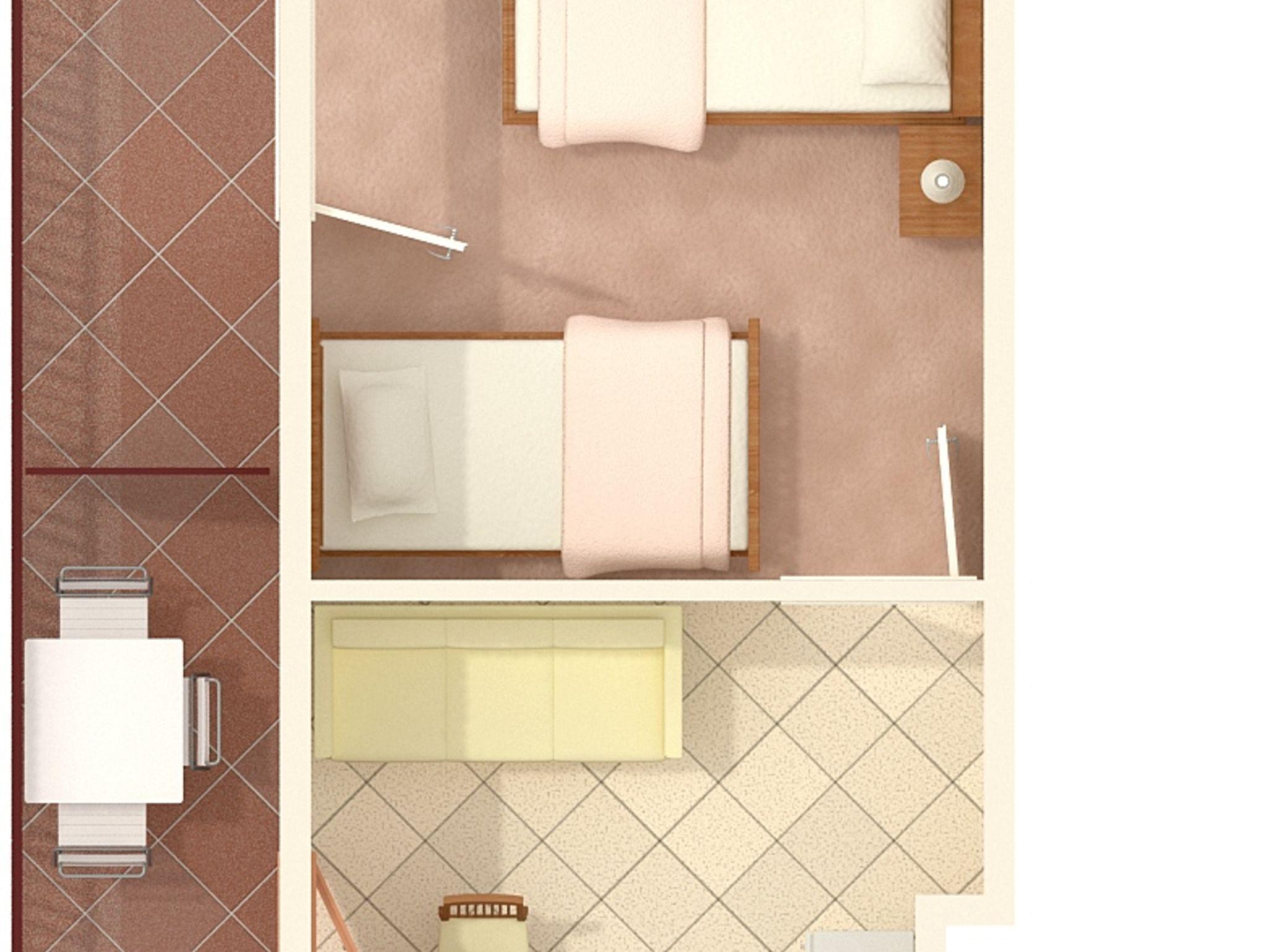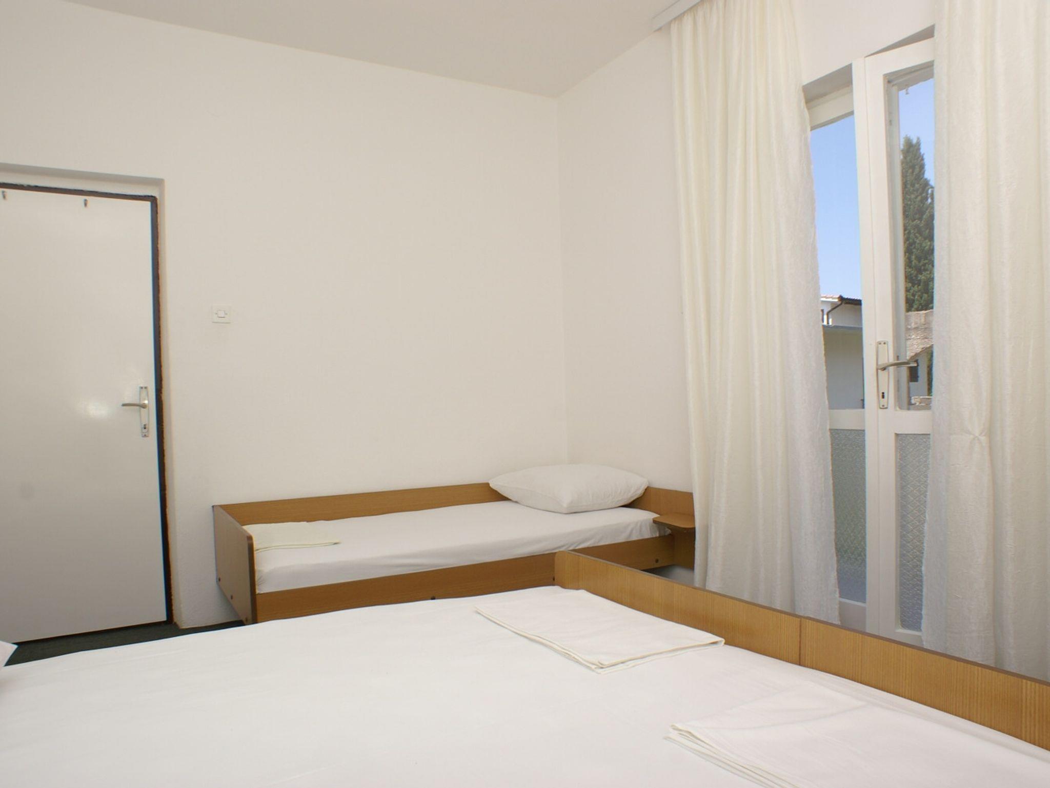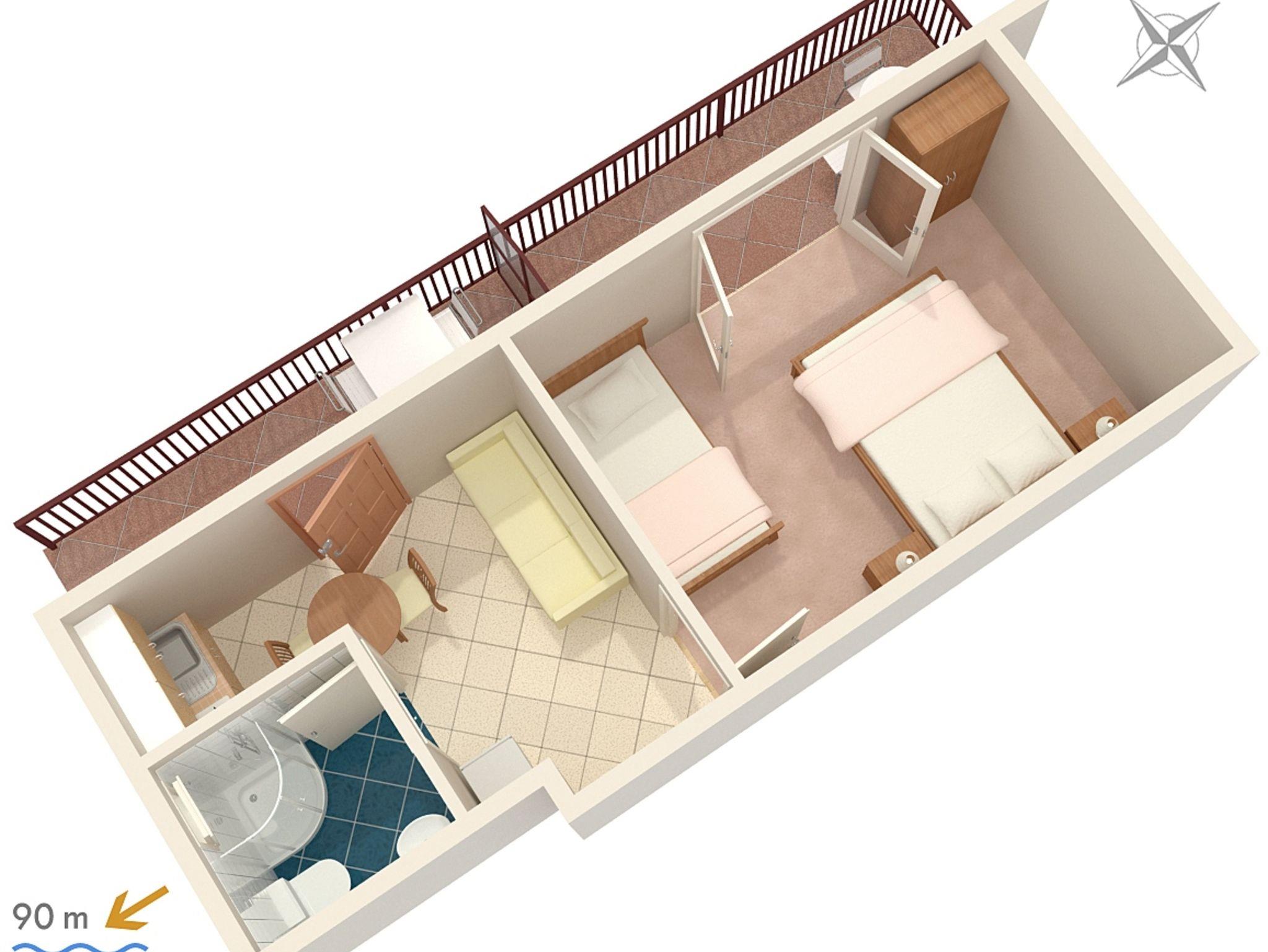 Ferienwohnung bietet Platz für 4 Gäste. Die Betten sind in Schlafzimmern, die es 1 gibt, und in Esszimmer, innerhalb einer Gesamtfläche von 23m2, angeordnet. Die Gäste haben einen eigenen Balkon zur Verfügung, auf der sie in warmen Sommernächten genießen können. Es ist erlaubt, Speisen auf dem Gemeinschafts-Grill vorzubereiten. IM PREIS INBEGRIFFEN: Kurtaxe, Endreinigung, Parkplatz, Internet, Bügeleisen, Bügelbrett, Föhn. VERBINDLICHE ZUSÄTZLICHE KOSTEN: Aufzahlung für Kurzaufenthalte (prozentualer Zuschlag pro Nächtigungsanzahl: 30% - 1, 20% - 2, 10% - 3). UNVERBINDLICHE ZUSÄTZLICHE KOSTEN: Klimatisierung (5,00 € pro Nacht), Wäschewaschen (8,00 € Waschen). Die Verfügbarkeit zusätzlicher Dienstleistungen in Ihrem reservierten Termin und die Preise derselben (falls nicht aufgeführt) müssen im Voraus überprüft werden. Zusätzliche Dienstleistungen die in der Zahlungsaufforderung nicht aufgeführt sind werden direkt beim Vermieter bezahlt, angenommen der Gast nutzt auch diese.