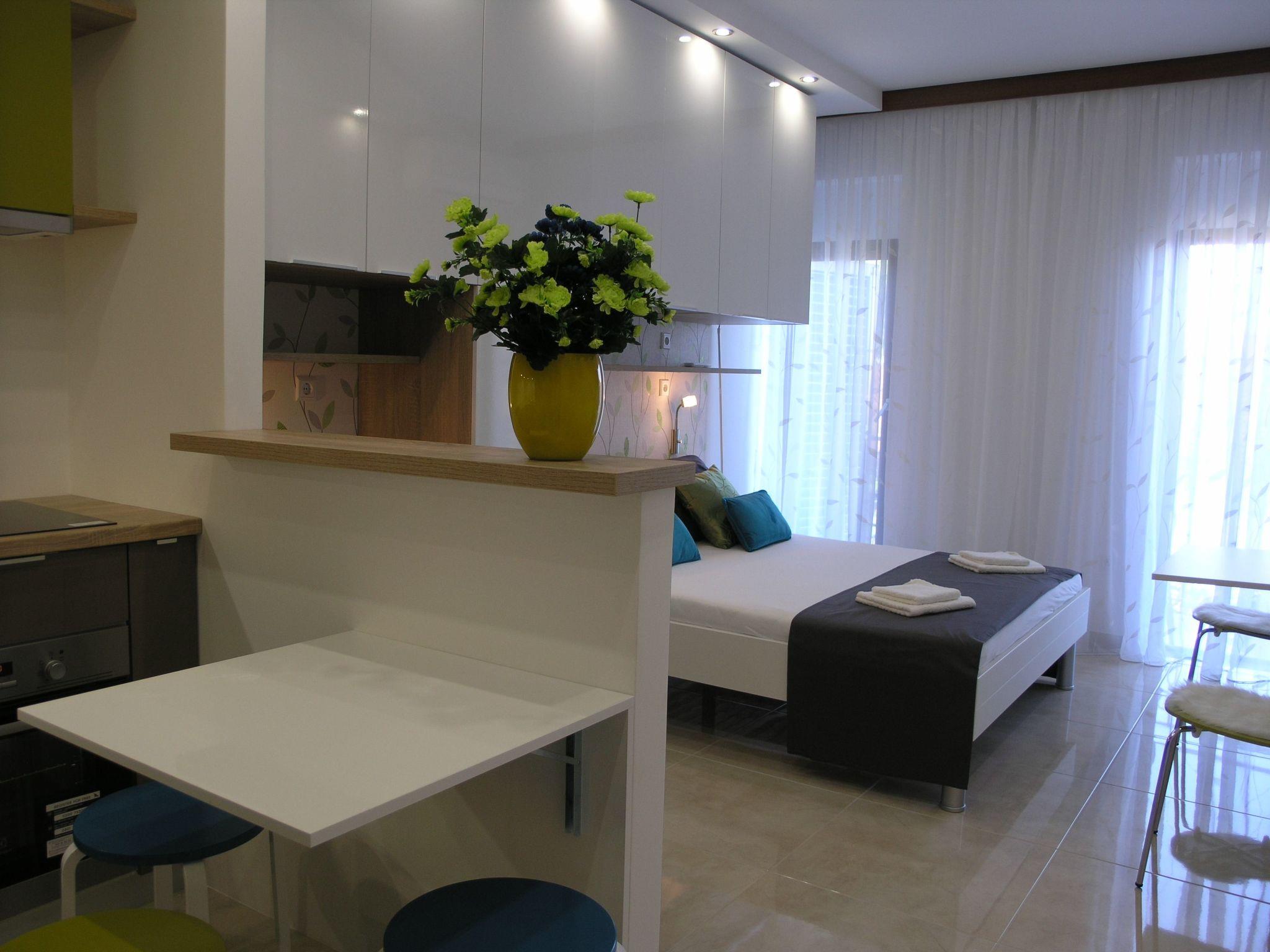 Brand new renovated studio apartment for 2+1. New kitchen has a big fridge with three deep freeze drawers, oven, induction cooker with 4 rings and a lot of space for passionate cooks. You have toaster, coffe and tea pot and most kitchen accessories for cooking. You have air-condition, flat TV with satelite programs as wel as local programs. In the bathroom you have a hair dryer. From the balcony is a beautiful view to sea, mountain Biokovo and Podgora.