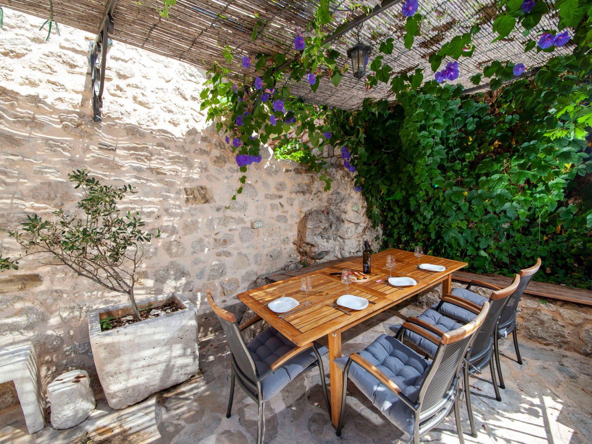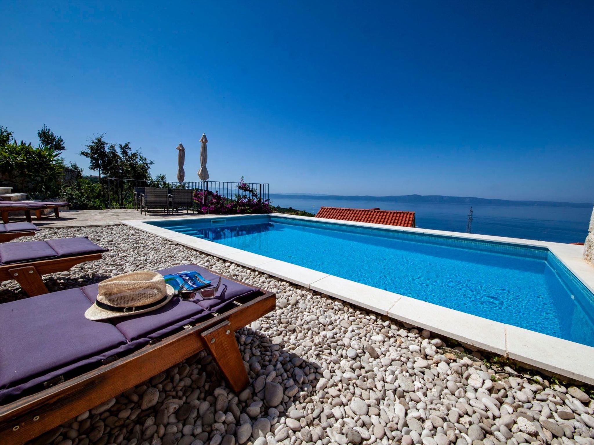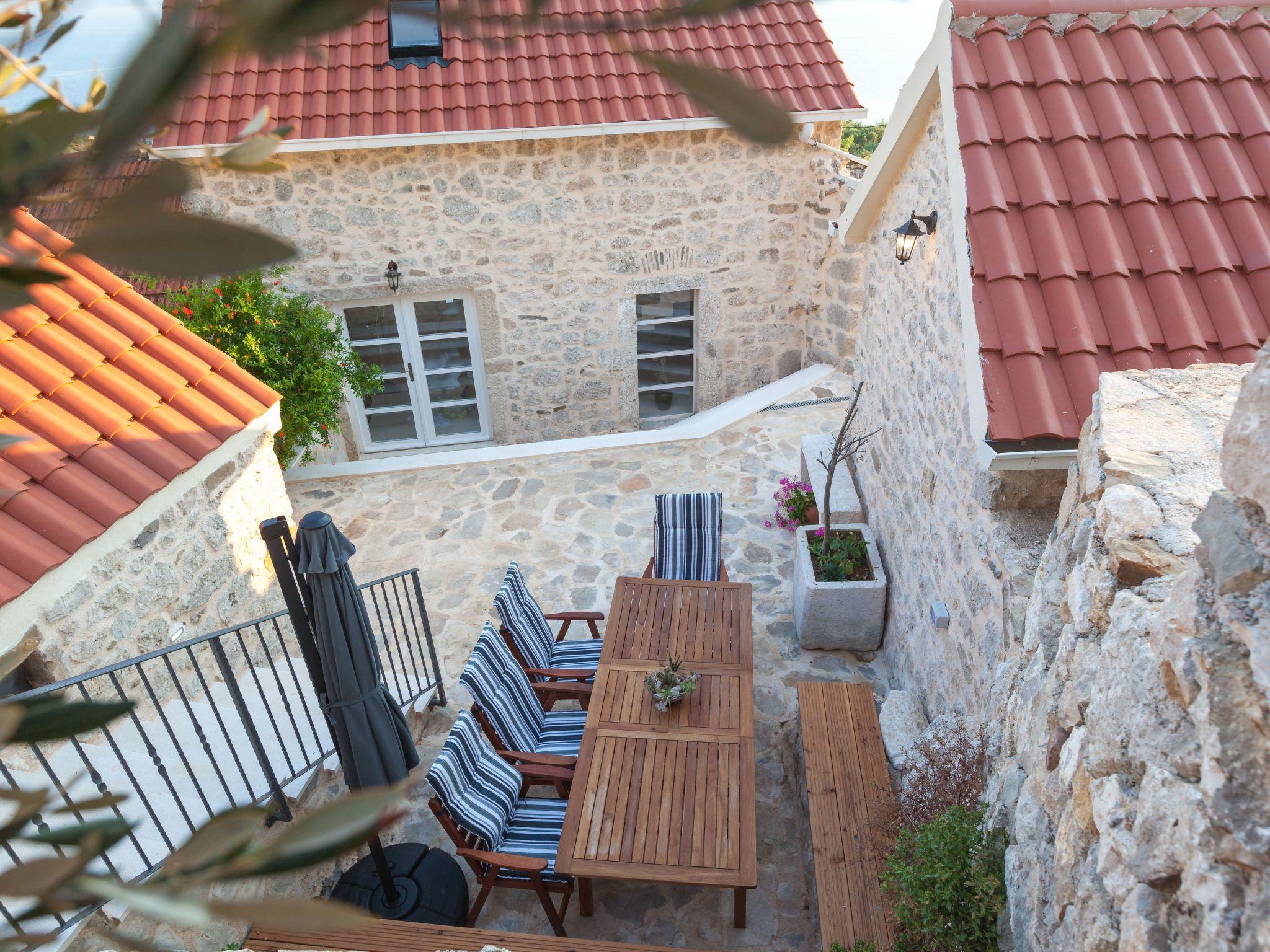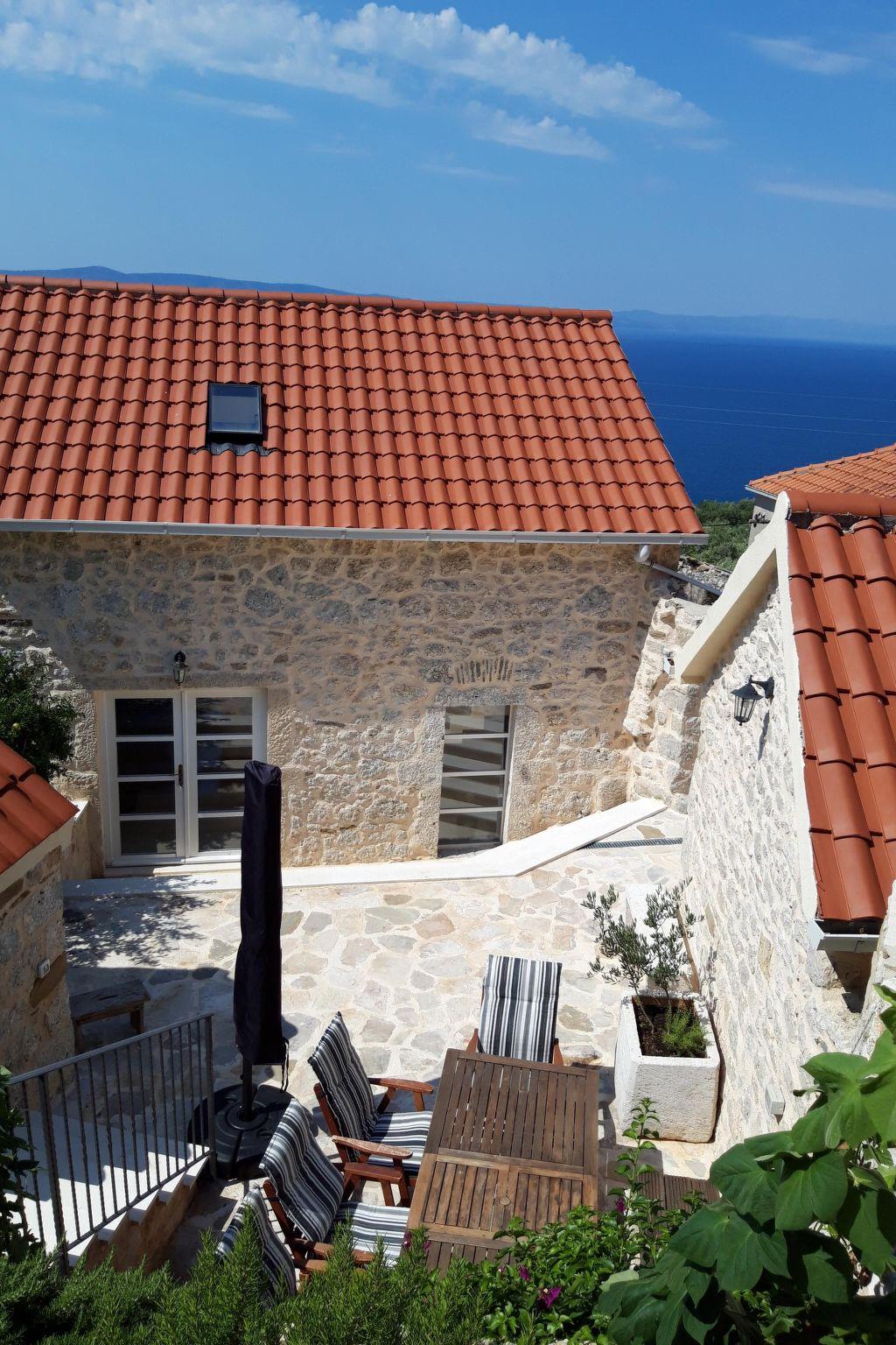 In addition to its location, this beautiful villa offers its guests a holiday in the unforgettable ambience of an old Dalmatian farmhouse, which was renovated in 2016 in a very modern way, respecting the tradition of old Dalmatian architecture. The farm consists of three houses, a courtyard with a table and pool area. In the three-storey main house there are two very modernly equipped bedrooms, each with its own bathroom and toilet, as well as a very modern kitchen, dining area and living room. The rooms have traditional stone walls that create a cosy atmosphere where you can enjoy romantic sunsets with a glass of wine. On the ground floor there is one bedroom with a large double bed (180x200), which also has its own garden with a beautiful view of the sea and the islands of Hvar and Brac. The second bedroom is located in the attic. On the first floor there is a living room with sofa, TV, very modern equipped kitchen and dining area. In the second house there is another bedroom with a large double bed (180x200) and its own bathroom and toilet. In the third traditionally furnished house there is a fireplace with a table and chairs