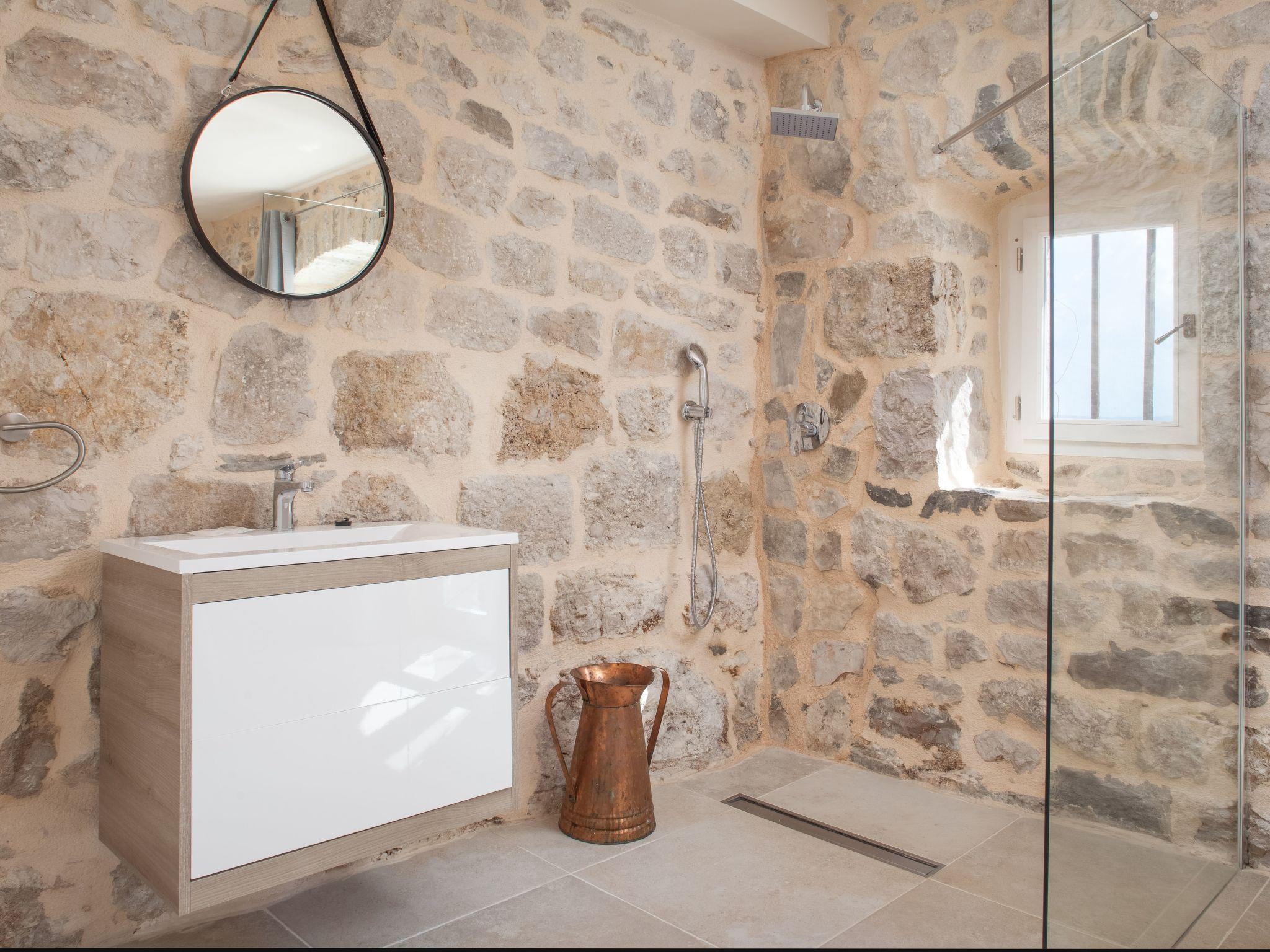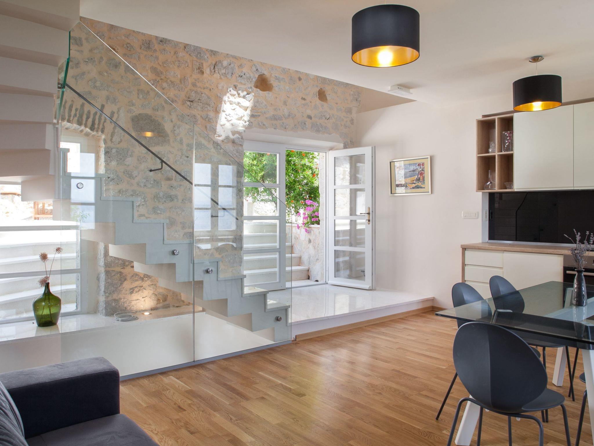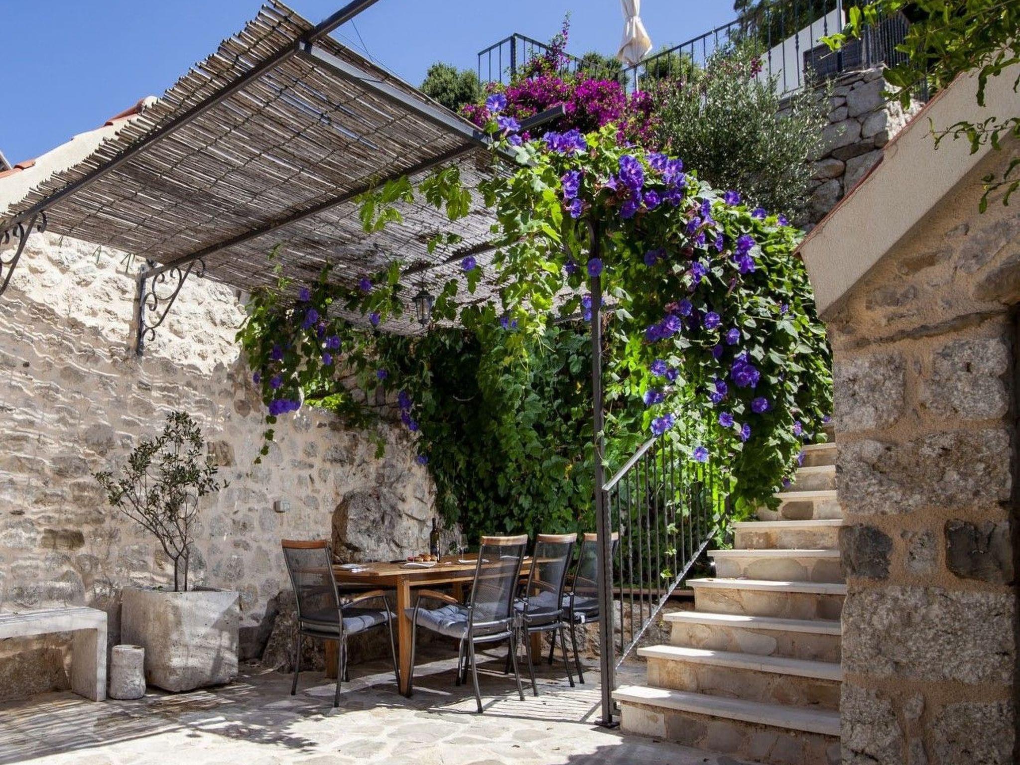 In addition to its location, this beautiful villa offers its guests a holiday in the unforgettable ambience of an old Dalmatian farmhouse, which was renovated in 2016 in a very modern way, respecting the tradition of old Dalmatian architecture. The farm consists of three houses, a courtyard with a table and pool area. In the three-storey main house there are two very modernly equipped bedrooms, each with its own bathroom and toilet, as well as a very modern kitchen, dining area and living room. The rooms have traditional stone walls that create a cosy atmosphere where you can enjoy romantic sunsets with a glass of wine. On the ground floor there is one bedroom with a large double bed (180x200), which also has its own garden with a beautiful view of the sea and the islands of Hvar and Brac. The second bedroom is located in the attic. On the first floor there is a living room with sofa, TV, very modern equipped kitchen and dining area. In the second house there is another bedroom with a large double bed (180x200) and its own bathroom and toilet. In the third traditionally furnished house there is a fireplace with a table and chairs