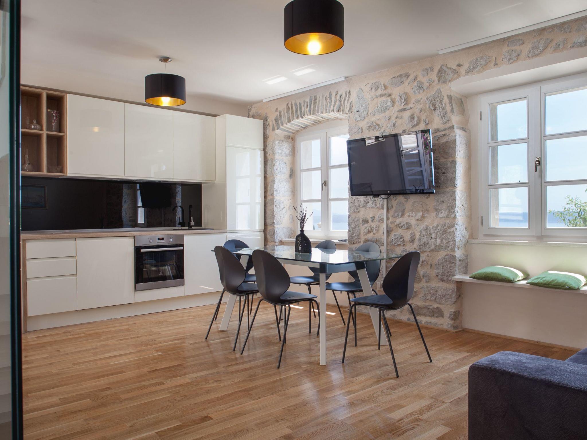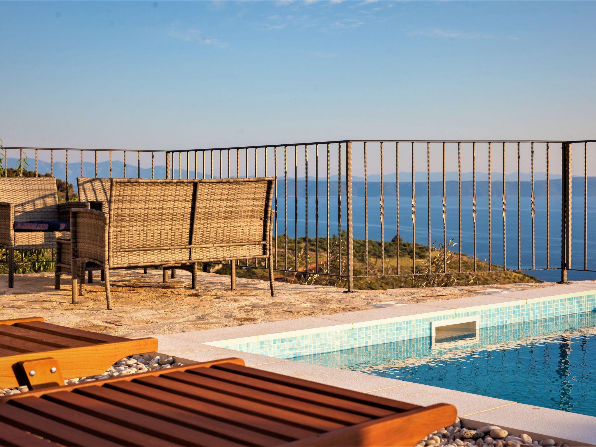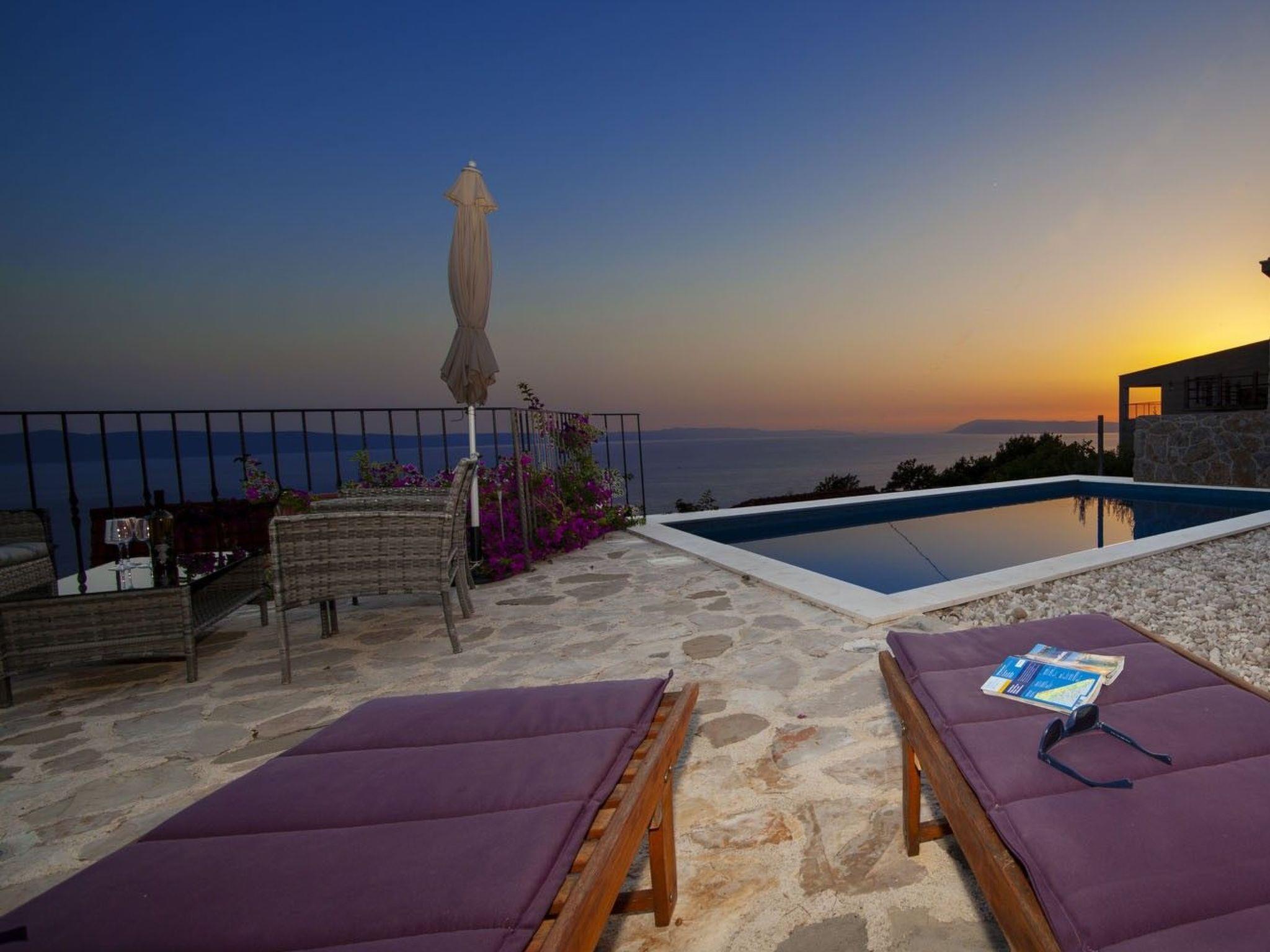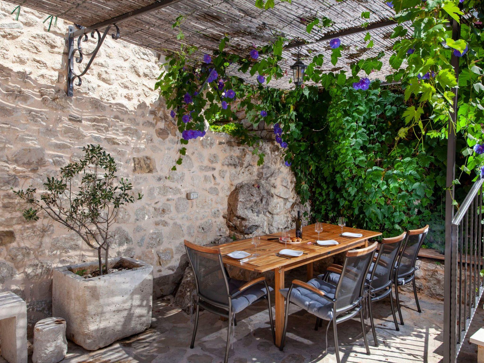 In addition to its location, this beautiful villa offers its guests a holiday in the unforgettable ambience of an old Dalmatian farmhouse, which was renovated in 2016 in a very modern way, respecting the tradition of old Dalmatian architecture. The farm consists of three houses, a courtyard with a table and pool area. In the three-storey main house there are two very modernly equipped bedrooms, each with its own bathroom and toilet, as well as a very modern kitchen, dining area and living room. The rooms have traditional stone walls that create a cosy atmosphere where you can enjoy romantic sunsets with a glass of wine. On the ground floor there is one bedroom with a large double bed (180x200), which also has its own garden with a beautiful view of the sea and the islands of Hvar and Brac. The second bedroom is located in the attic. On the first floor there is a living room with sofa, TV, very modern equipped kitchen and dining area. In the second house there is another bedroom with a large double bed (180x200) and its own bathroom and toilet. In the third traditionally furnished house there is a fireplace with a table and chairs