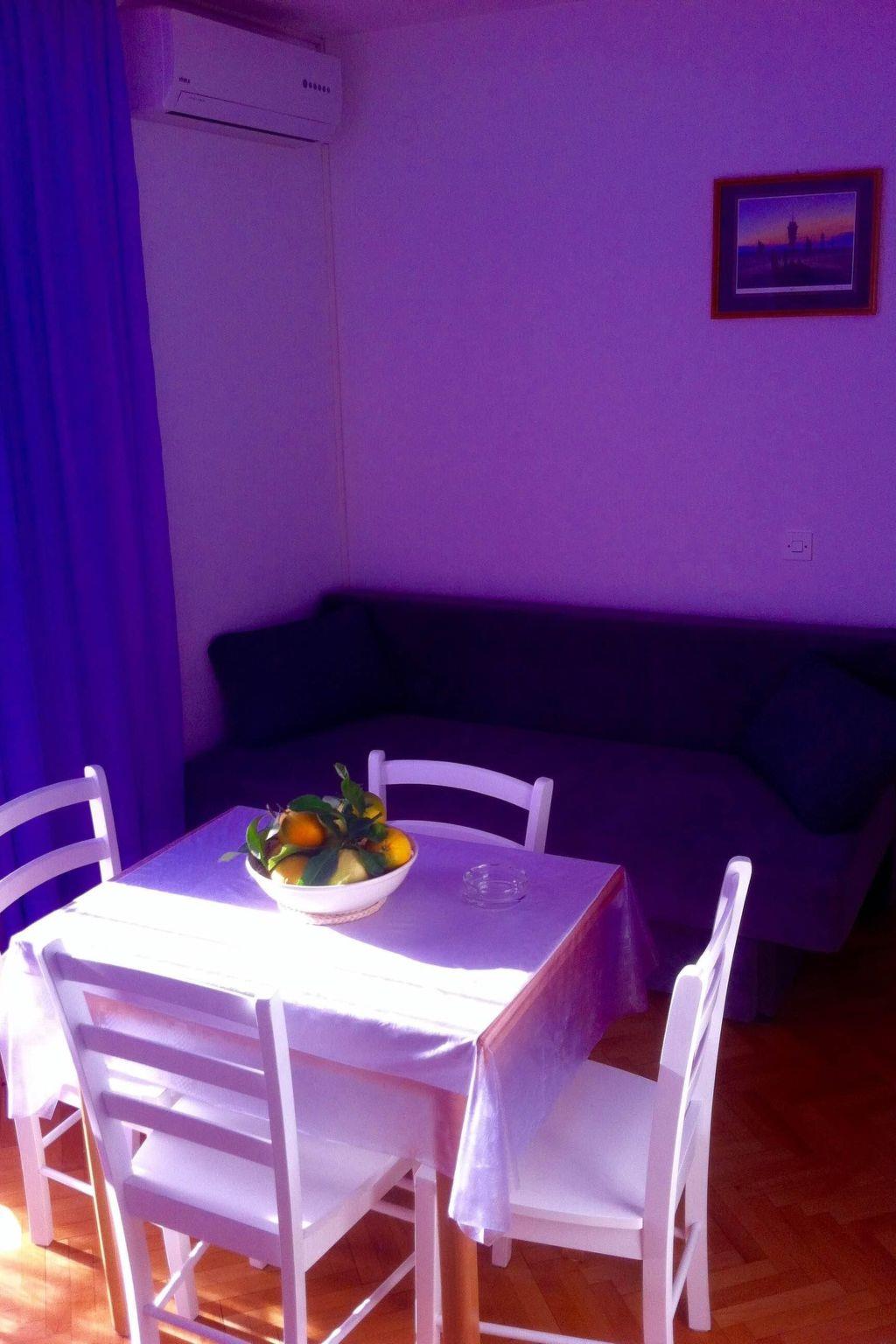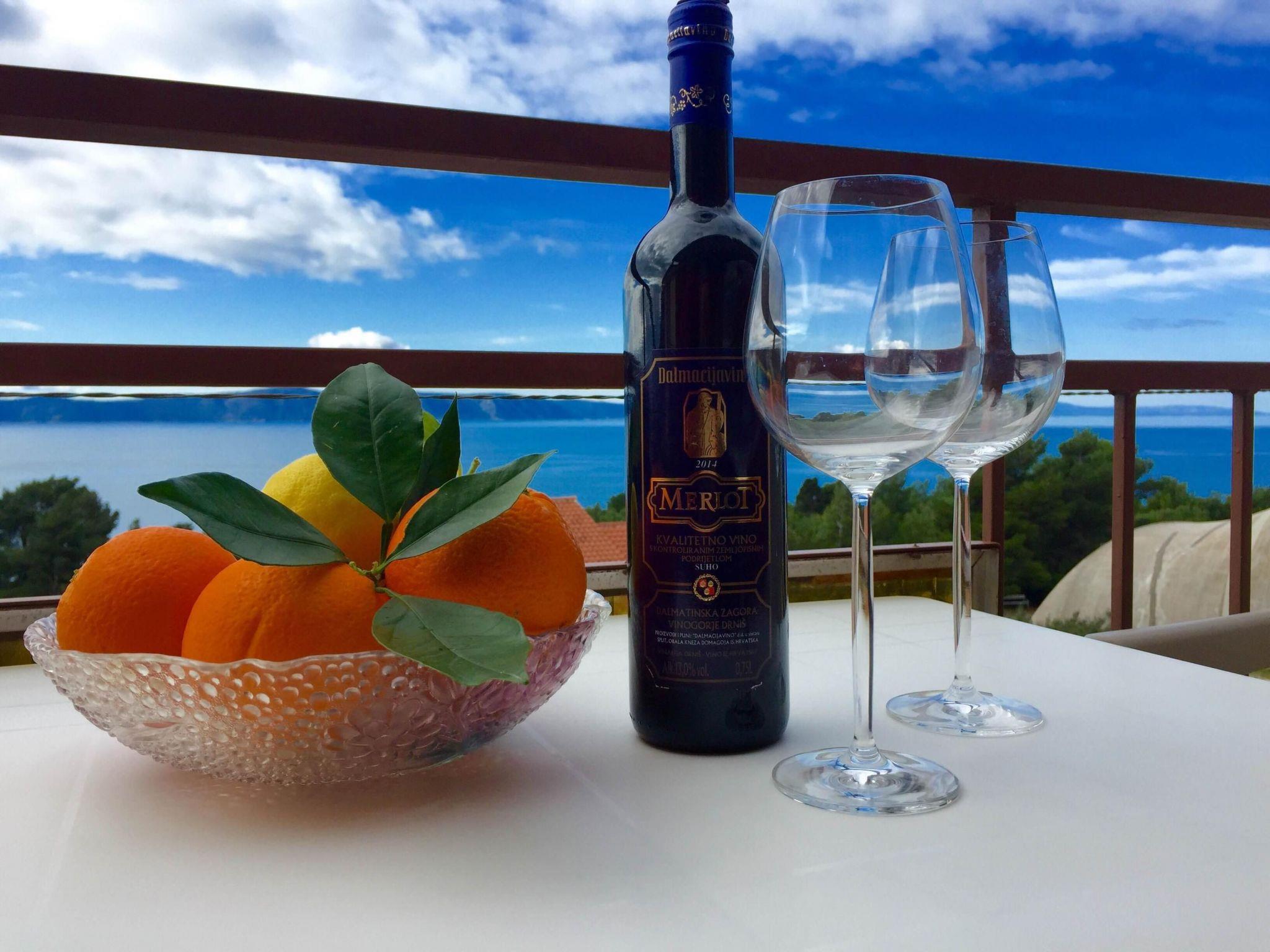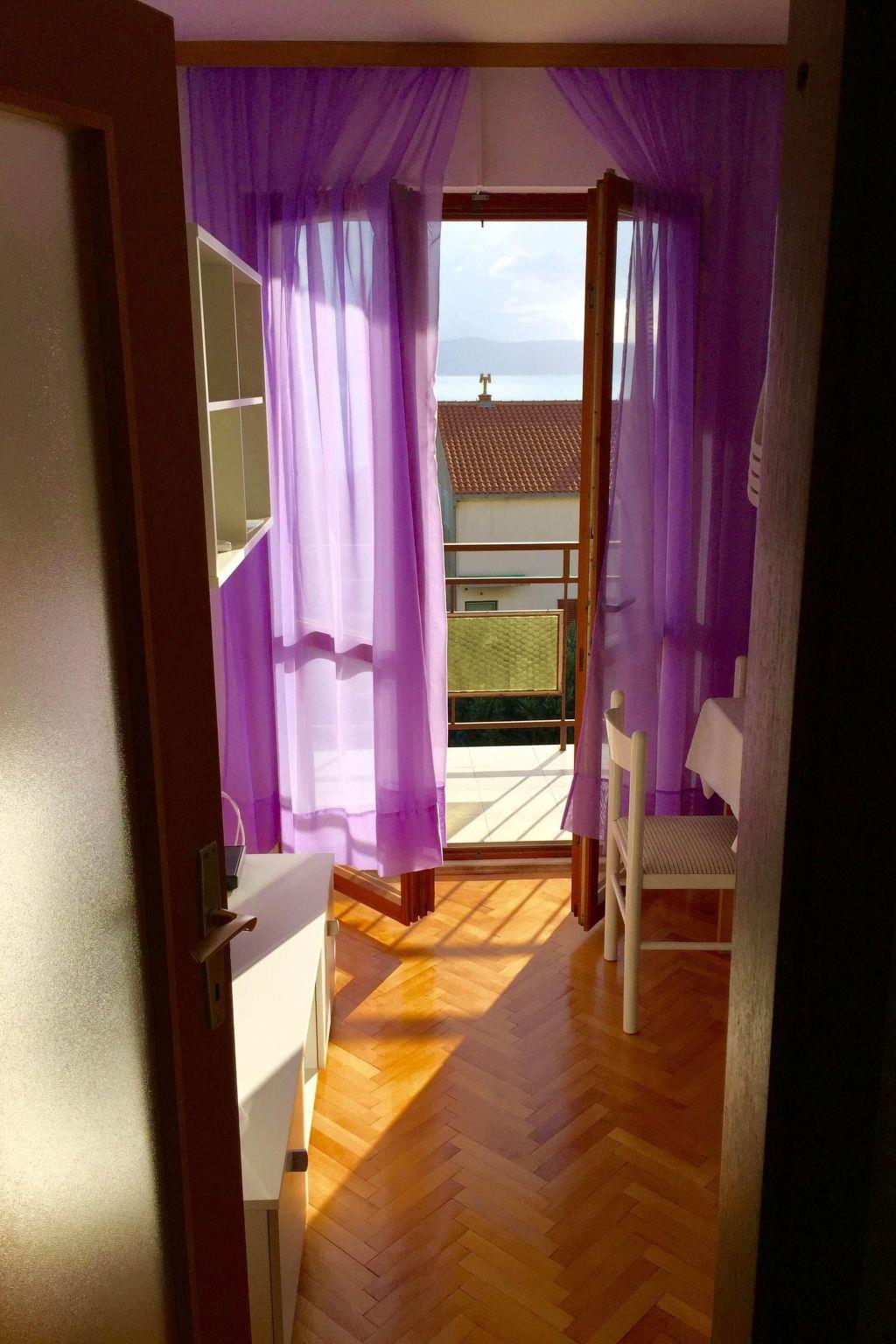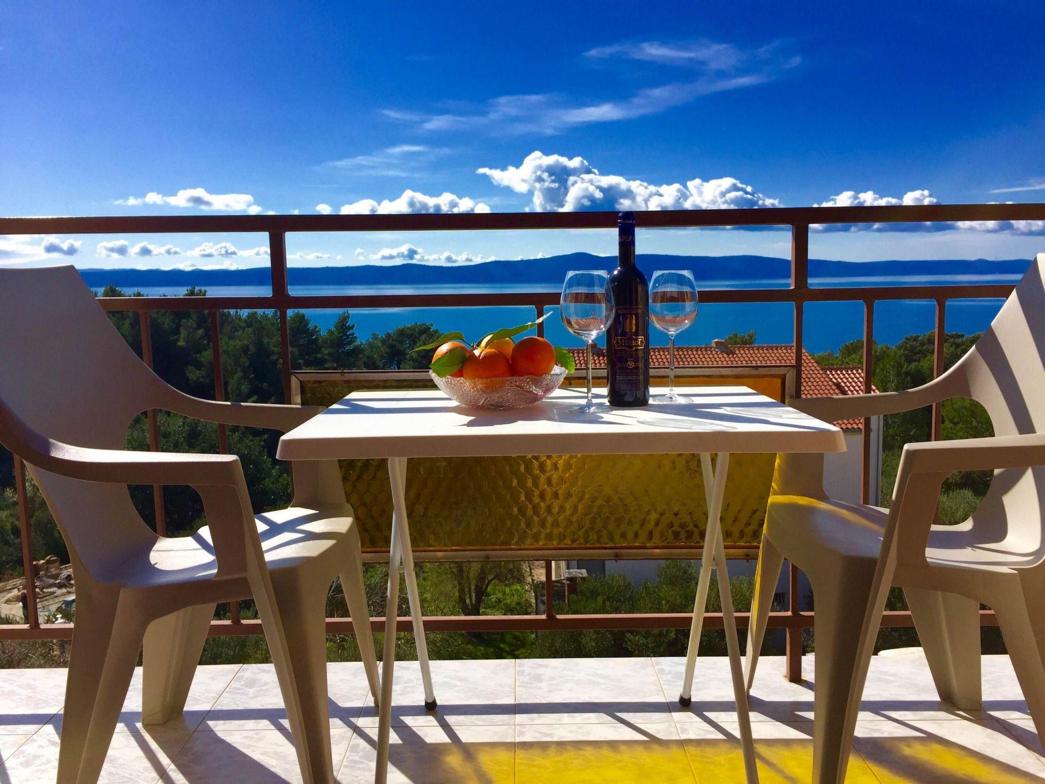 The living room opens onto the private sunny balcony with a table and chairs. You can end a long day on the beach here with a glass of Croatian wine and a panoramic view over the bay. If you arrive by car, you can use the secure parking space right in front of the house.