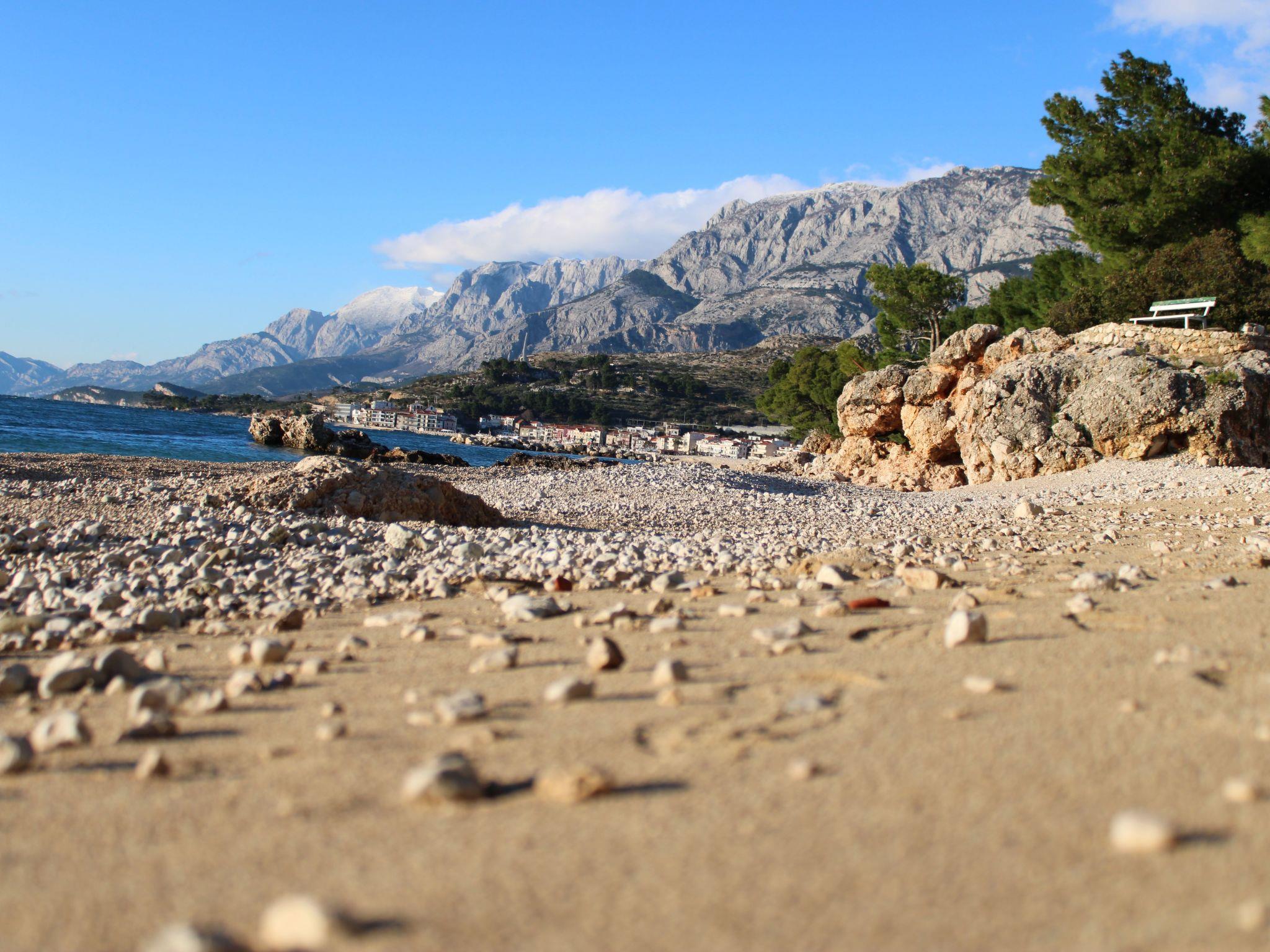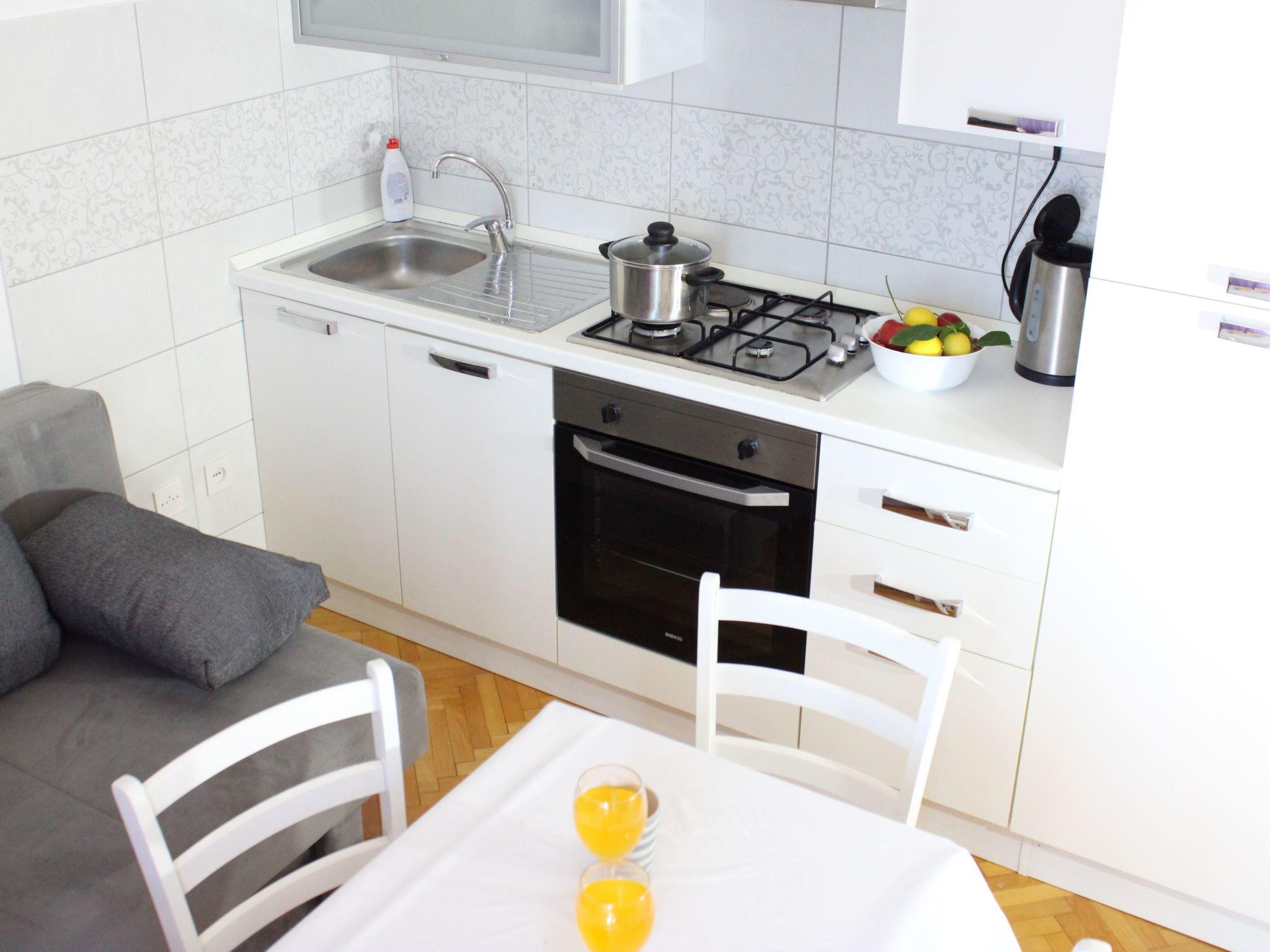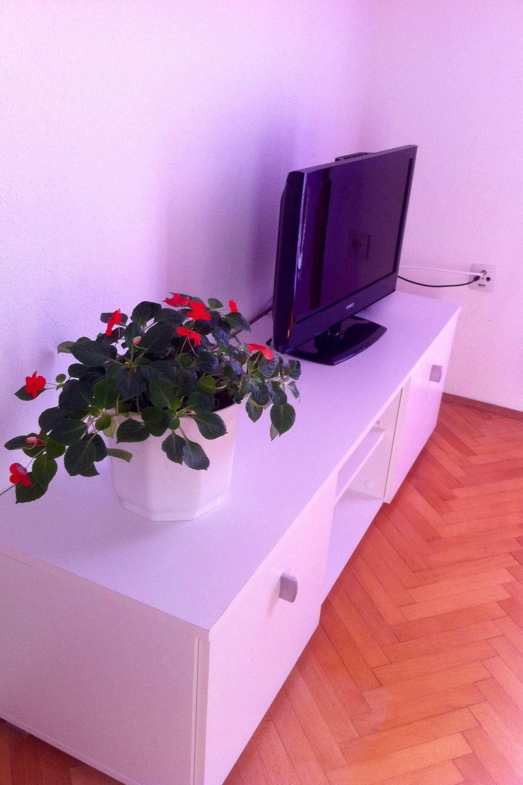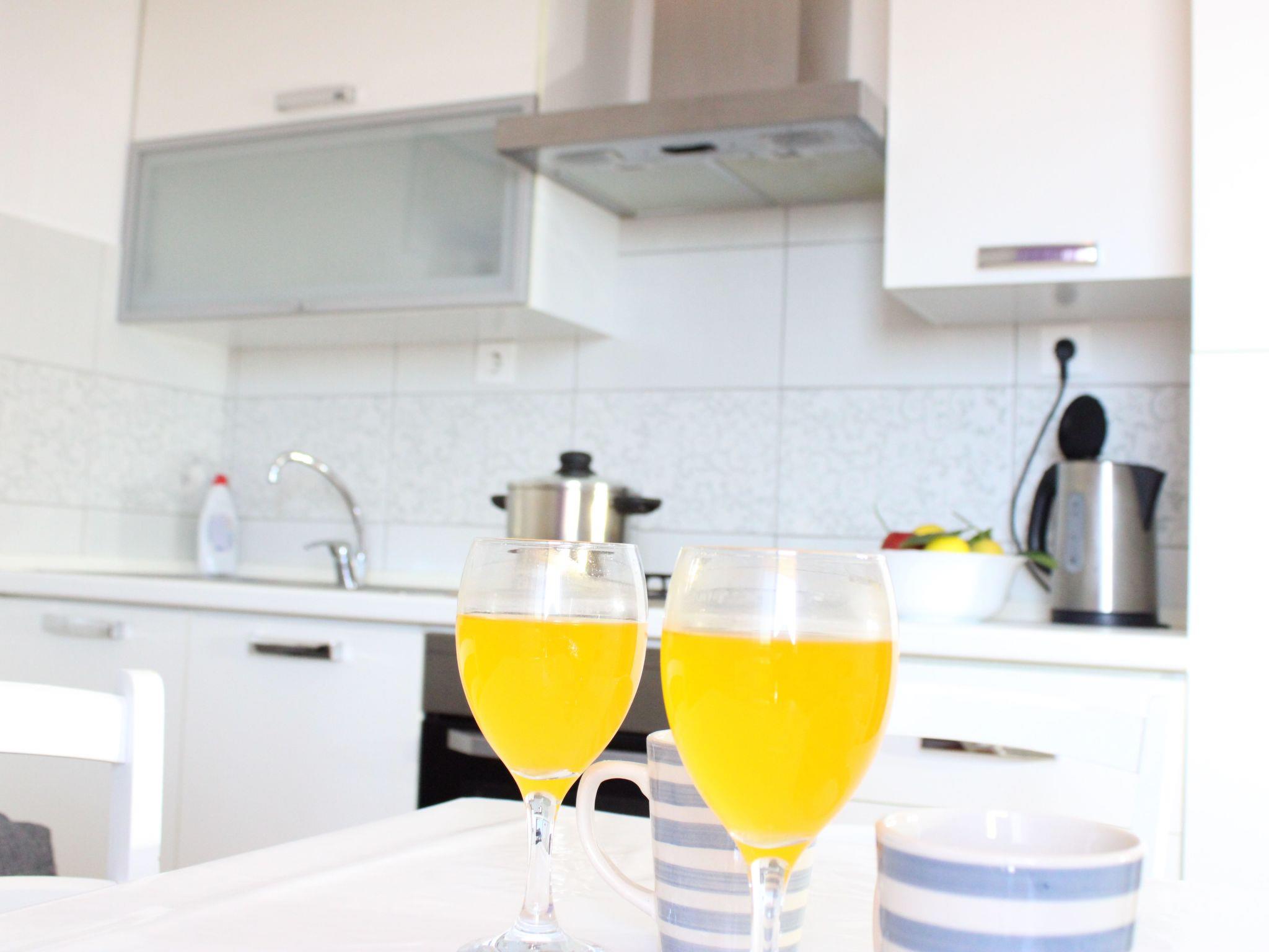 The living room opens onto the private sunny balcony with a table and chairs. You can end a long day on the beach here with a glass of Croatian wine and a panoramic view over the bay. If you arrive by car, you can use the secure parking space right in front of the house.