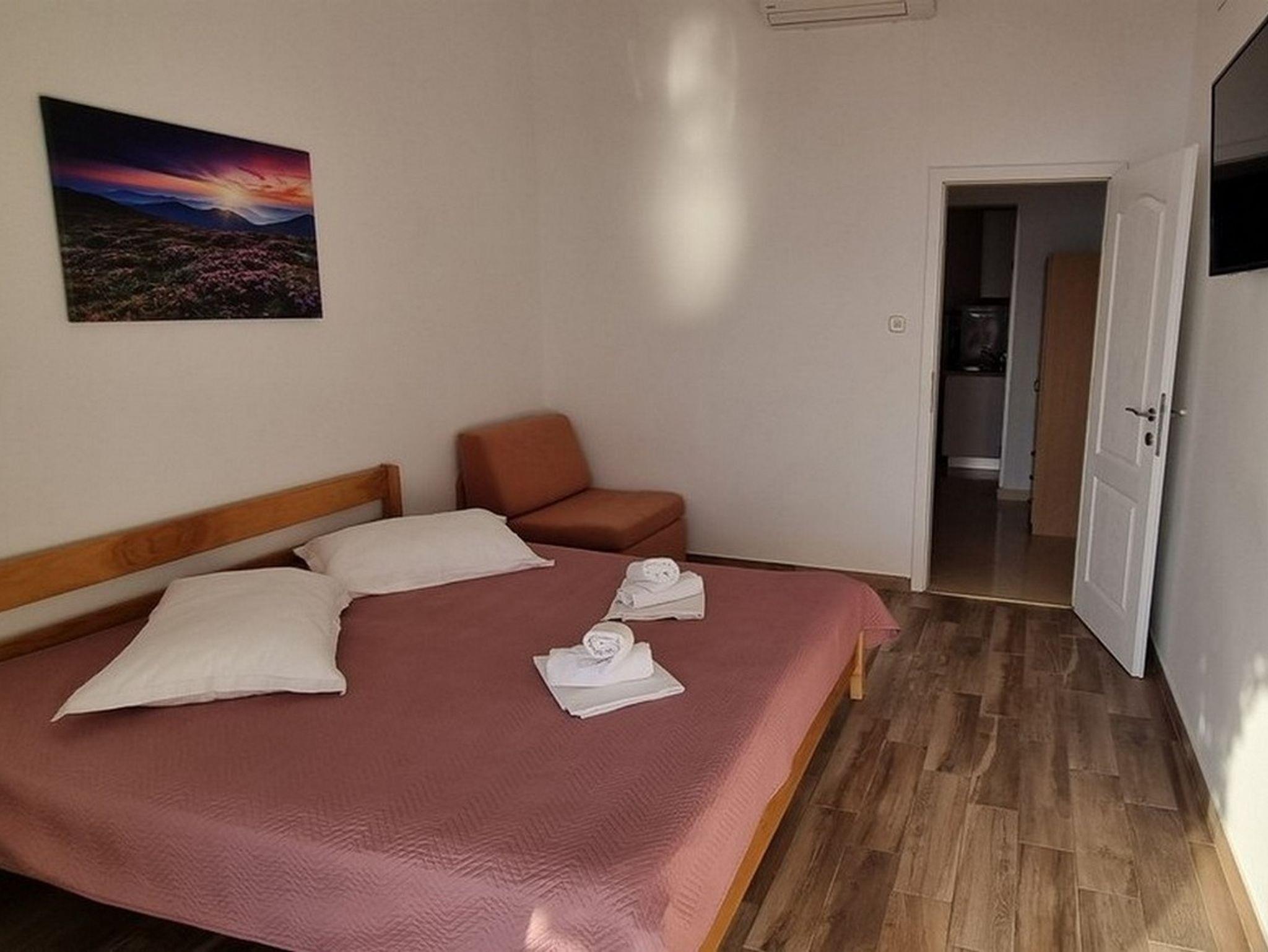Ferienwohnung bietet Platz für 3 Gäste. Die Betten sind in Schlafzimmern, die es 1 gibt, innerhalb einer Gesamtfläche von 32m2, angeordnet. Die Gäste haben einen eigenen Balkon zur Verfügung, auf der sie in warmen Sommernächten genießen können. Das Apartment bietet Meerblick. Es ist erlaubt, Speisen auf dem Gemeinschafts-Grill vorzubereiten. In der Unterkunftseinheit besteht die Möglichkeit des Mitbringens von Haustieren gegen Aufpreis. IM PREIS INBEGRIFFEN: Kurtaxe, Endreinigung, Klimatisierung, Parkplatz, Internet, Kinderbett, Föhn. VERBINDLICHE ZUSÄTZLICHE KOSTEN: Aufzahlung für Kurzaufenthalte (prozentualer Zuschlag pro Nächtigungsanzahl: 30% - 1, 20% - 2, 10% - 3). UNVERBINDLICHE ZUSÄTZLICHE KOSTEN: Wäschewaschen (10,00 € Waschen), Bootsanlegeplatz (50,00 € pro Nacht), Haustiere (8,00 € pro Nacht), Fahrrad (20,00 € täglich (pro Stück)). Die Verfügbarkeit zusätzlicher Dienstleistungen in Ihrem reservierten Termin und die Preise derselben (falls nicht aufgeführt) müssen im Voraus überprüft werden. Zusätzliche Dienstleistungen die in der Zahlungsaufforderung nicht aufgeführt sind werden direkt beim Vermieter bezahlt, angenommen der Gast nutzt auch diese.