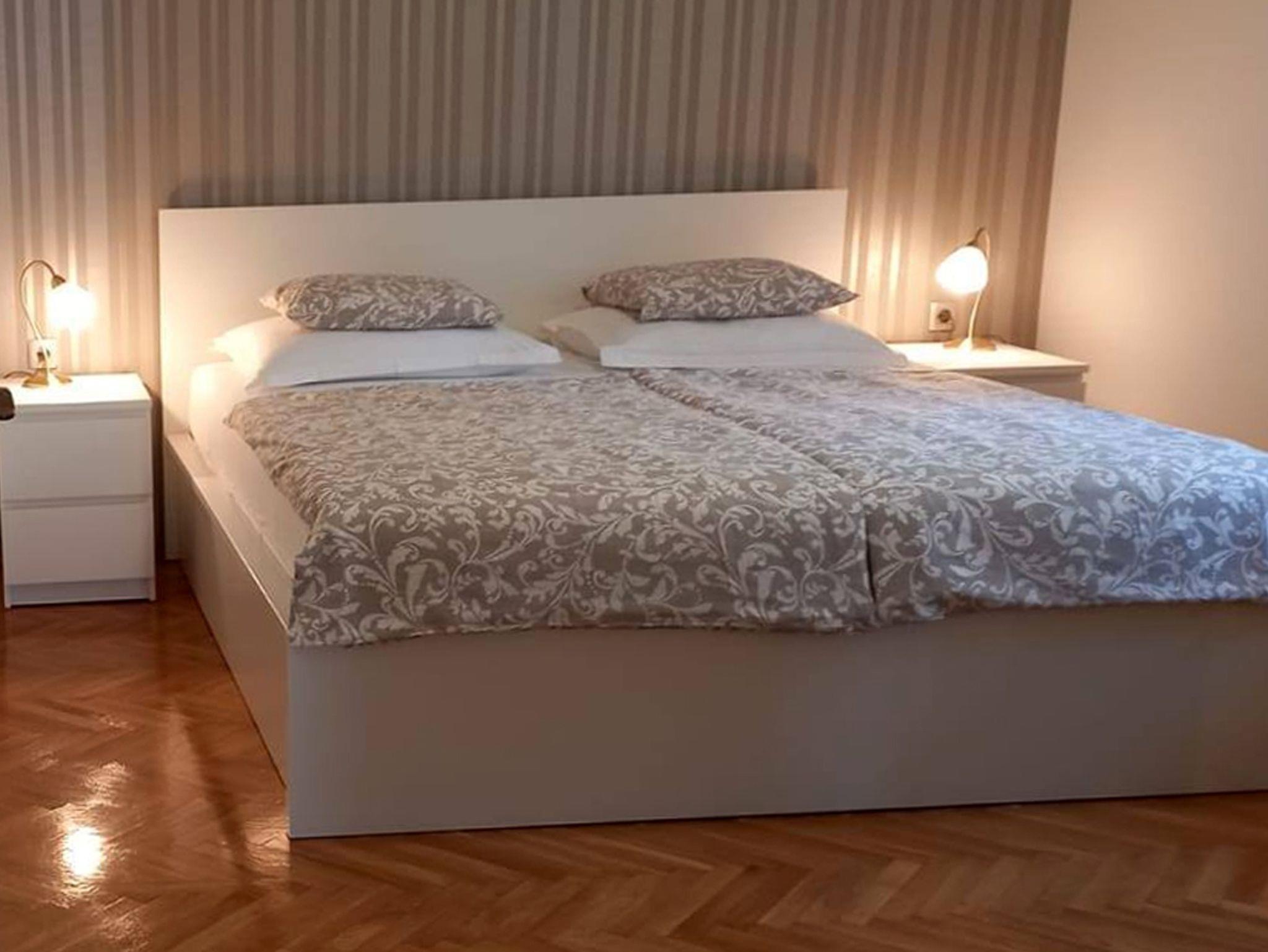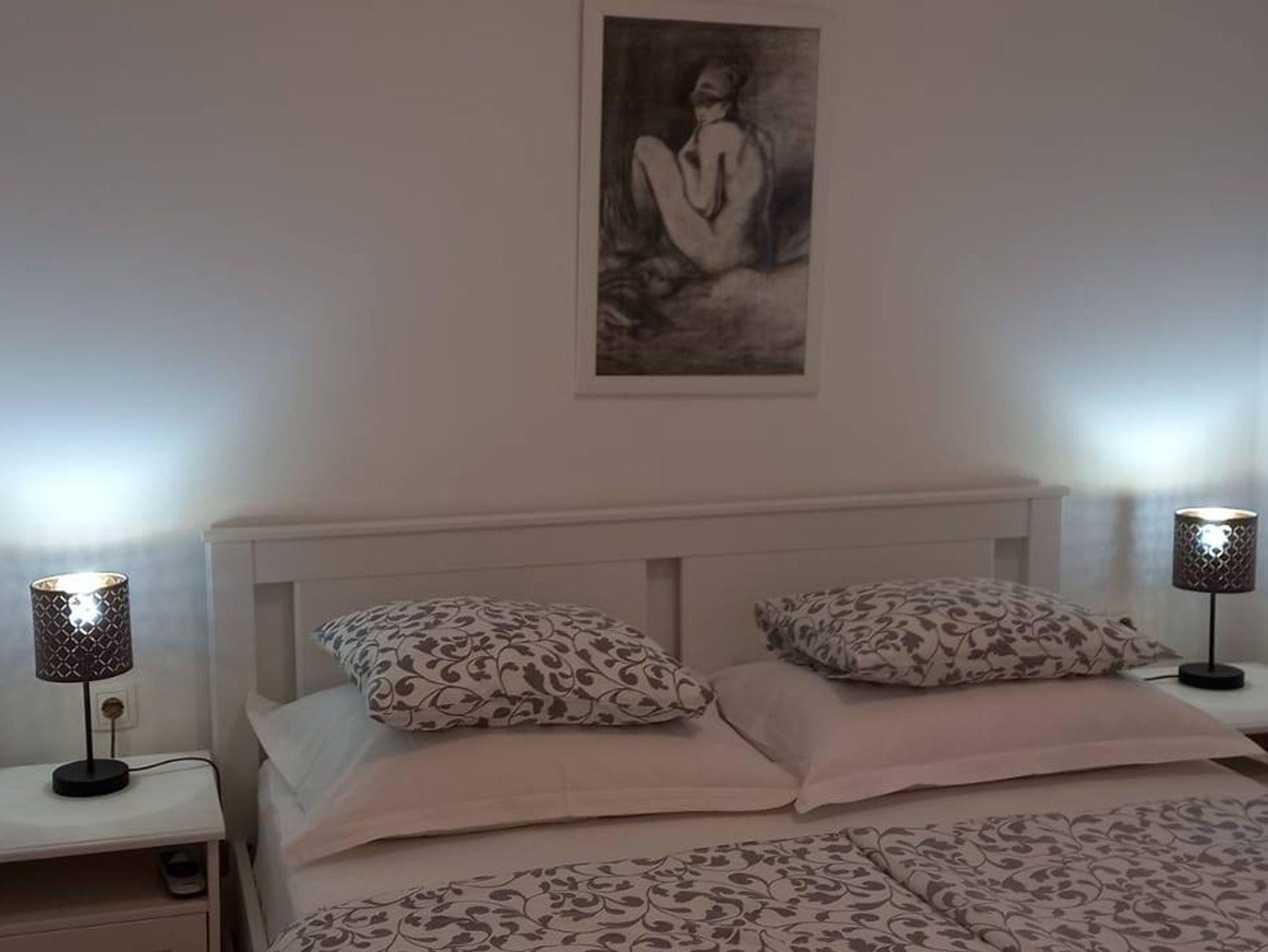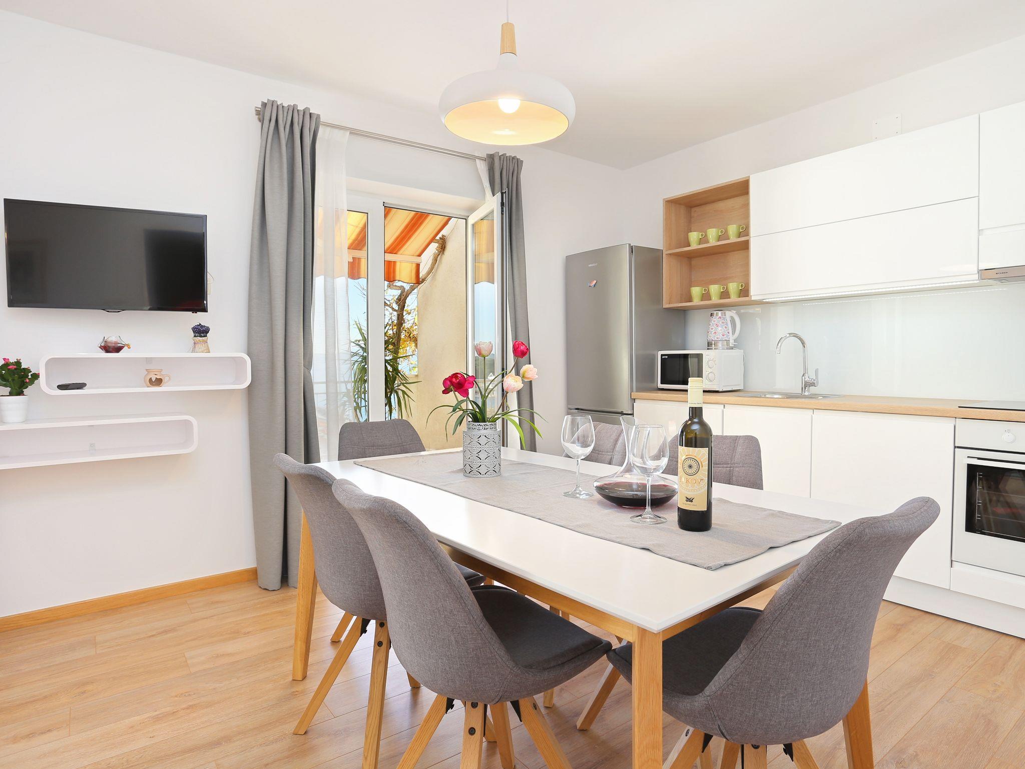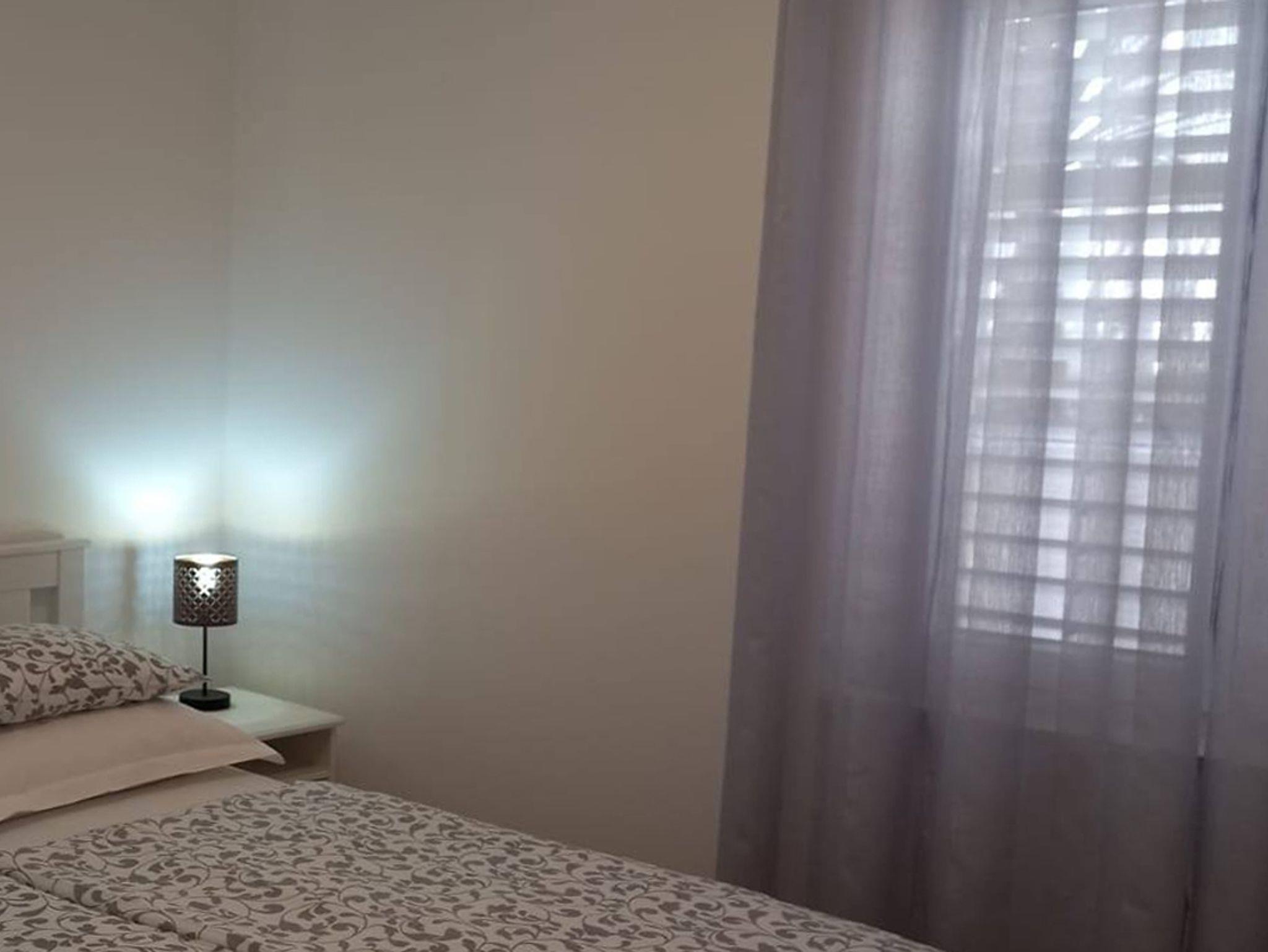 Ferienwohnung bietet Platz für 6 Gäste. Die Betten sind in Schlafzimmern, die es 2 gibt, und in Wohnzimmer, innerhalb einer Gesamtfläche von 59m2, angeordnet. Die Gäste haben eine eigene Terrasse zur Verfügung, auf der sie in warmen Sommernächten genießen können. Das Apartment bietet Meerblick. Es ist erlaubt, Speisen auf dem Gemeinschafts-Grill vorzubereiten. IM PREIS INBEGRIFFEN: Kurtaxe, Endreinigung, Klimatisierung, Parkplatz, Internet, Kinderbett, Bügeleisen, Föhn. VERBINDLICHE ZUSÄTZLICHE KOSTEN: Aufzahlung für Kurzaufenthalte (prozentualer Zuschlag pro Nächtigungsanzahl: 30% - 1, 20% - 2, 10% - 3). Die Verfügbarkeit zusätzlicher Dienstleistungen in Ihrem reservierten Termin und die Preise derselben (falls nicht aufgeführt) müssen im Voraus überprüft werden. Zusätzliche Dienstleistungen die in der Zahlungsaufforderung nicht aufgeführt sind werden direkt beim Vermieter bezahlt, angenommen der Gast nutzt auch diese.