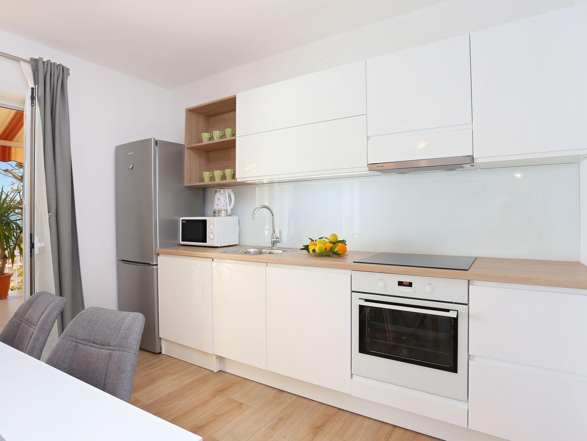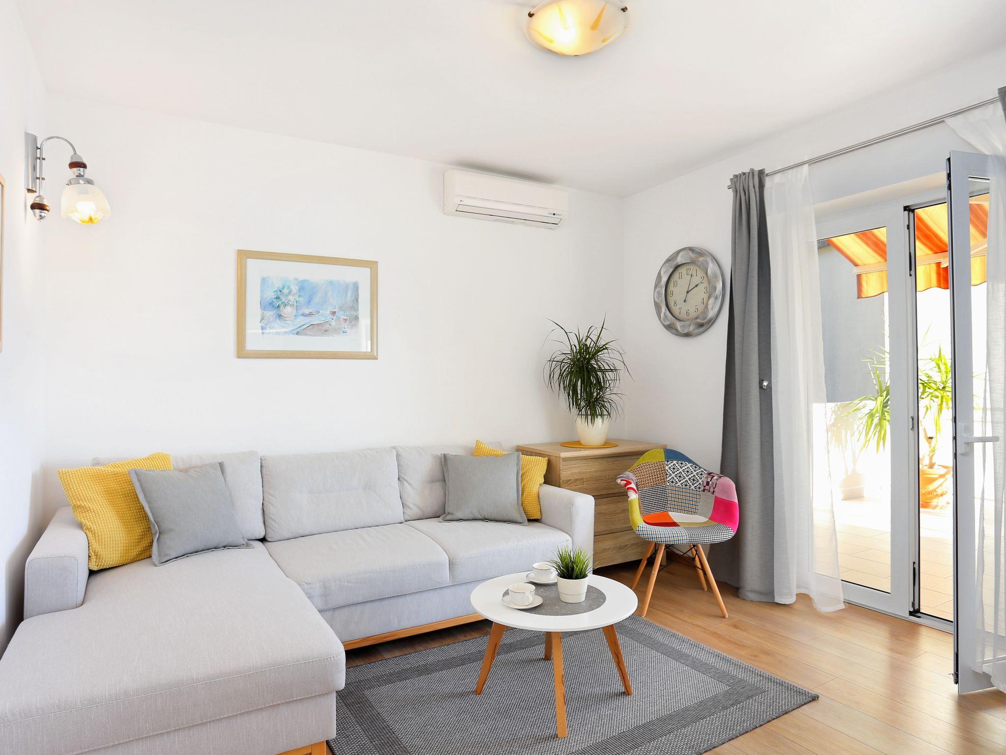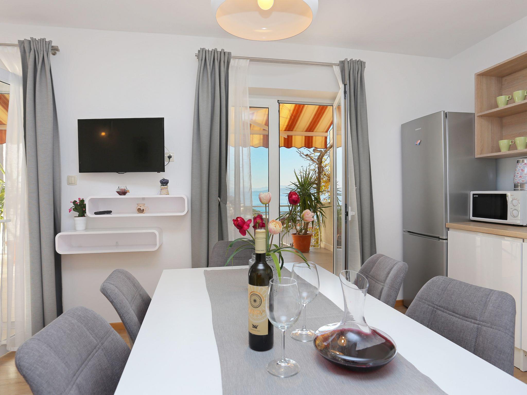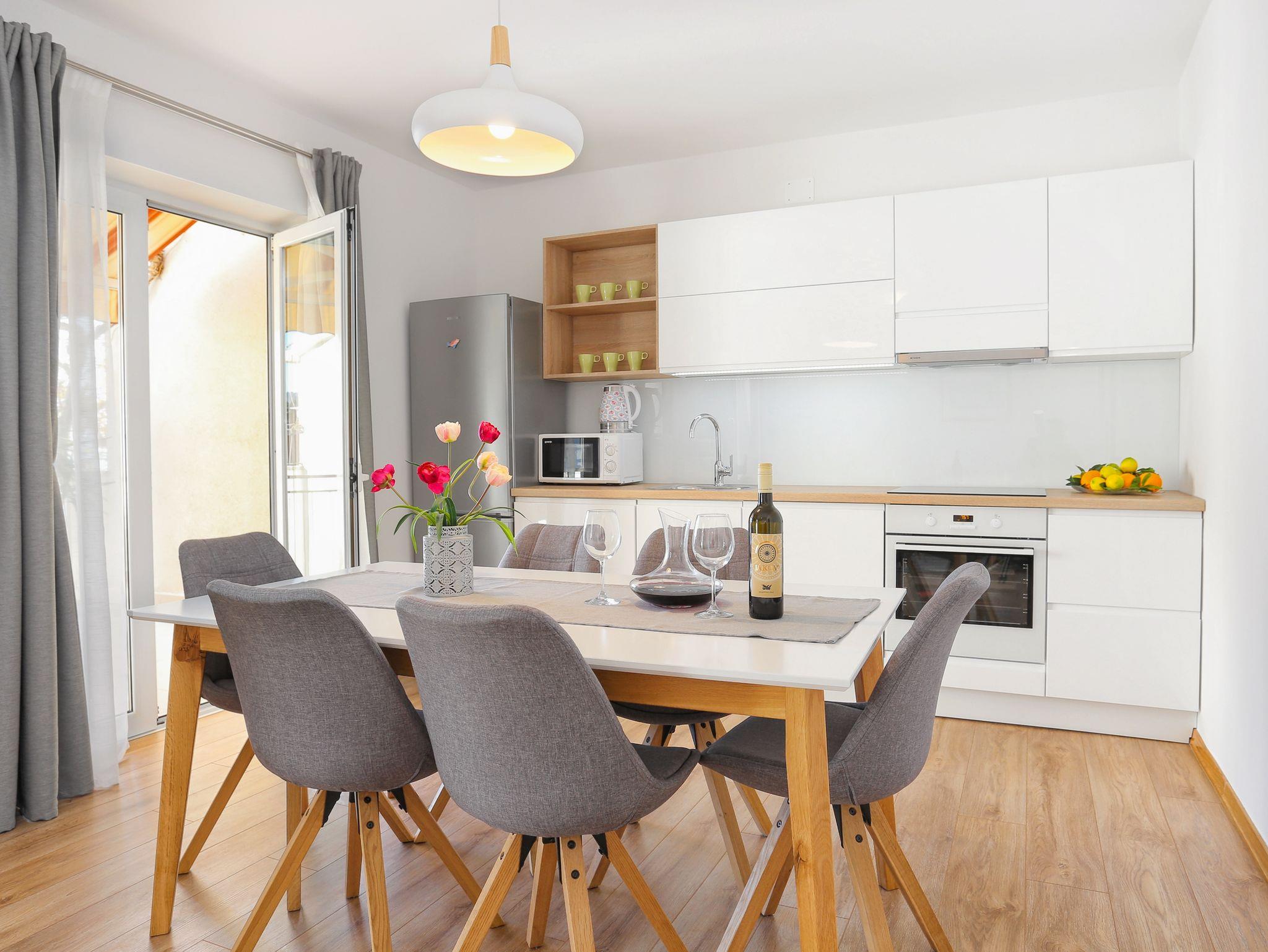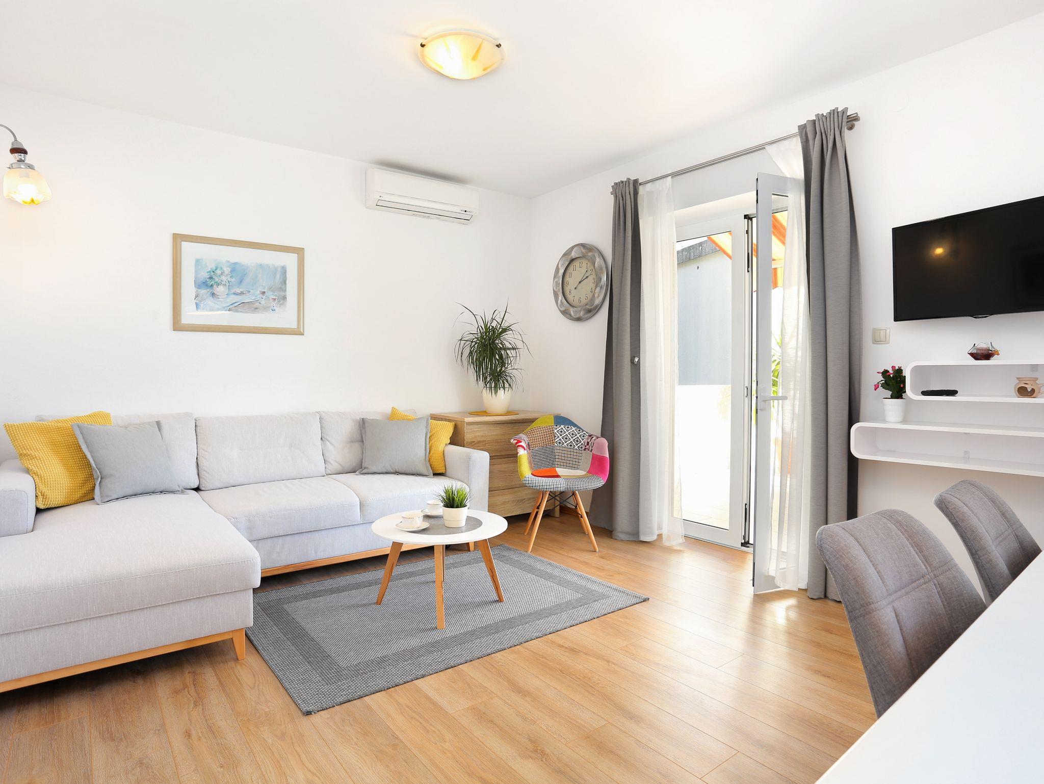Ferienwohnung bietet Platz für 6 Gäste. Die Betten sind in Schlafzimmern, die es 2 gibt, und in Wohnzimmer, innerhalb einer Gesamtfläche von 59m2, angeordnet. Die Gäste haben eine eigene Terrasse zur Verfügung, auf der sie in warmen Sommernächten genießen können. Das Apartment bietet Meerblick. Es ist erlaubt, Speisen auf dem Gemeinschafts-Grill vorzubereiten. IM PREIS INBEGRIFFEN: Kurtaxe, Endreinigung, Klimatisierung, Parkplatz, Internet, Kinderbett, Bügeleisen, Föhn. VERBINDLICHE ZUSÄTZLICHE KOSTEN: Aufzahlung für Kurzaufenthalte (prozentualer Zuschlag pro Nächtigungsanzahl: 30% - 1, 20% - 2, 10% - 3). Die Verfügbarkeit zusätzlicher Dienstleistungen in Ihrem reservierten Termin und die Preise derselben (falls nicht aufgeführt) müssen im Voraus überprüft werden. Zusätzliche Dienstleistungen die in der Zahlungsaufforderung nicht aufgeführt sind werden direkt beim Vermieter bezahlt, angenommen der Gast nutzt auch diese.