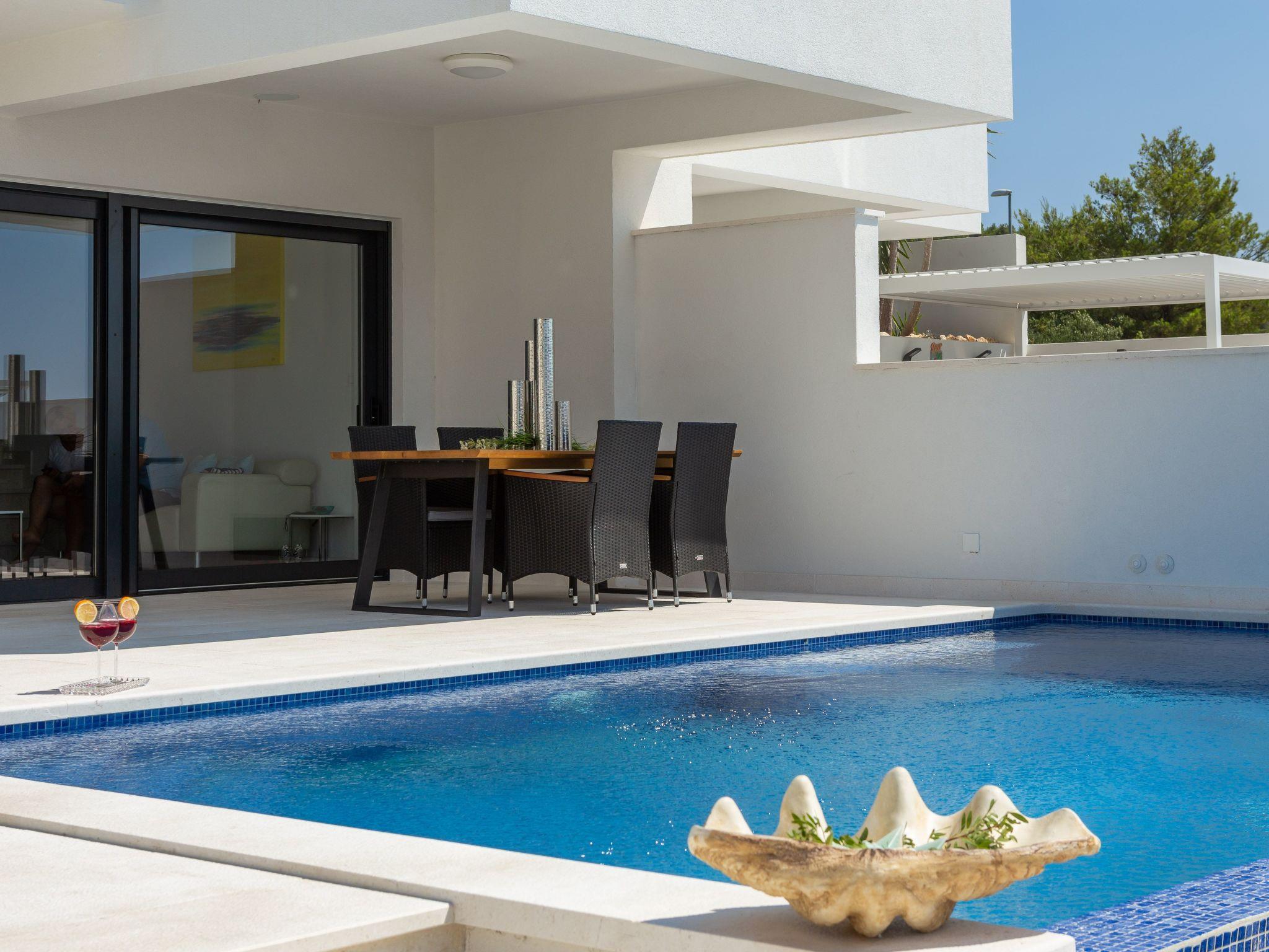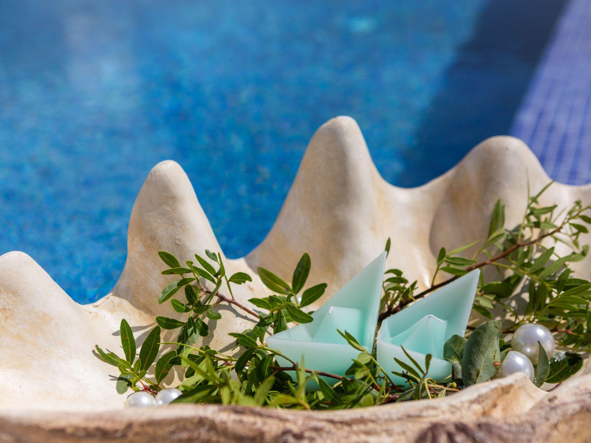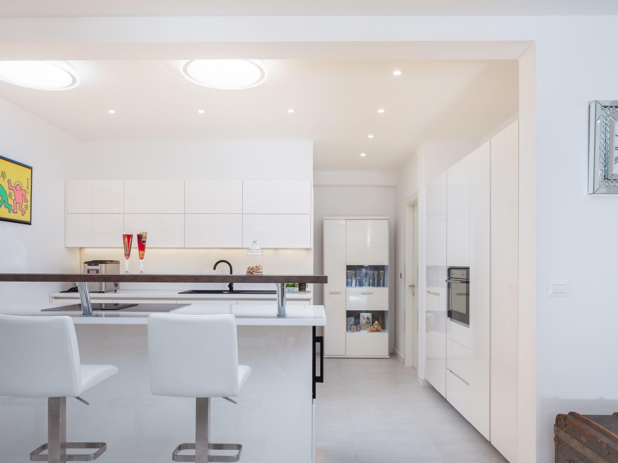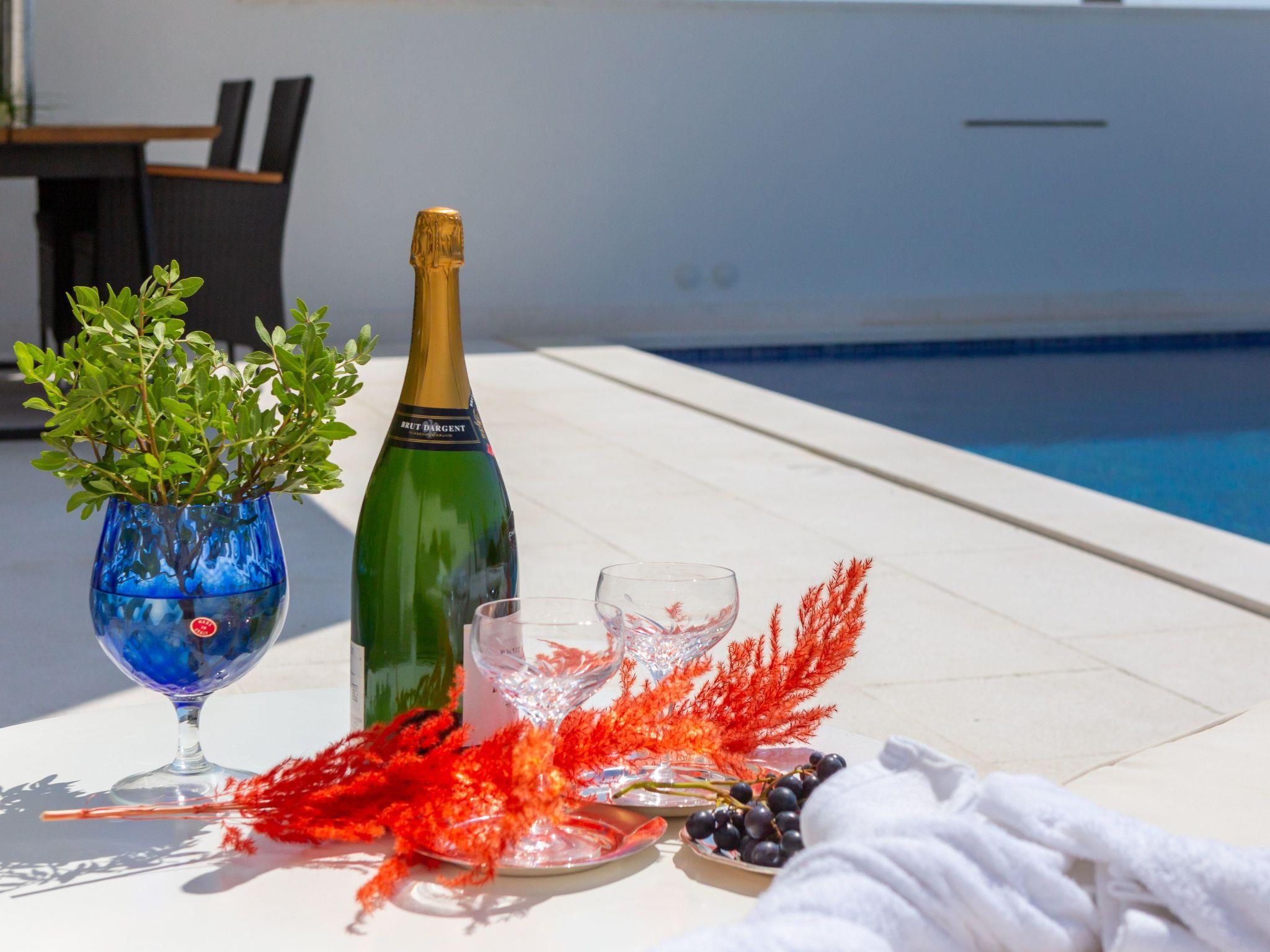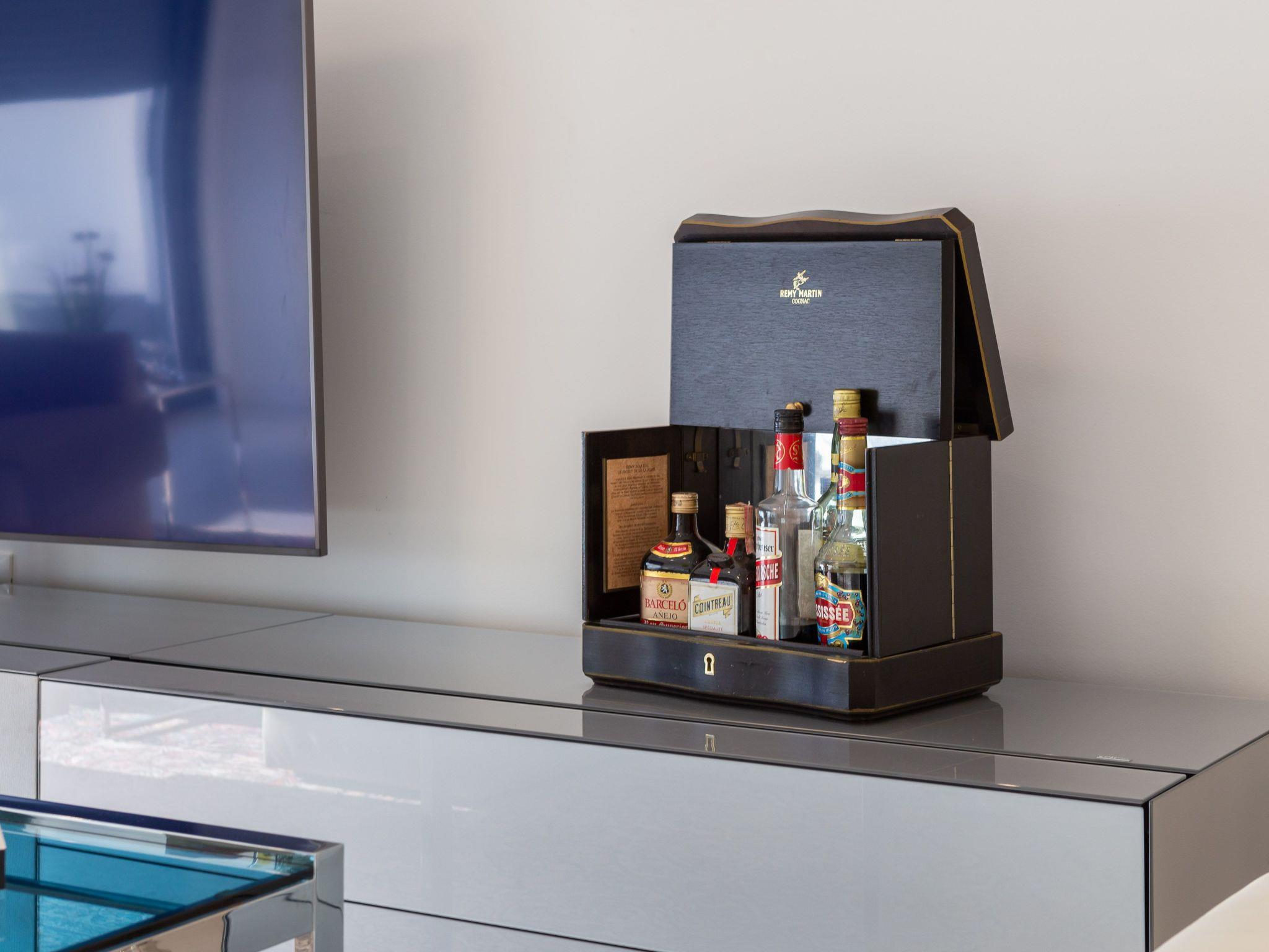 The villa was built in a modern style, all rooms are west-facing and there are stunning sea views from every bedroom. The rooms are all brightly decorated and furnished in a modern maritime style. Each bedroom has a Smart TV with internet access and the ability to watch Netflix, Prime, etc. The living room has a 65-inch screen and a Marshall jukebox that can be used to control Bluetooth and other sources. A total of 220 square metres of living space is available. The large living room with integrated dining room and designer kitchen guarantee pleasant evenings. All modern cooking facilities are available and invite you to enjoy.