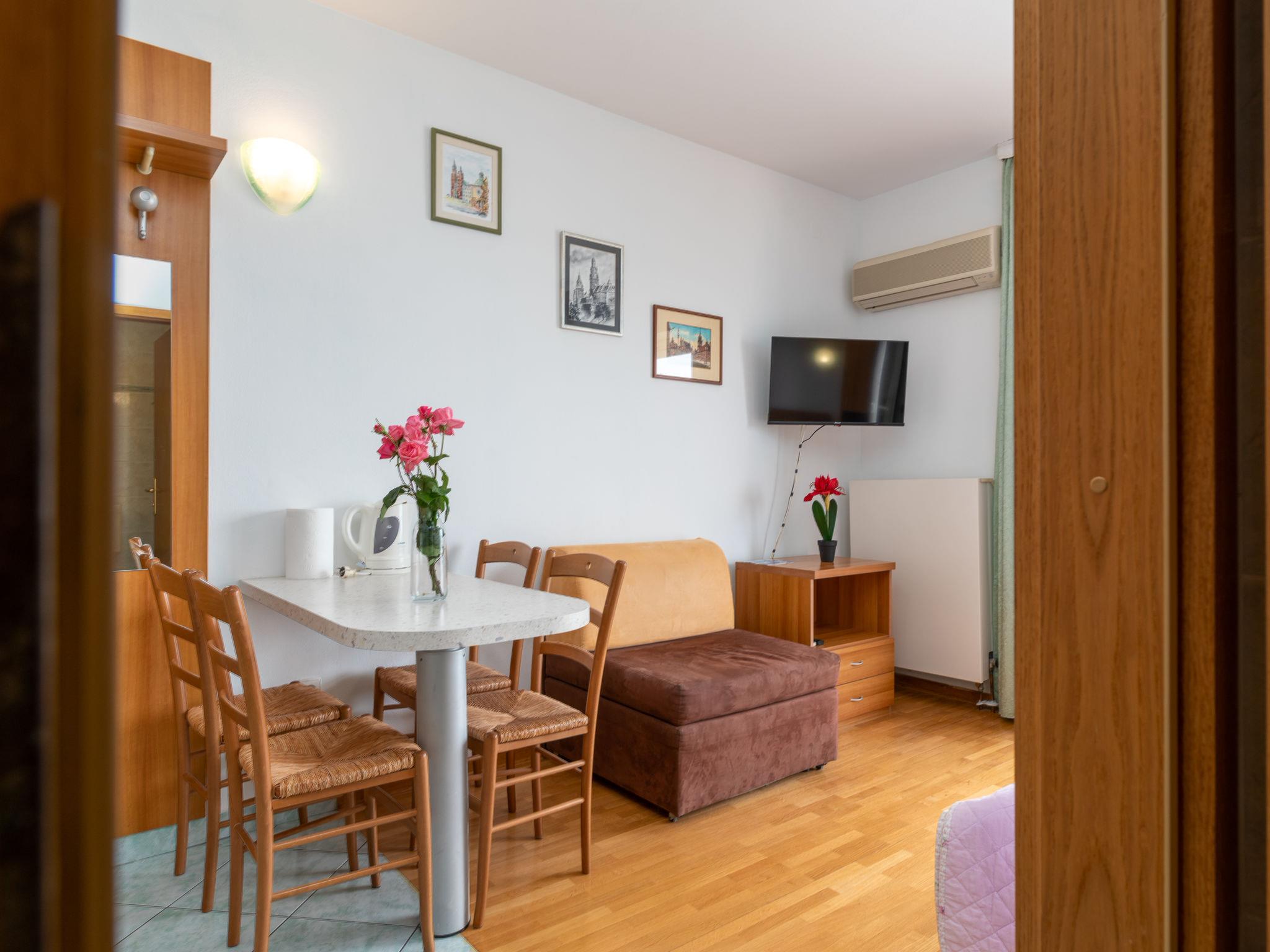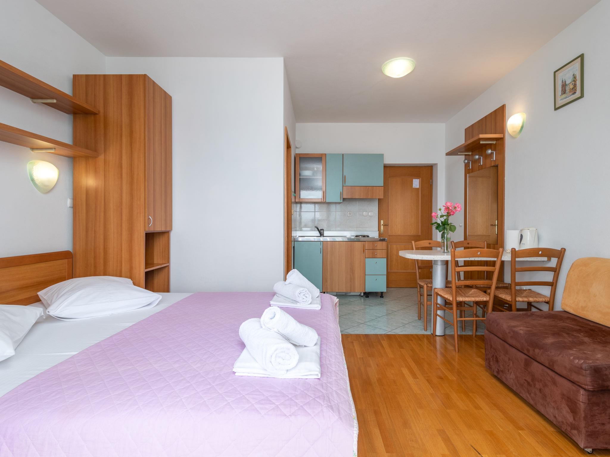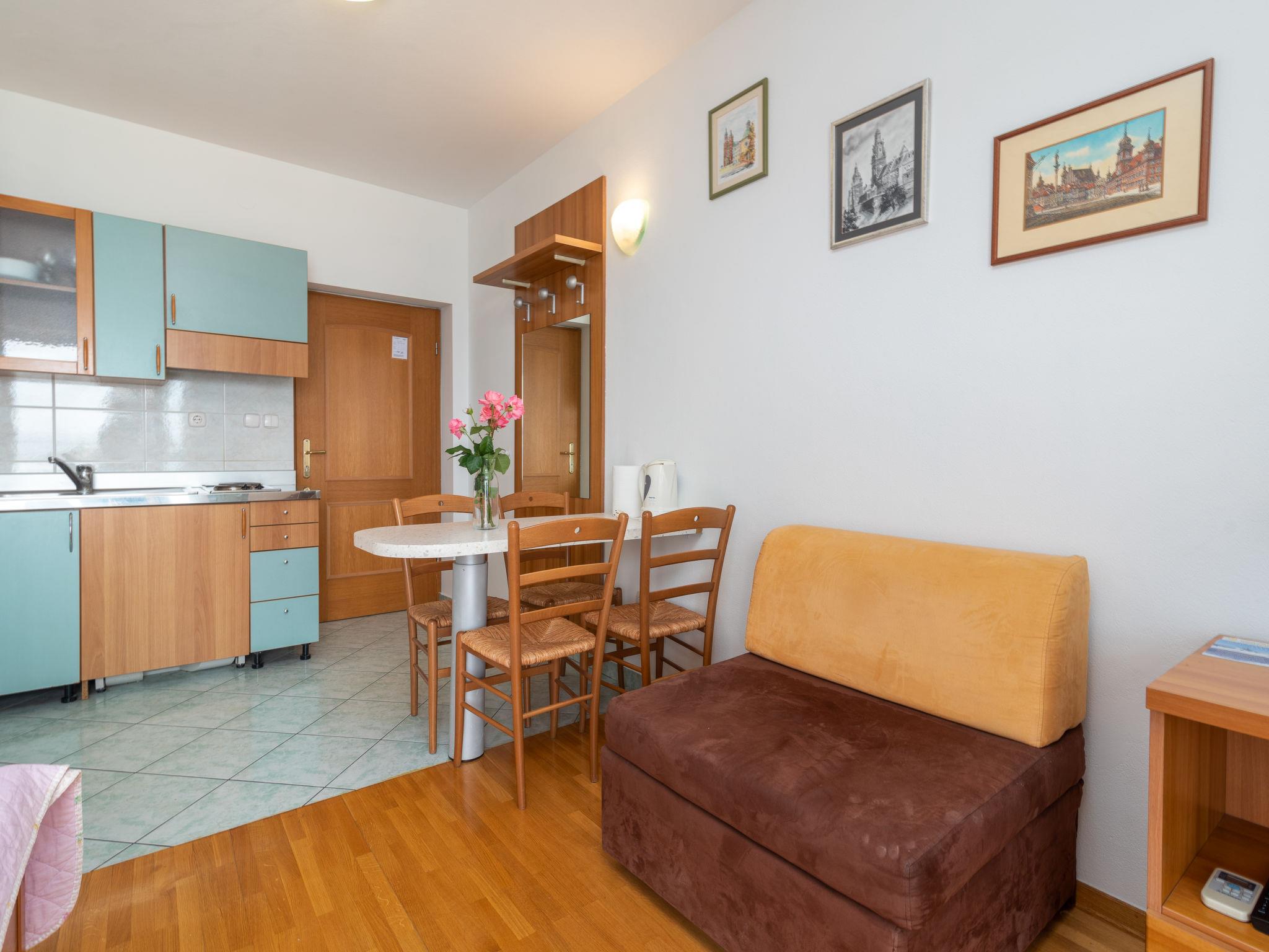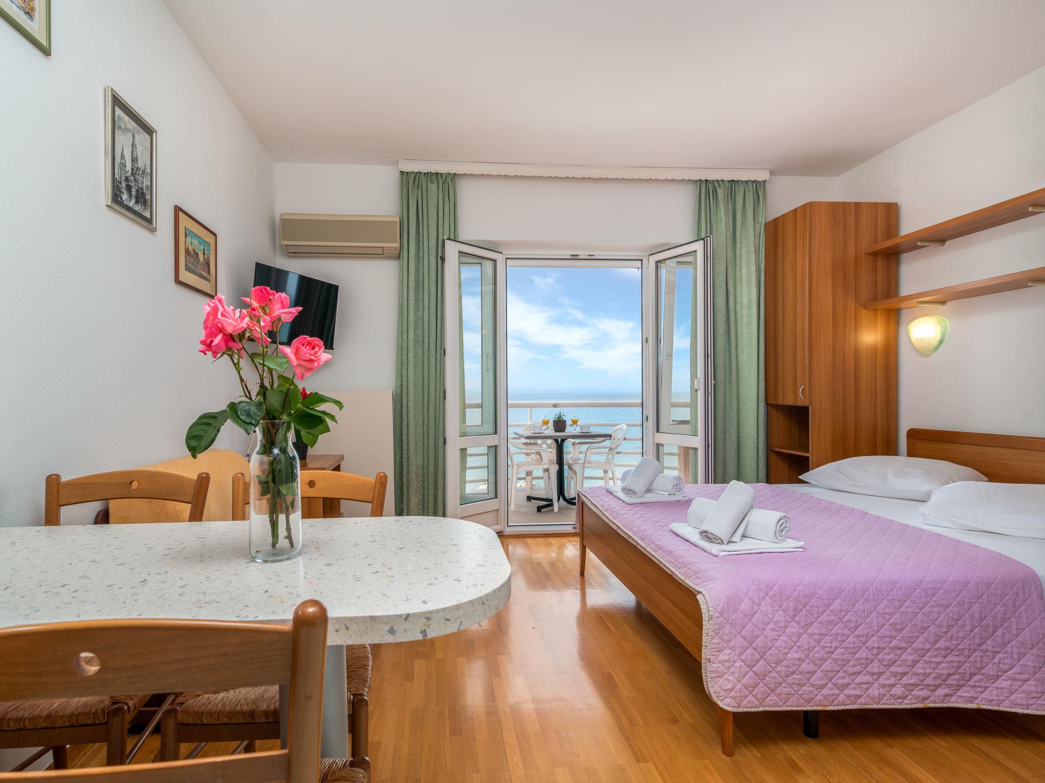 "Jerkan 16", 1-room studio 19 m2 on 2nd floor, south facing position. Living/sleeping room with 1 french bed (180 cm, length 200 cm), 1 folding bed (80 cm, length 200 cm), satellite TV (flat screen), air conditioning. Exit to the balcony. Open kitchen (2 hot plates, kettle, freezer). Shower/WC. Balcony 7 m2. Balcony furniture. Very beautiful panoramic view of the sea. Facilities: hair dryer. Internet (WiFi, free).