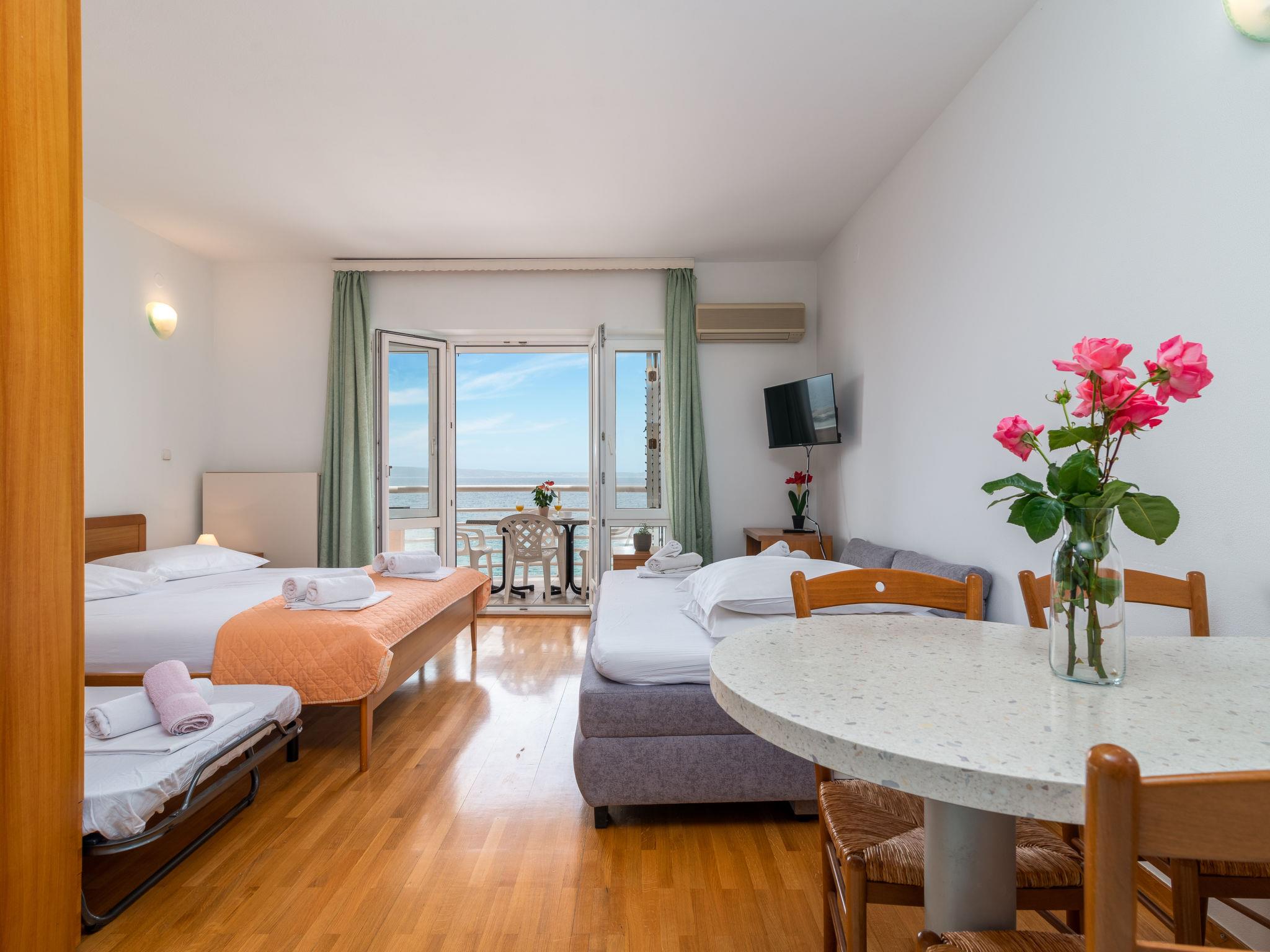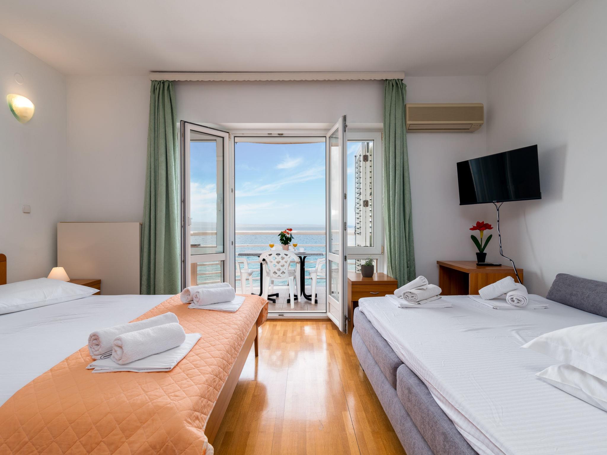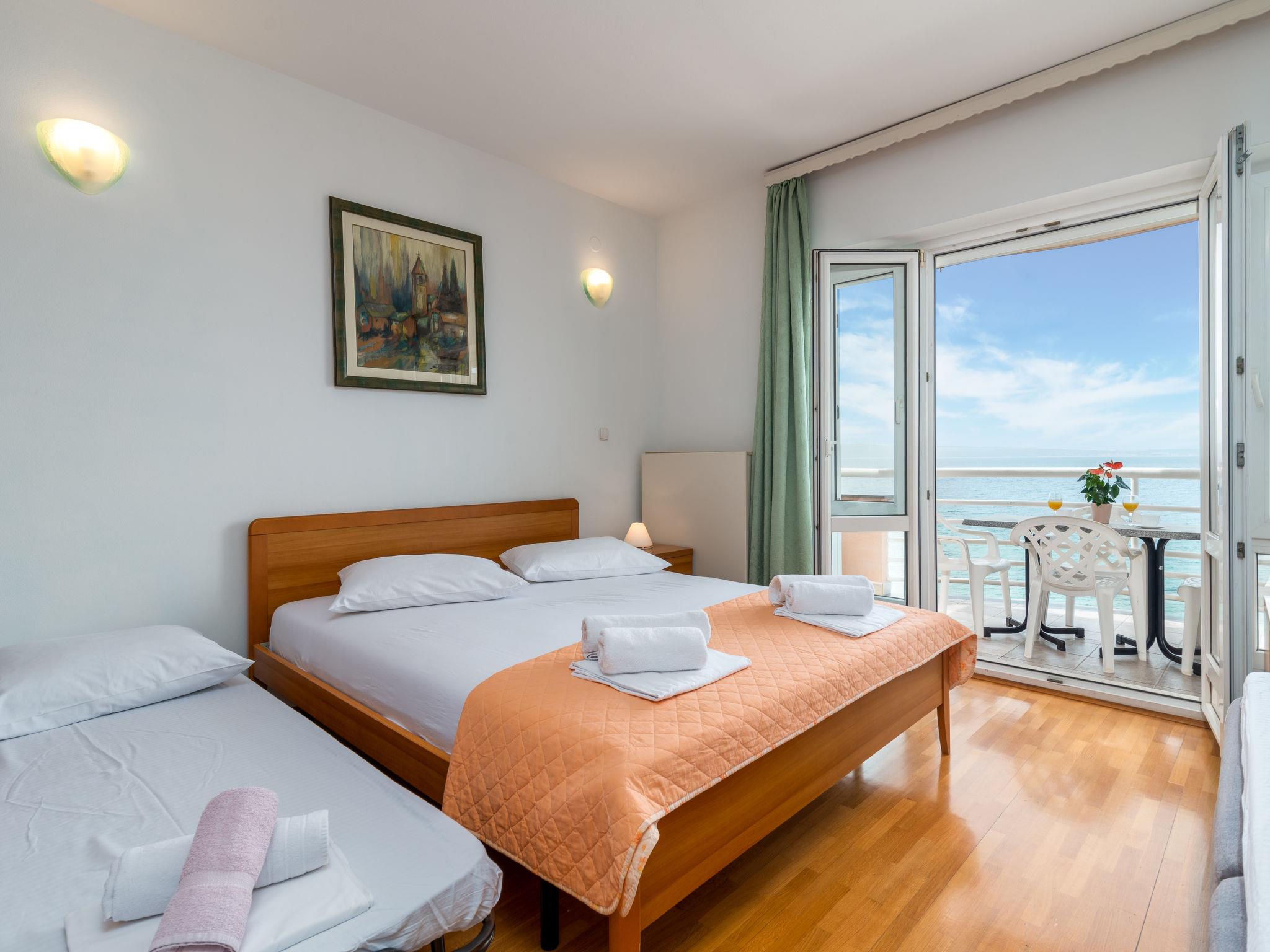 Apartment house. 500 m from the centre of Podstrana, 10 km from the centre of Split, in a sunny position, traffic calmed area, 5 m from the sea, 5 m from the beach, direct access to the beach. For shared use: property 300 m2. In the house: internet access, washing machine (for shared use). Parking at 400 m. Shop 100 m, restaurant 5 m, bus stop 240 m, pebble beach 5 m. Marina 3 km, tennis 3 km, riding stable 4 km. Please note: Loading and unloading of baggage is possible at the holiday house.