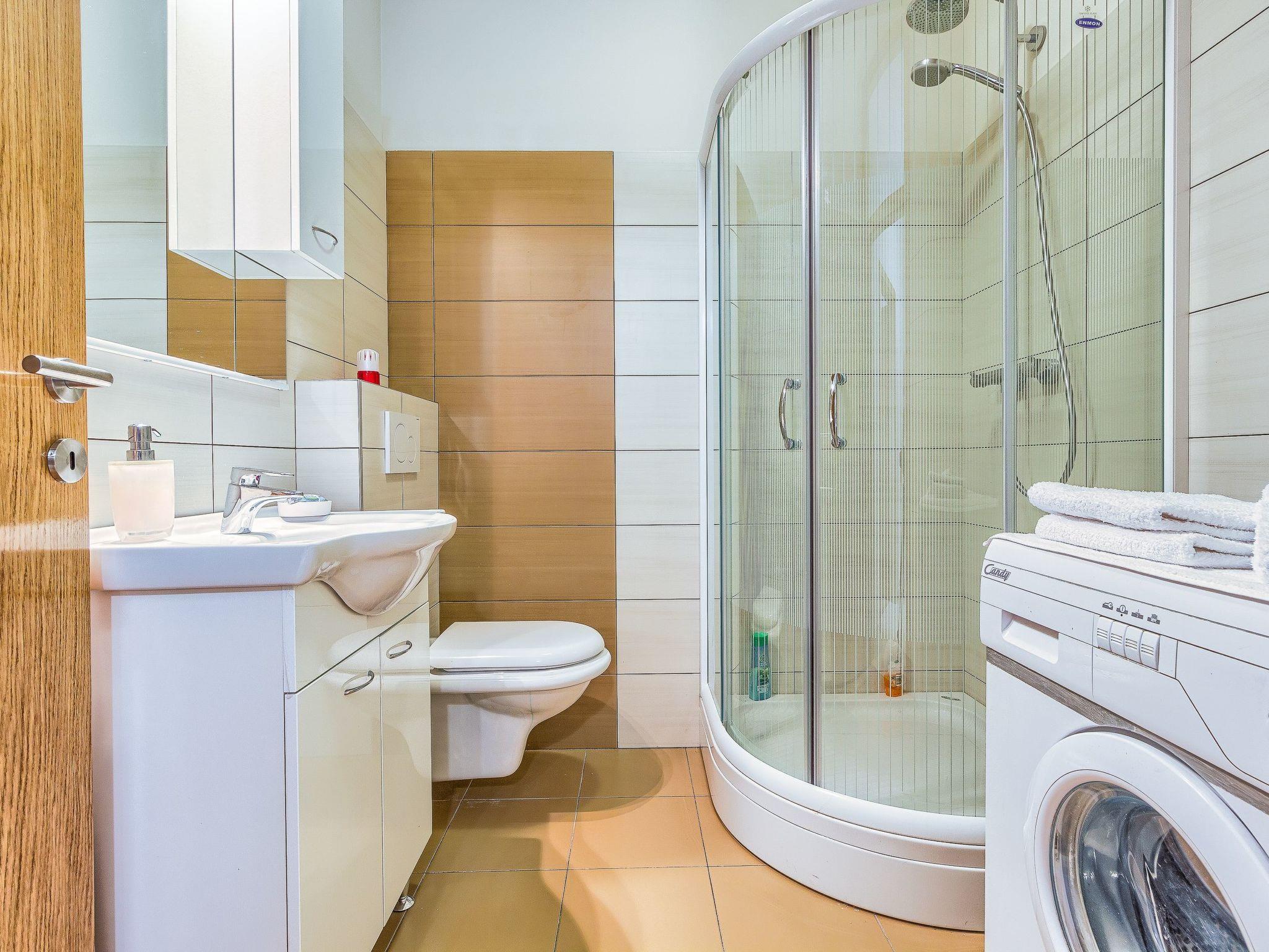 The 120m² holiday apartment occupies the first floor of the three-storey holiday house, which was newly built as recently as 2014 and equipped accordingly with all modern amenities, including air conditioning (cool/warm) in all rooms. The apartment consists of a living and dining room flooded with daylight, with an integrated open kitchen, three bedrooms, and two bathrooms. The living room has two comfortable sofas, a glass coffee table, a wide flatscreen TV with cable channels, a stereo system and a round dining table with four modern chairs. An elegant breakfast bar separates the dining space from the built-in kitchen, comprising a dishwasher, a ceramic hob with an extractor fan, an electric oven, a fridge with a freezer compartment and ample crockery and cutlery. Two of the bedrooms have a double bed measuring 140 x 200cm, while the third has a single bed measuring 90 x 200cm. The three bedrooms have bedside tables with reading lamps and cupboards with plenty of storage space for your clothing and luggage. The two sofas in the living room can also be converted into additional double beds, for two adults or four children. The three bathrooms each have a spacious shower cubicle, a washbasin with a wall mirror, a hairdryer and a toilet. A washing machine is available during your stay and you can use the reliable wireless Internet connection in the apartment free of charge.